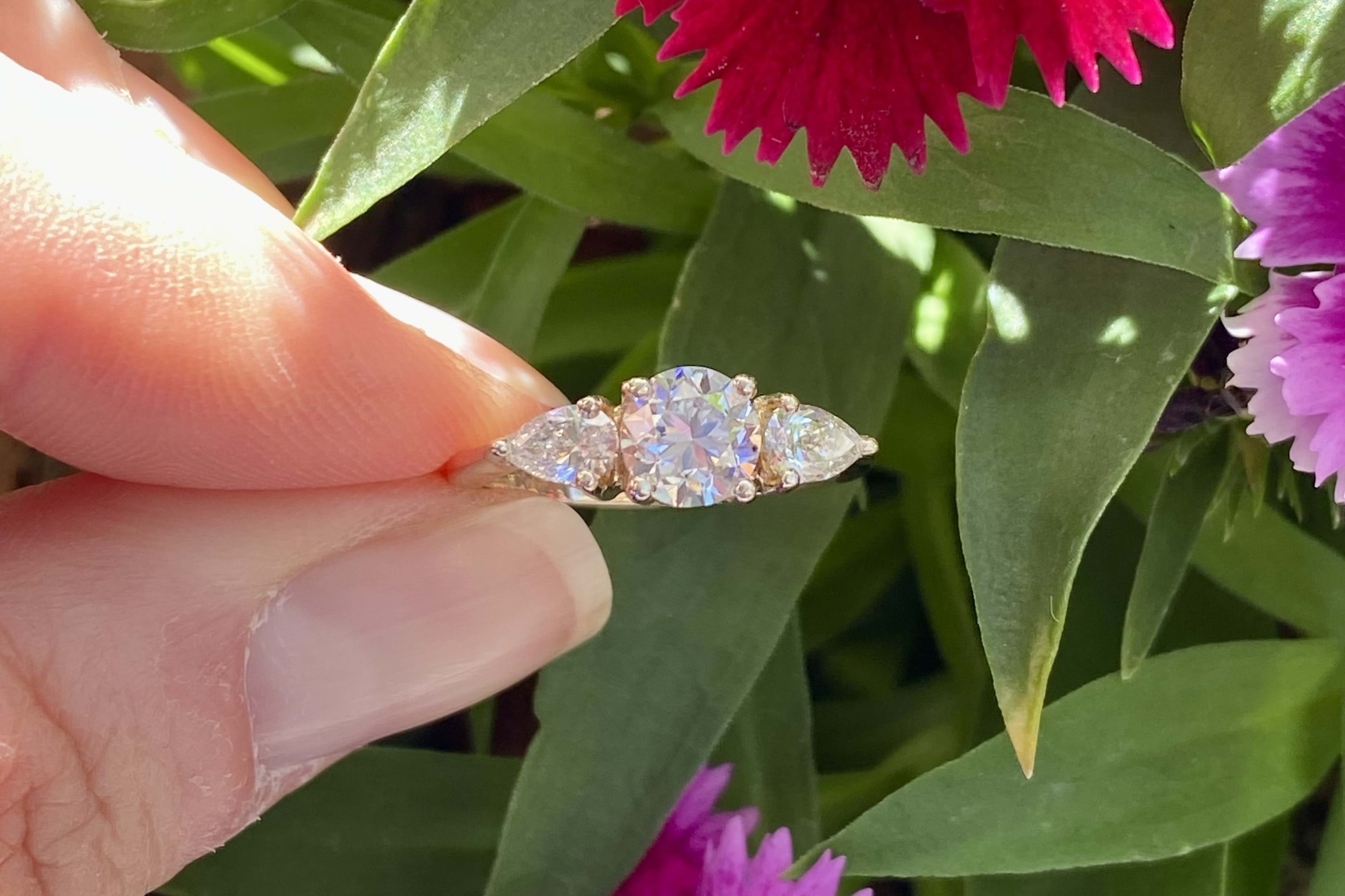 A lovely 9ct yellow gold ring featuring a 0.90ct GIA certified round brilliant cut diamond (G colour, SI2 clarity) four claw set in the centre, with a shimmering pearshape diamond set on each side. The two pearshape diamonds total 0.50ct (G colour, SI clarity). Finger size J+. Independent Valuation & GIA Certificate Supplied.