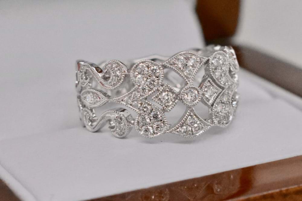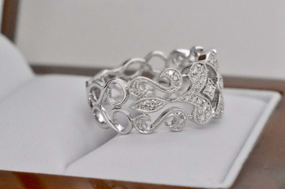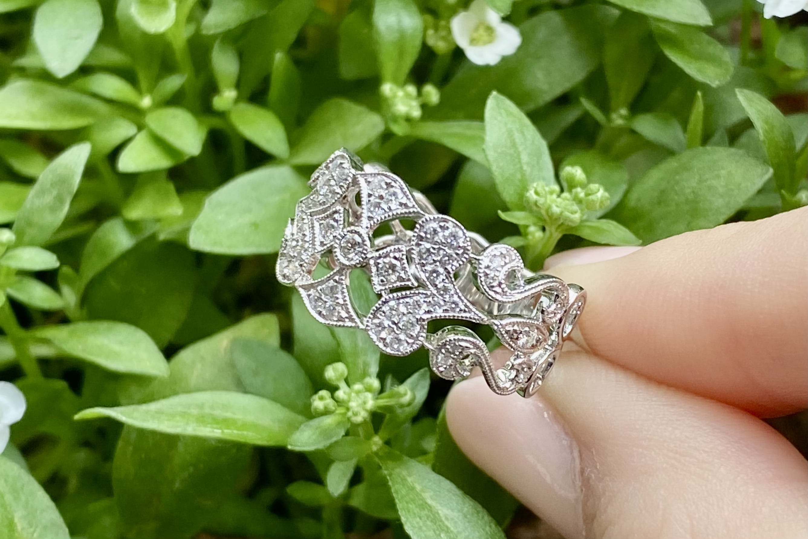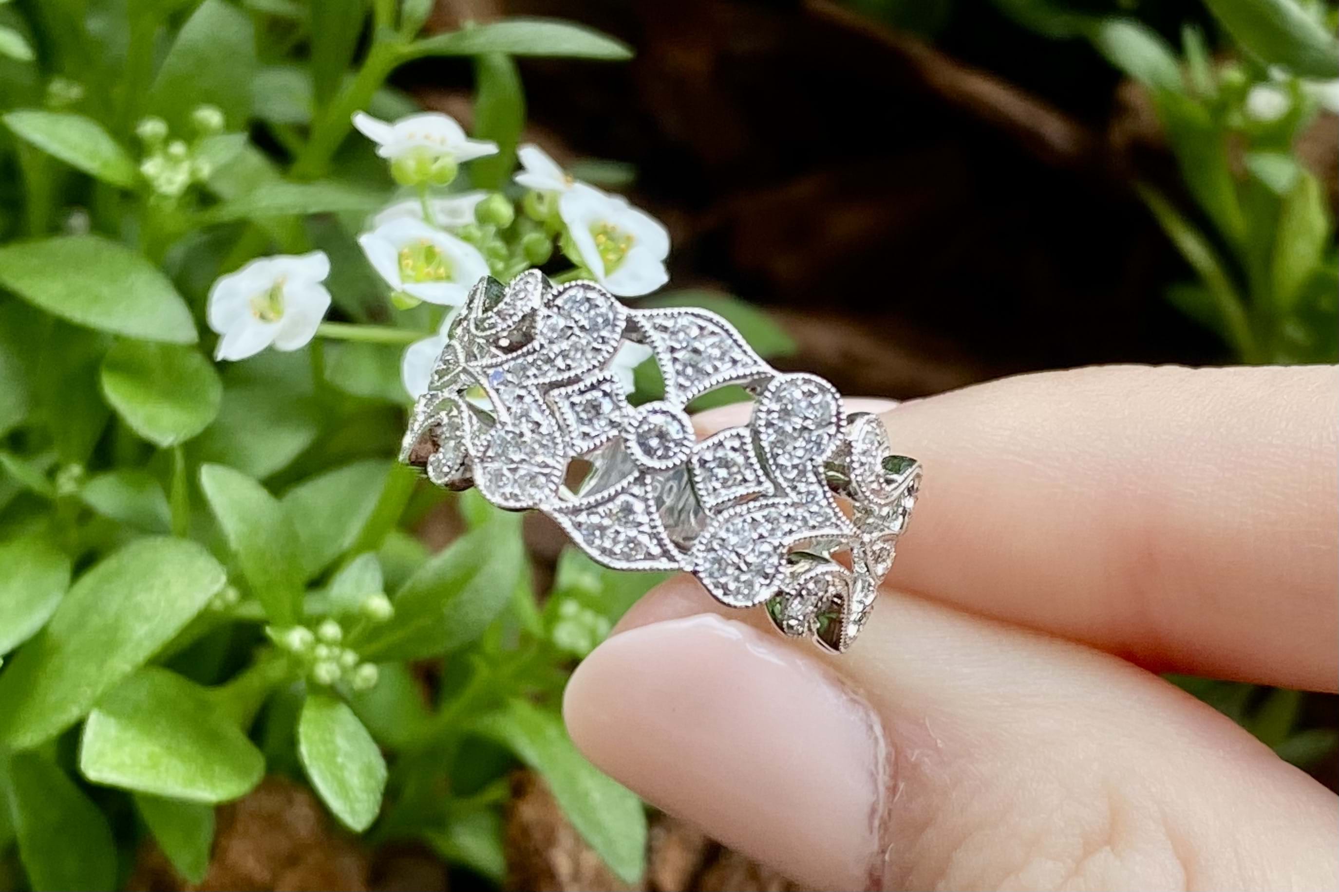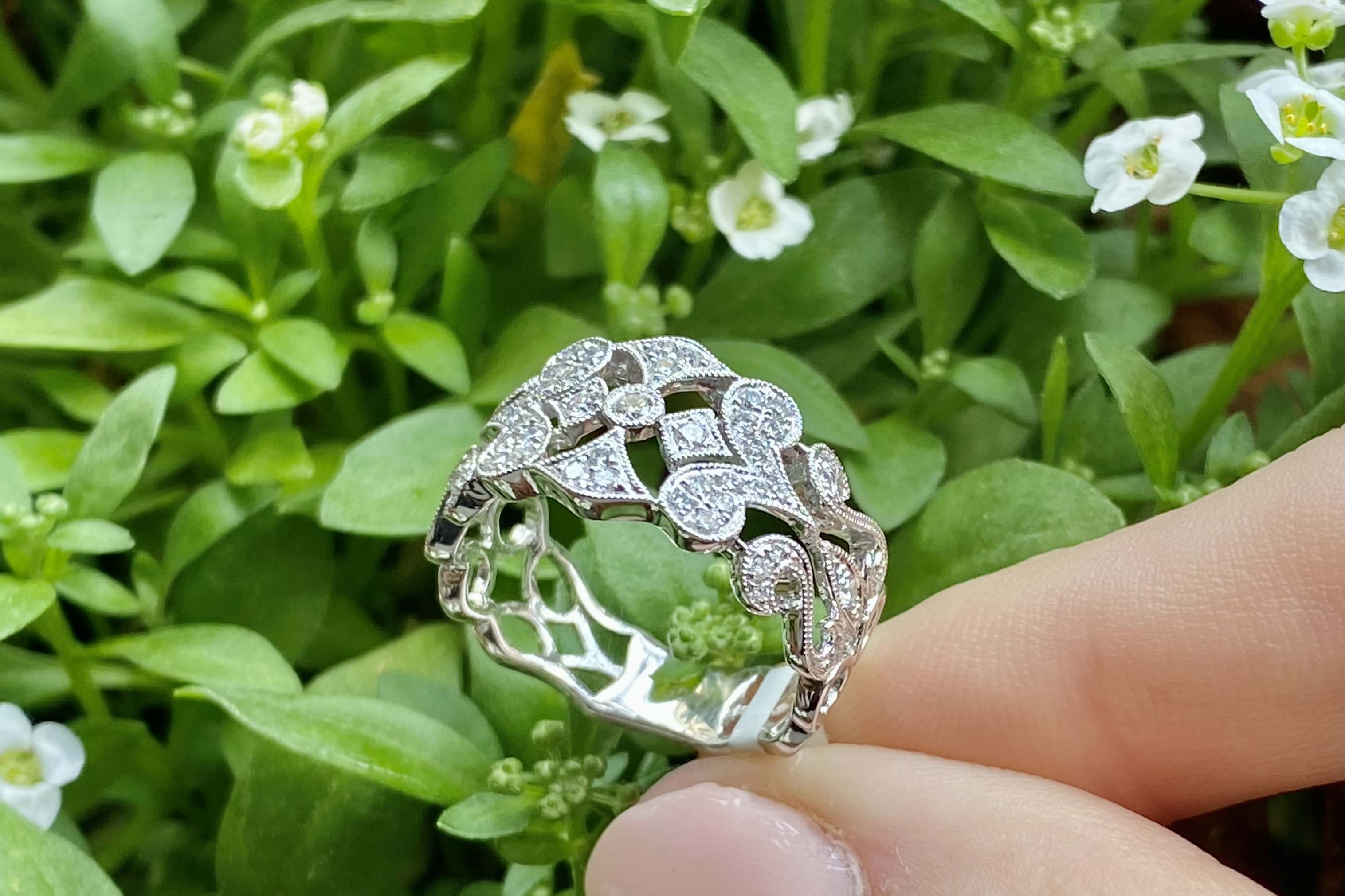 Pretty and sparkling this Art Deco inspired design has been crafted in 18ct white gold and features a diamond encrusted top totalling 0.38cts (G/VS-SI). Stunning when worn alone or paired with diamond bands on either side. Independent Valuation Supplied. Finger size M