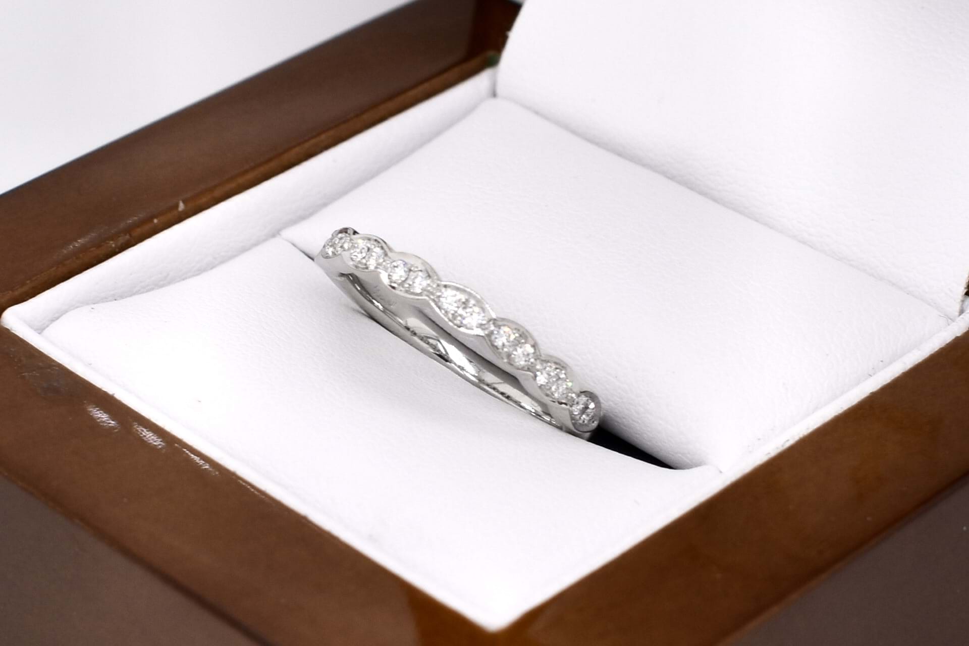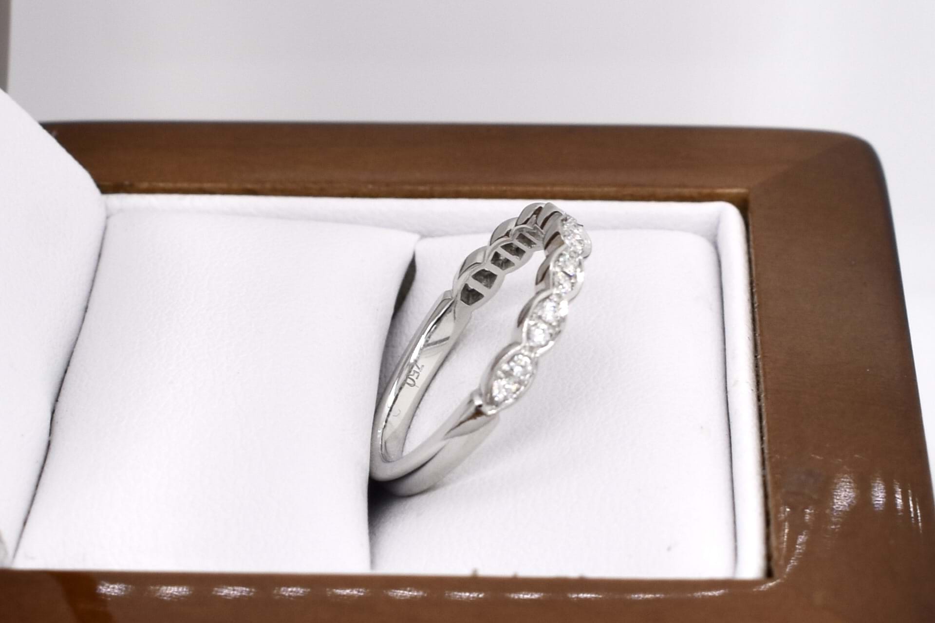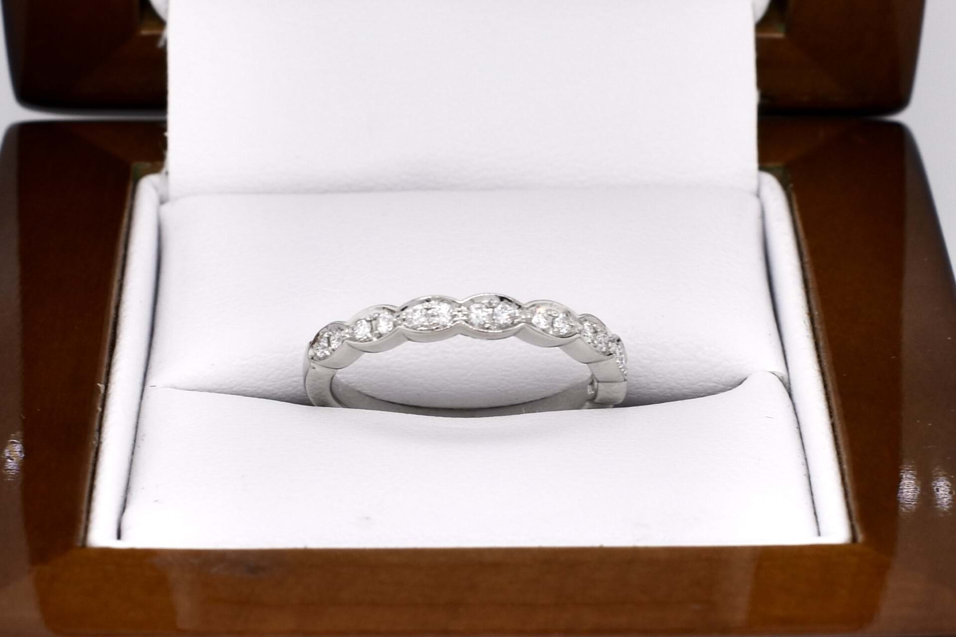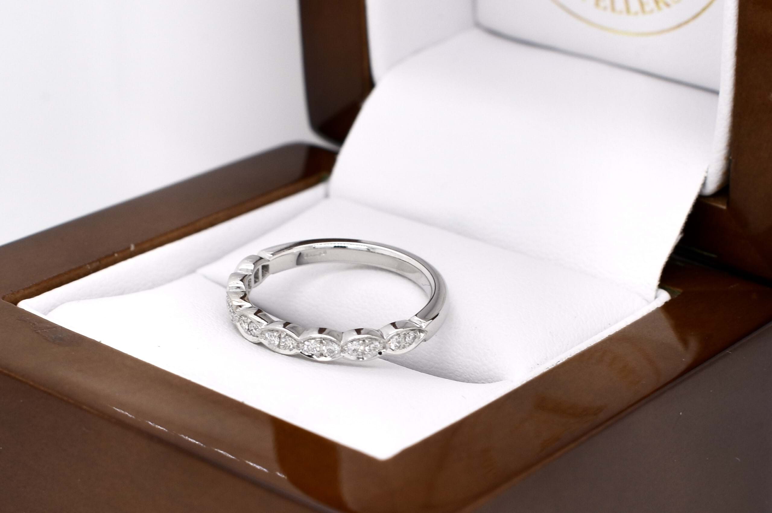 Crafted in 18ct white gold this gorgeous diamond band features 16 scintillating round brilliant cut diamonds grain set in a marquise shape, totalling 0.15cts F/G VS-SI. A perfect wedding, eternity or dress ring. Independent Valuation Supplied.