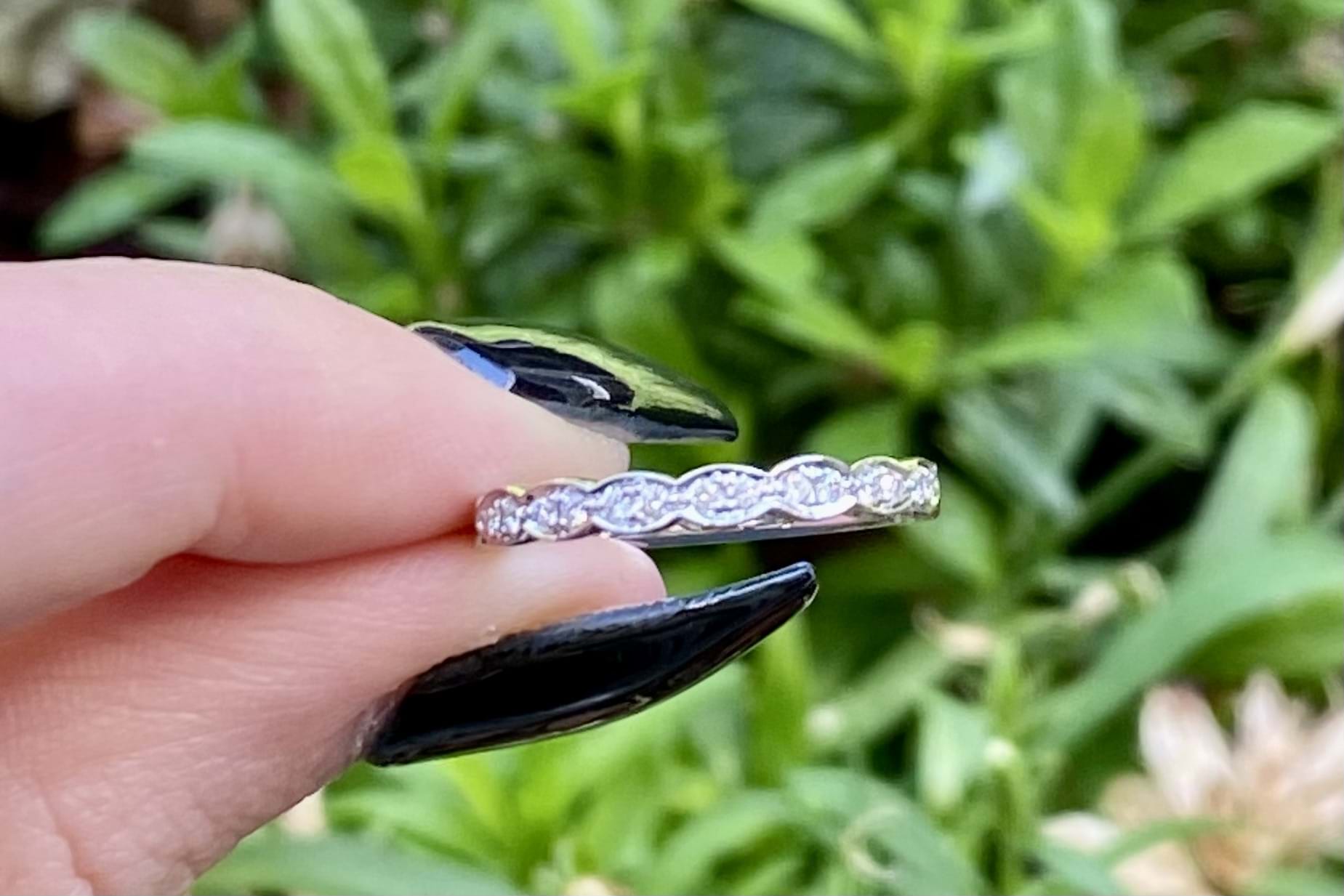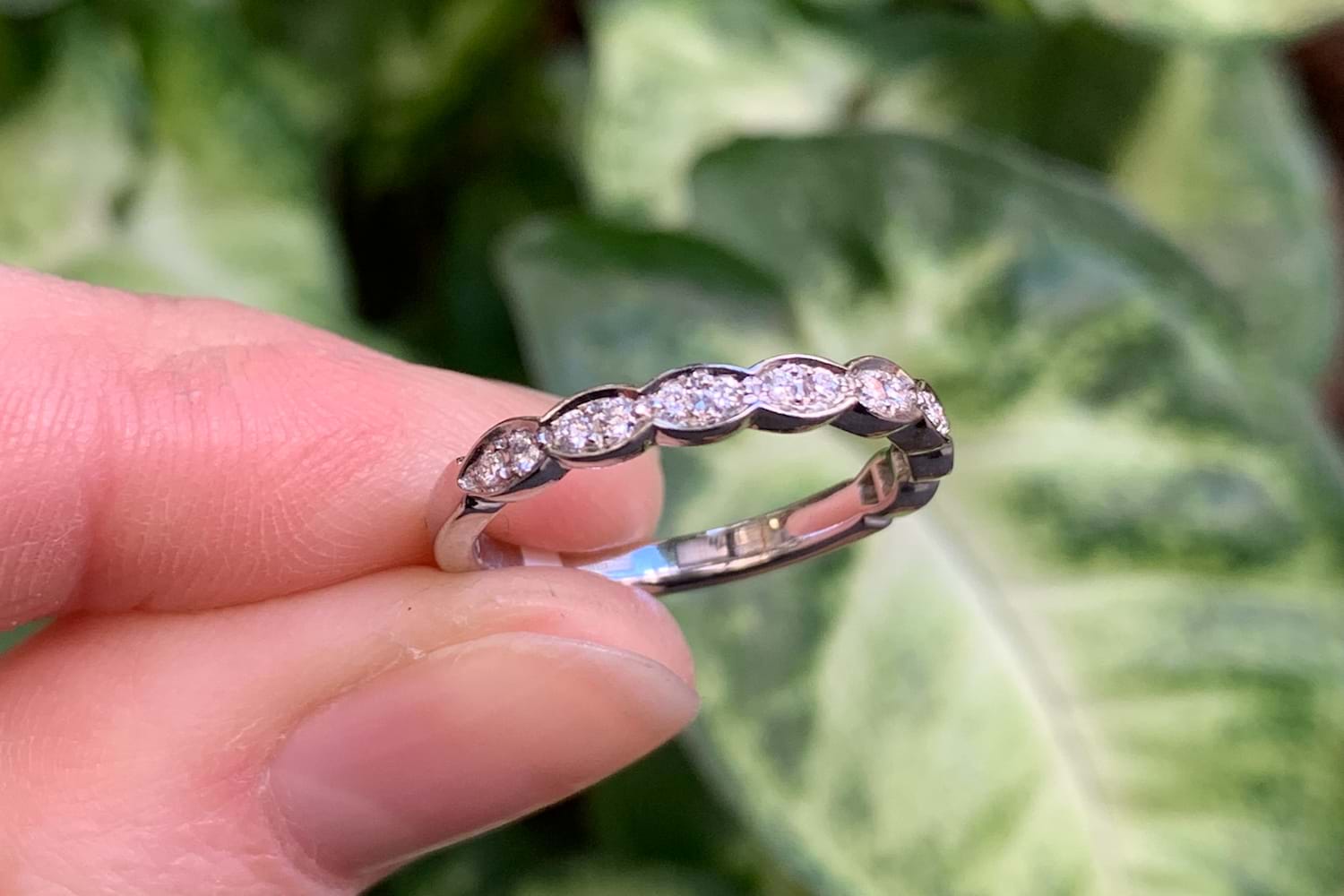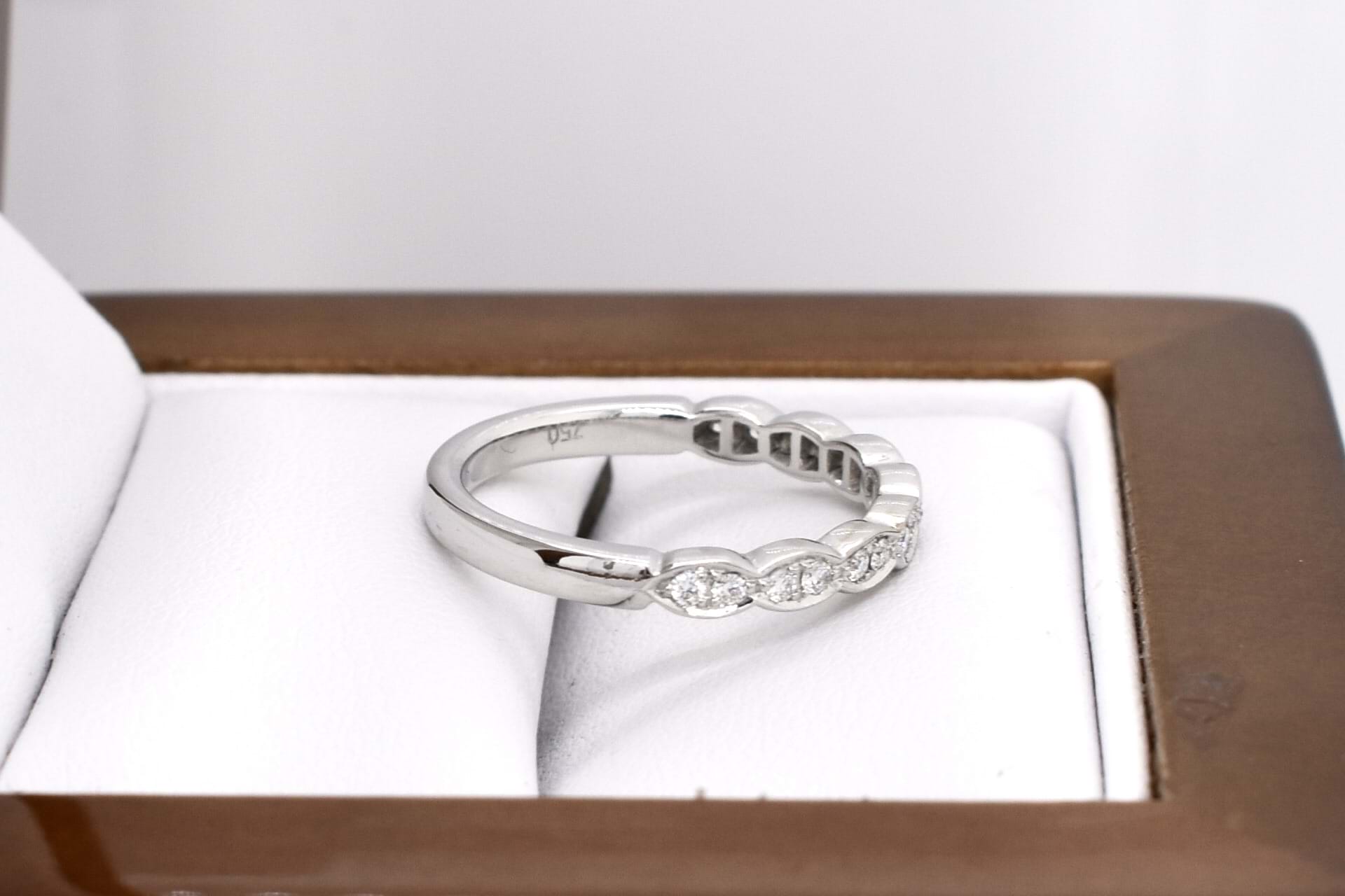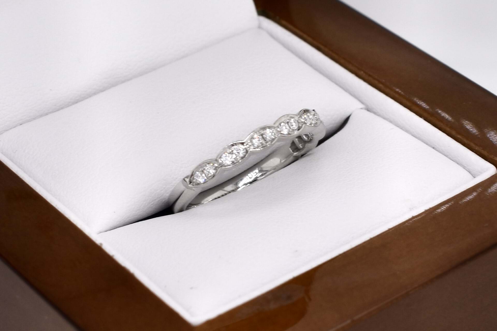 Crafted in 18ct white gold this gorgeous diamond band features 16 scintillating round brilliant cut diamonds grain set in a marquise shape, totalling 0.15cts F/G VS-SI. A perfect wedding, eternity or dress ring. Independent Valuation Supplied.