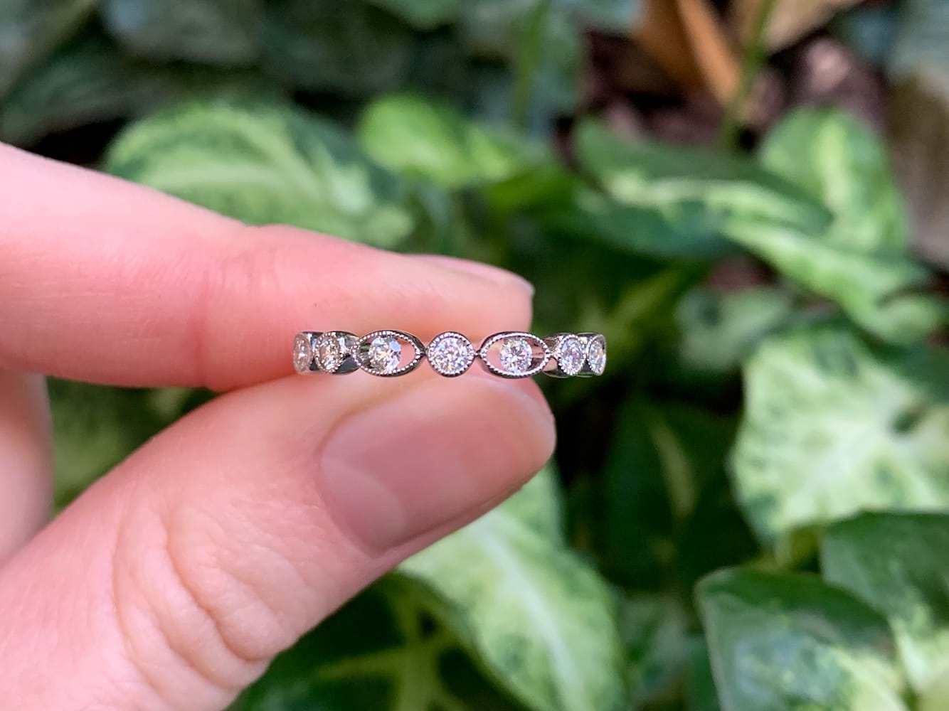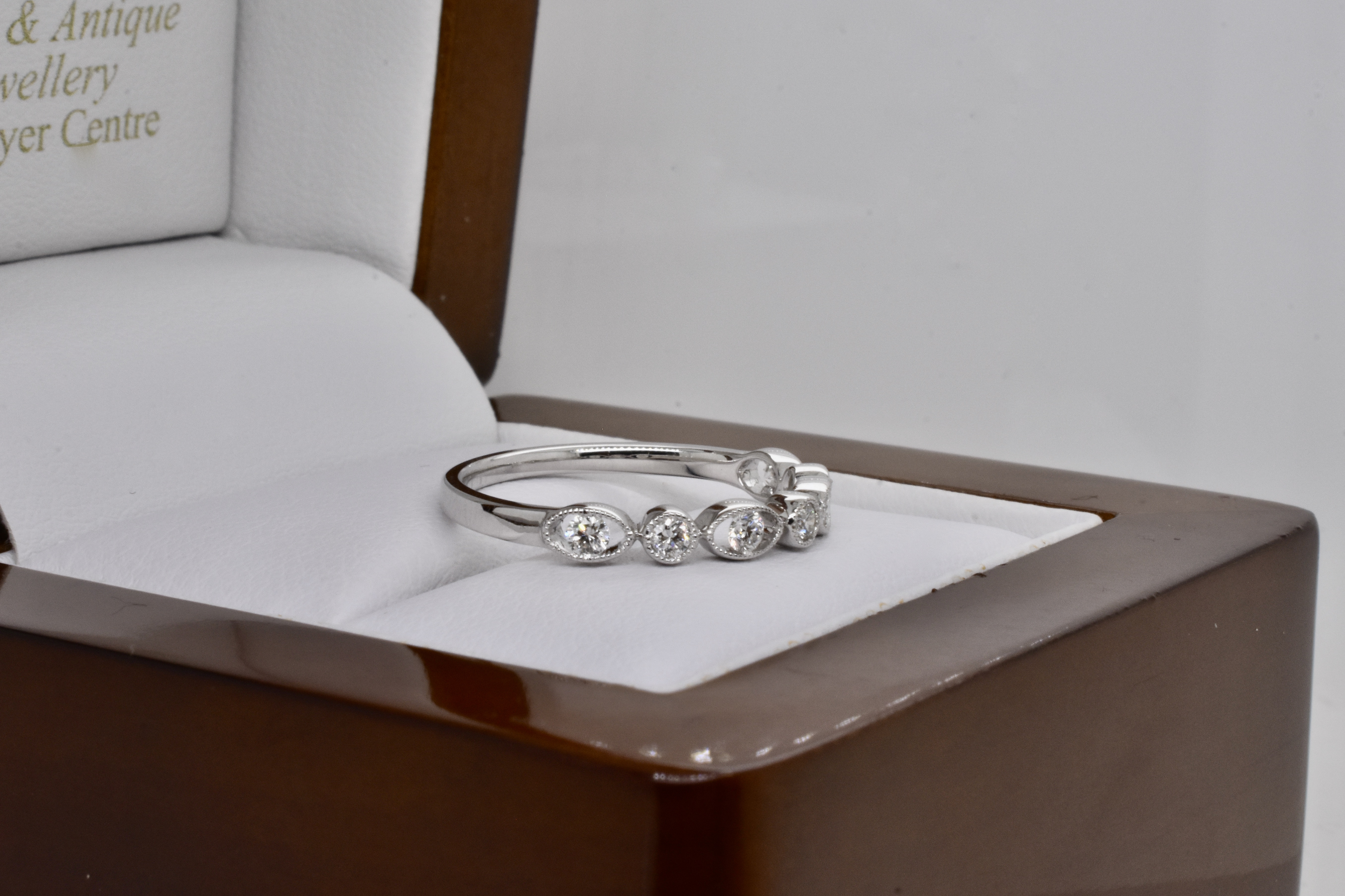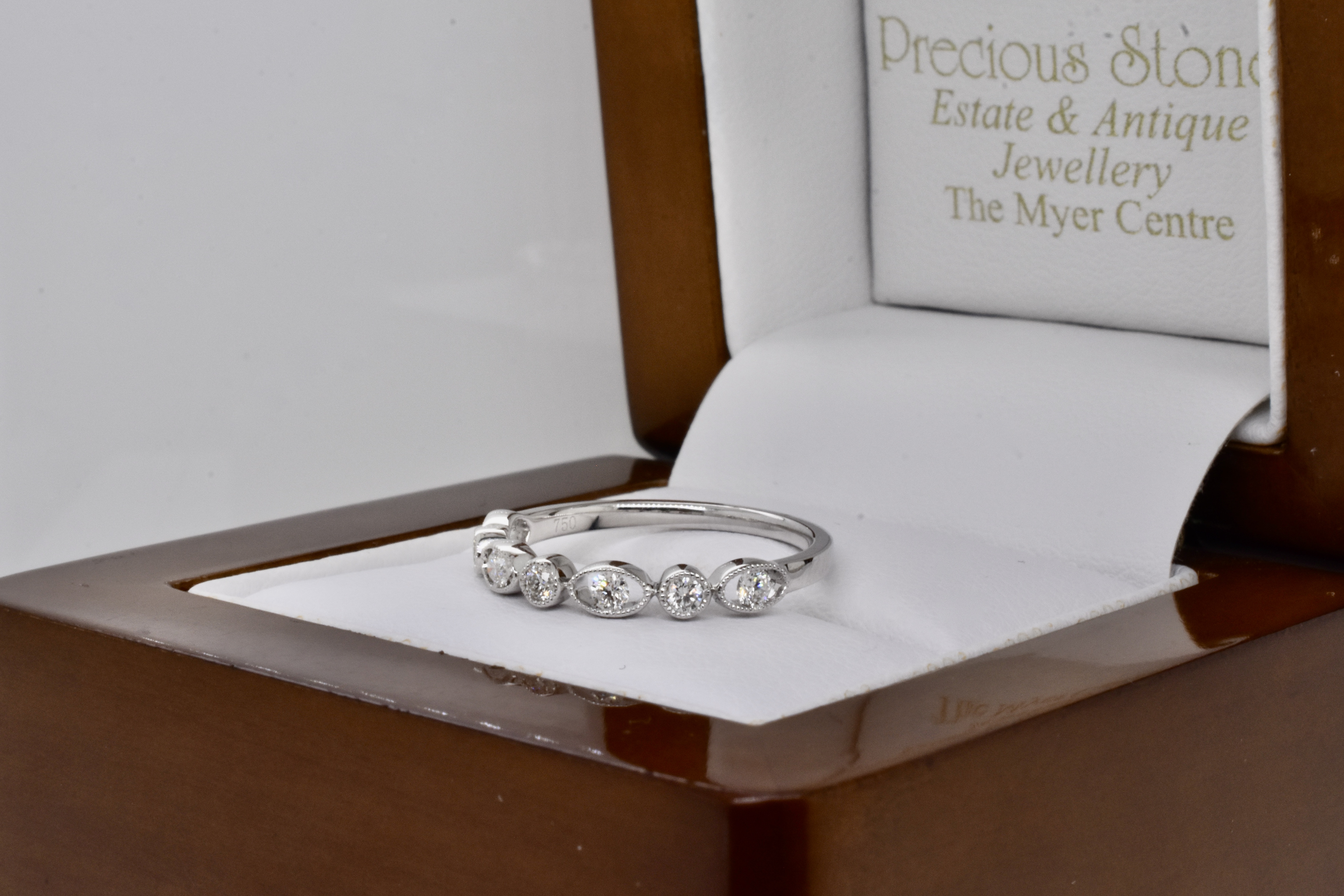 This stunning Art Deco inspired diamond band is ideal as a wedding, anniversary or stacking ring. The ring has been crafted in 18ct white gold and features seven round brilliant cut diamonds totalling 0.26cts F/VS-SI set in alternating individual millgrain round and oval bezels. Finger size M+ Independent Valuation Supplied