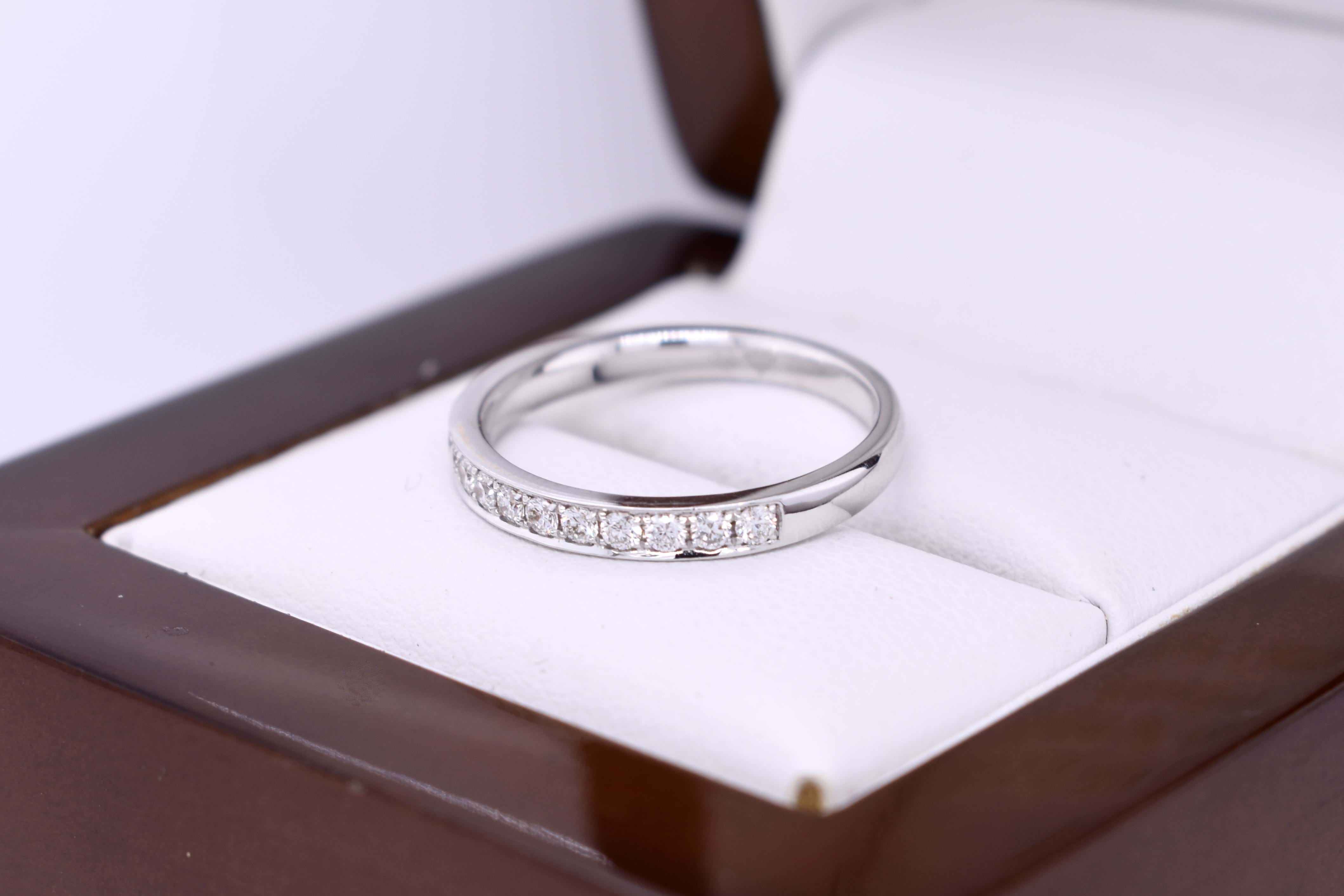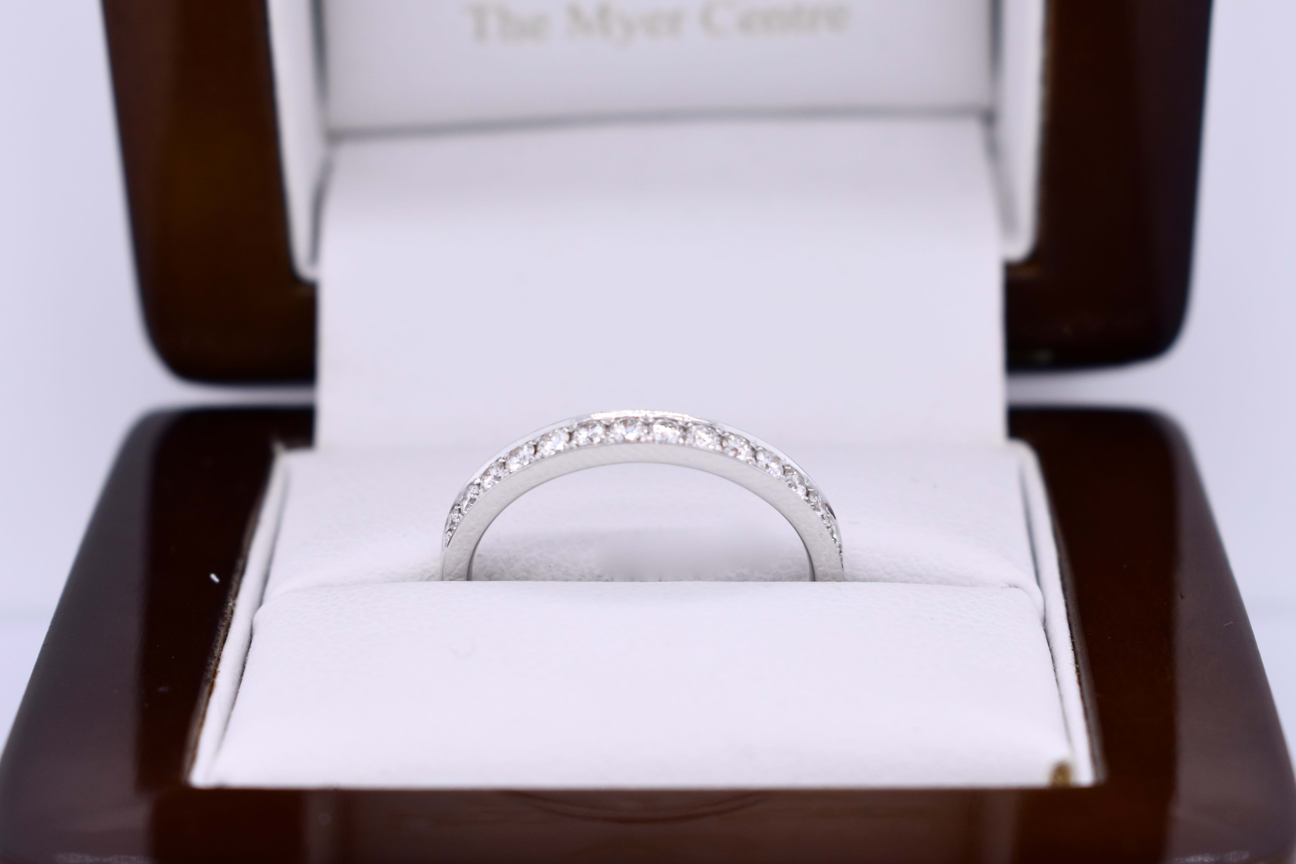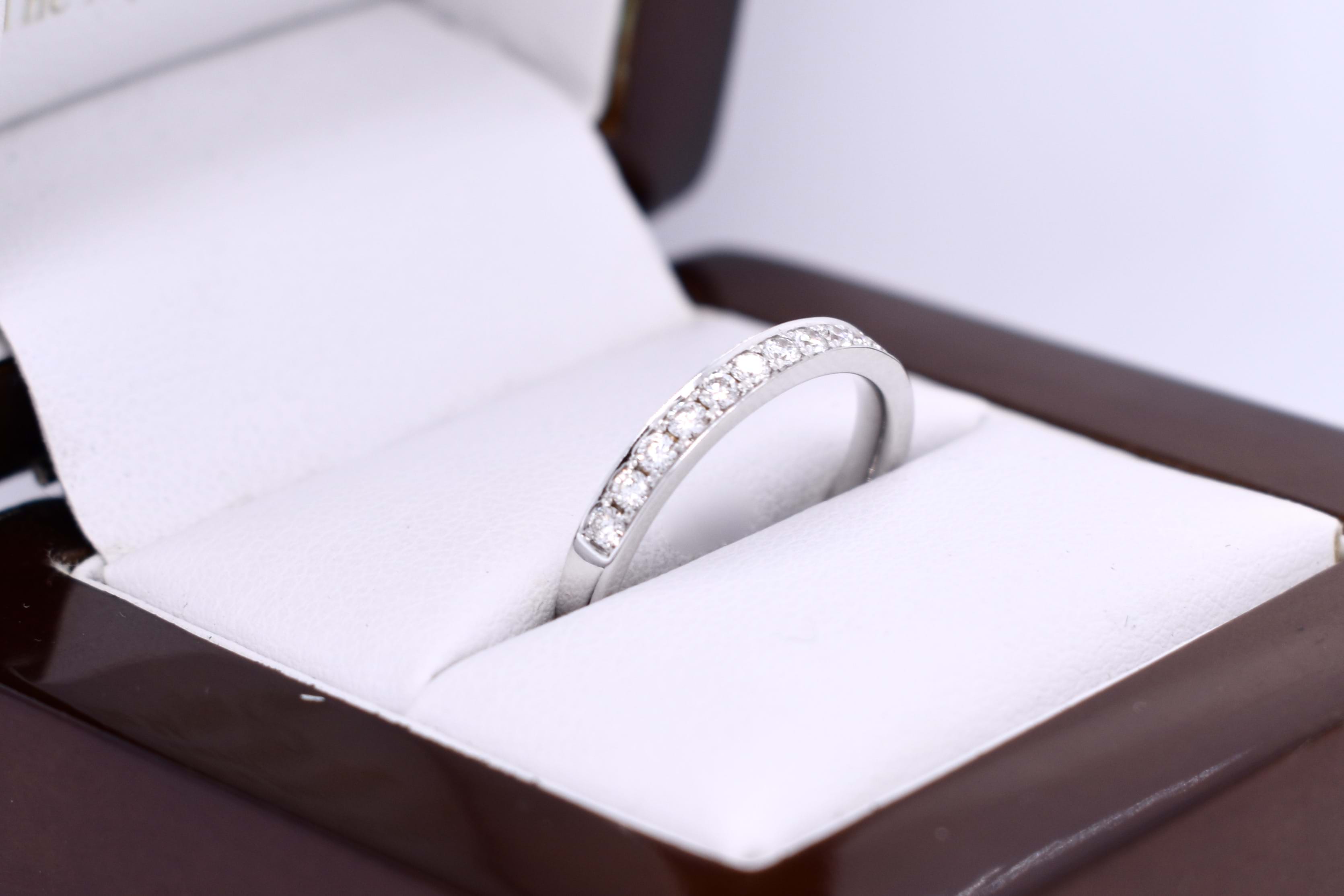 18ct white gold diamond band containing 16 round brilliant cut diamonds equalling 0.35cts grain set around half of the band. Finger size M+.