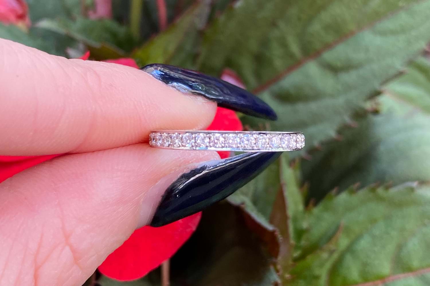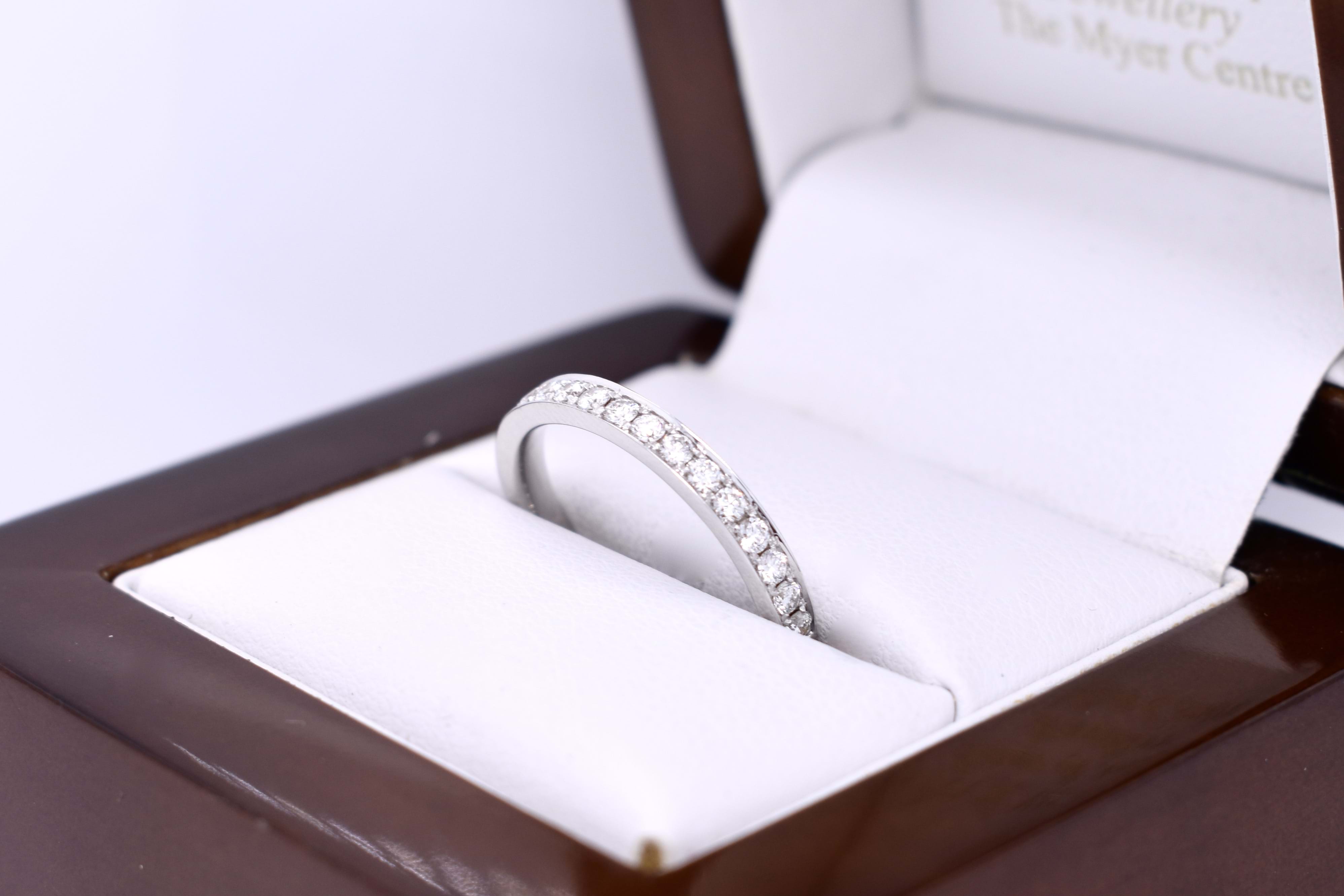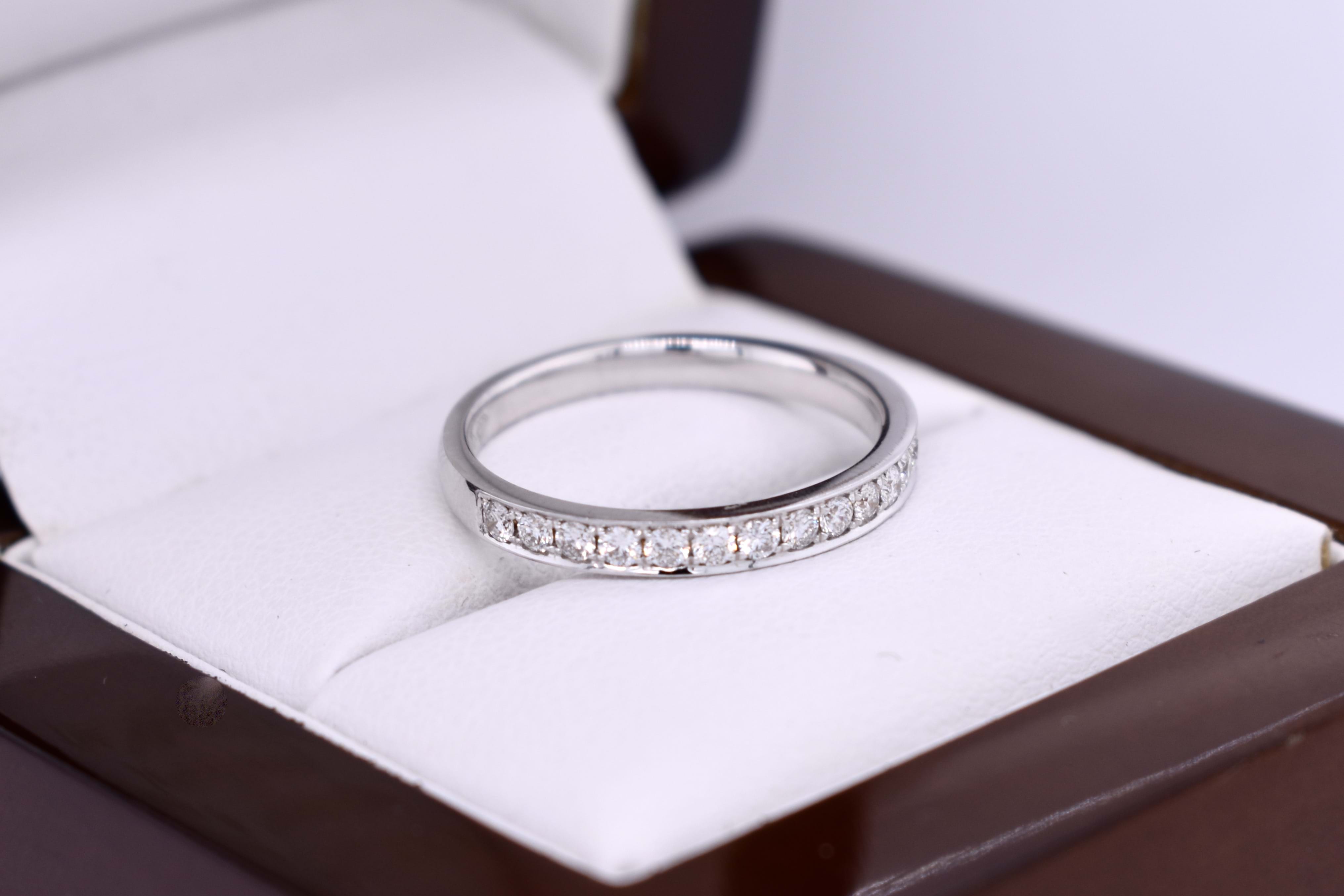 18ct white gold diamond band containing 16 round brilliant cut diamonds equalling 0.35cts grain set around half of the band. Finger size M+.