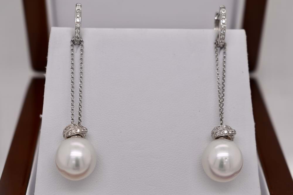 HALF PRICE! 9ct White Gold 12mm South Sea Pearl & 0.31cts Diamond Long Drop Earrings