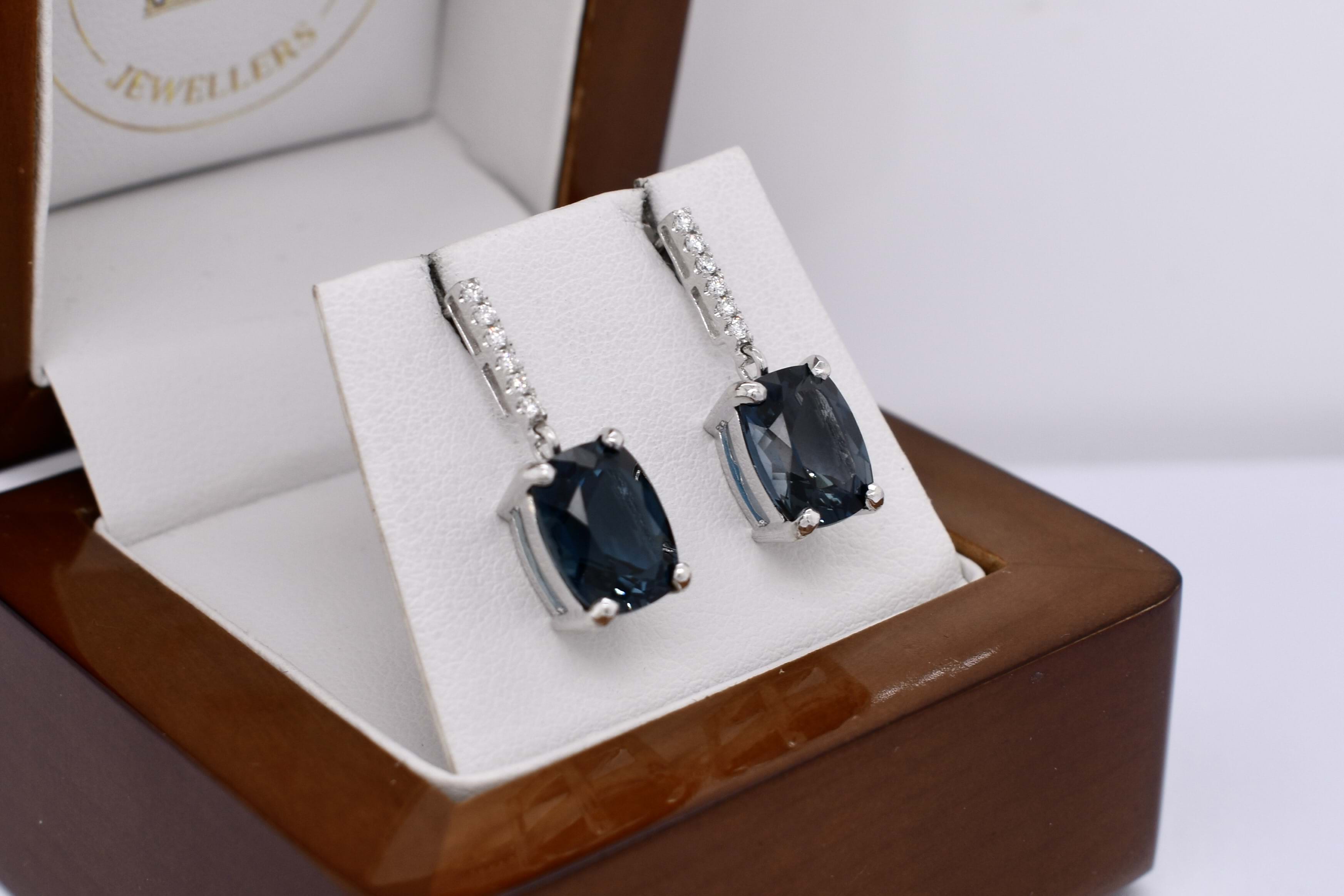 9ct White Gold 6.63ct London Blue Topaz & 0.11ct Diamond Stud Drops
