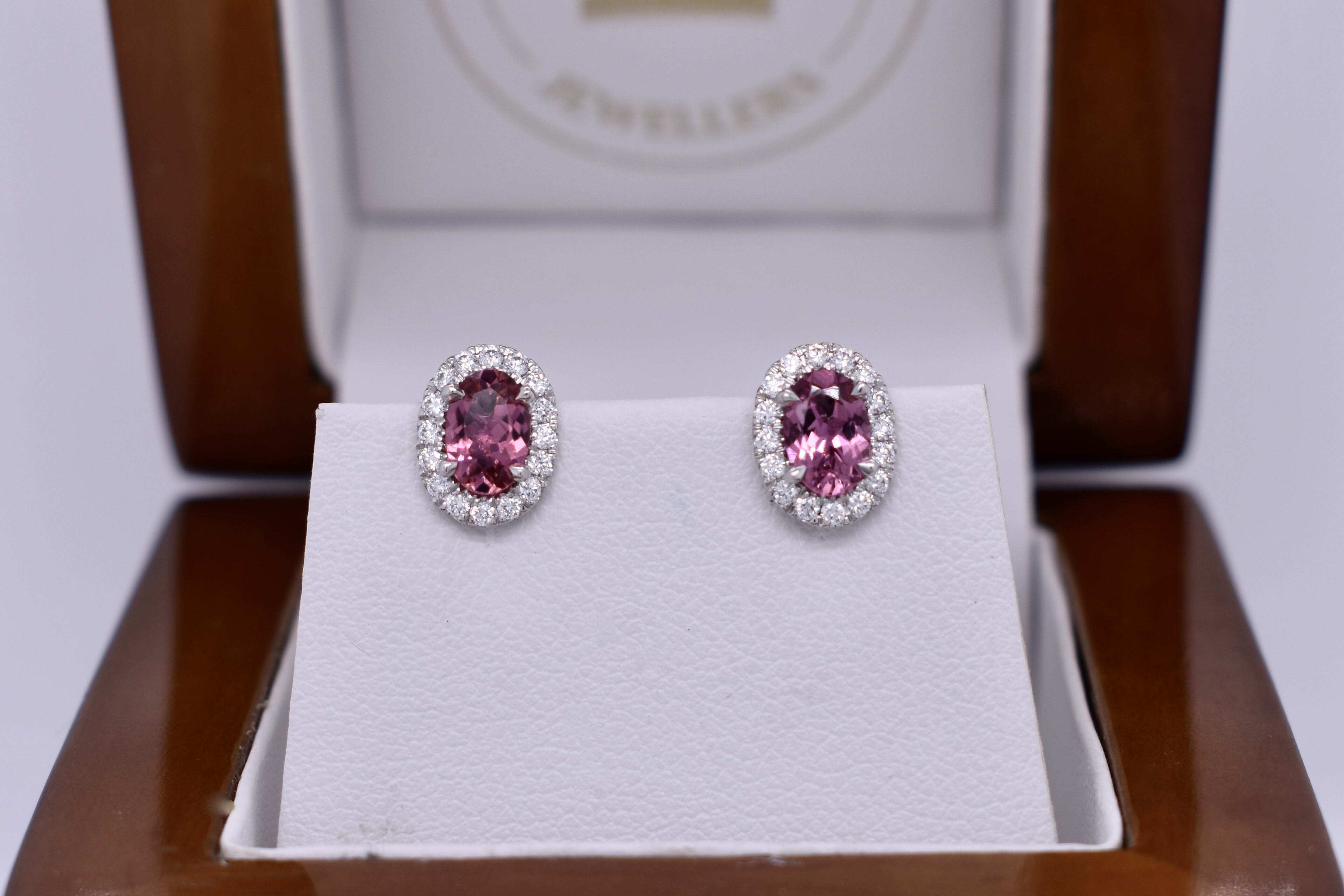18ct White Gold Oval 0.95ct Pink Tourmaline & 0.23ct Diamond Halo Studs