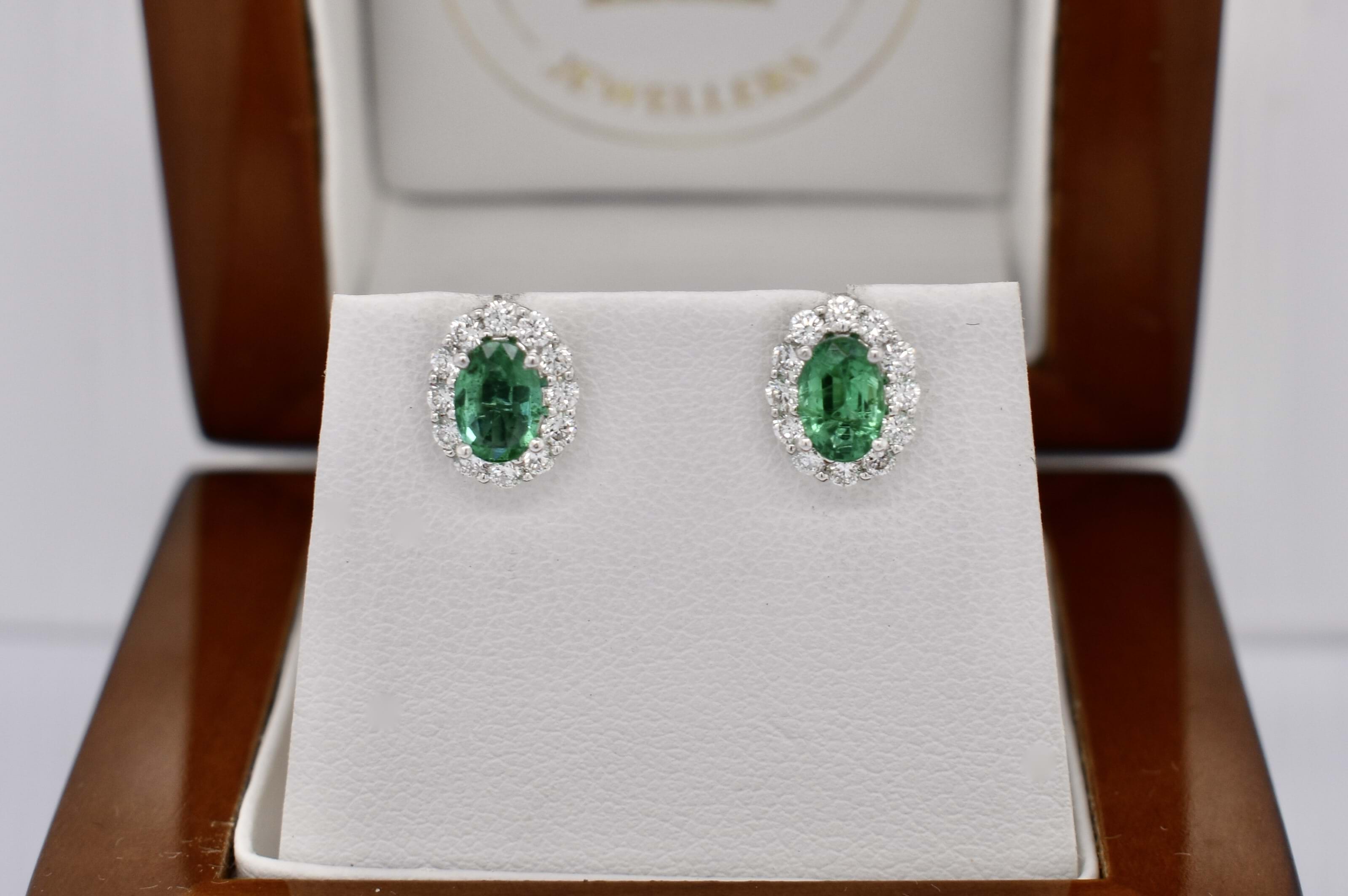 18ct White Gold Oval 0.73ct Emerald & 0.45ct Diamond Halo Studs
