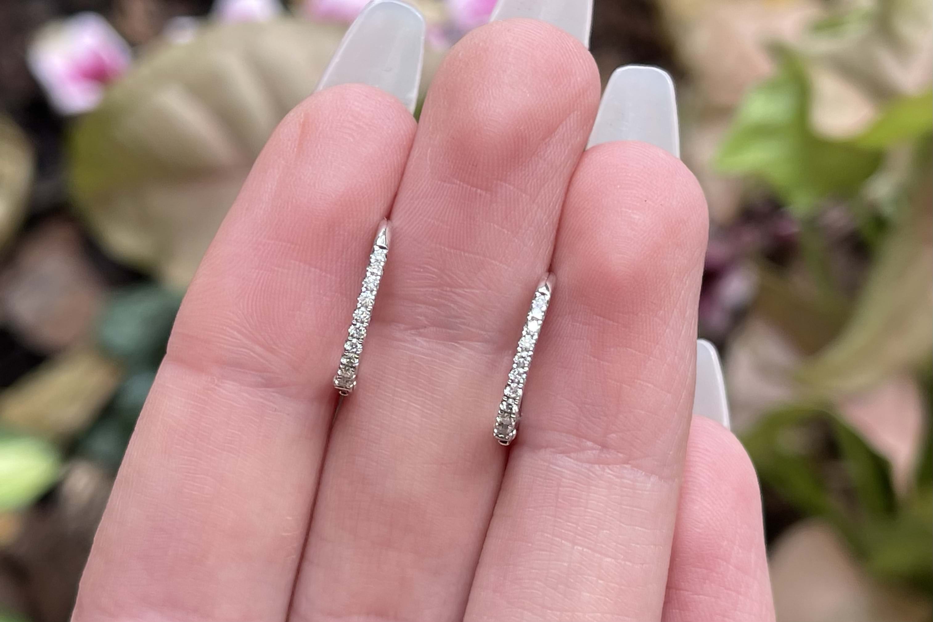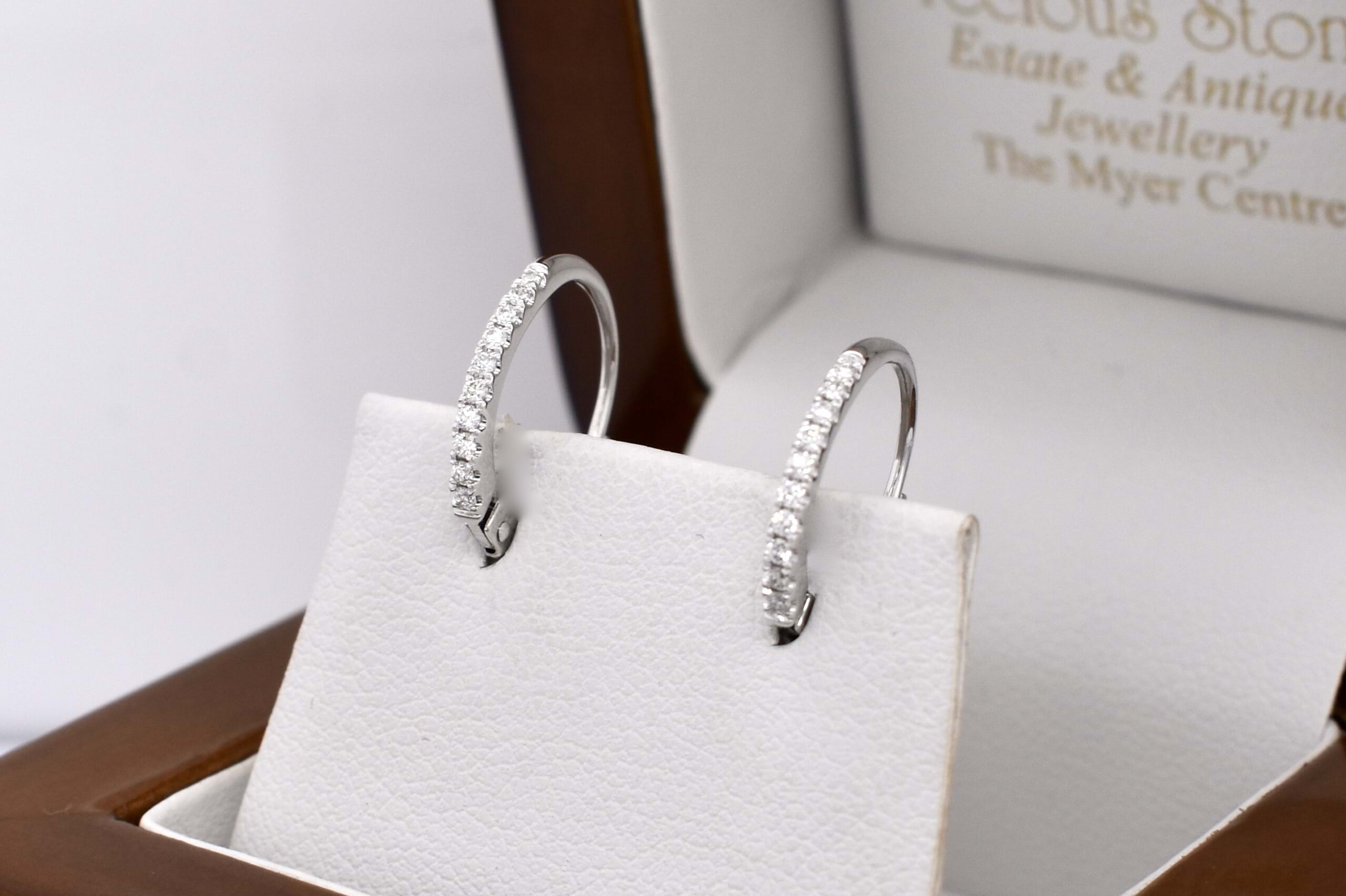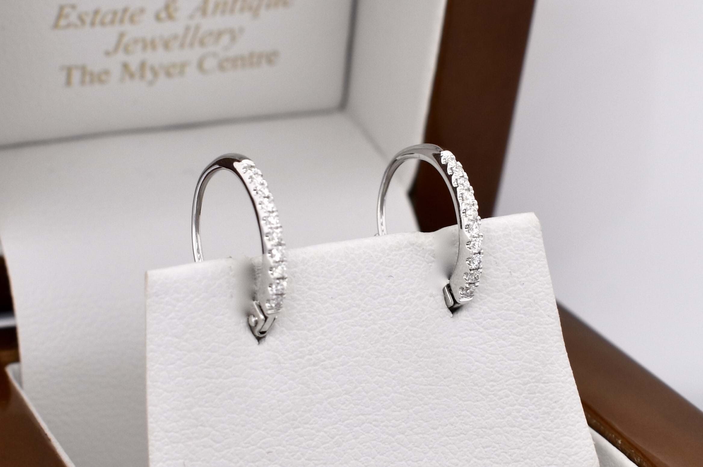 The perfect everyday pair of huggies, consisting of 20 white round brilliant cut 1.10mm diamonds, totalling 0.12ct GH VS-SI. Beautifully crafted in 18ct white gold, the diamonds are cut down claw set with hinged euro clip fittings. Independent Valuation Supplied.