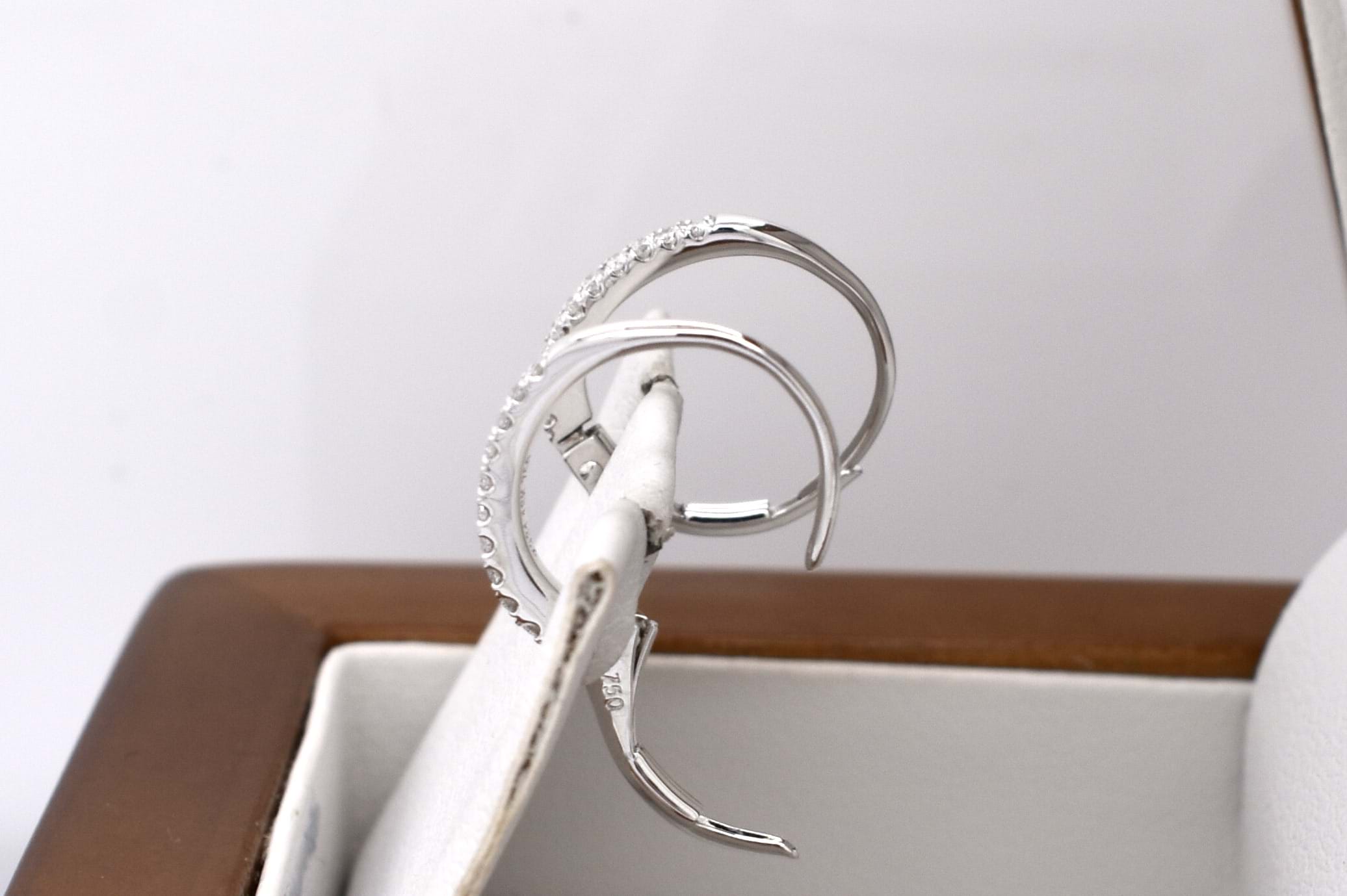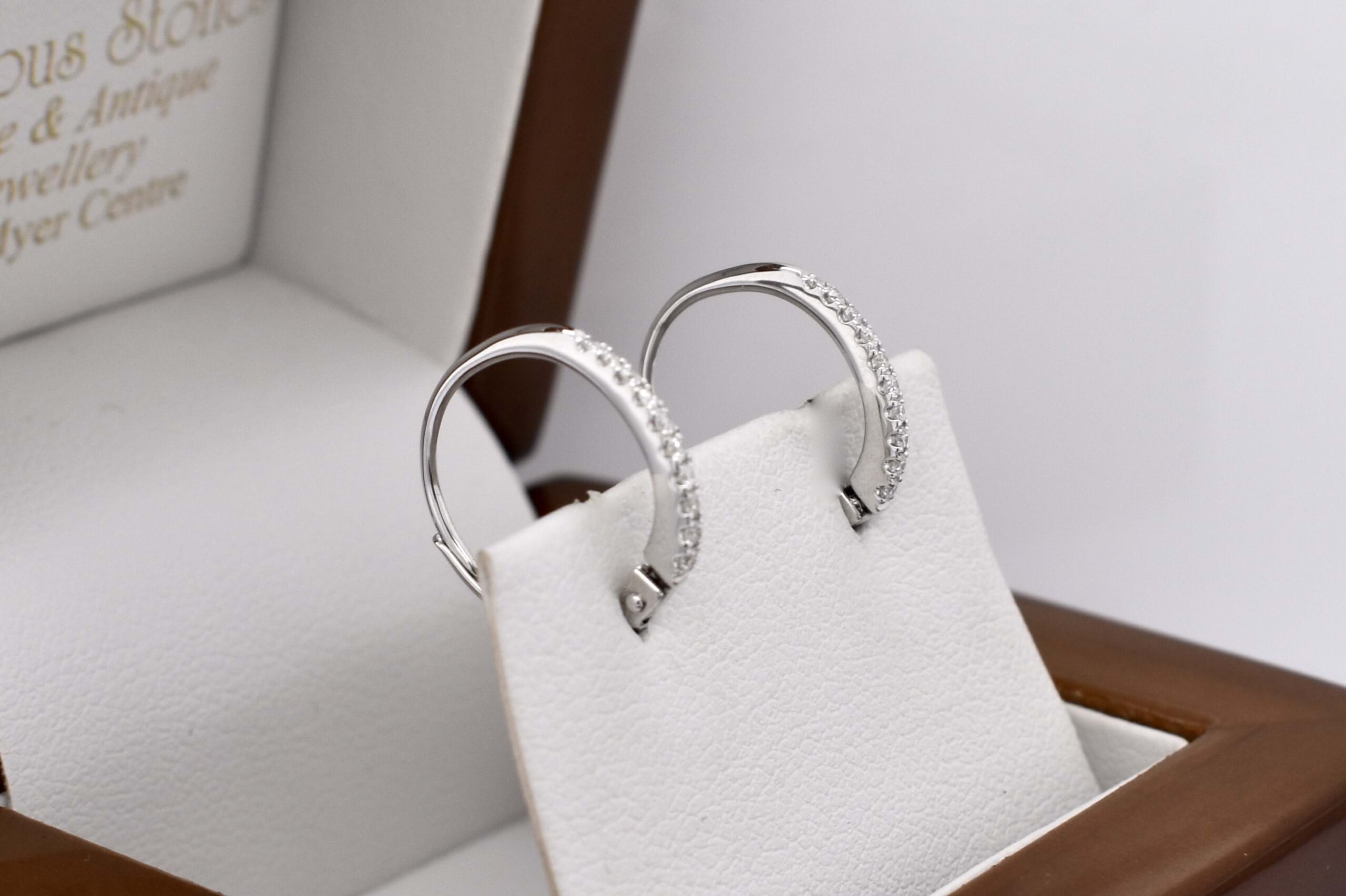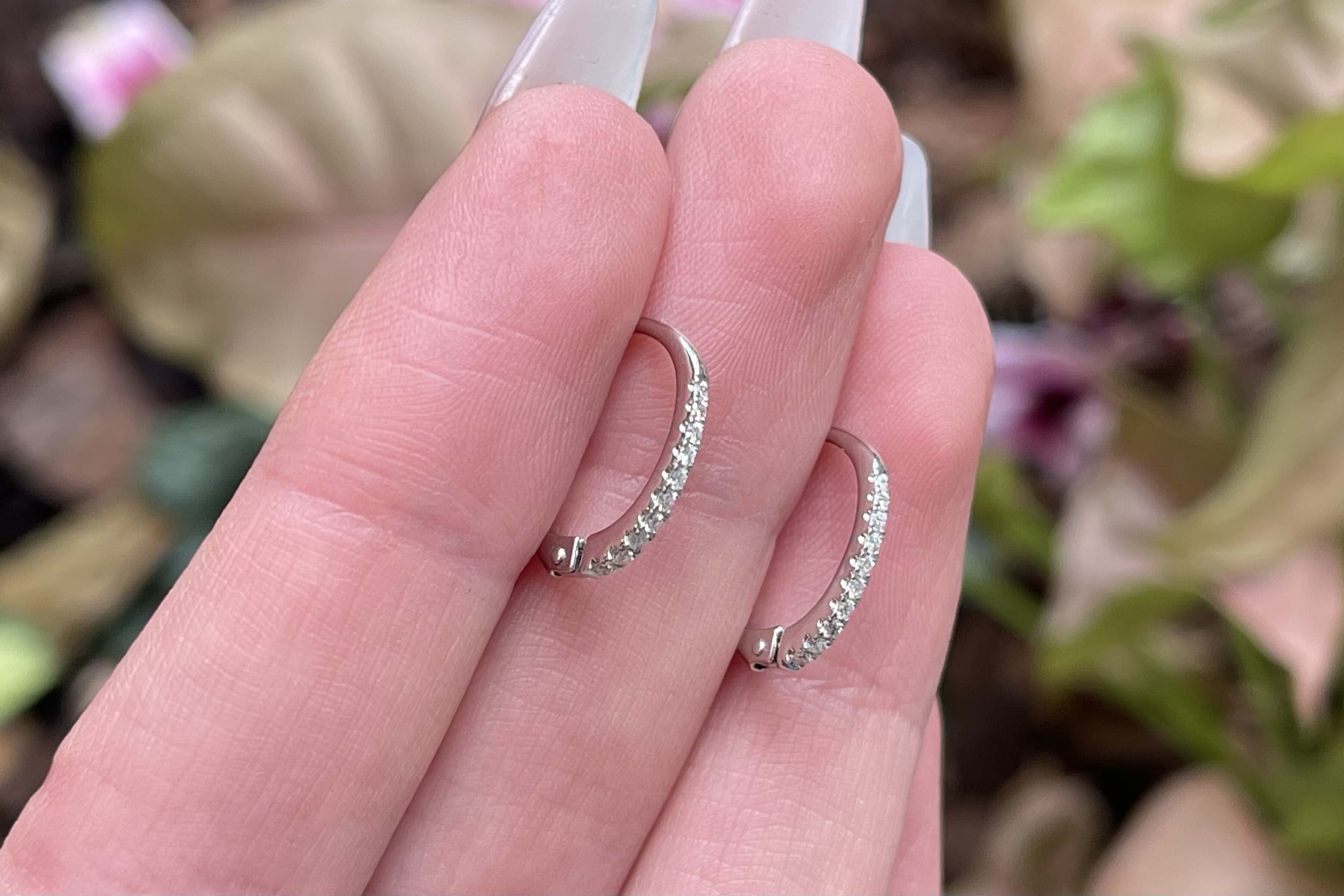 The perfect everyday pair of huggies, consisting of 20 white round brilliant cut 1.10mm diamonds, totalling 0.12ct GH VS-SI. Beautifully crafted in 18ct white gold, the diamonds are cut down claw set with hinged euro clip fittings. Independent Valuation Supplied.