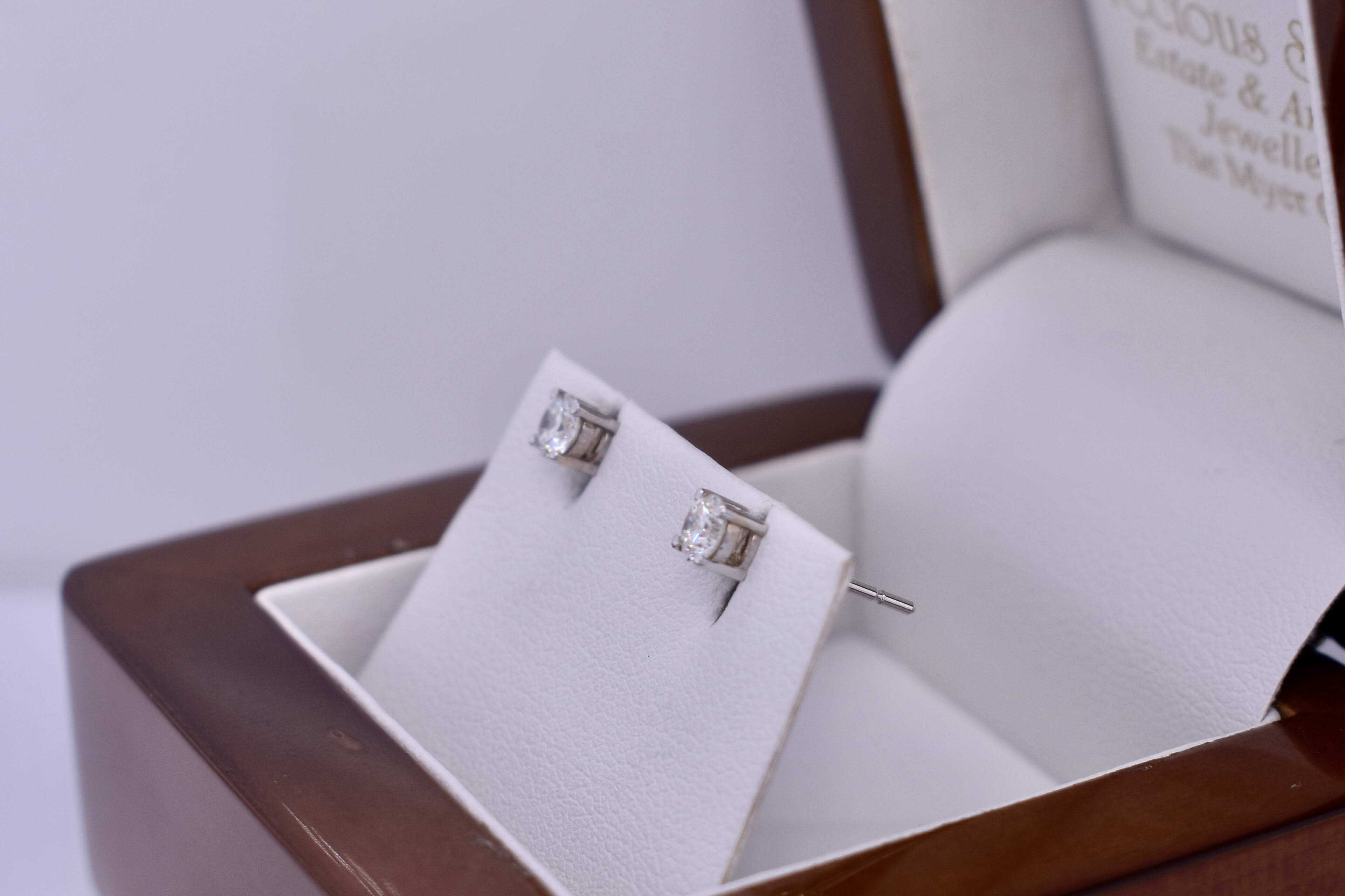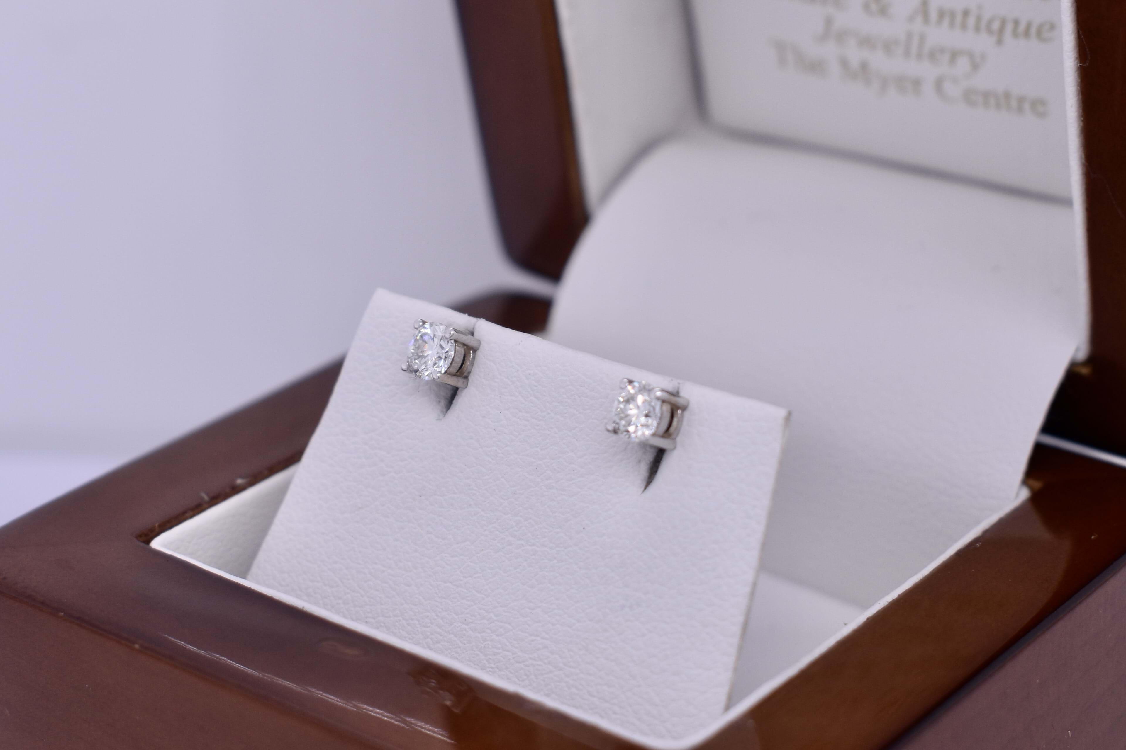 Simple and elegant, these 3.65mm round brilliant cut diamonds are set in 18ct hite gold four claw settings with post and butterfly fittings. Total diamond weight 0.40ct G colour, VS-SI clarity. Independent Valuation Supplied.