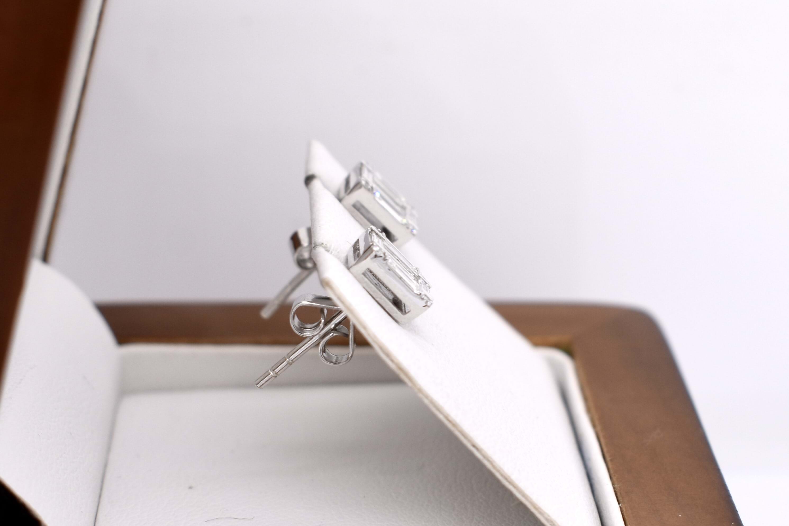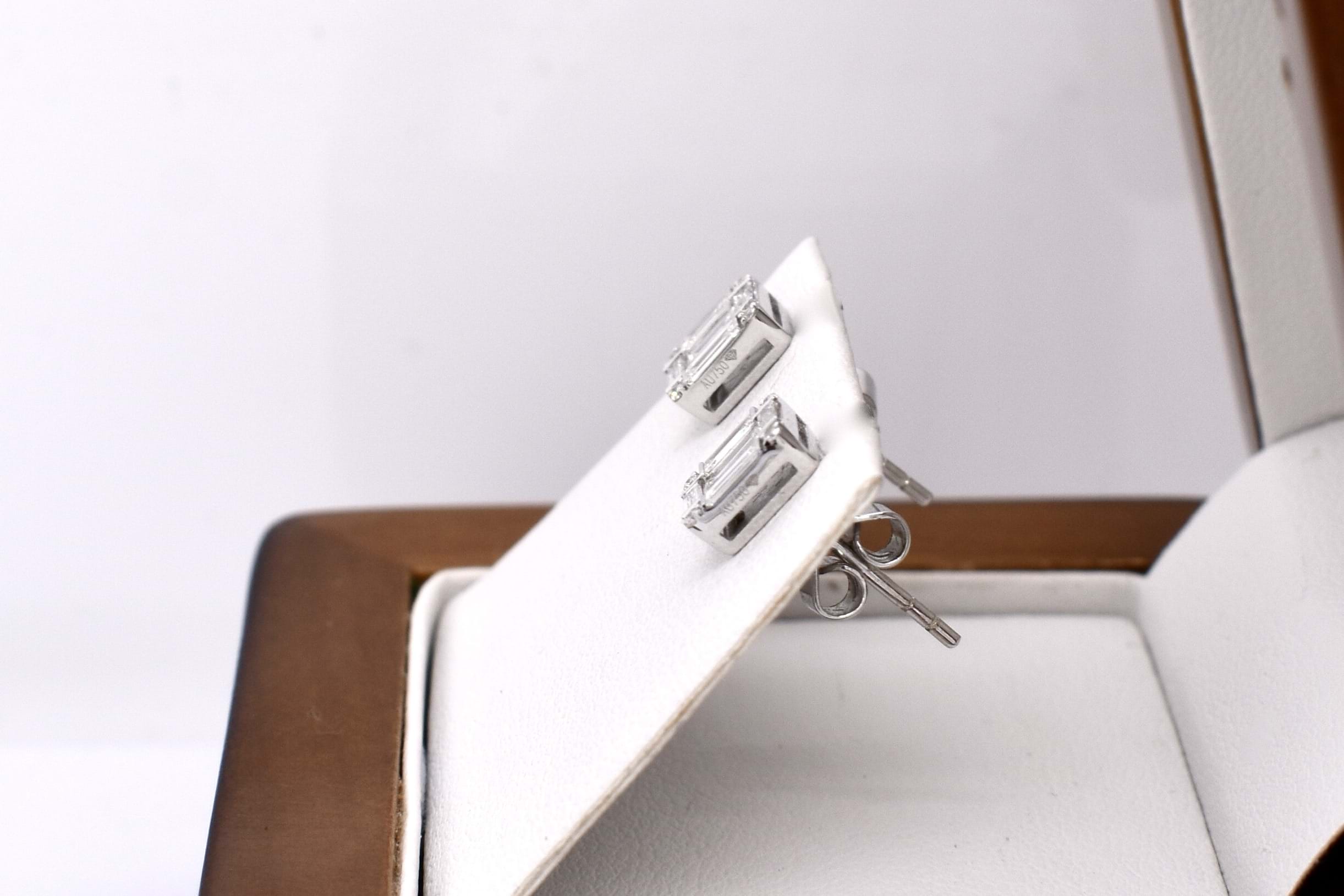 Sparkling and stunning these 18ct white gold diamond studs give the illusion of large single emerald cut diamonds with a halo surround. They are designed using a combination of baguette and round cut diamonds, each earring has six baguettes and four round brilliant cut diamonds, the baguettes have a combined total of 0.48cts & rounds 0.04ct FG SI. Earrings have post and butterfly fittings. Independent Valuation Supplied.