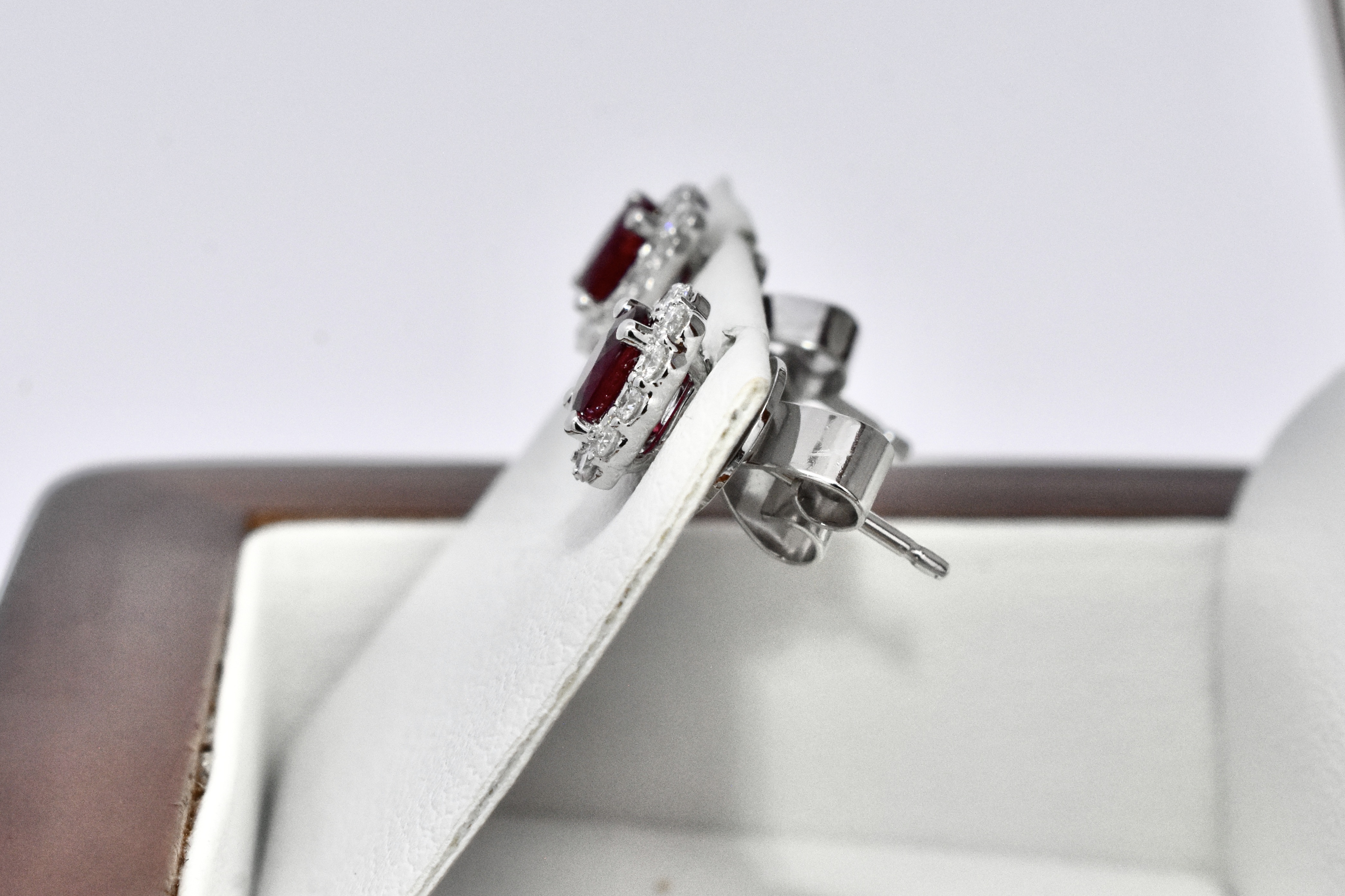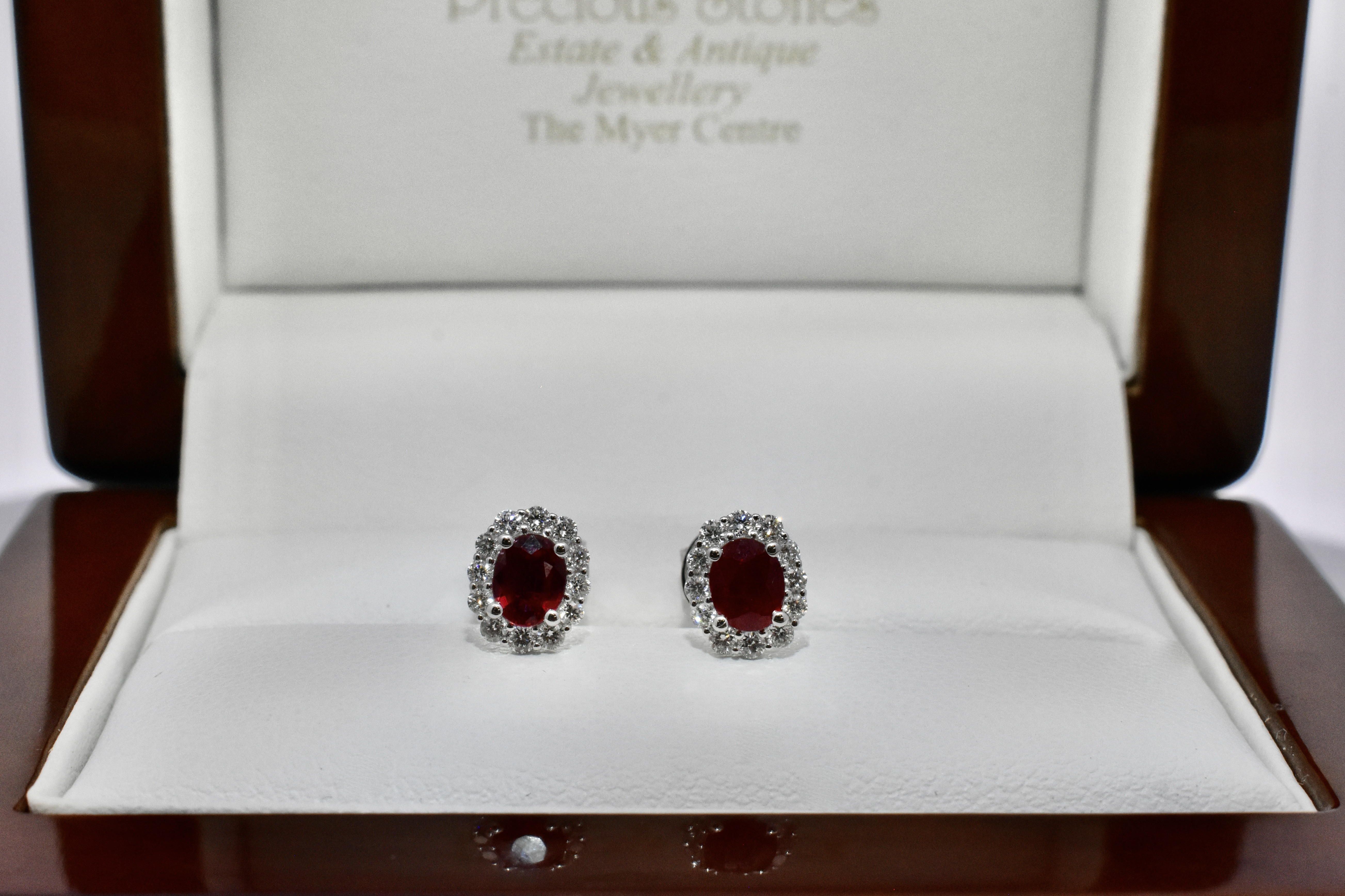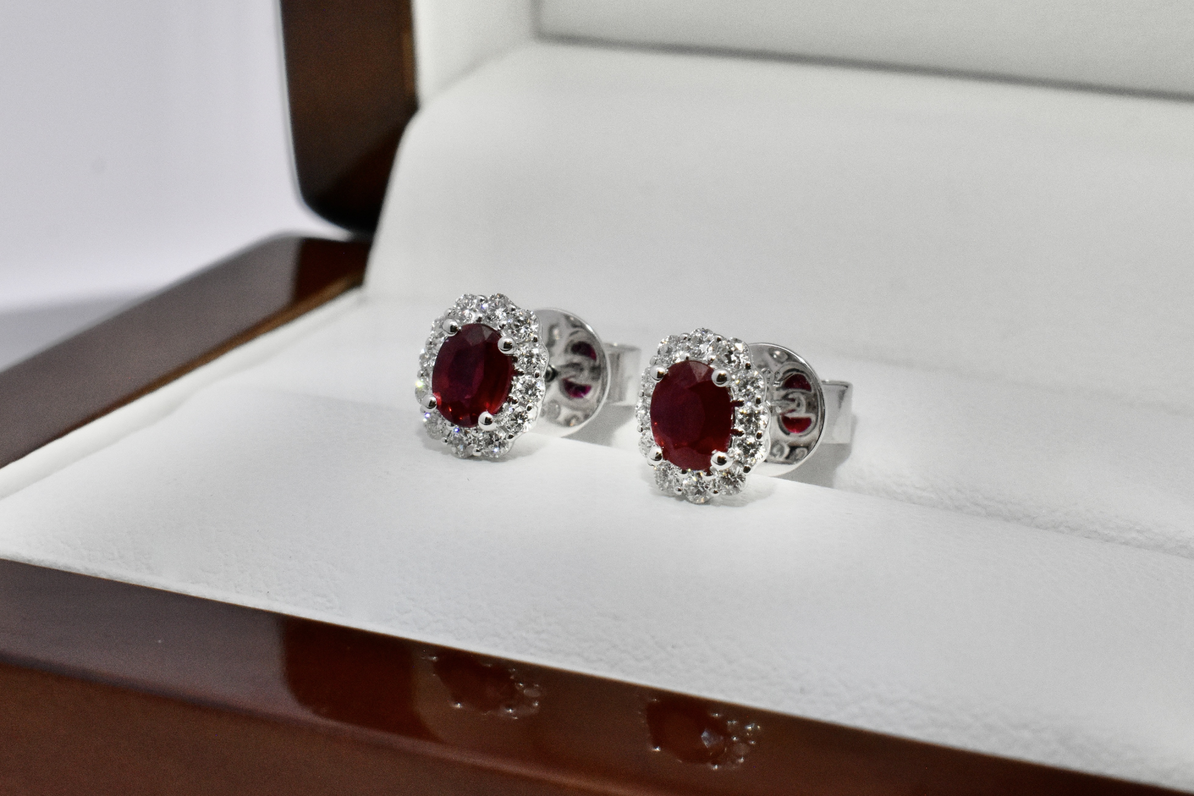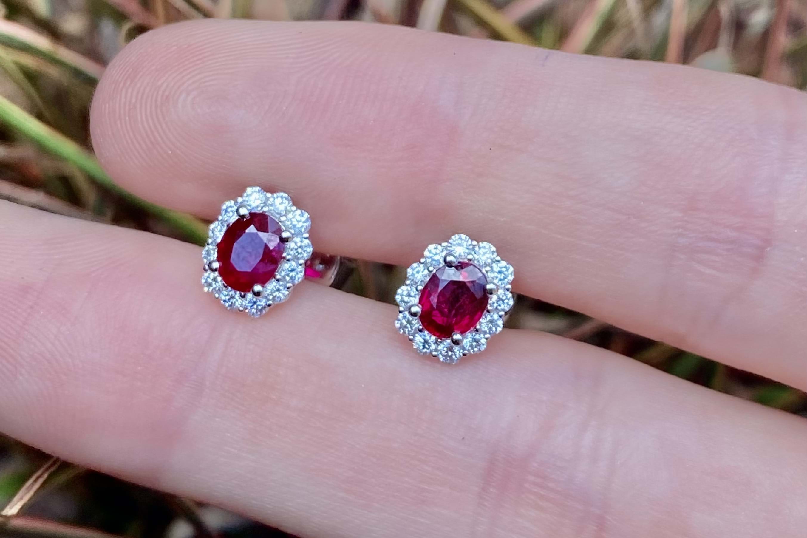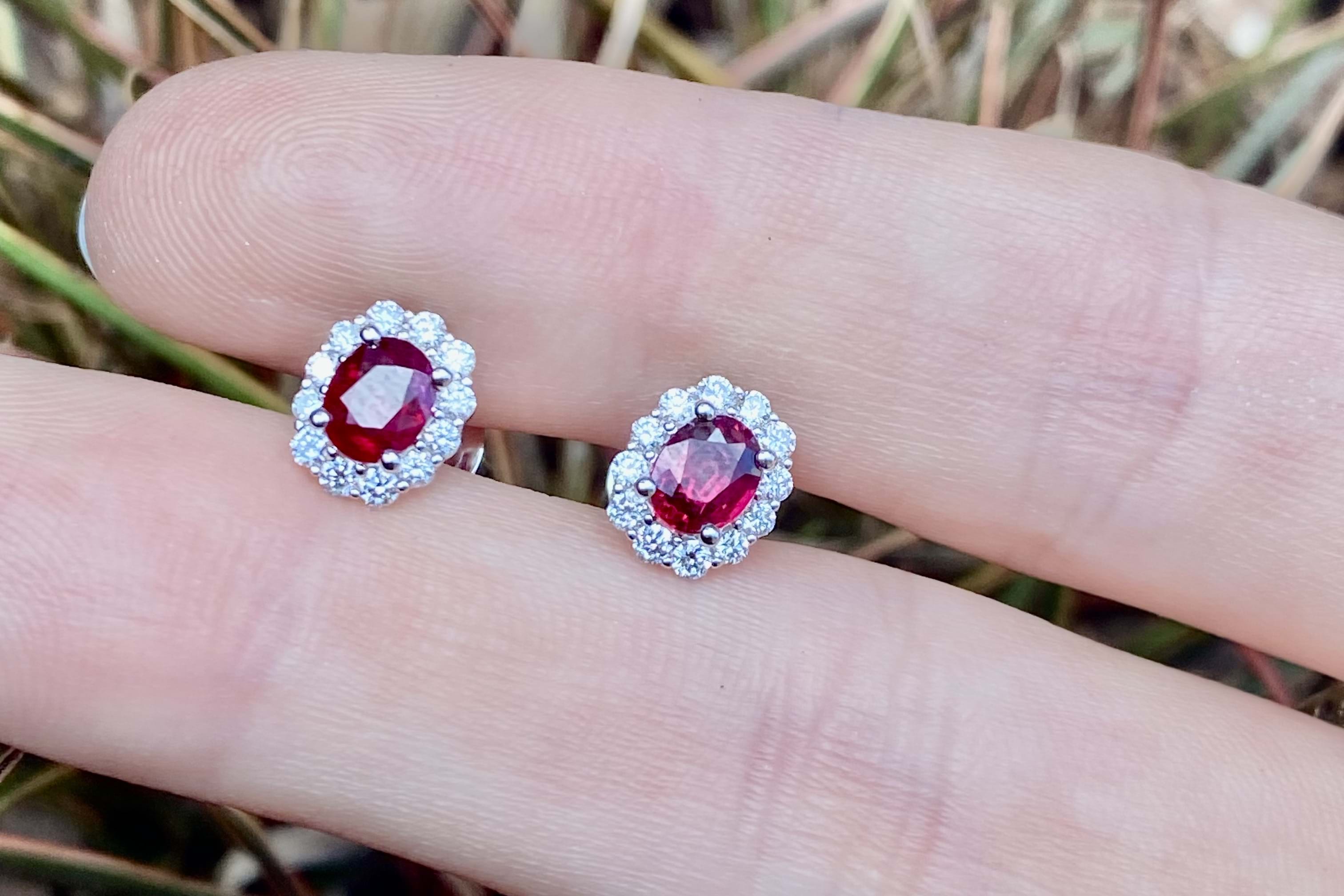 Elegant 0.90ct bright dark red ruby studs, four claw set in 18ct white gold, surrounded with a shimmering halo of 24 round brilliant cut diamonds totalling 0.29ct FG SI. Independent Valuation Supplied
