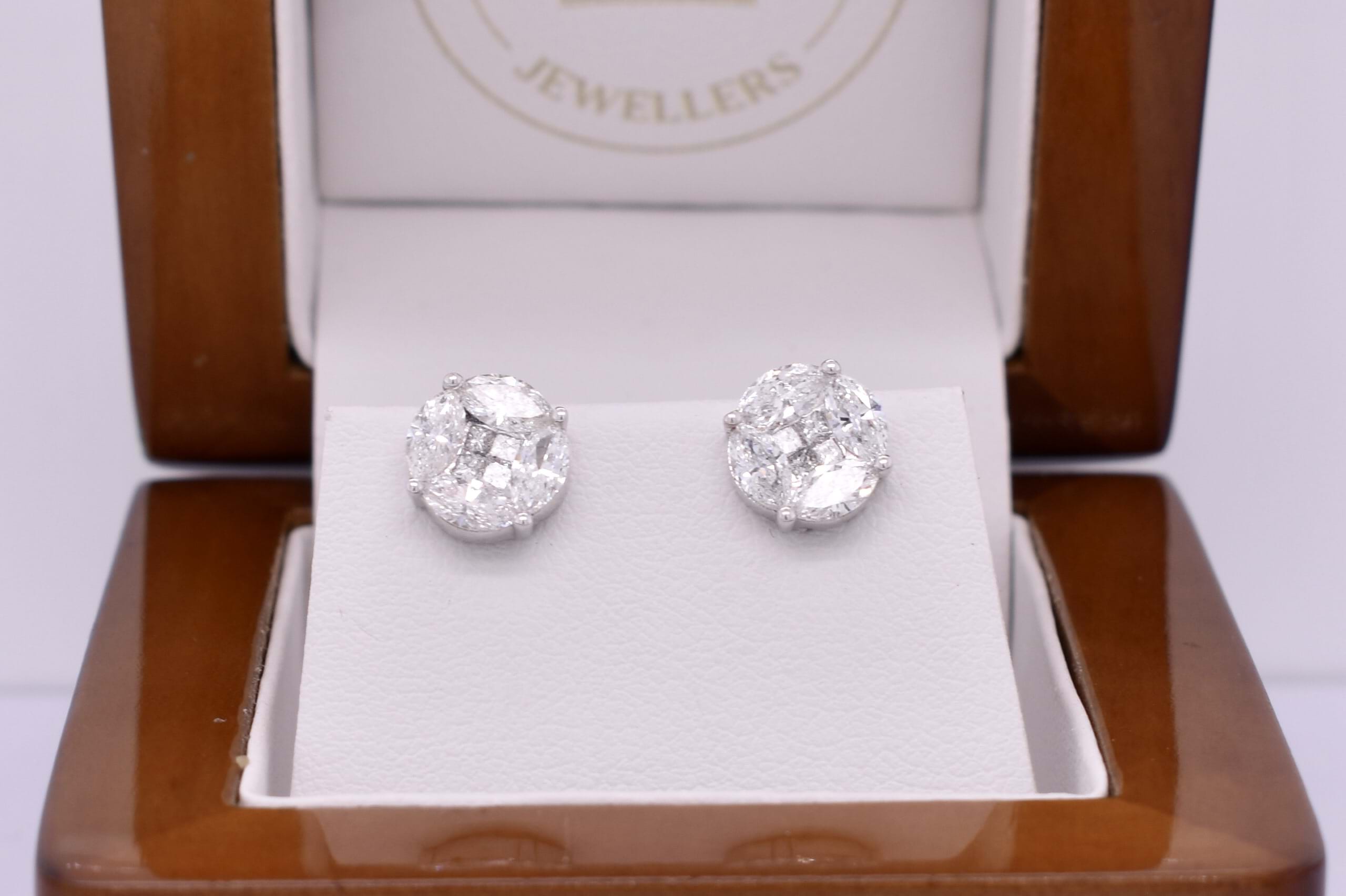 This gorgeous pair of sparkling diamond illusion cluster studs contains 8 princess cut diamonds, totalling 0.18ct G SI and 8 marquise shaped diamonds totalling 1.10ct G VS-SI, set in round illusion cluster. The princess cut diamonds measure 1.40mm and the marquise 5.00x2.85mm. Completed with post and butterfly fittings. Independent Valuation Supplied