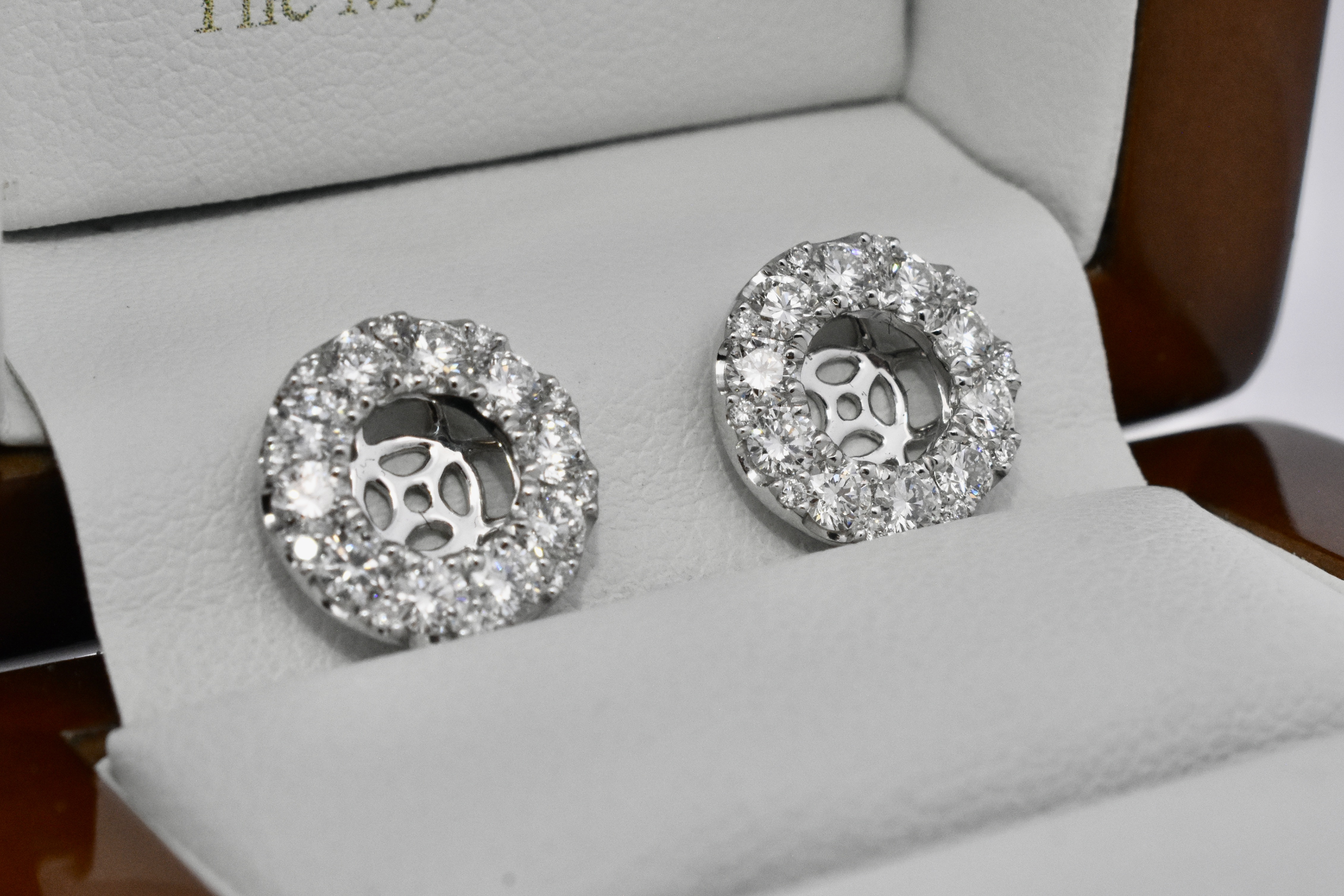 A versatile and stunning concept designed to dress up any pair of stud earrings (of the correct size centre stone) these earrings jackets can be easily added or removed from your existing studs, or come into the store to browse our selection of studs available. This pair of jackets are crafted in 18ct white gold and contain 40 round brilliant cut diamonds totalling 1.37cts FG/VS-SI and will hold 5mm studs-dependent on settings. Independent Valuation Supplied. Pictured with 20350628 available for separate purchase