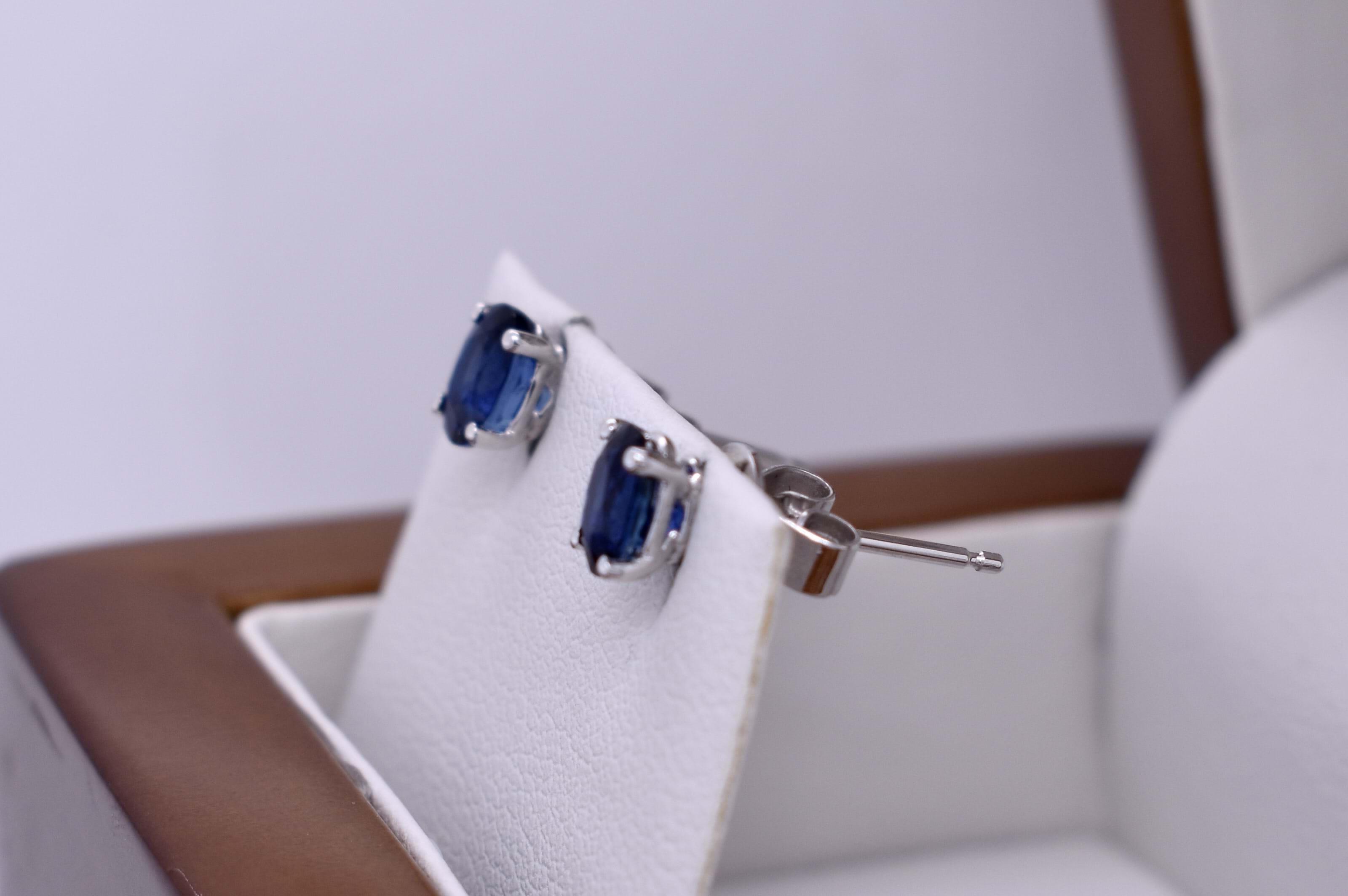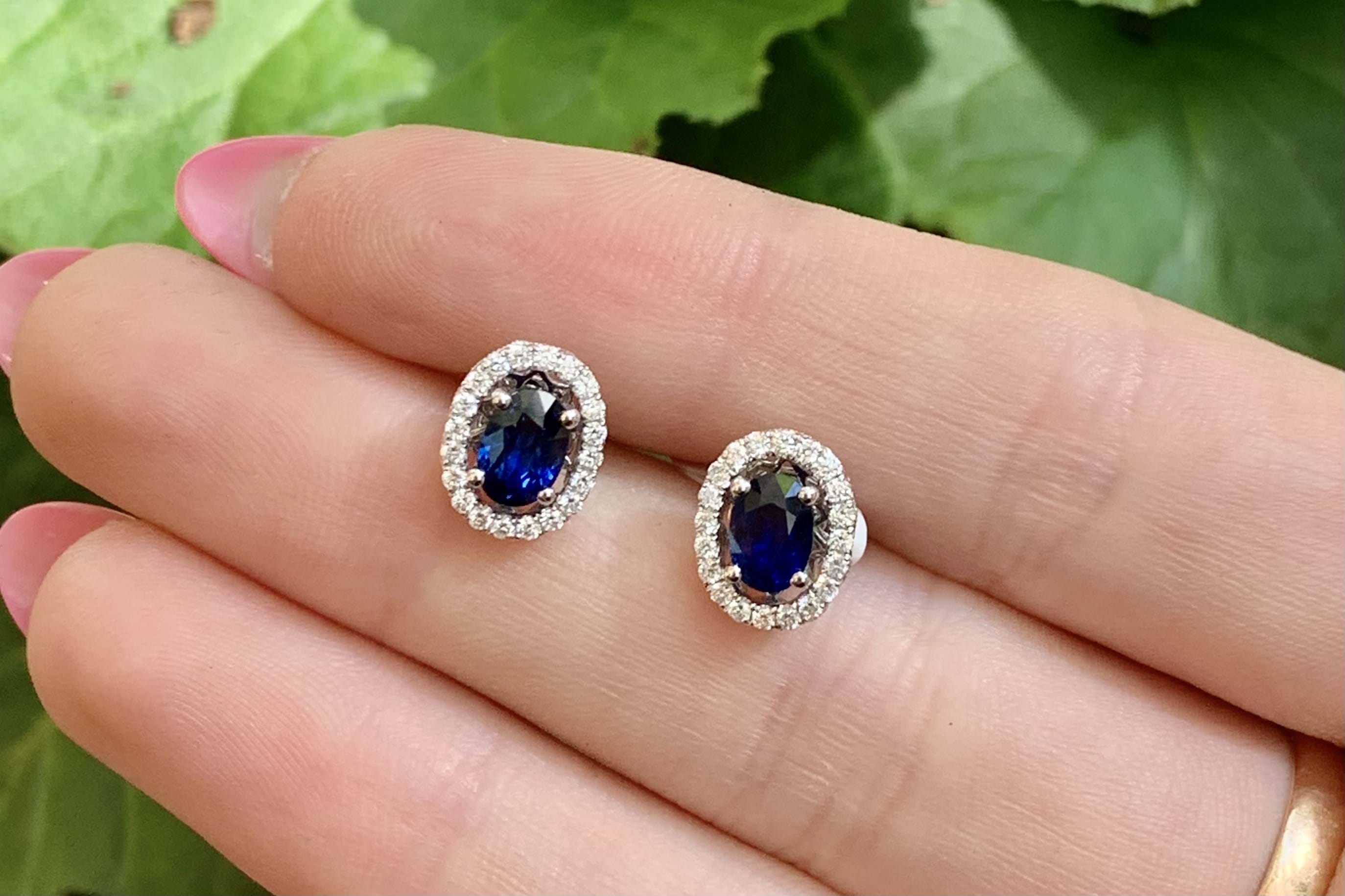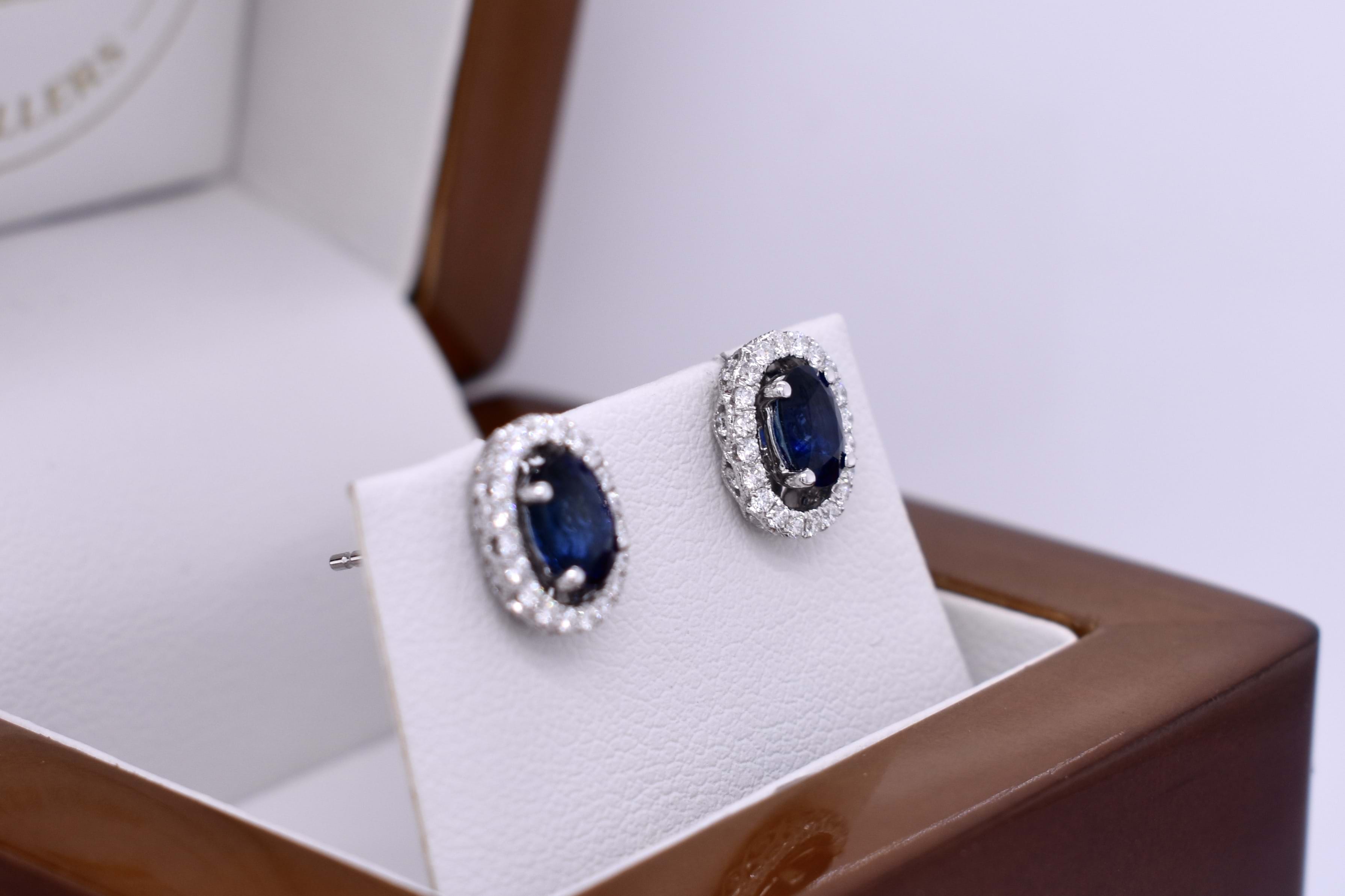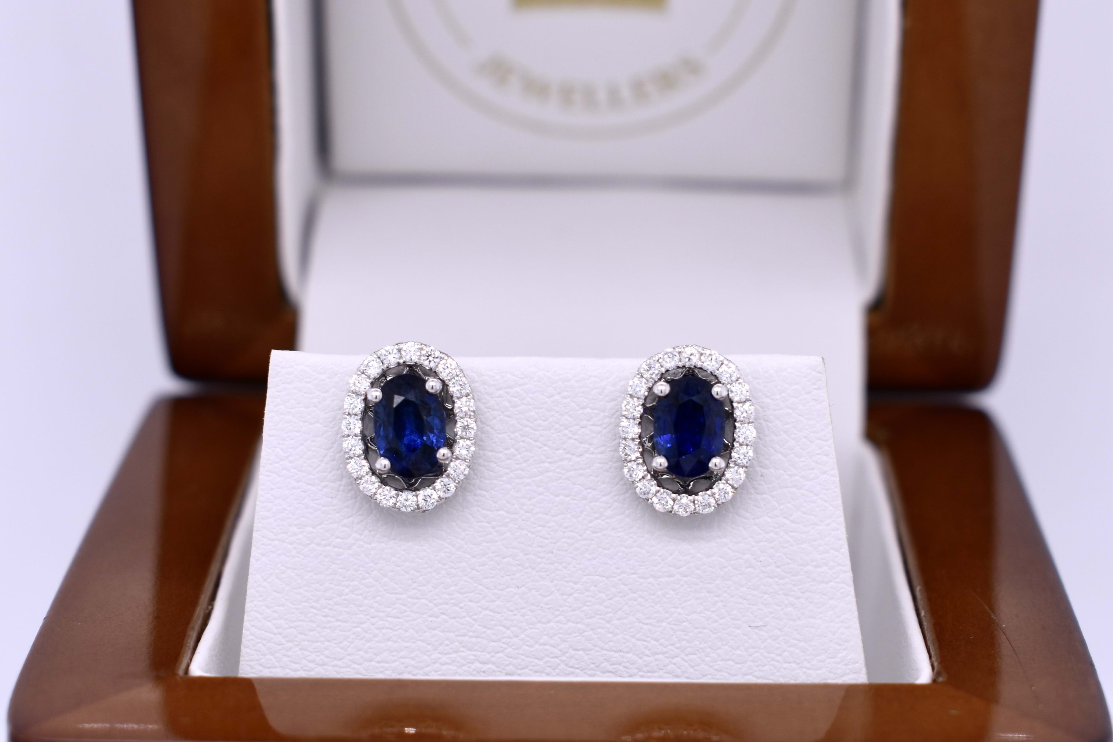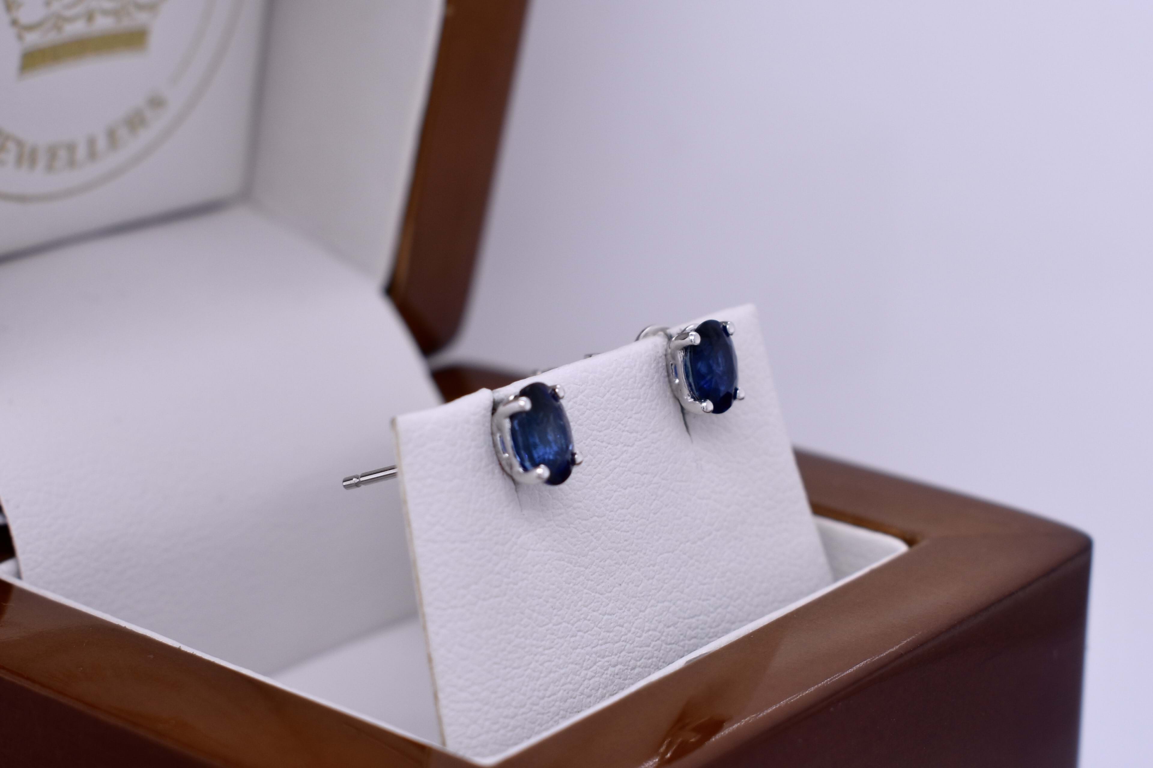 This fantastic pair of bright, deep blue, Ceylon type sapphires total 1.43cts and have been set in classic and timeless 18ct white gold four claw stud earrings.