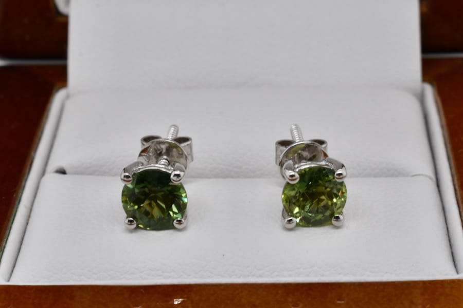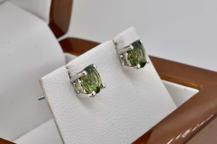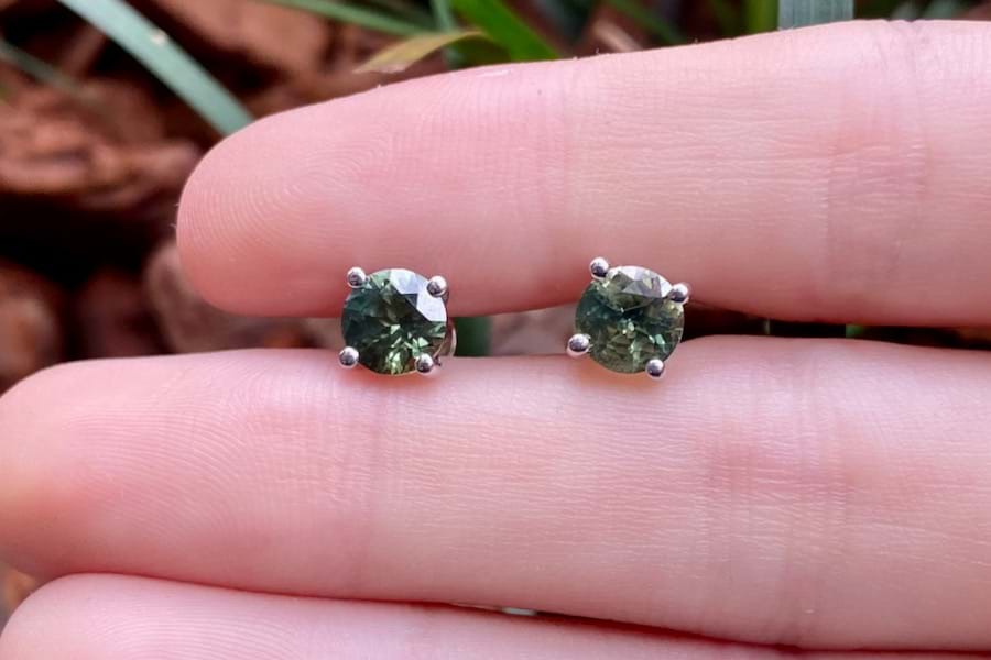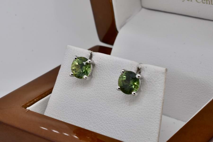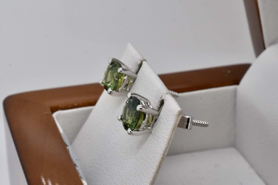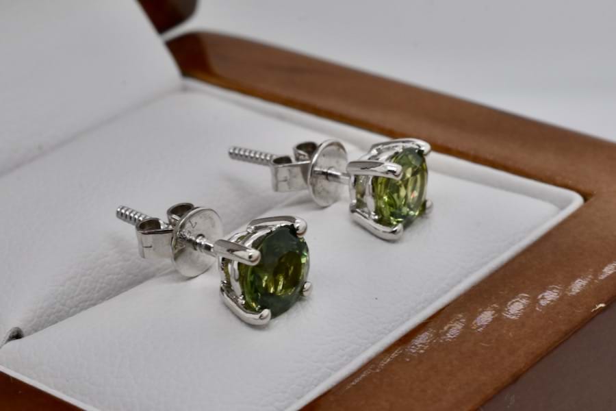A simple pair of 18ct white gold studs with gorgeous, round 2.09ct Australian greenish yellow parti sapphires, in four claws with post and butterfly fittings
