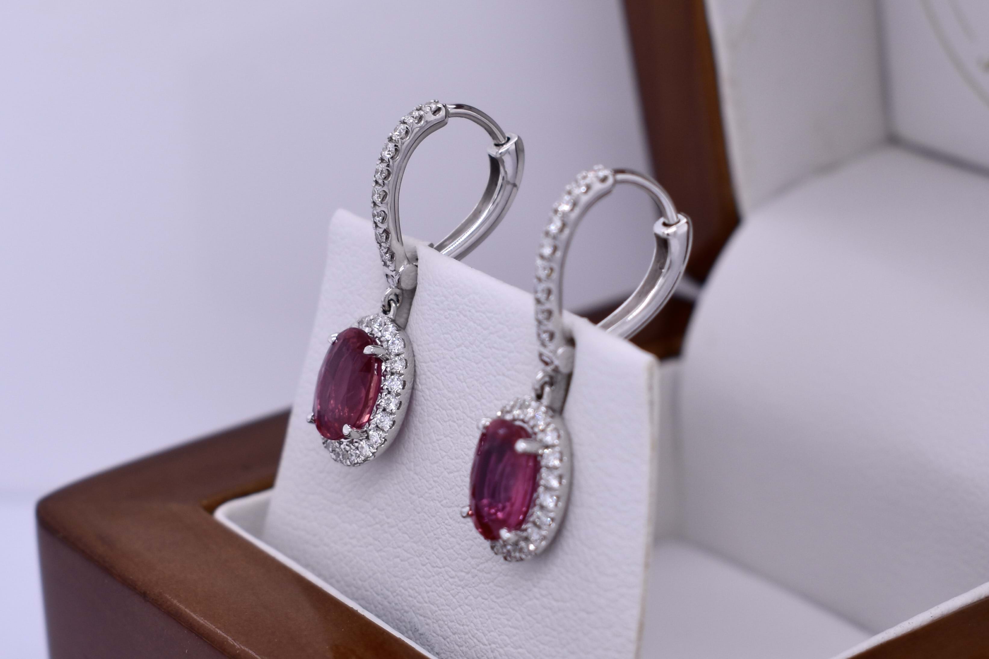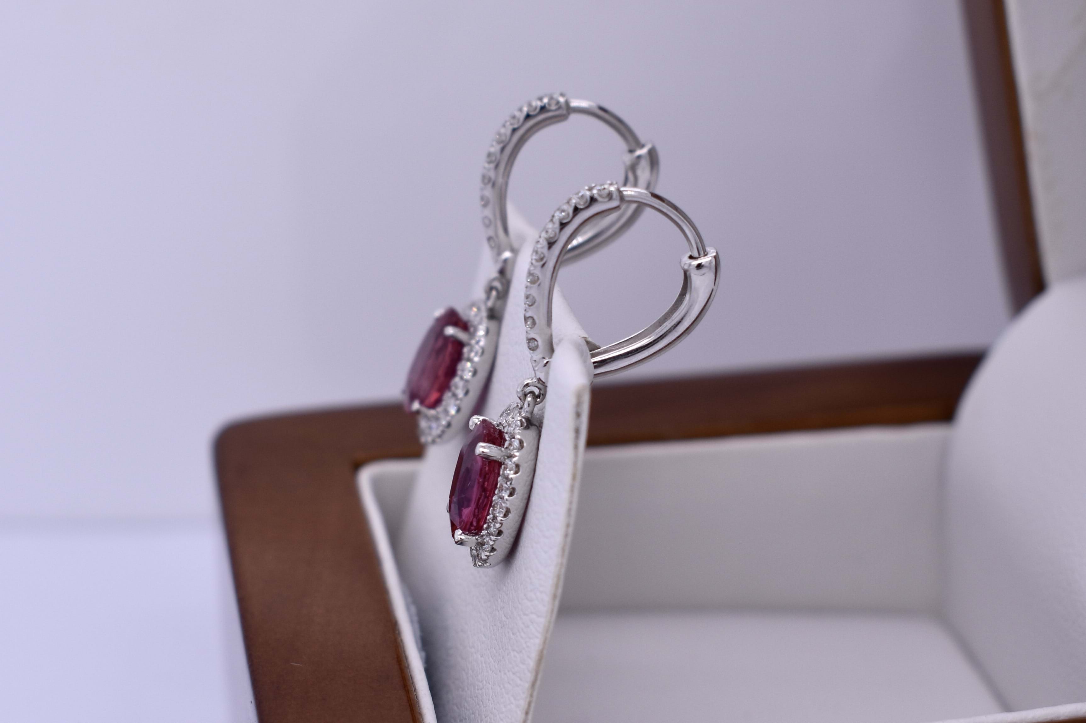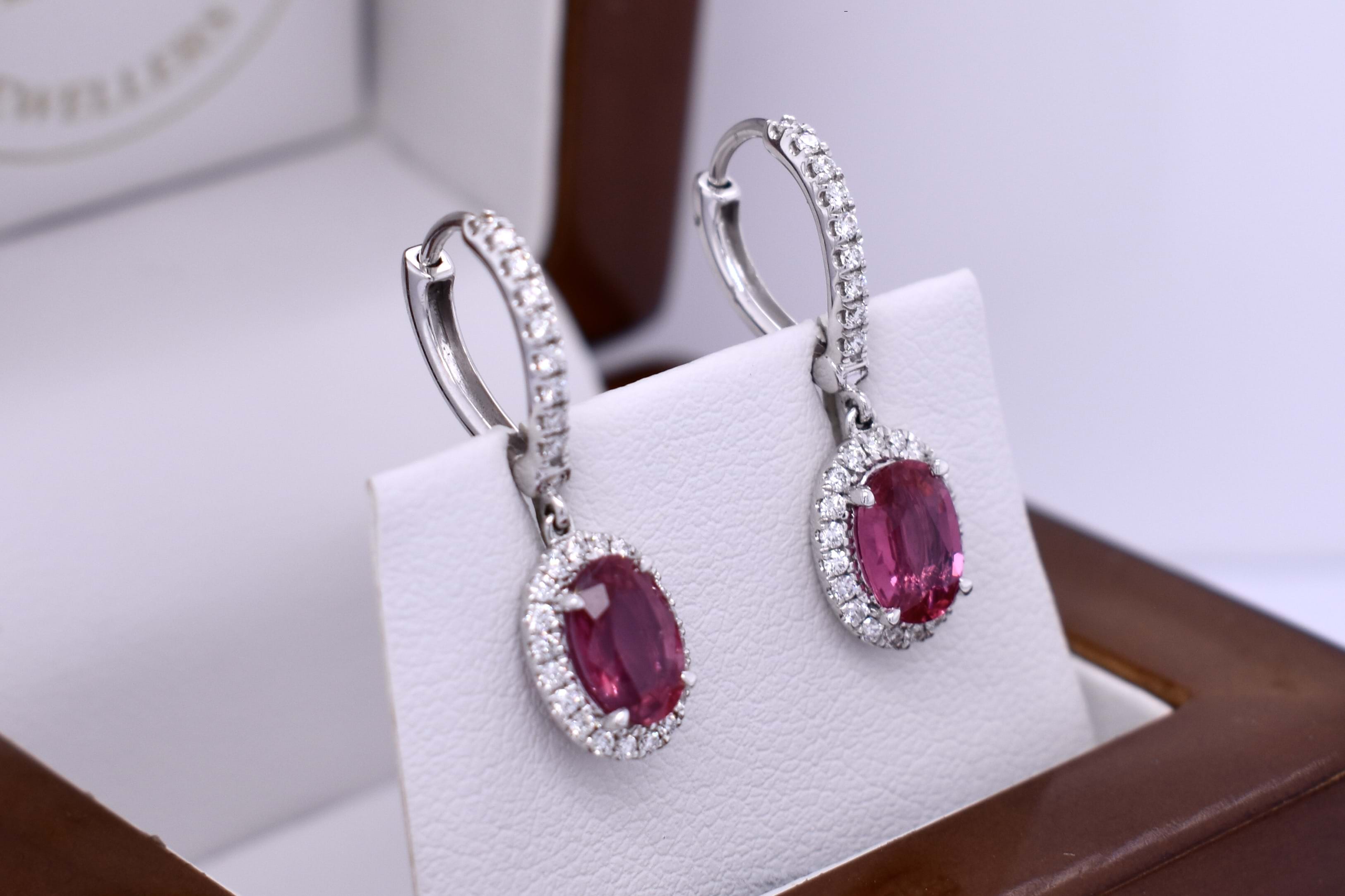 Exquisite ruby and diamond drop earrings crafted in 18ct white gold. Each earring features a hinged pearshape huggie set with 9 round brilliant cut diamonds micro claw set, fitted with clipped post fittings. Suspended from each huggie is an oval shaped ruby, four claw set and framed with a dazzling halo of 20 round brilliant cut diamonds, also micro claw set. With a total of 60 stones across the pair, the 2 oval rubies display a moderately bright mid pinkish red colour and are light to moderately included, totalling 2.13cts. Combined with 58 round brilliant cut diamonds, totalling 0.35cts, graded GVS–SI. Independent valuation supplied.