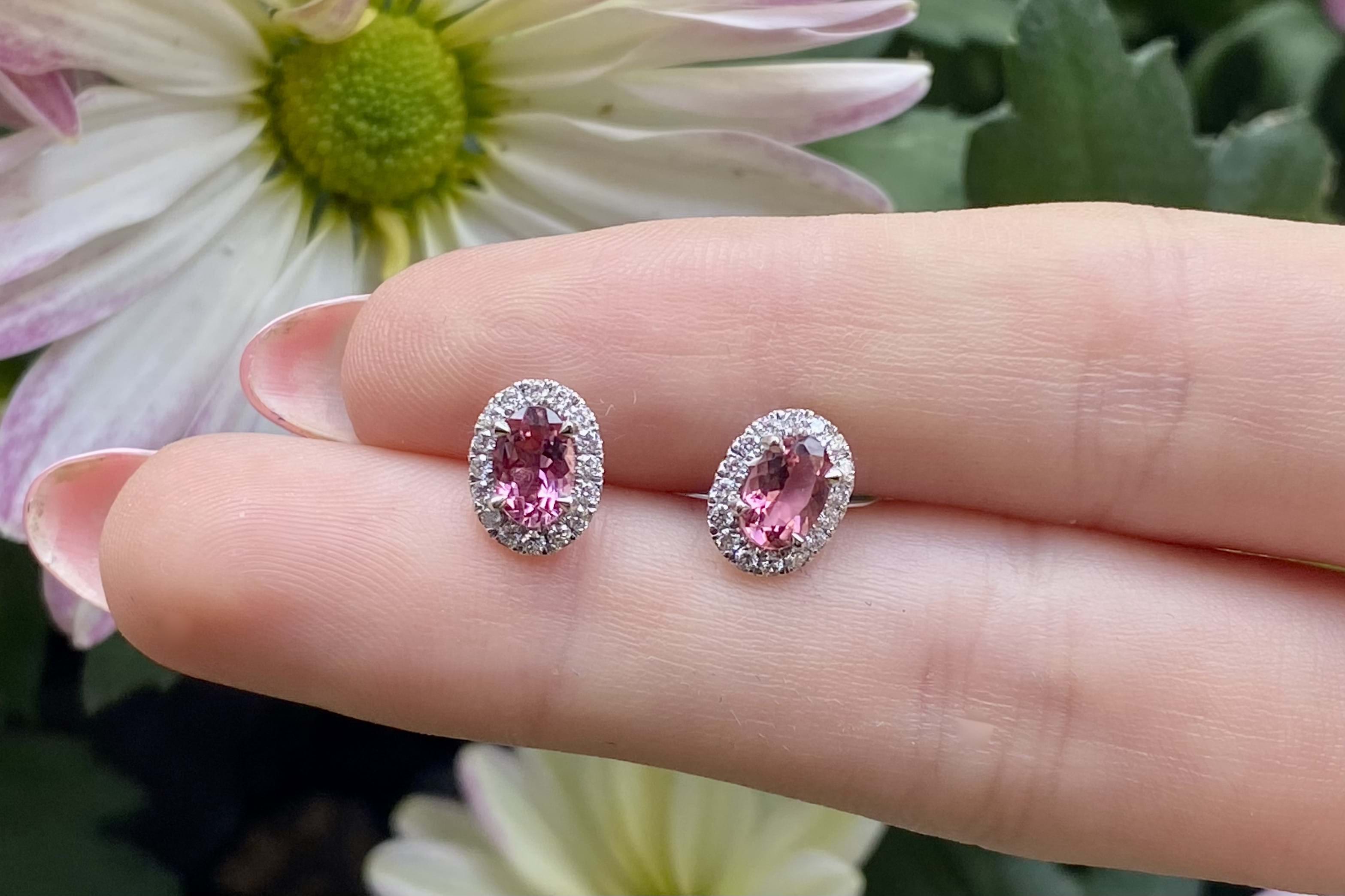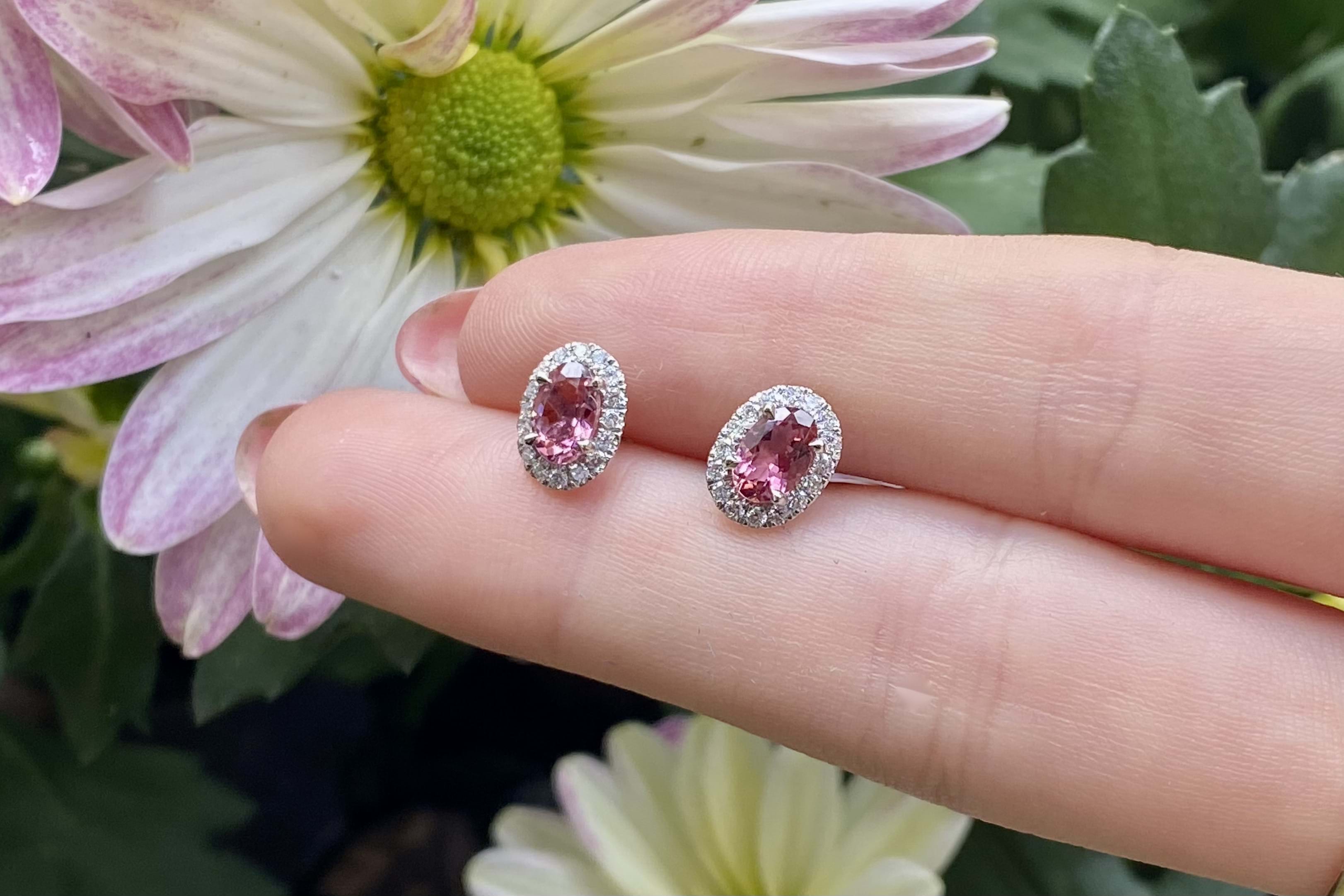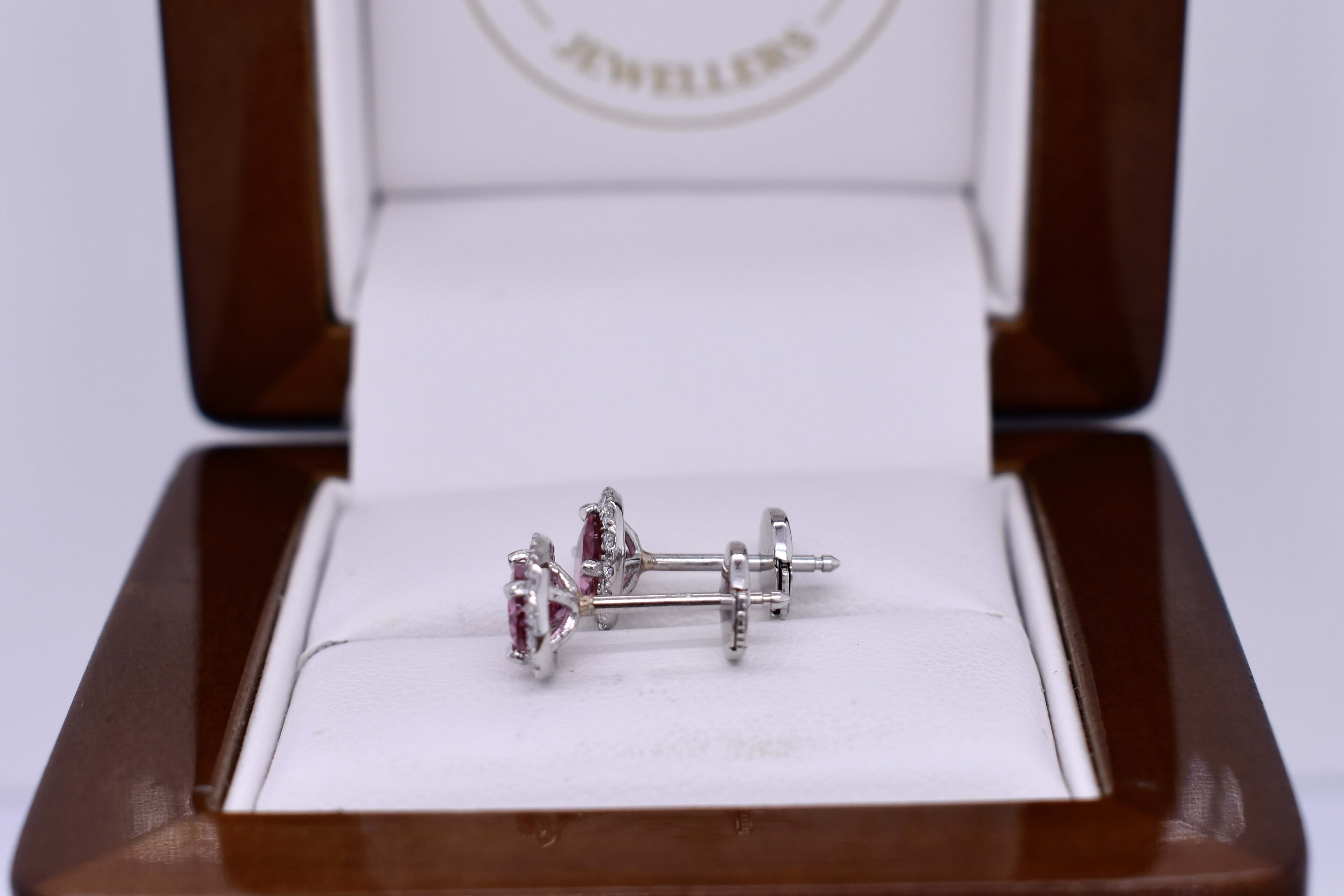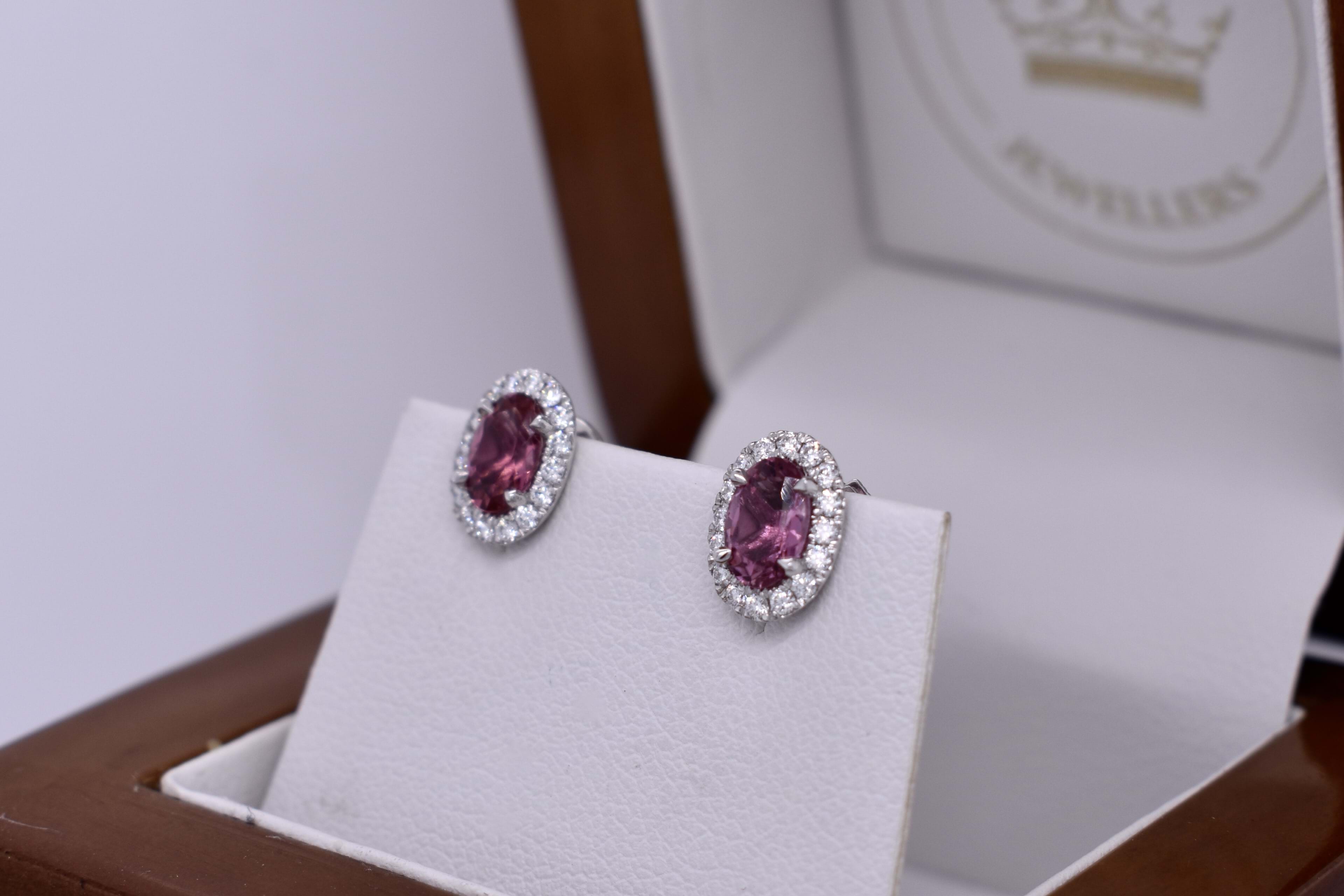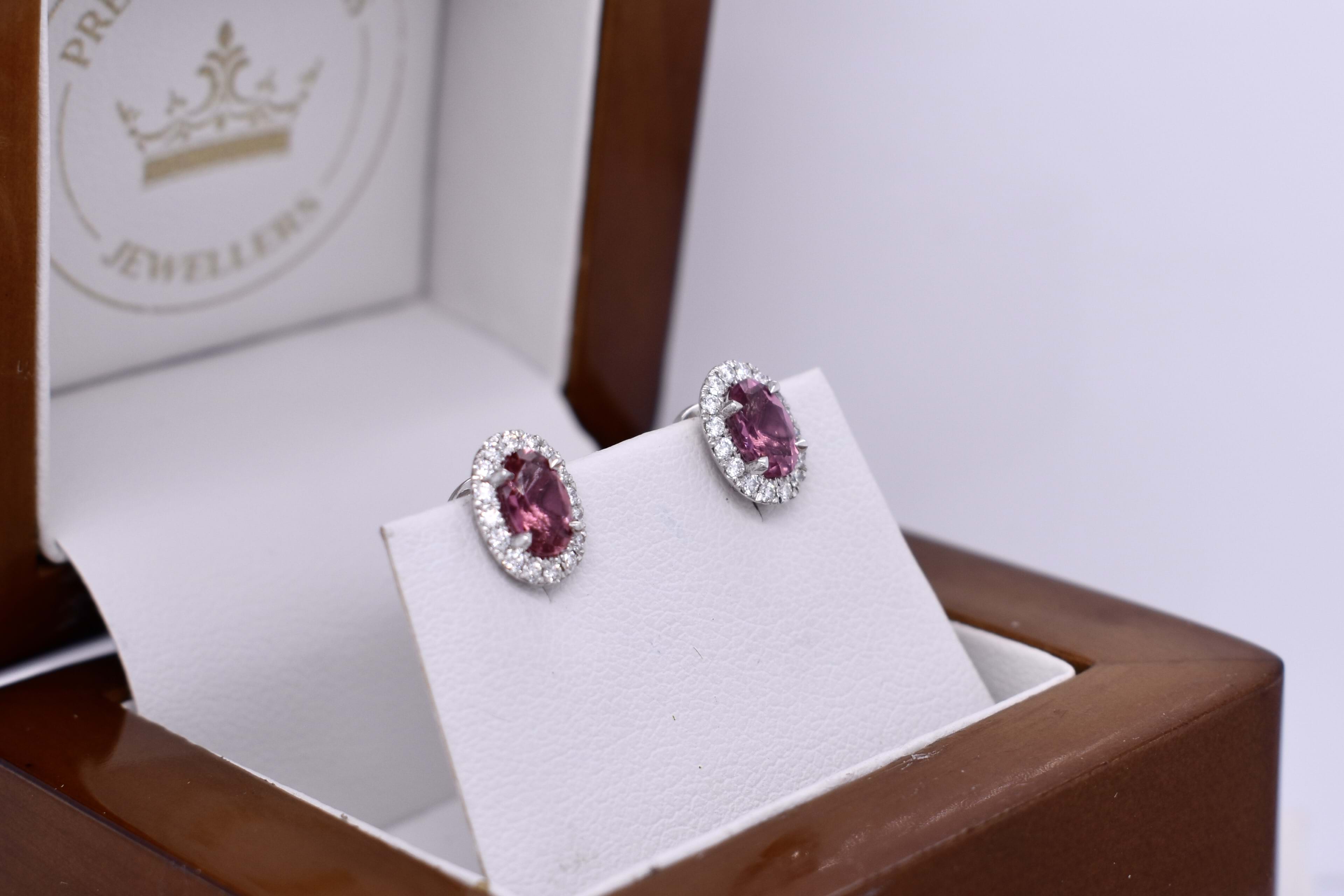 Elegant 0.95ct oval mid pink tourmaline studs, four claw set in 18ct white gold, surrounded with a shimmering halo of 32 round brilliant cut 1.10-1.20mm diamonds totalling 0.23ct G VS. Completed with post and ear lock style butterfly fittings. Independent Valuation Supplied