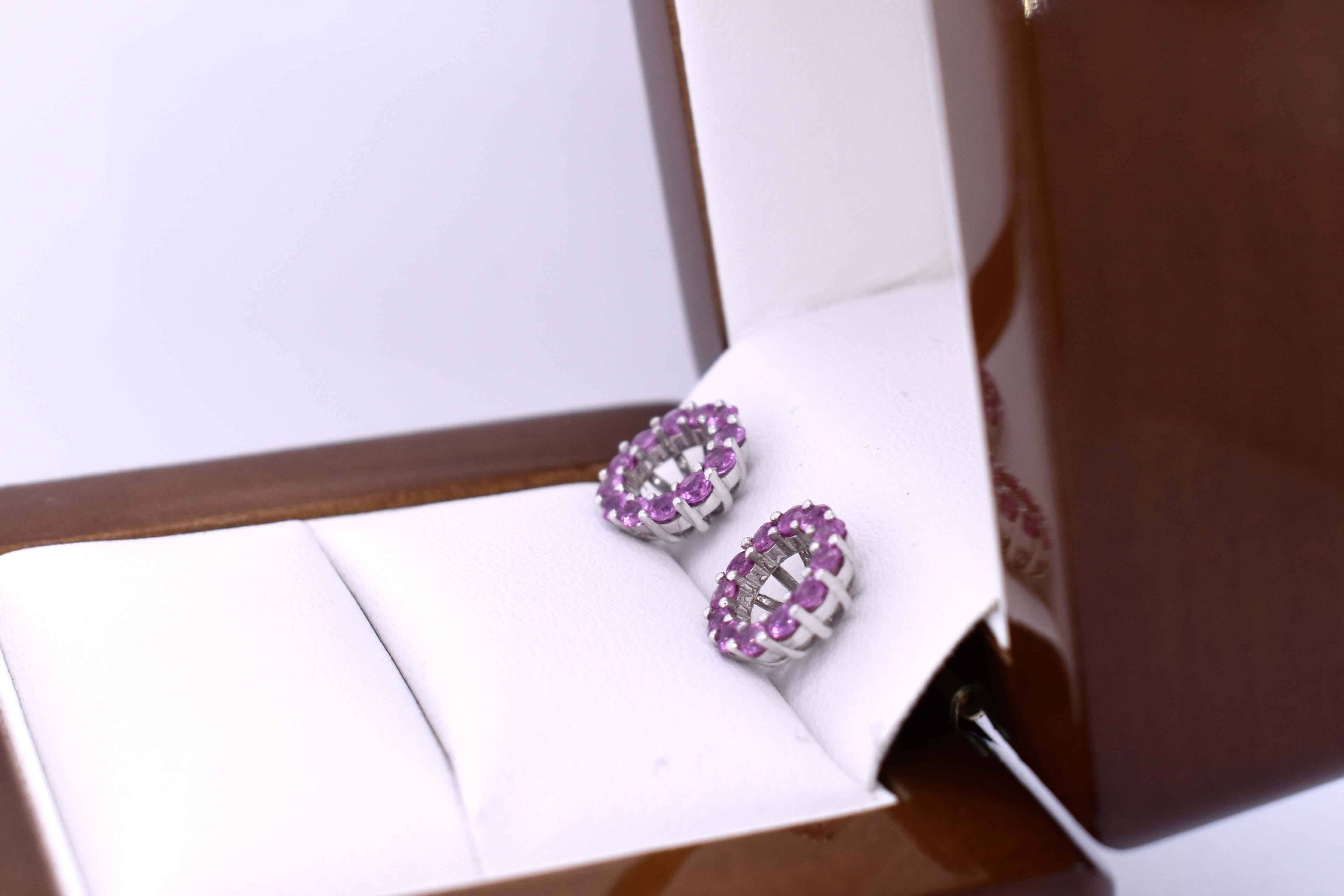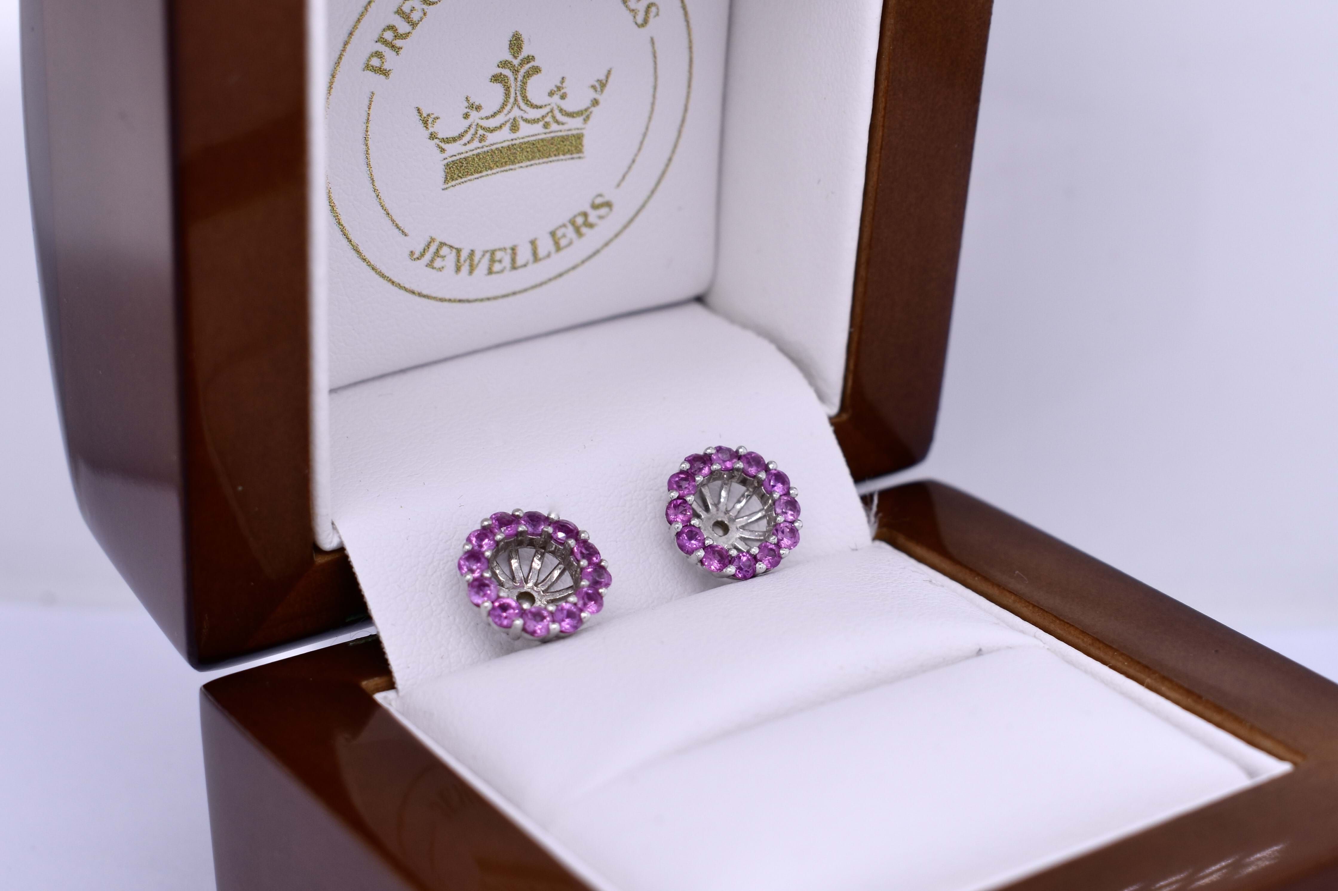 A versatile and stunning concept designed to dress up any pair of stud earrings (of the correct size centre stone) these earrings jackets can be easily added or removed from your existing studs or come into the store to browse our selection of studs available. This pair of jackets are crafted in 18ct white gold and contain 24 round pink sapphires totalling 1.02cts and will hold 1.9mm studs-dependent on settings. Pictured with (20364151) round pearl studs-available for separate purchase. Independent Valuation Supplied