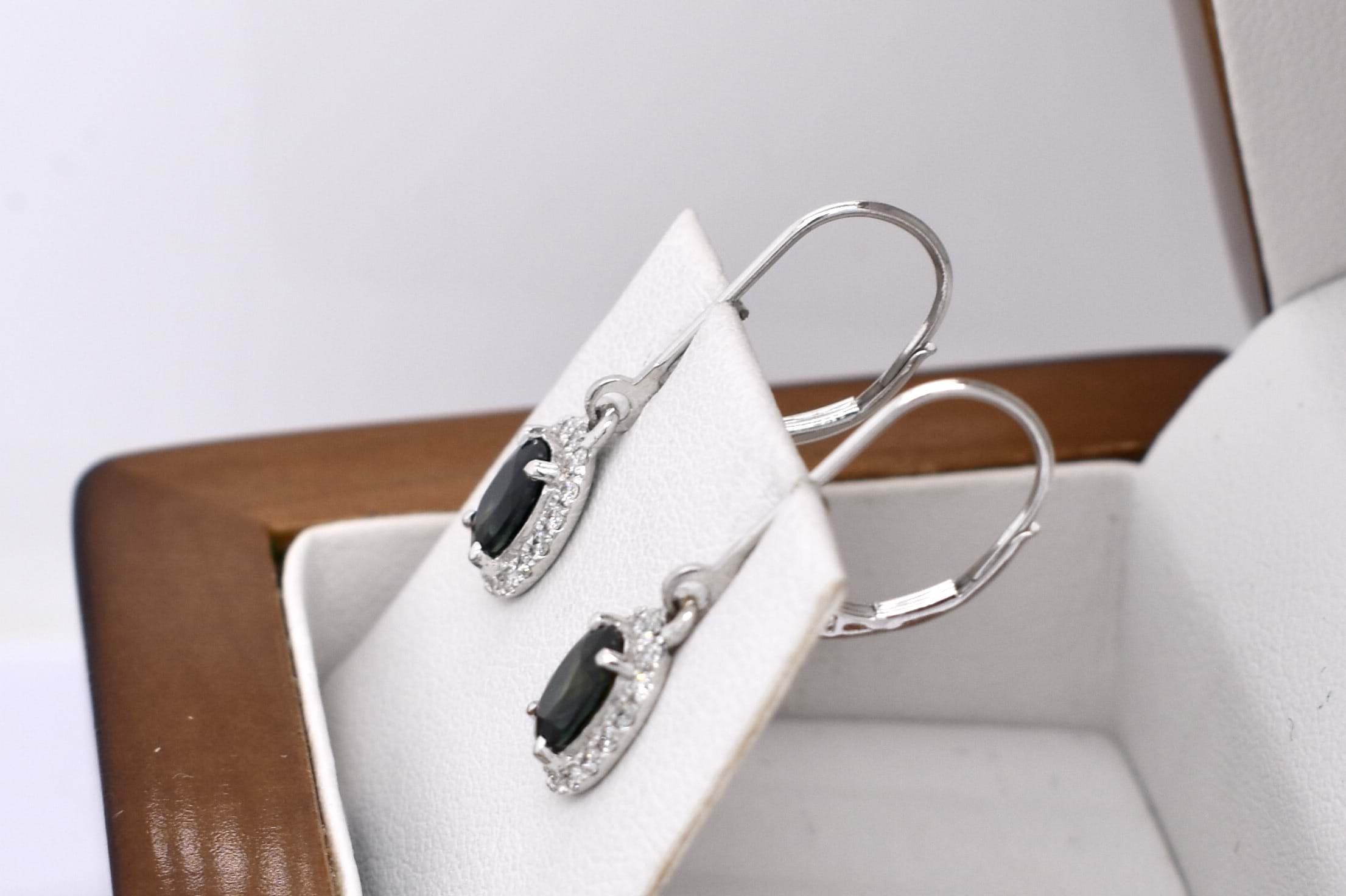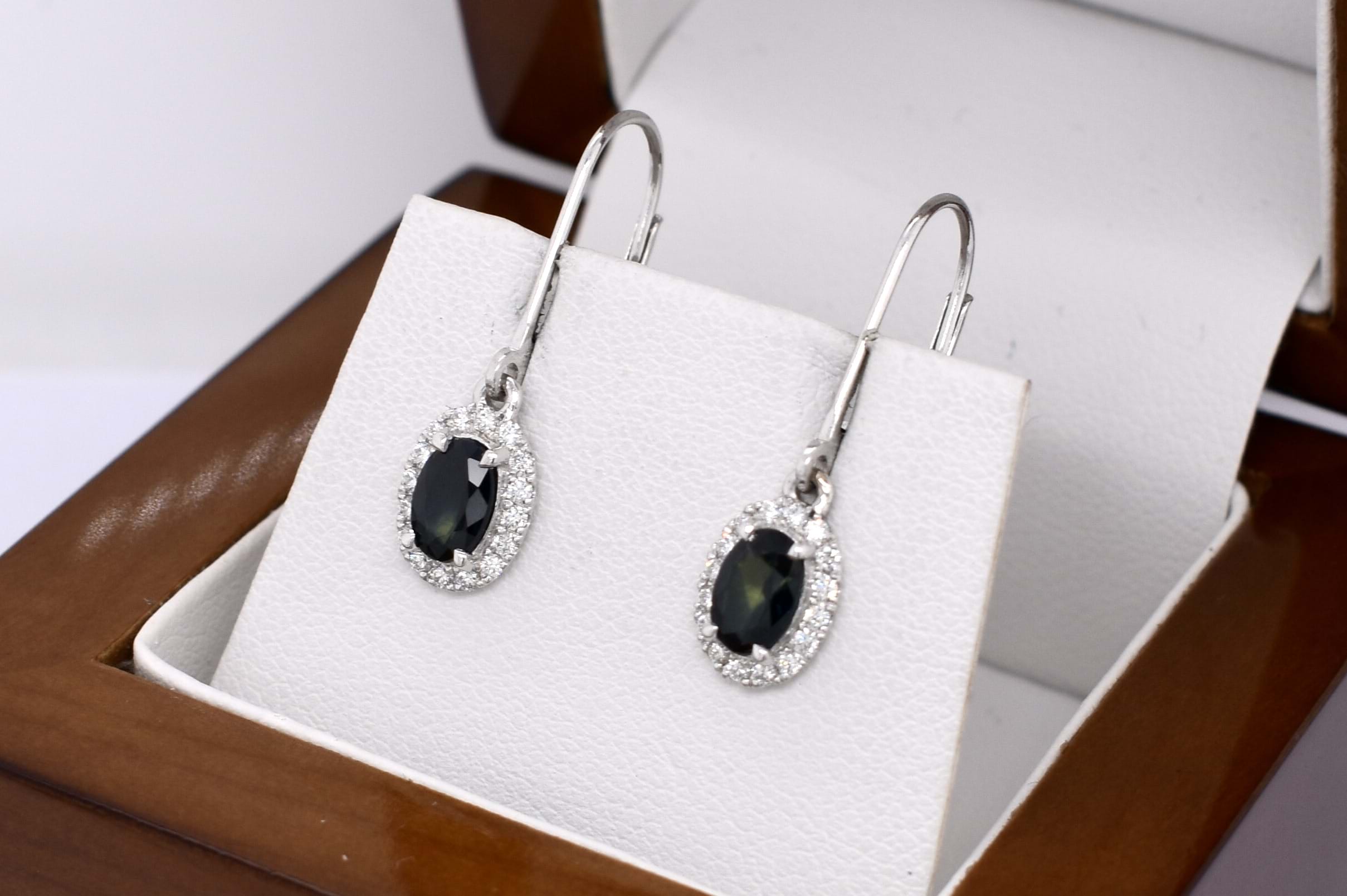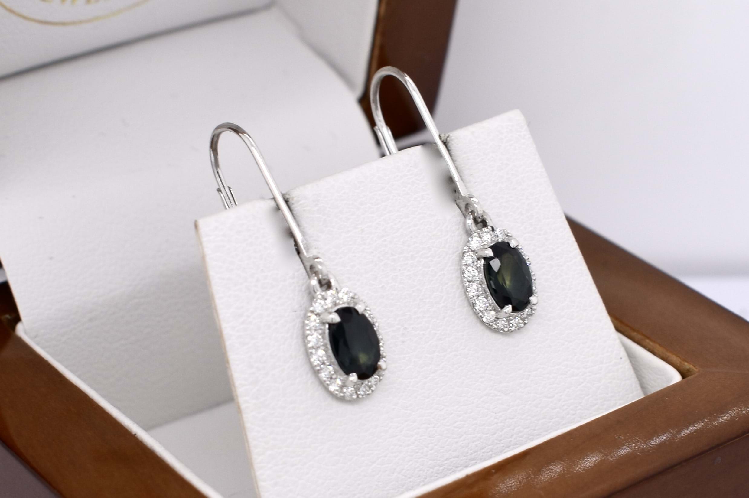 These gorgeous 18ct white gold drops feature two oval Queensland blue sapphires (heated), four claw set, equalling 1.10ct and are surrounded by a sparkling halo of diamonds totalling 0.23ct G VVS-VS. Drops suspended from handmade long white gold euroclip fittings.