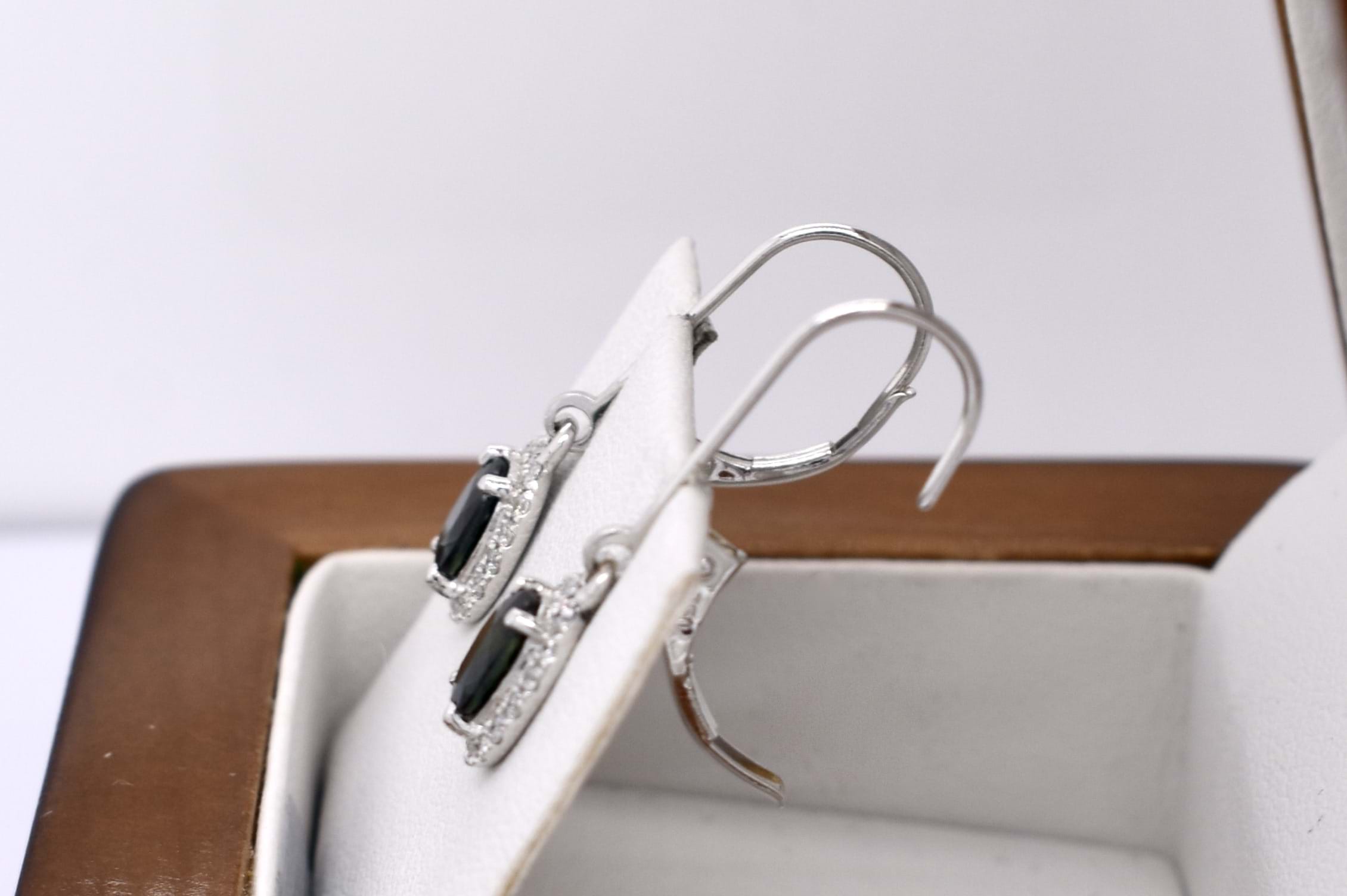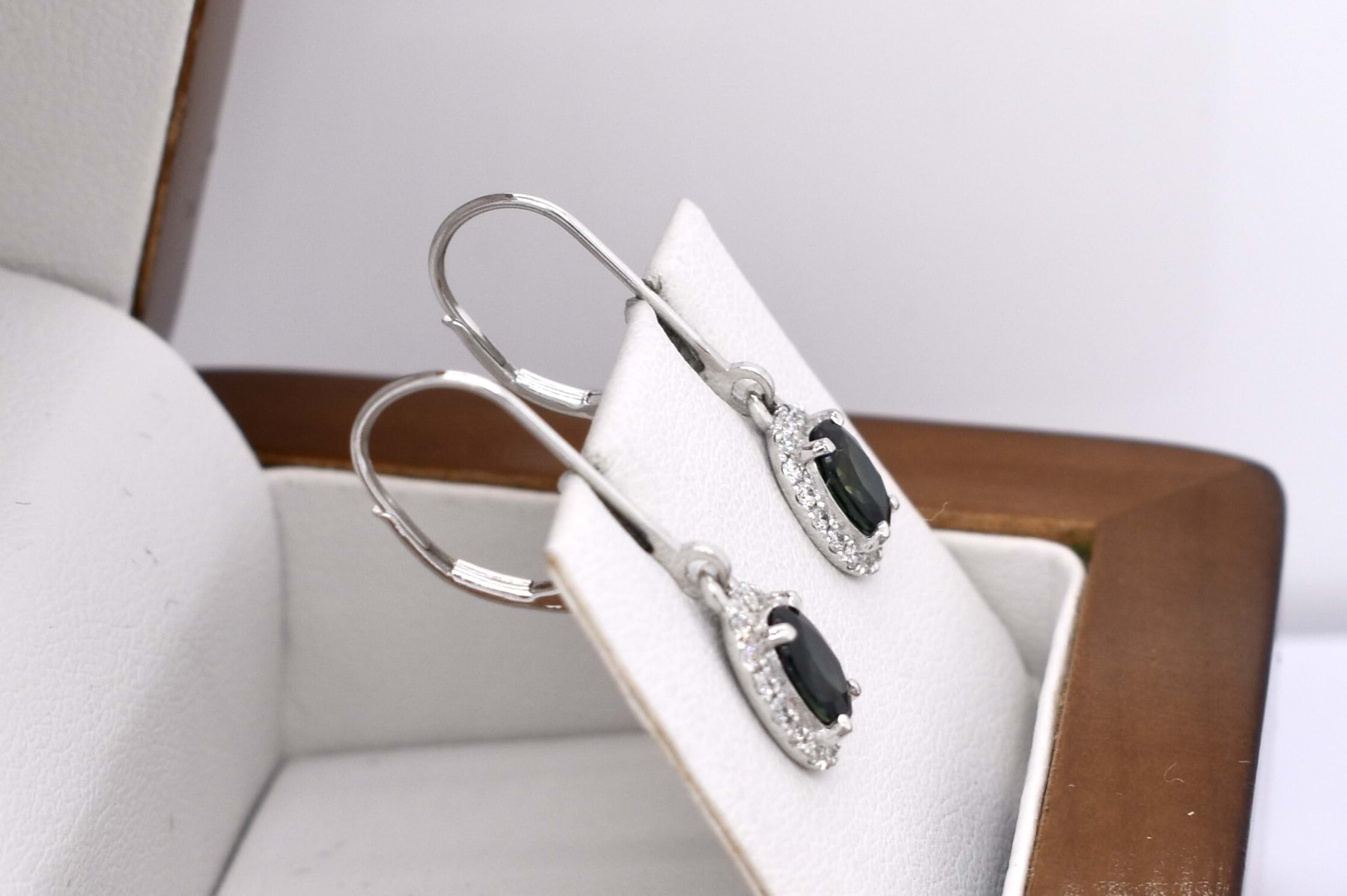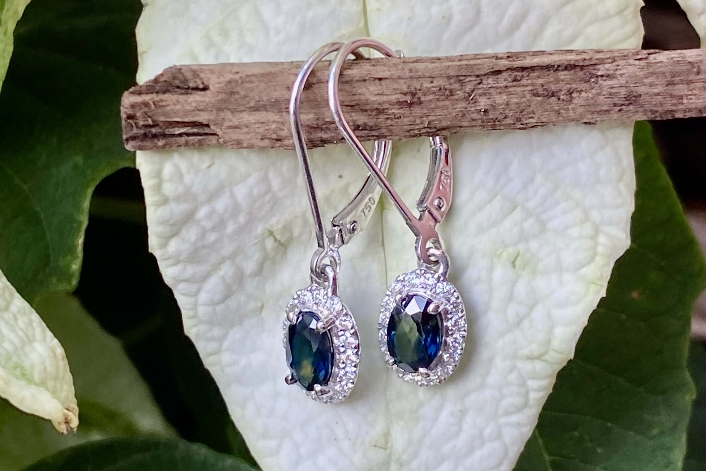 These gorgeous 18ct white gold drops feature two oval Queensland blue sapphires (heated), four claw set, equalling 1.10ct and are surrounded by a sparkling halo of diamonds totalling 0.23ct G VVS-VS. Drops suspended from handmade long white gold euroclip fittings.