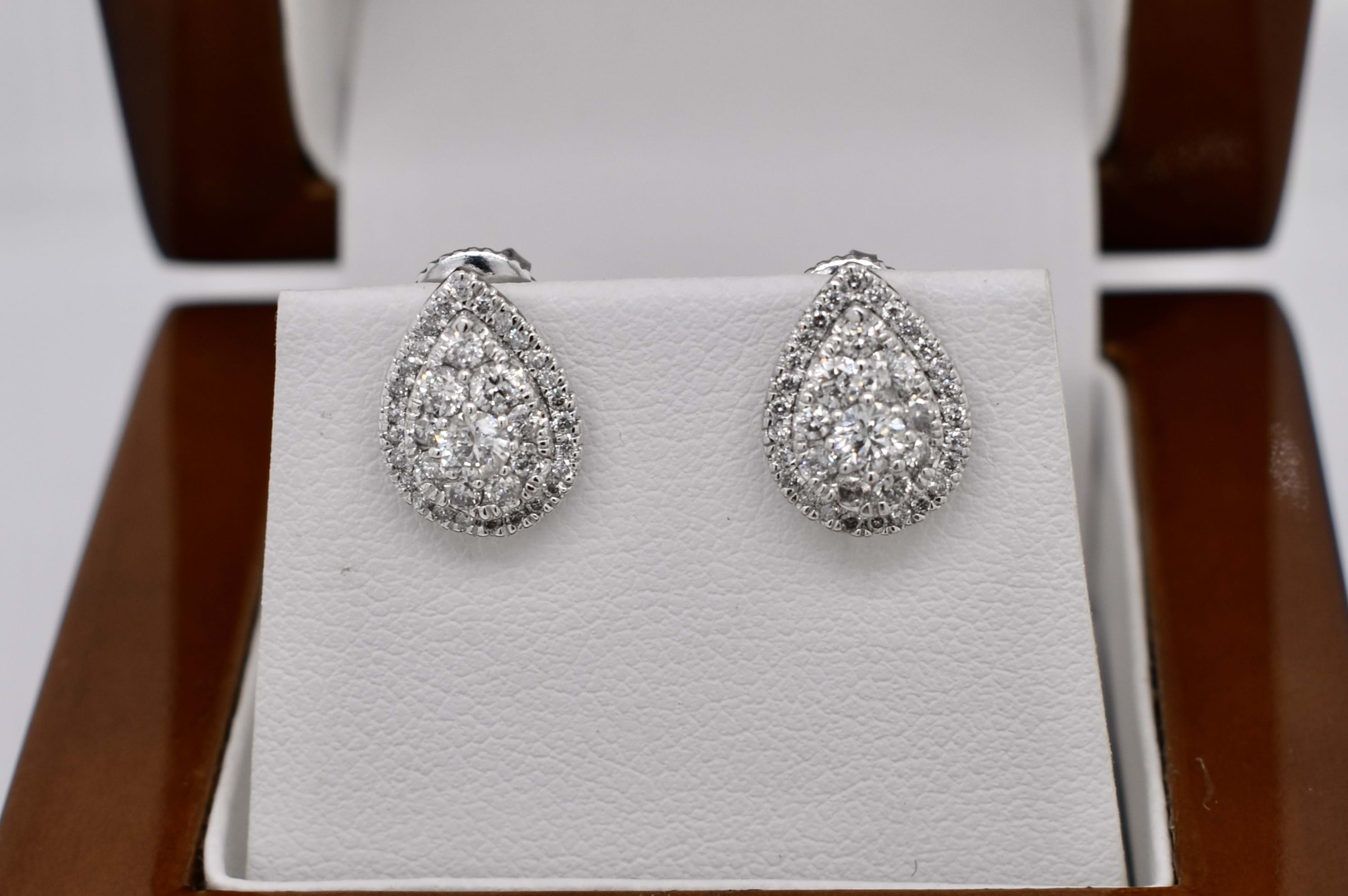 Stunning platinum studs in a pear shape illusion style design, set with a total of seventy two RBC diamonds equalling 0.82ct H/P2, with secure threaded posts and butterfly fittings