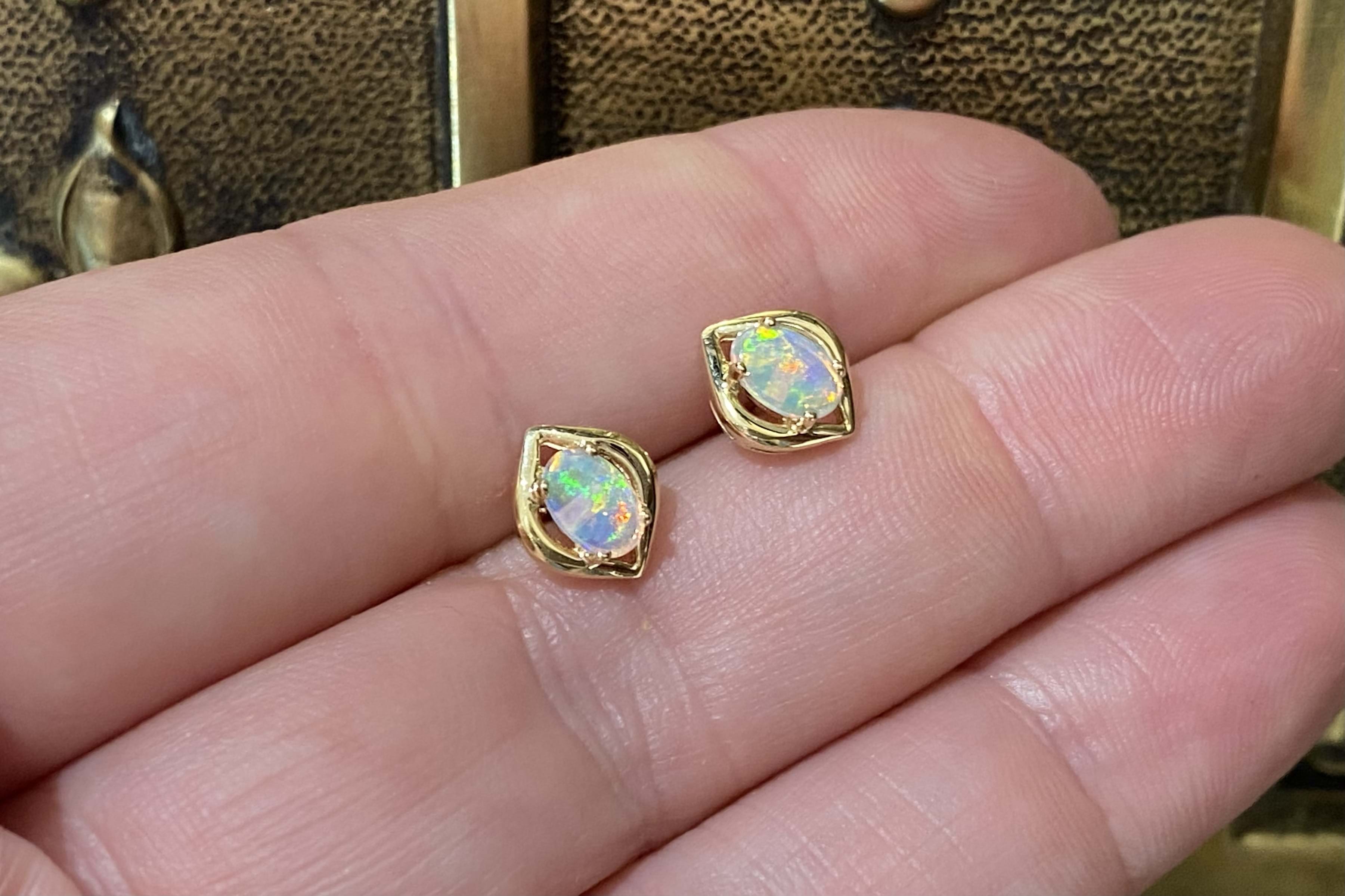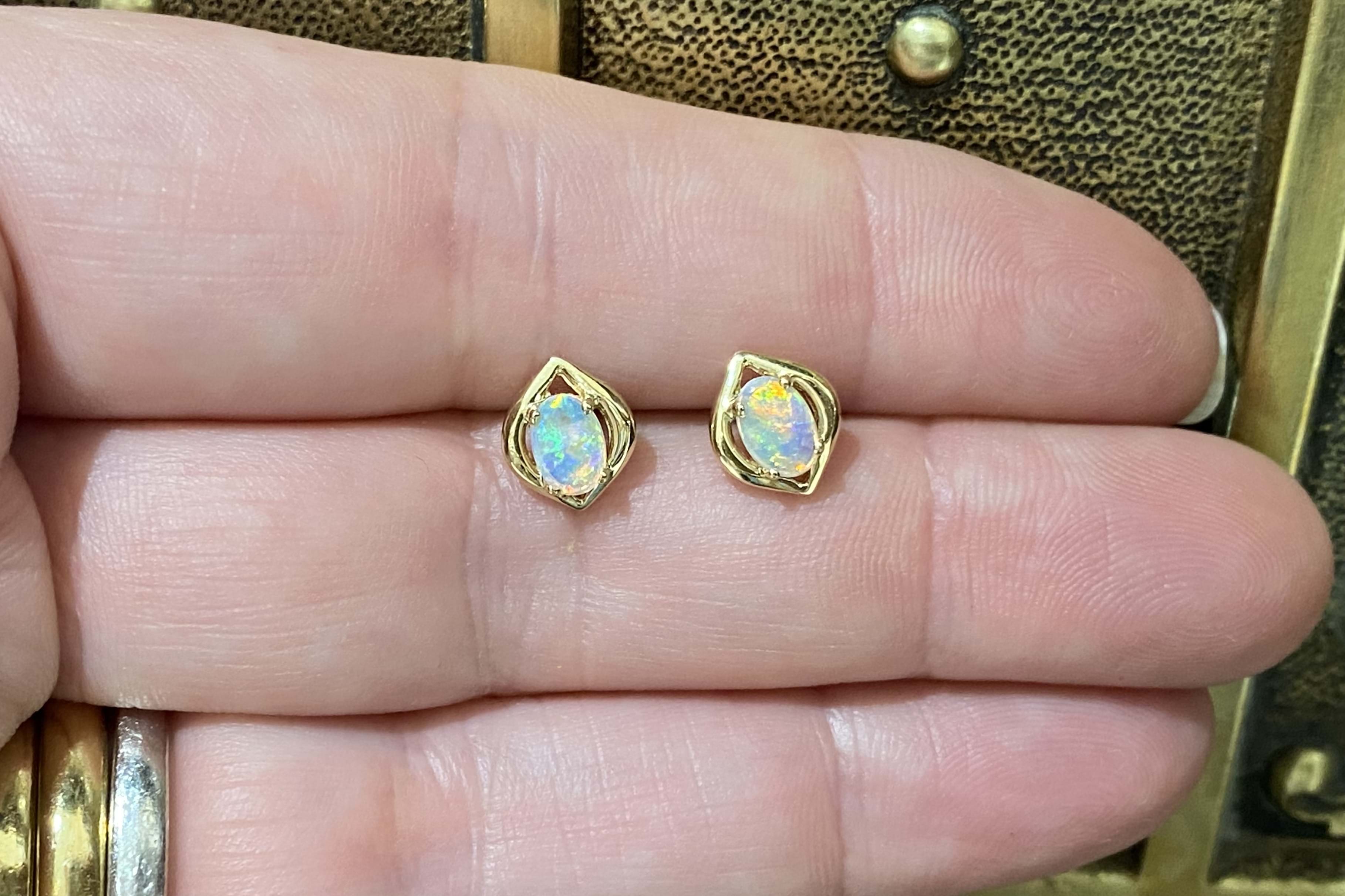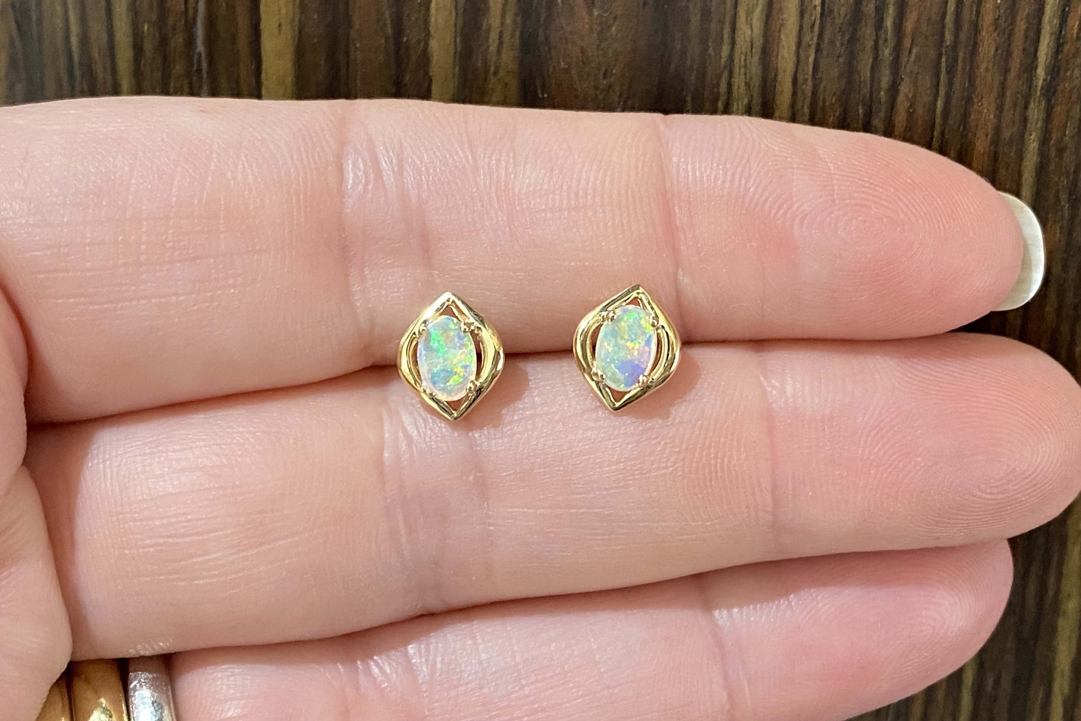 This lovely pair of studs crafted in 14ct yellow gold, with two oval 6.00x4.10mm Coober Pedy crystal opals with flashes of blue, yellow, red and orange throughout. The opals are four claw set surrounded by a gapped marquise style border and completed with post and butterfly fittings. Total of 0.34ct.