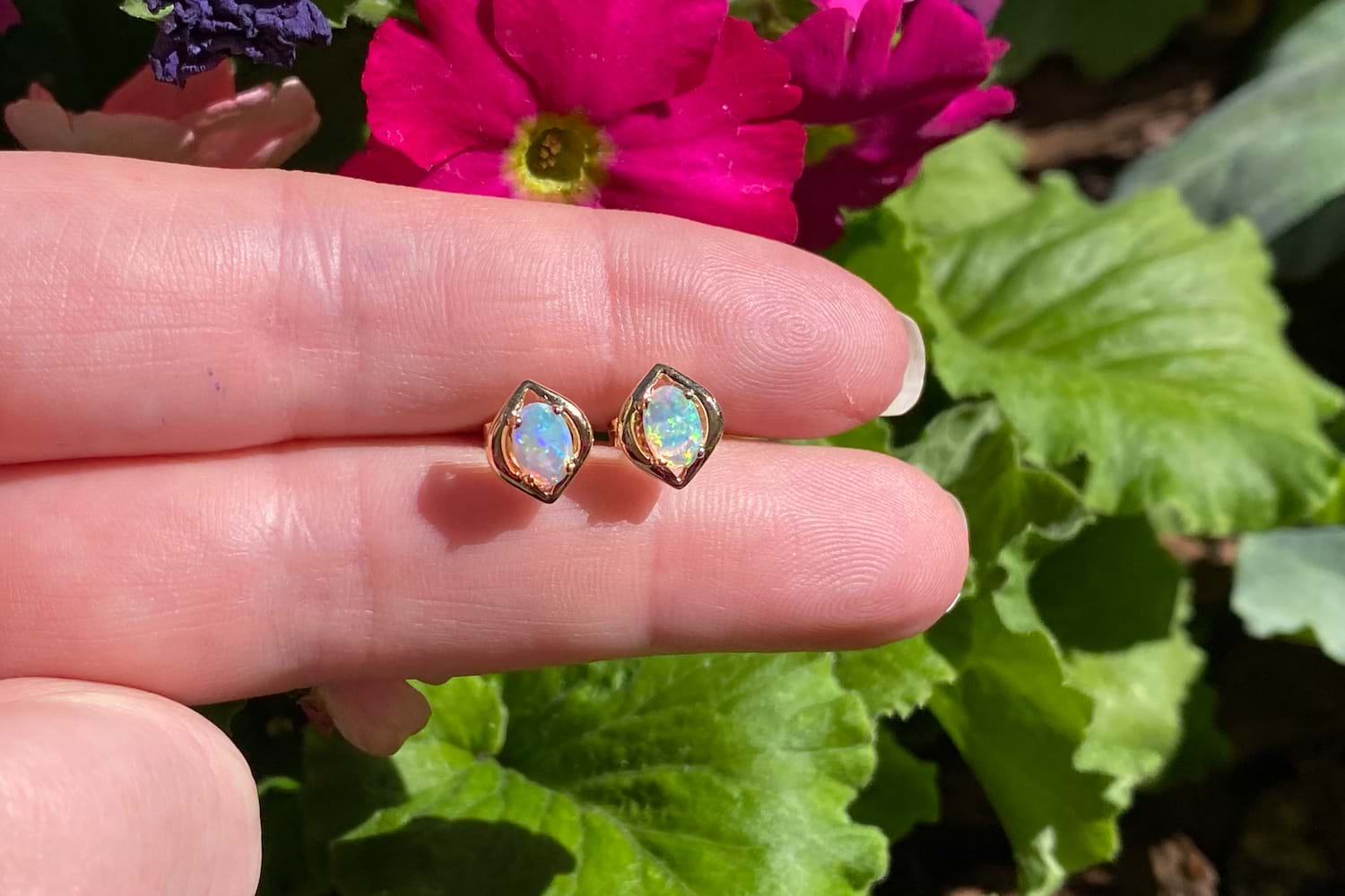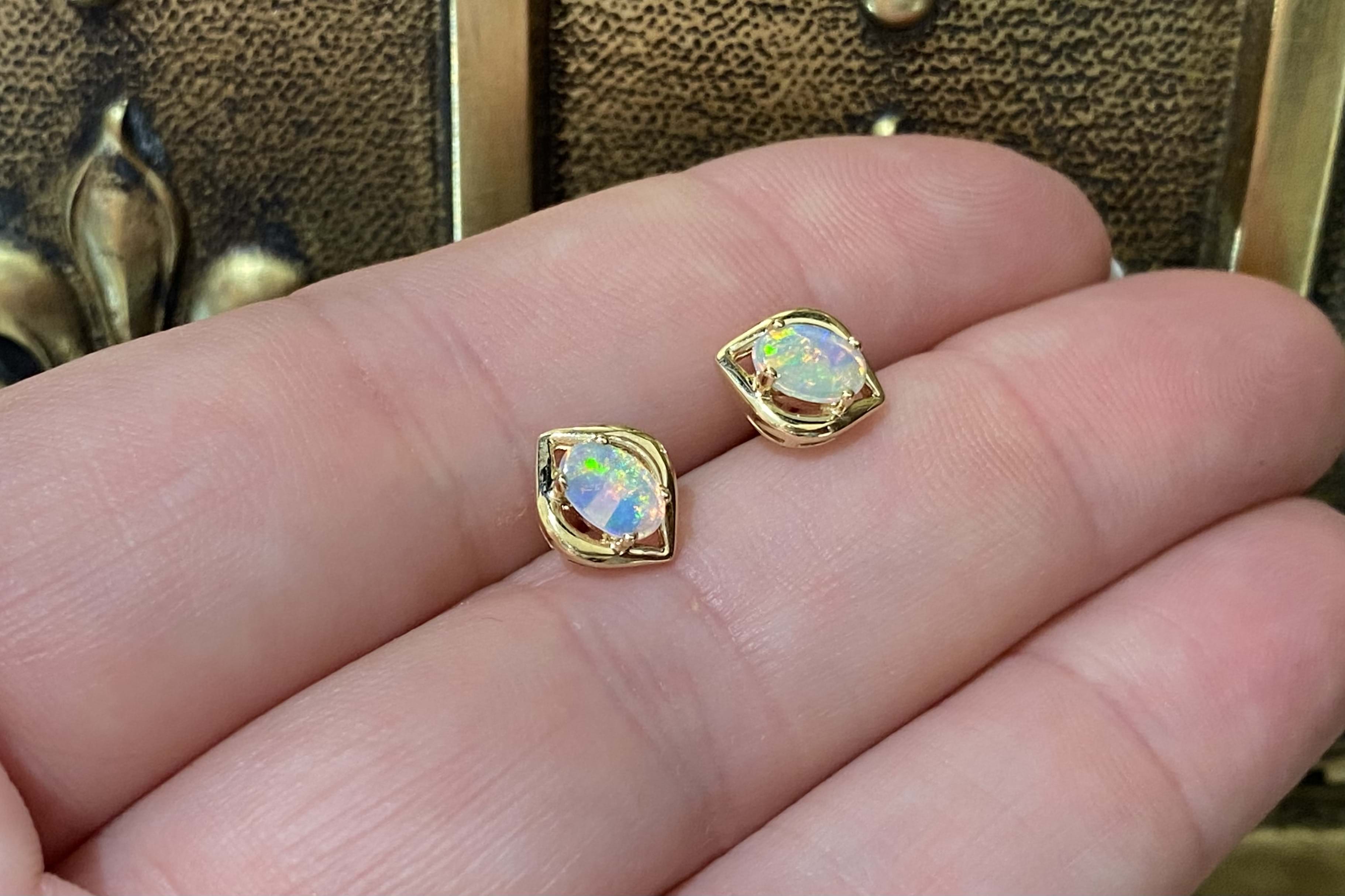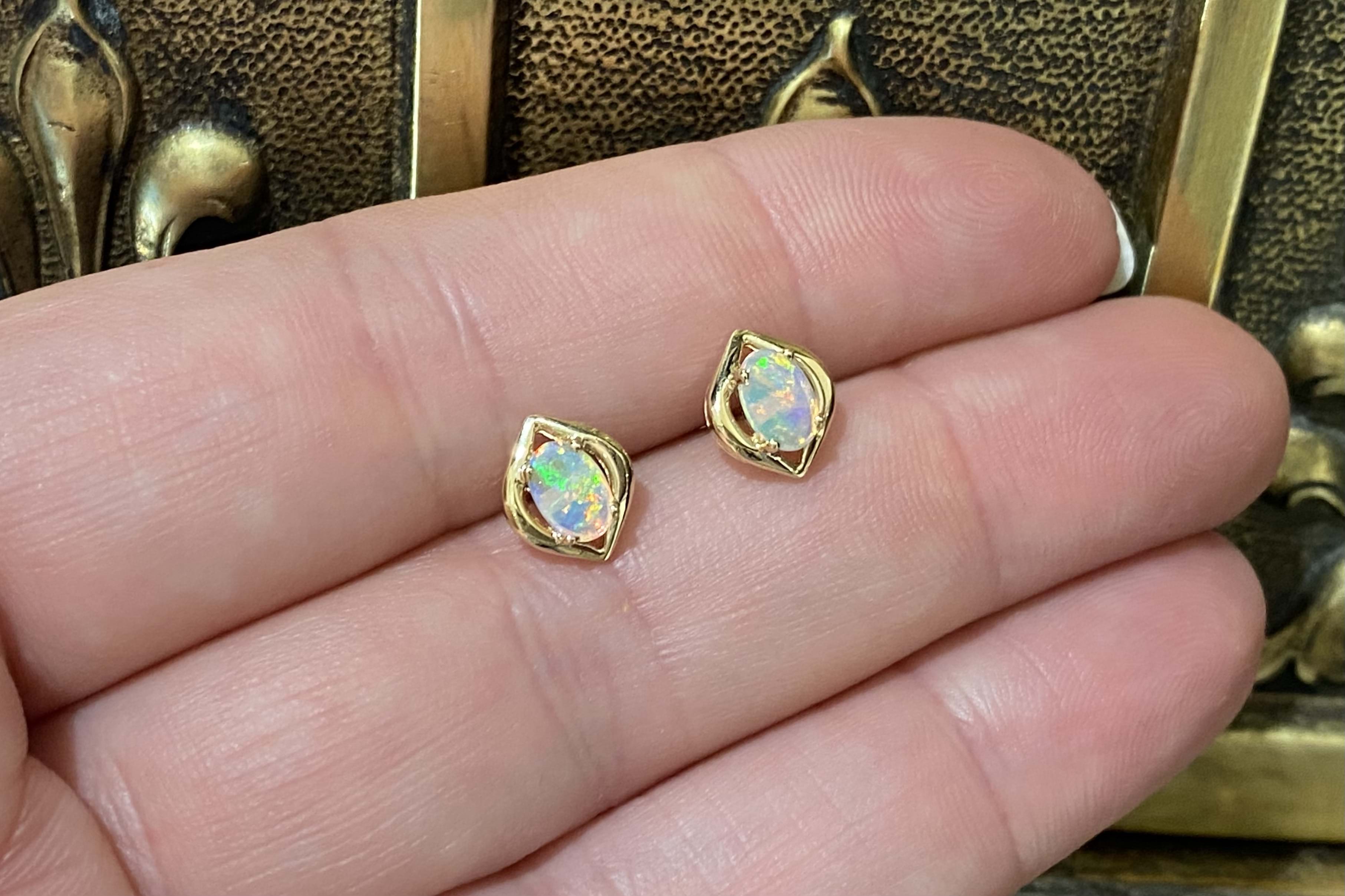 This lovely pair of studs crafted in 14ct yellow gold, with two oval 6.00x4.10mm Coober Pedy crystal opals with flashes of blue, yellow, red and orange throughout. The opals are four claw set surrounded by a gapped marquise style border and completed with post and butterfly fittings. Total of 0.34ct.