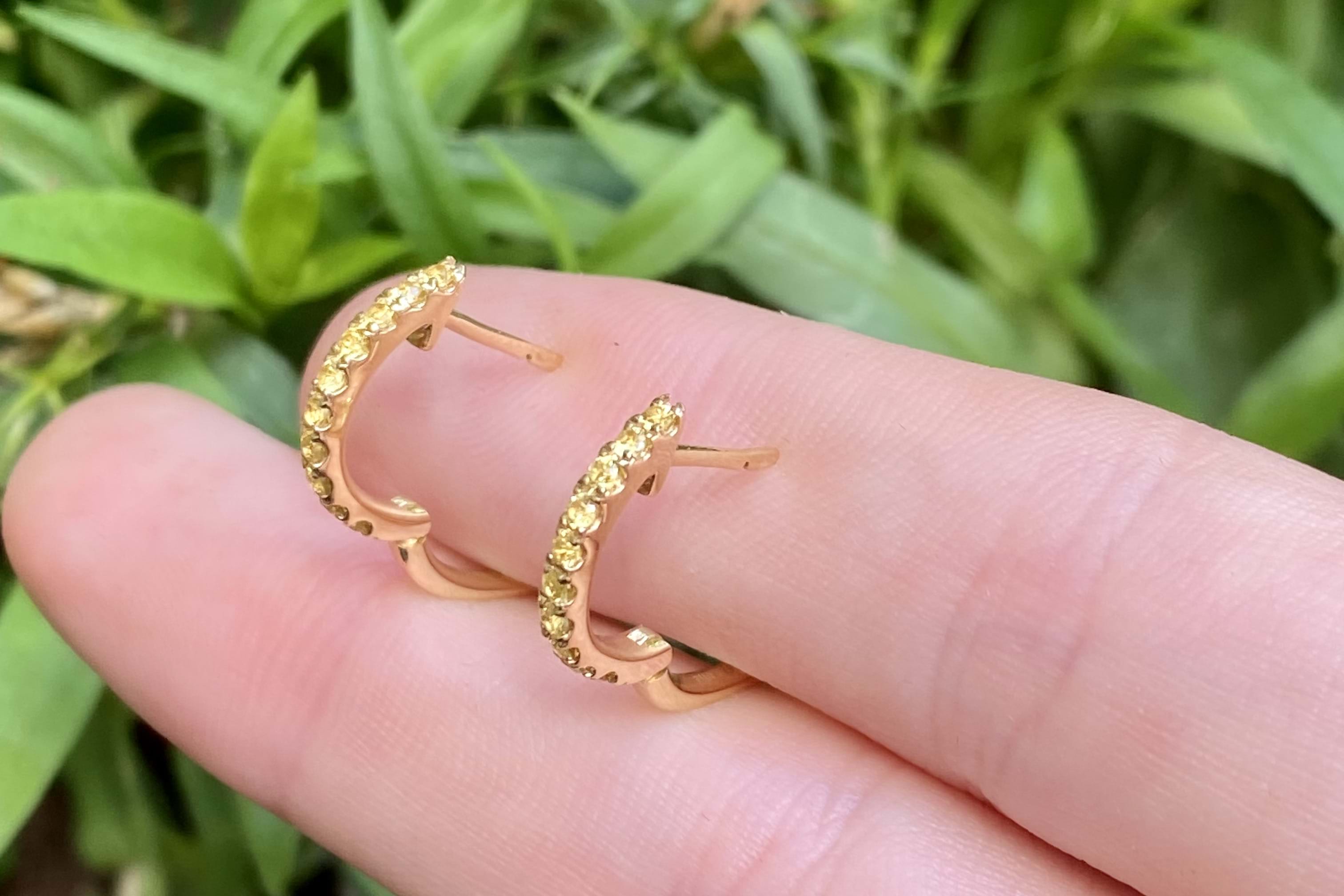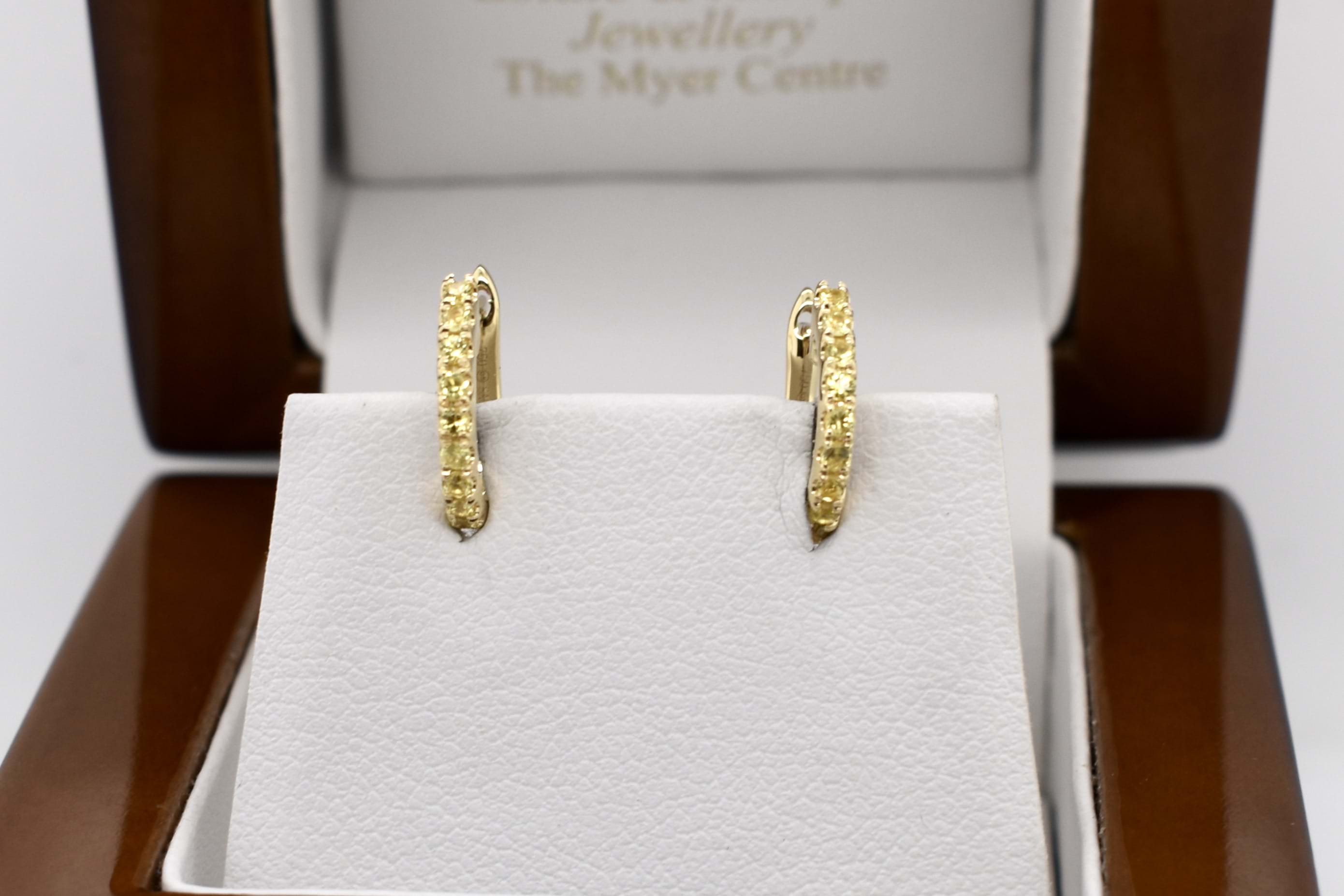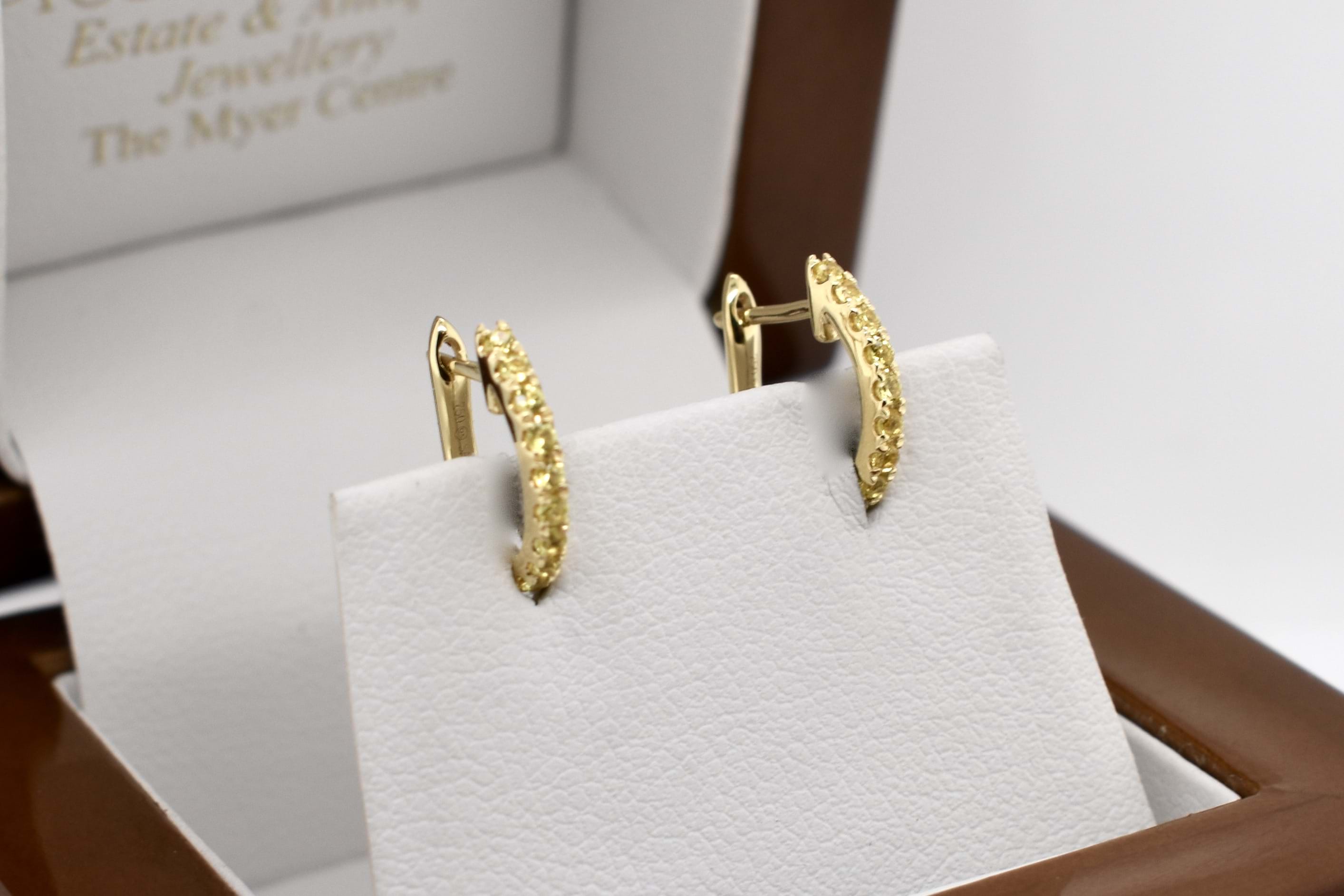 These sparkly huggies are crafted in 18ct yellow gold and feature twenty 1.3mm light yellow eye clean sapphires, ten stones in each earring, totalling 0.26ct. They are cut down claw set in an oval hinged hoop, with clipped post settings. Weighing 1.82 grams. Independent Valuation Supplied.