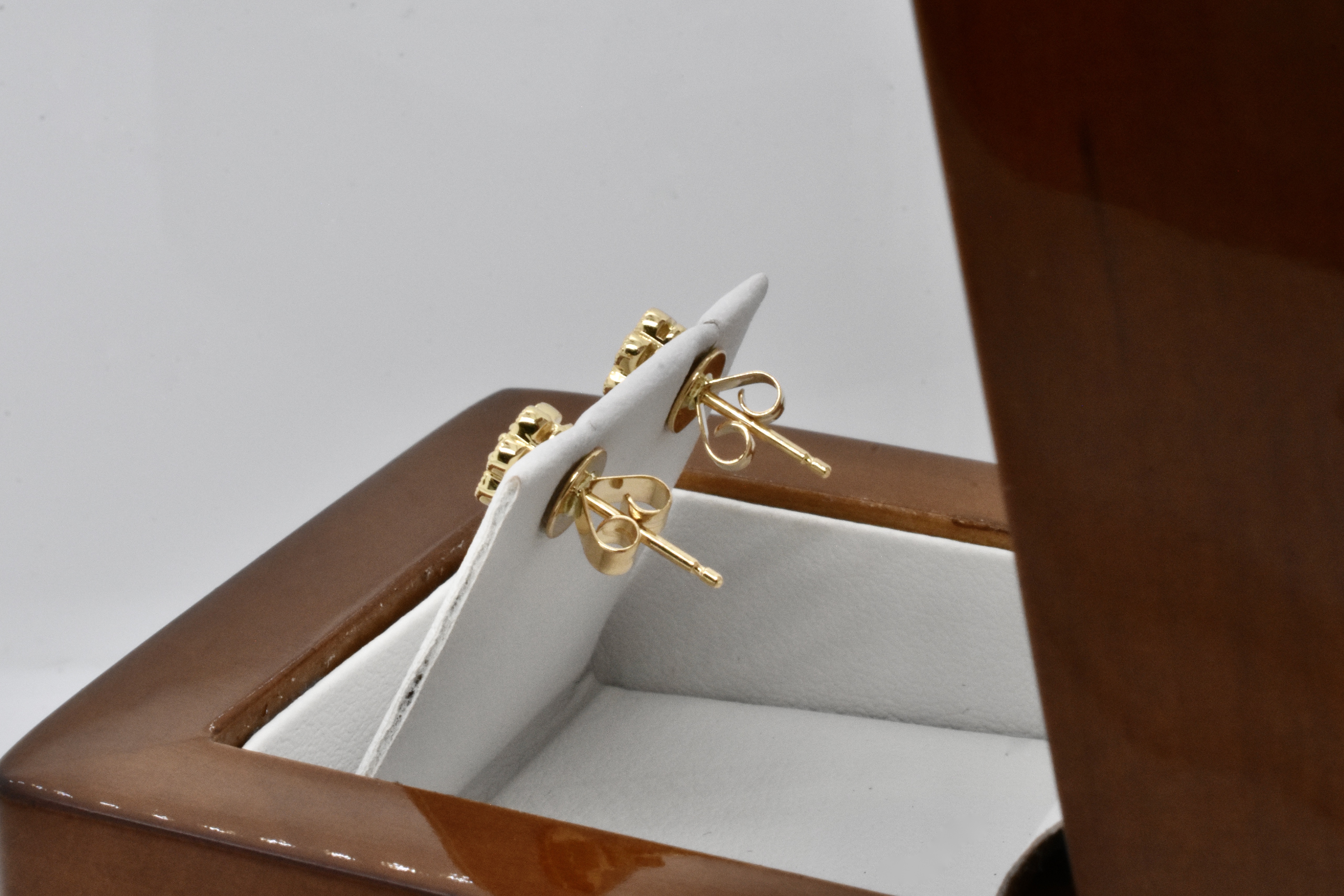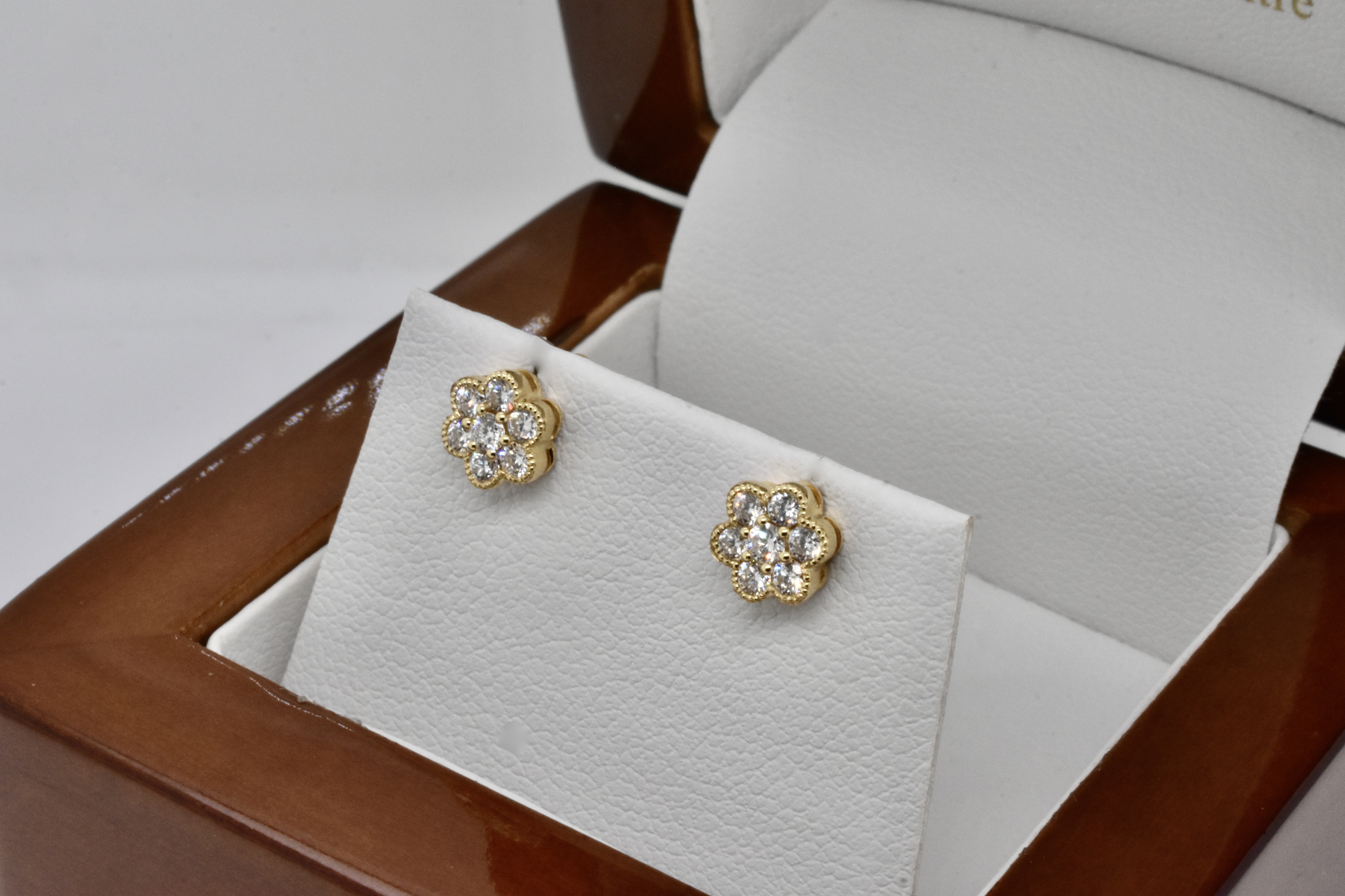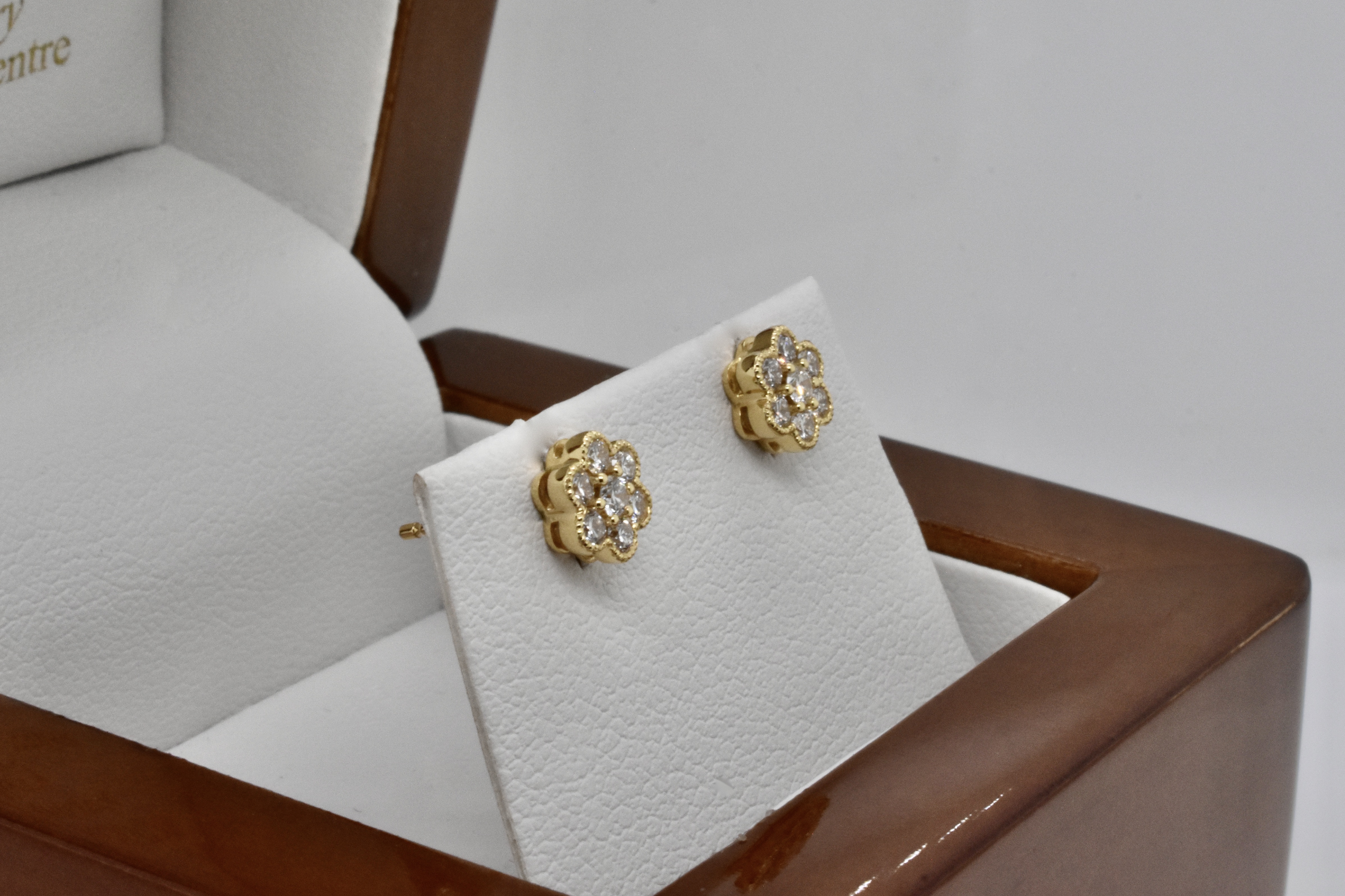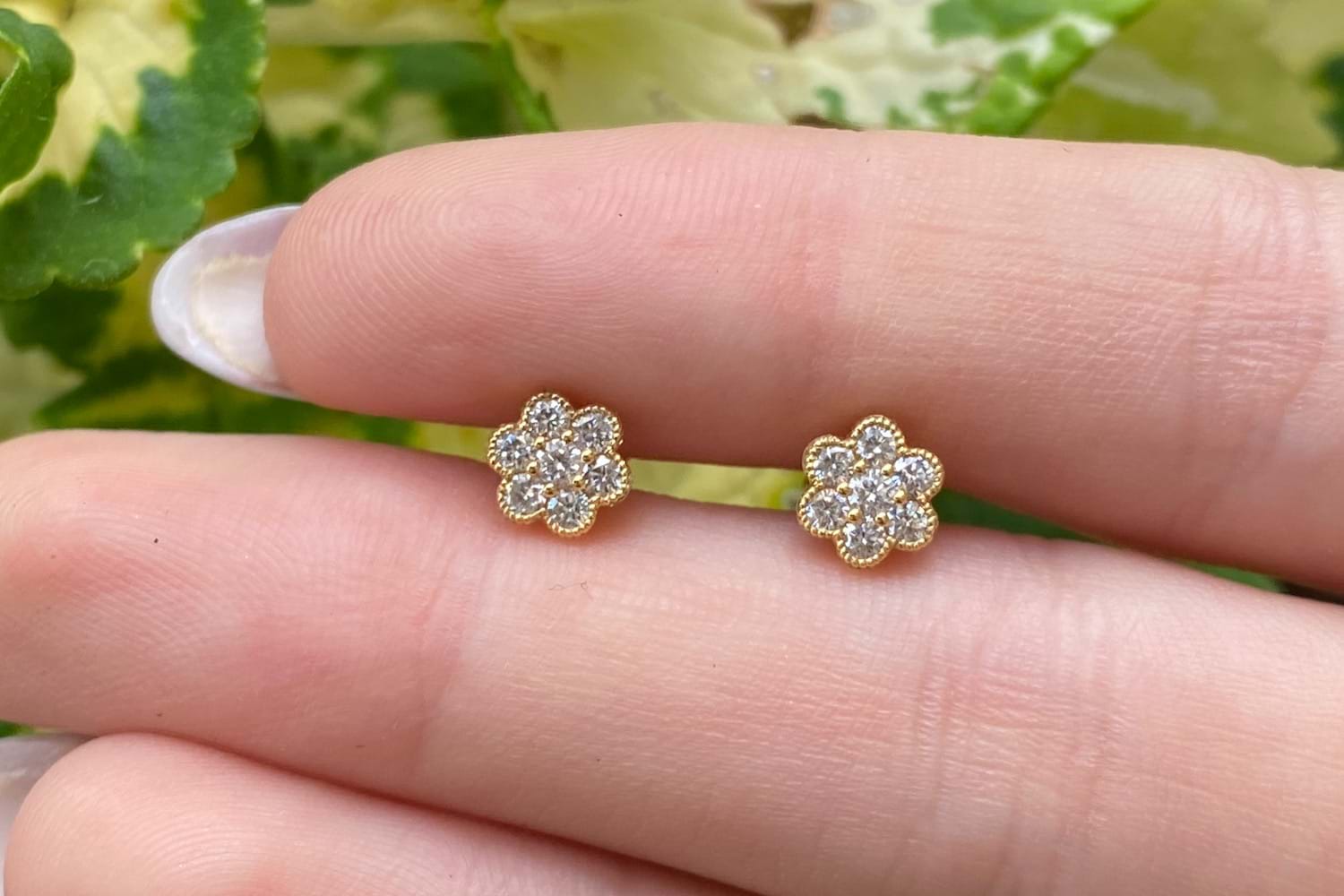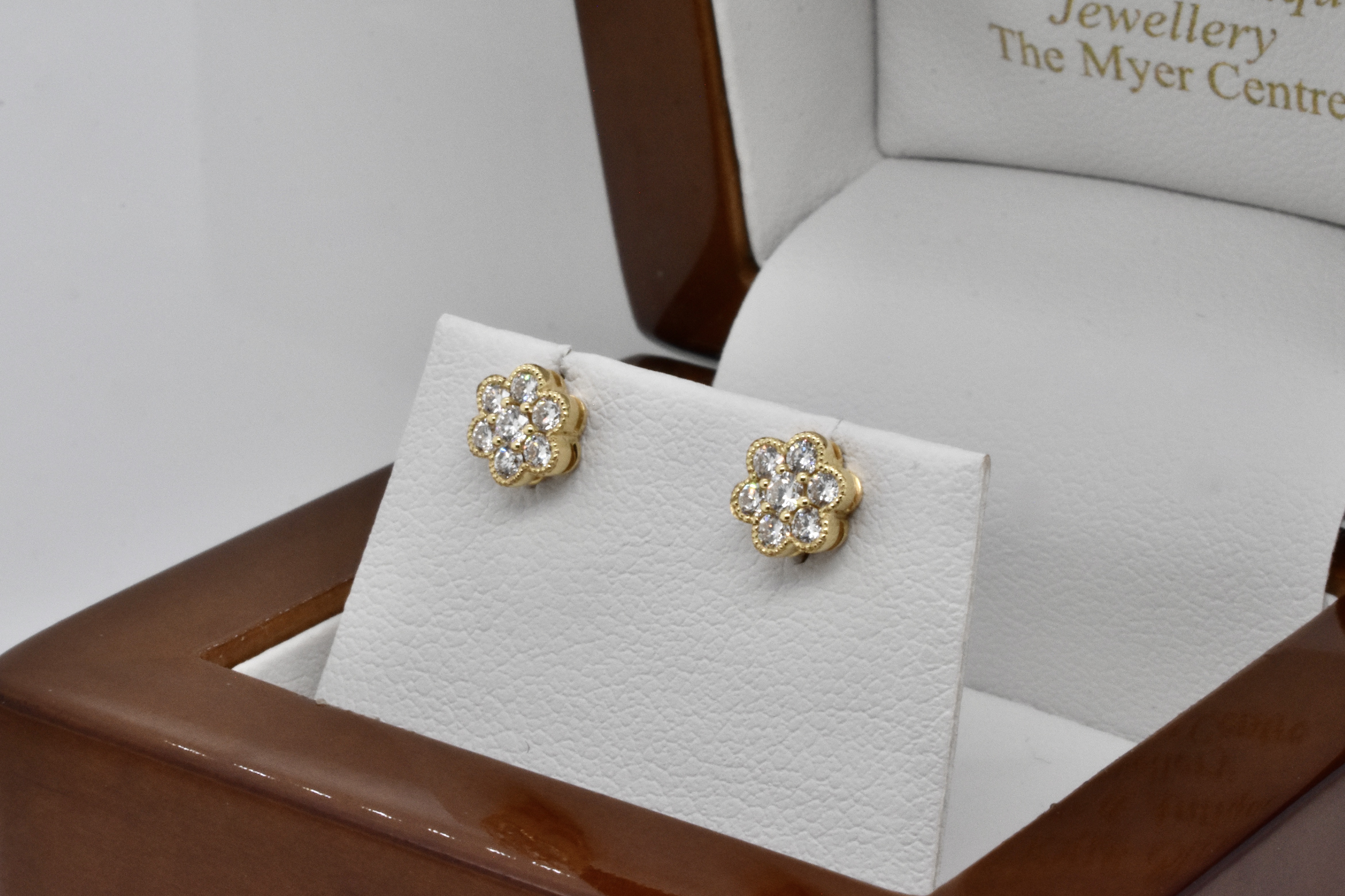 This pair of studs is crafted in 18ct yellow gold with 14 FG/VS-SI RBC diamonds totalling 0.33ct, in a pretty daisy style design with dainty millgrain edge detail. Studs have post and butterfly fittings. Independent Valuation Supplied