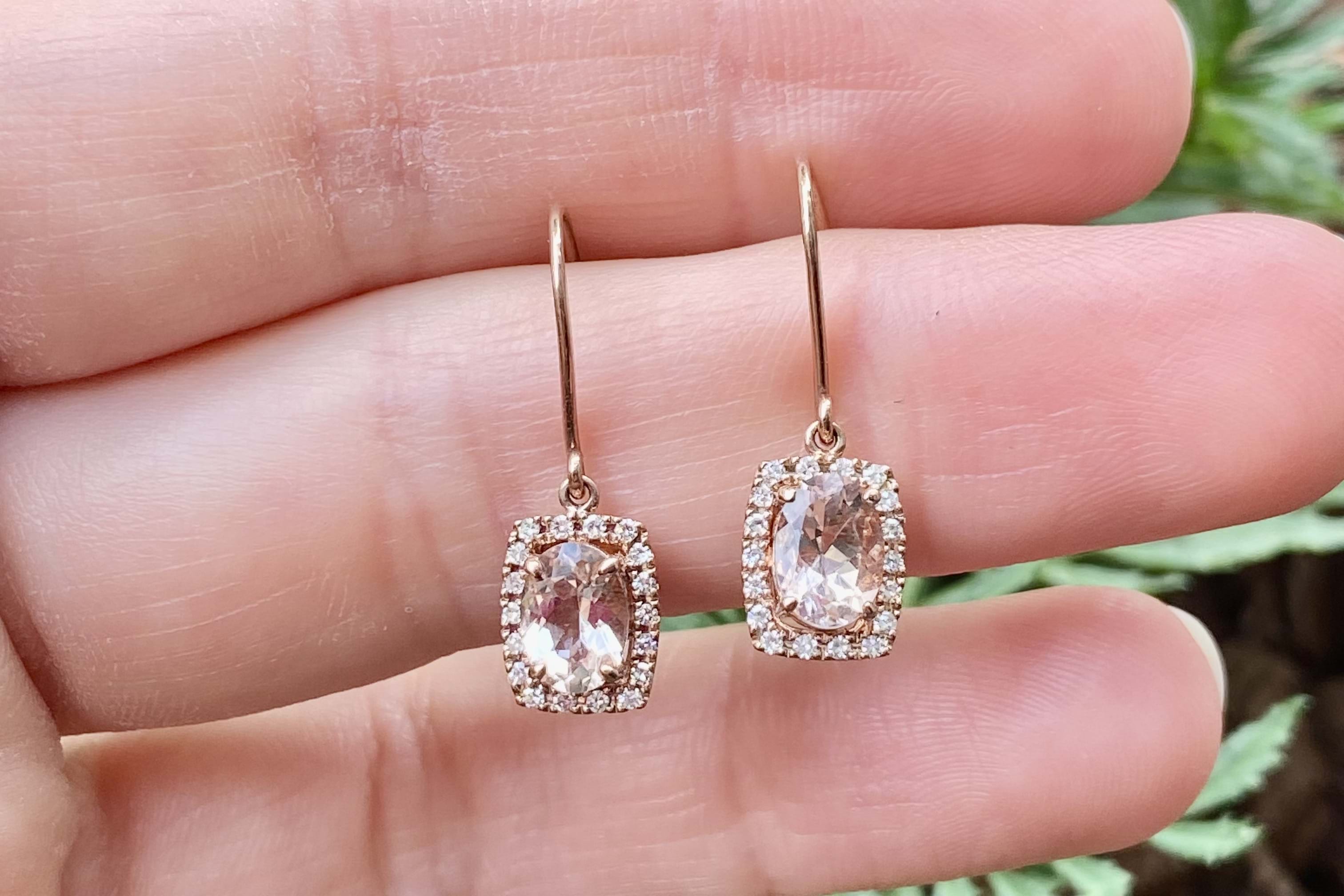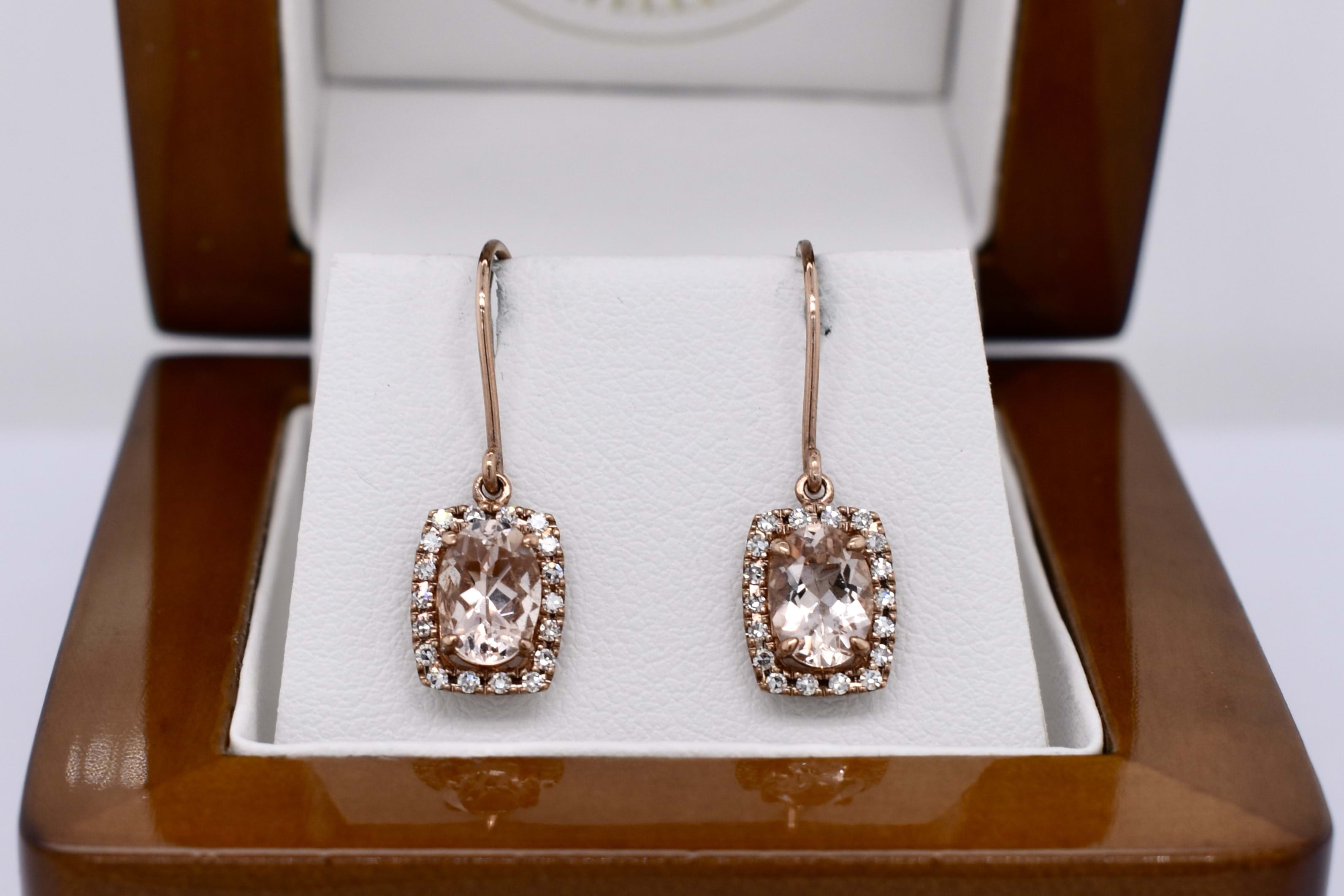 The prettiest drop earrings, made in 9ct rose gold, featuring two oval 6.95x5.04x3.14mm (approx) morganites, equalling 1.25ct. Four claw set surrounded by 18 round brilliant cut, shared cut down claw set, 1.10mm diamonds in a cushion shaped halo. Total diamond weight of 0.20ct H SI. Completed with shepherd hook fittings. Independent valuation supplied.