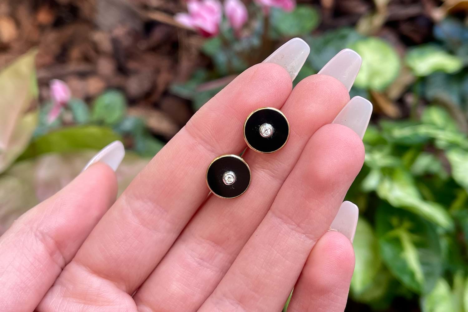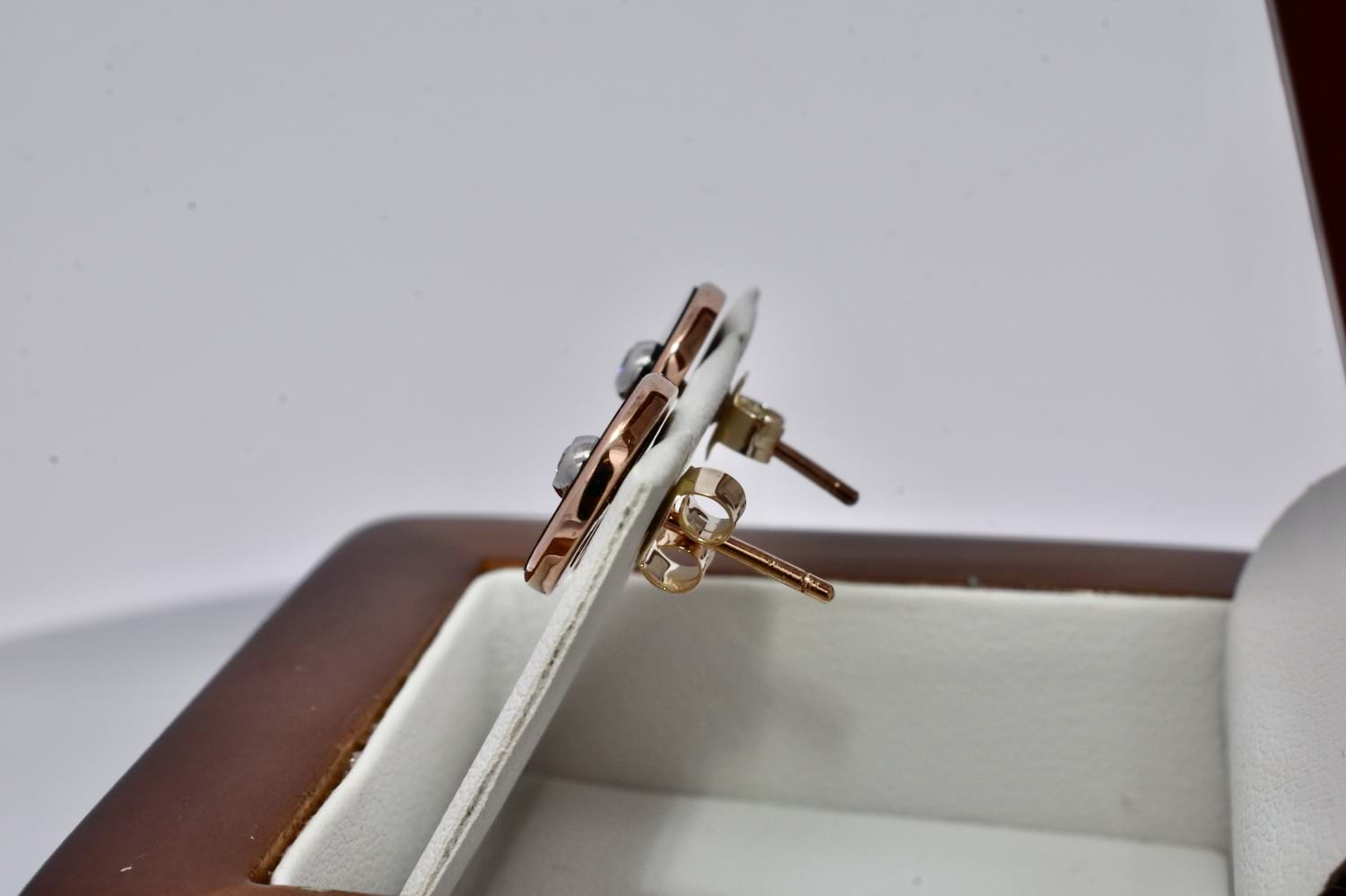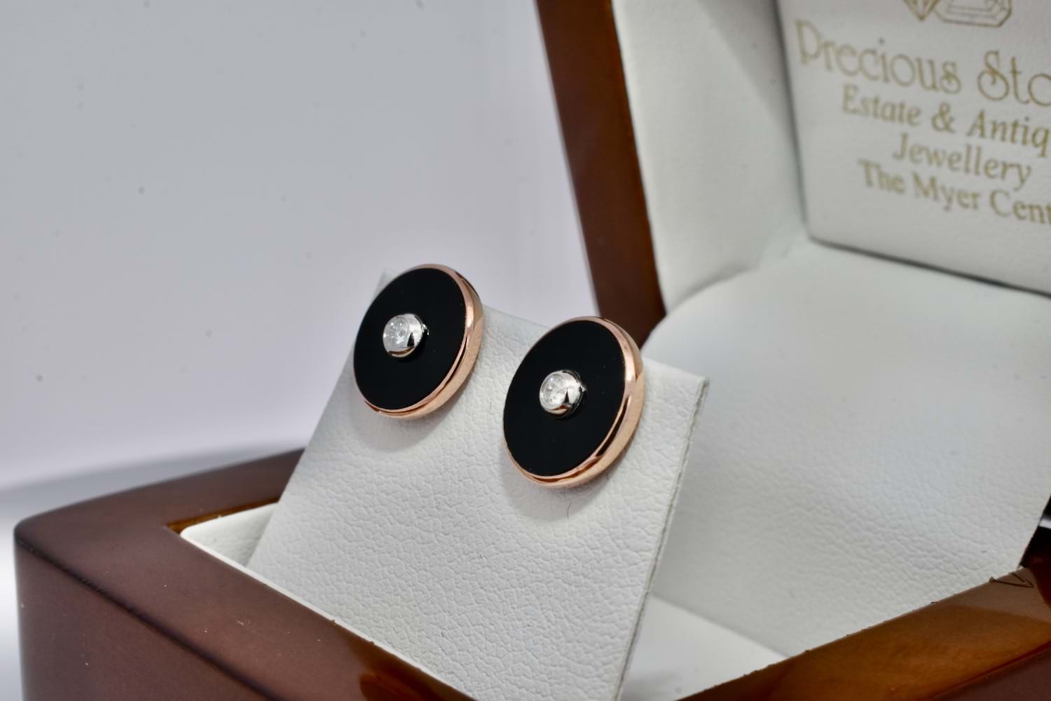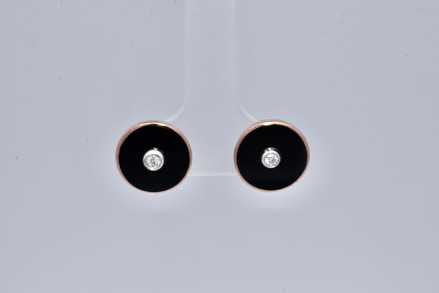 A timeless look, these 9ct rose gold earrings are set with a round panel of onyx measuring approx. 11mm and set with a centre shimmering RBC diamond measuring approx. 2.2mm in a complementary bezel of white gold, with post and butterfly fittings