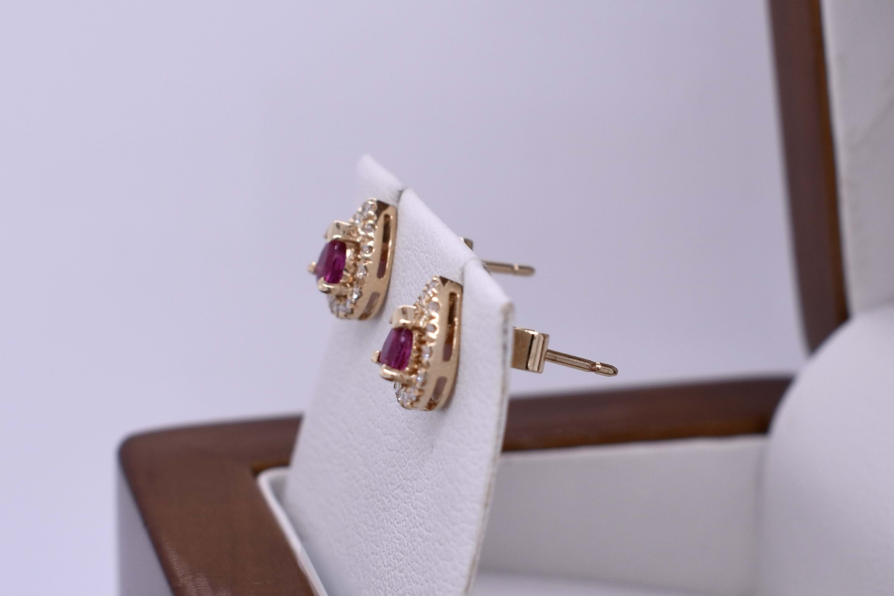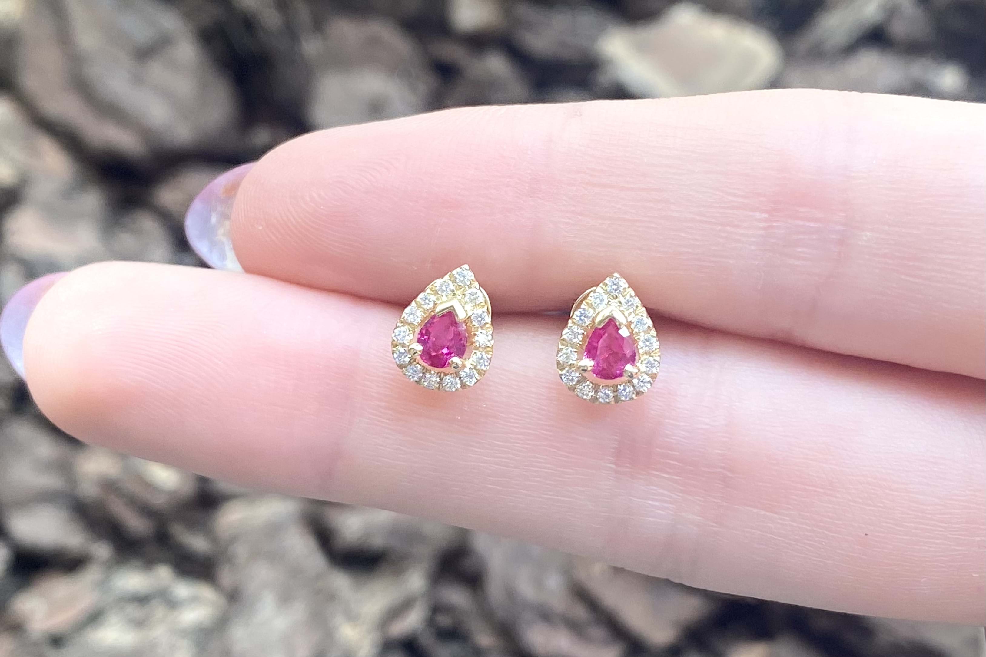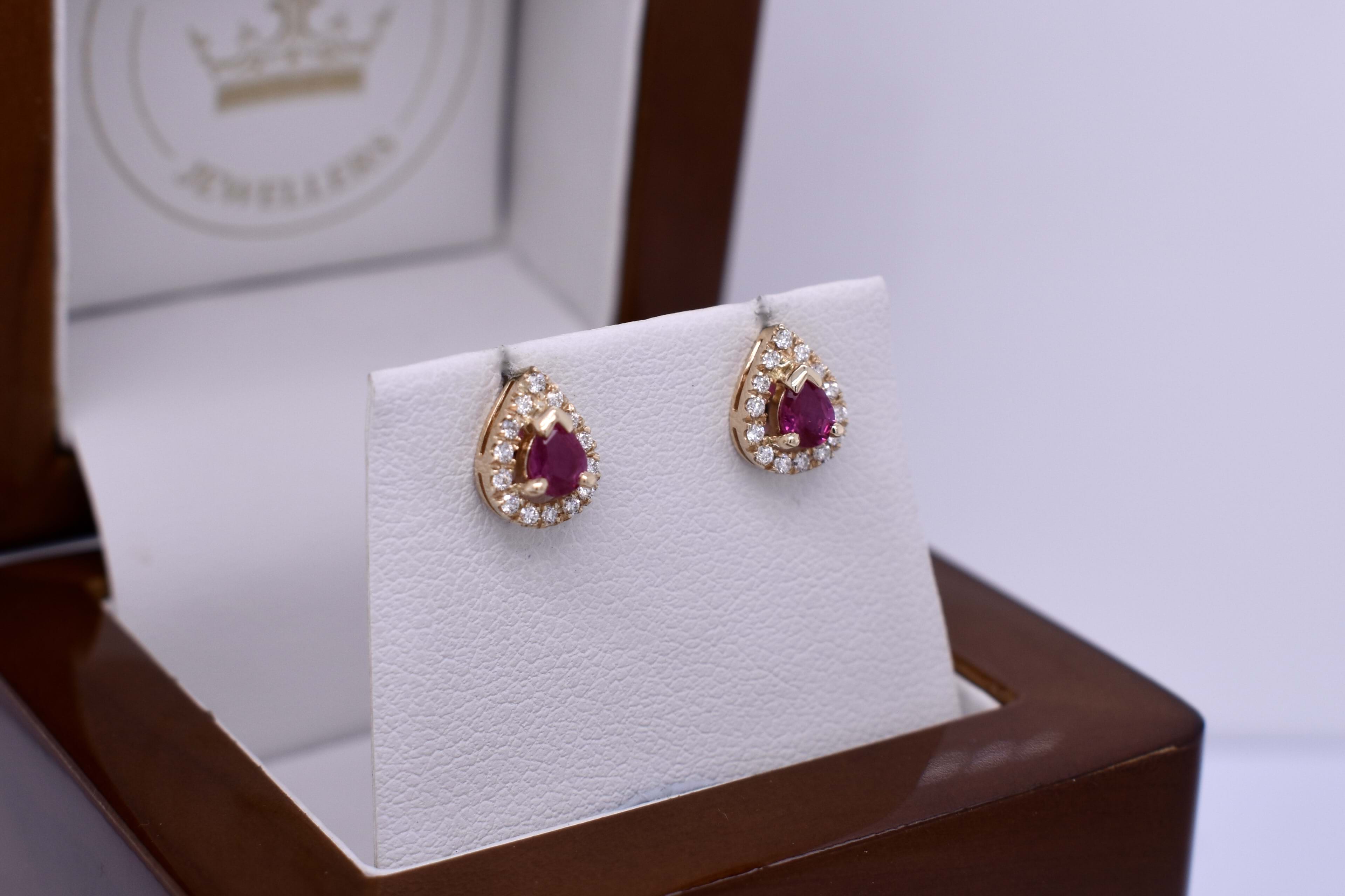 Beautiful matching pair of pearshape rubies totalling 0.46cts in a bright, mid pinkish red cap and two claw set in 9ct yellow gold with a single halo surround of sparkling round brilliant cut diamonds with post & butterfly fittings. Total diamond content equals 0.15ct H/SI. Independent Valuation Supplied
