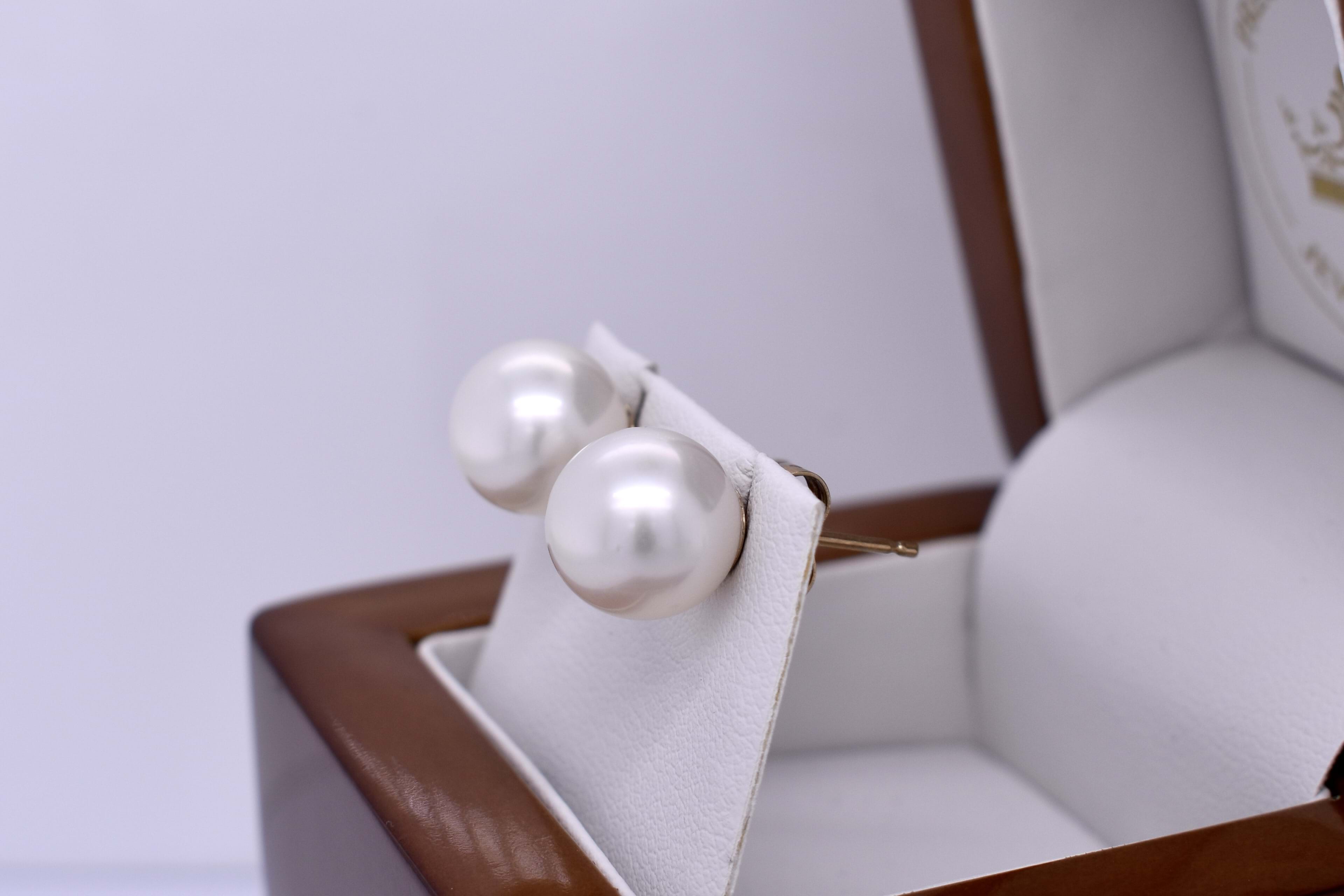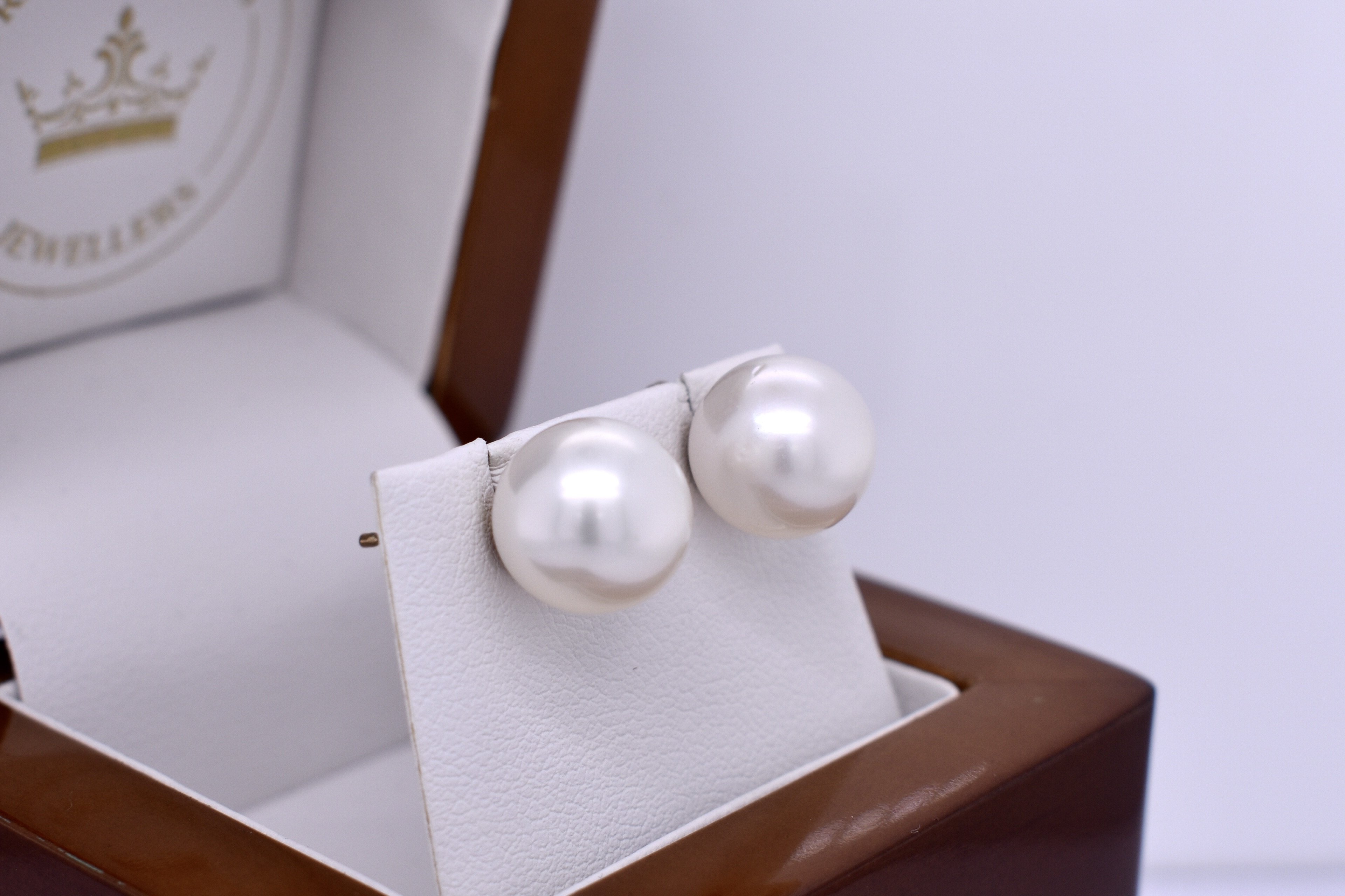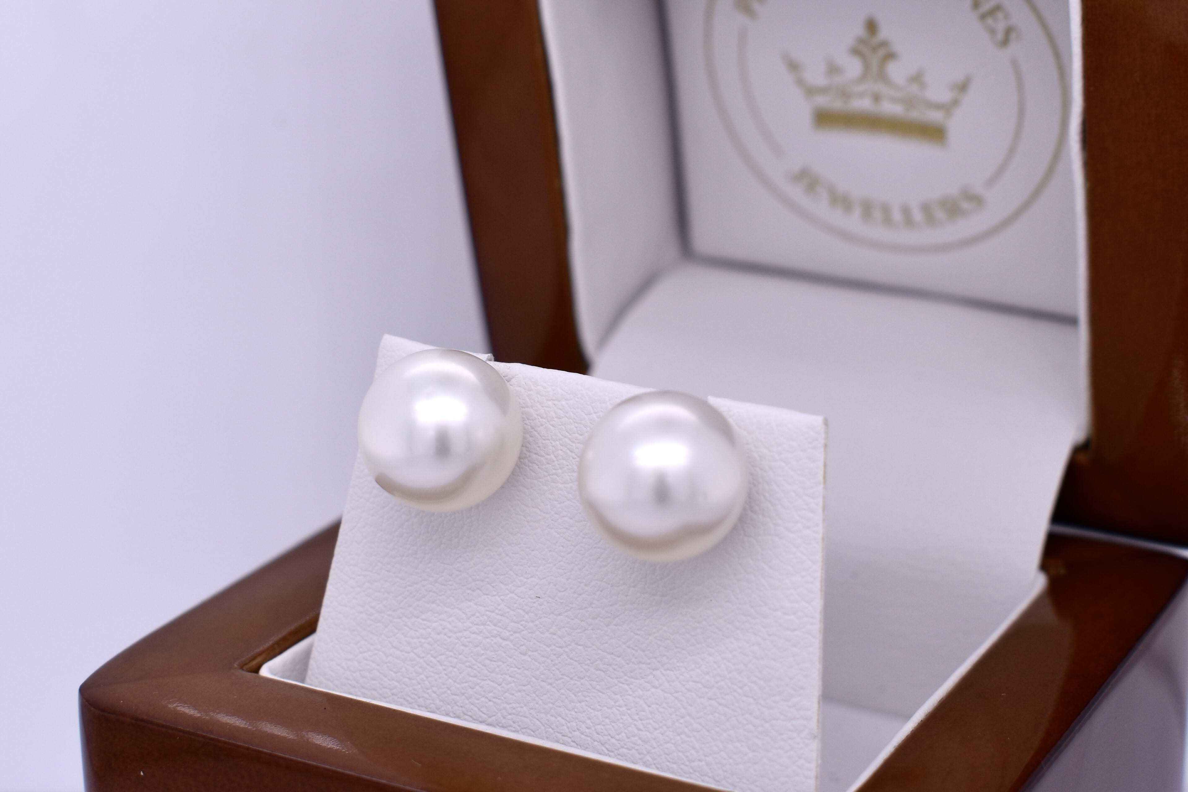 Fantastic pair of pearl earrings, with two 10.5mm semi round white South Sea pearls set in 9ct yellow gold studs, with a plain 5mm round pearl cap, completed with post and butterfly fittings. 4.07 grams. Independent Valuation Supplied.