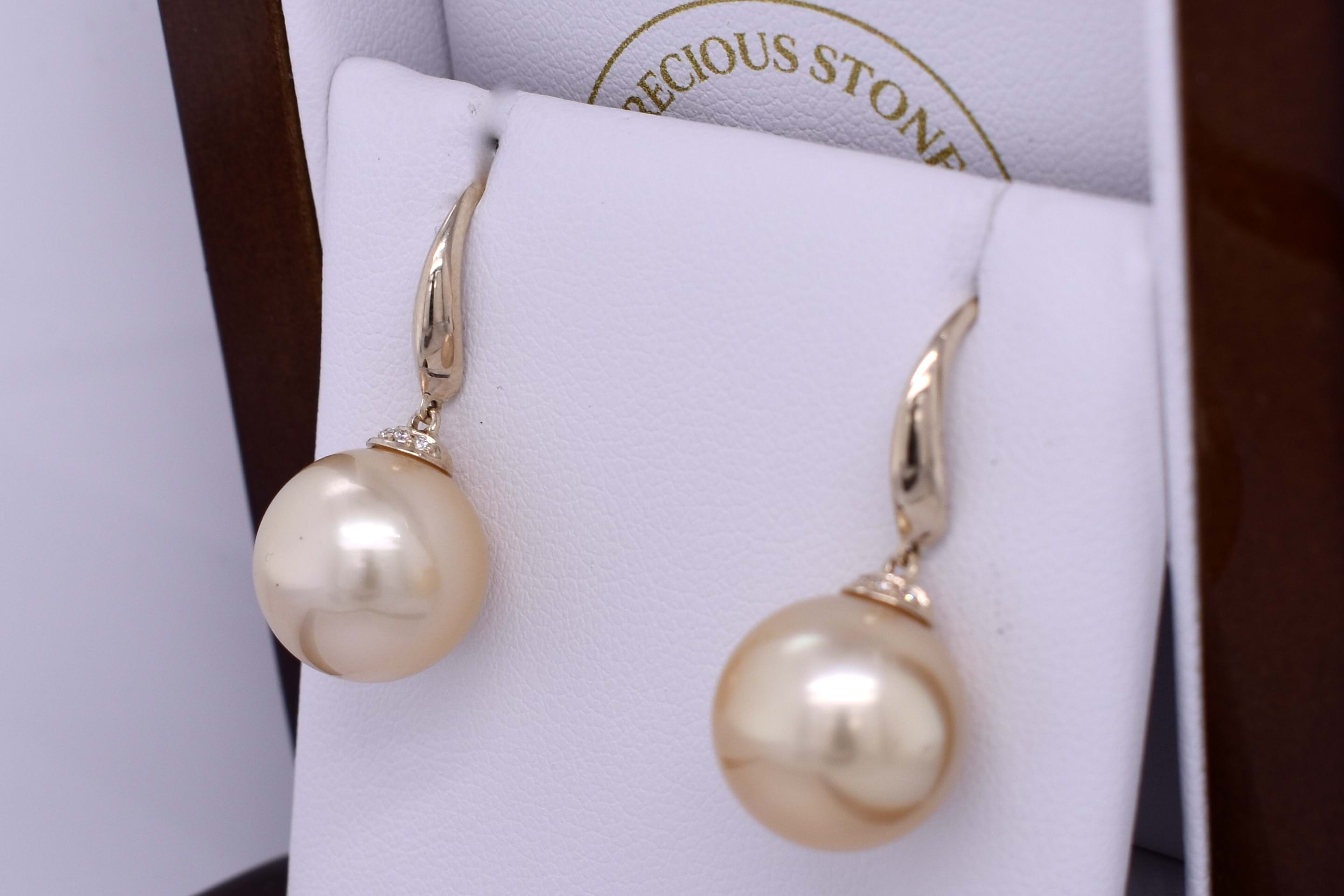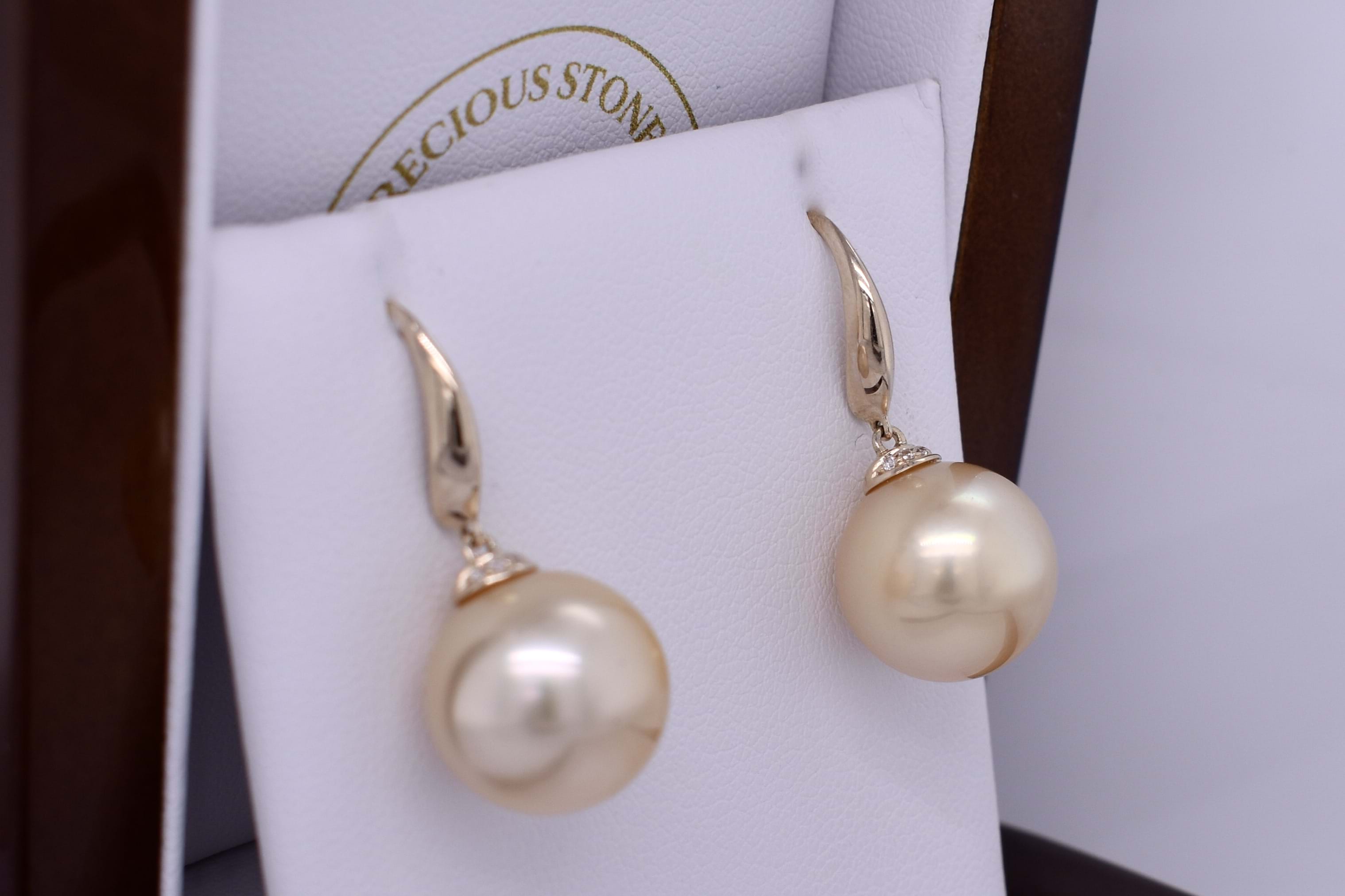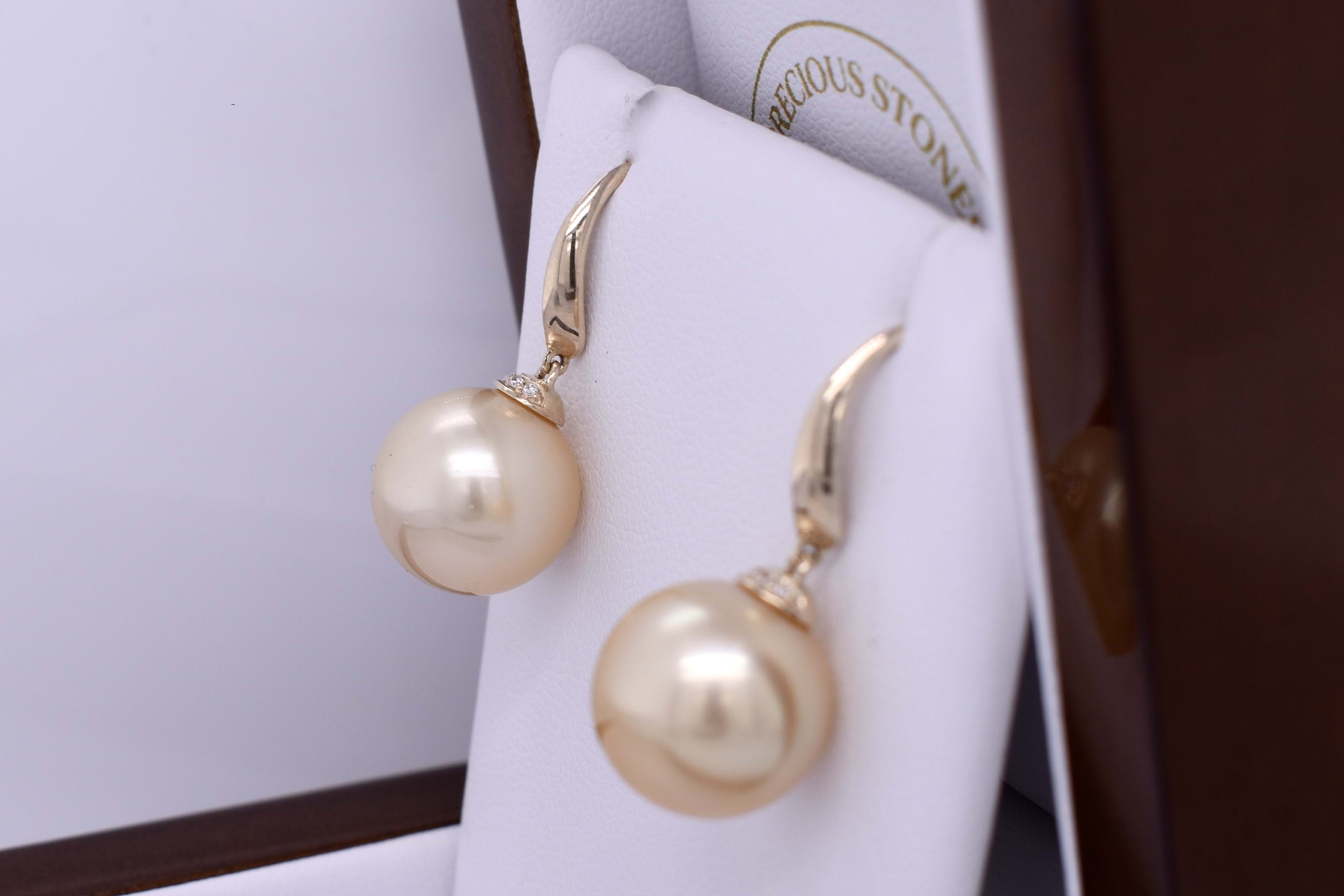 These amazing drops are crafted in 9ct yellow gold featuring 12.5-13mm golden south sea near round pearls suspended from a pearl cap set with diamonds, totalling 0.028ct. Completed with elegant shepherd hook fittings.