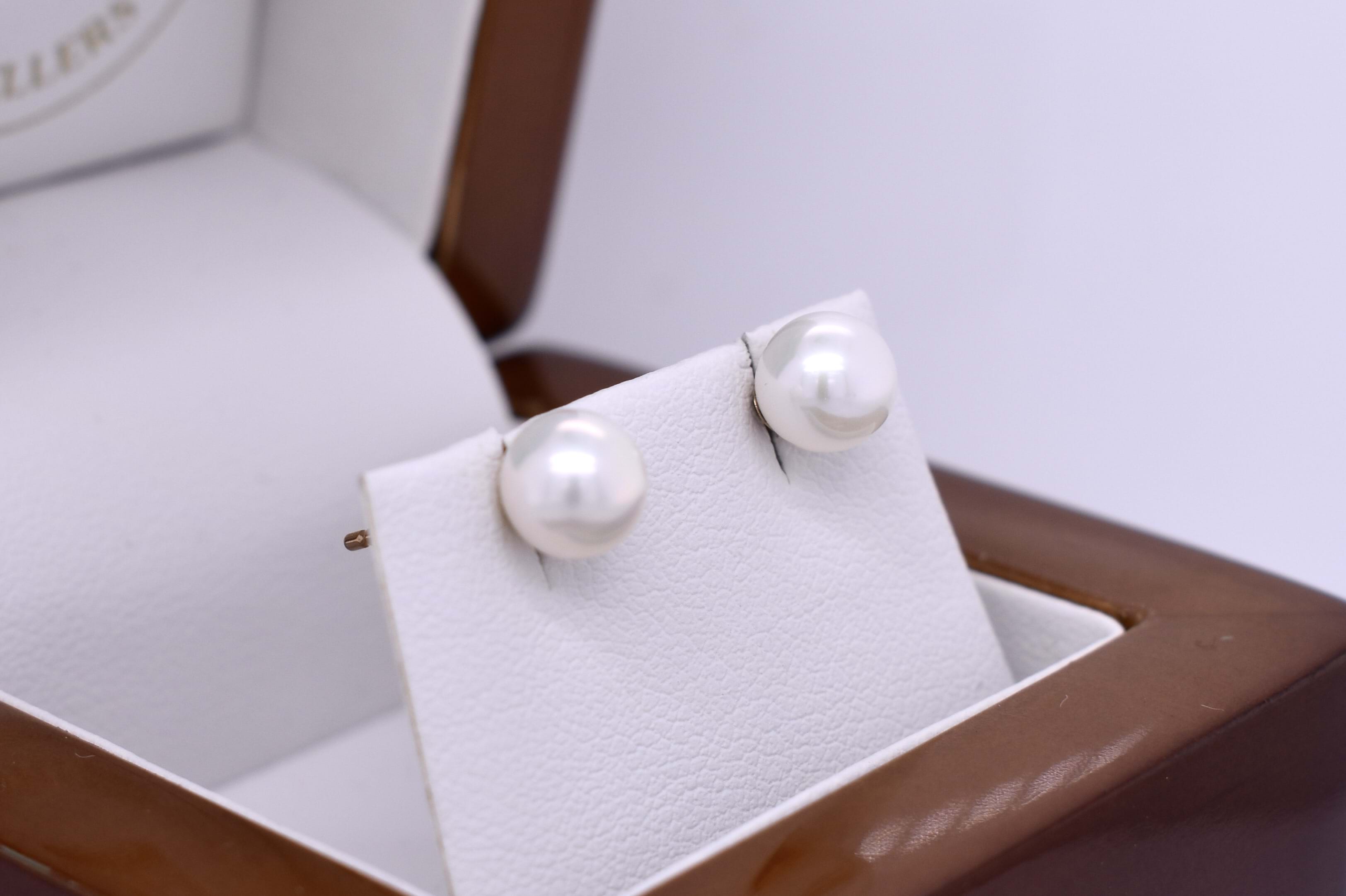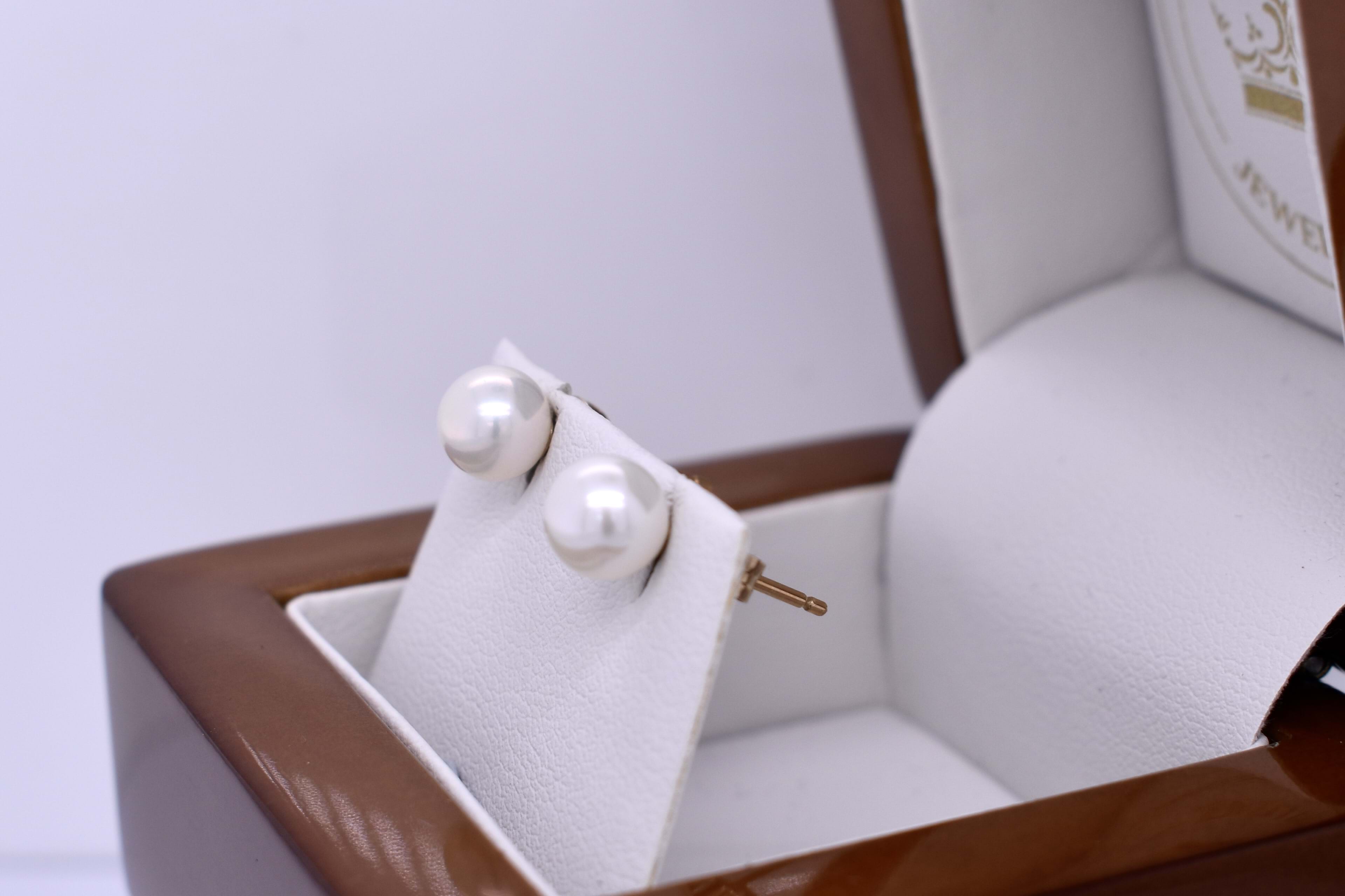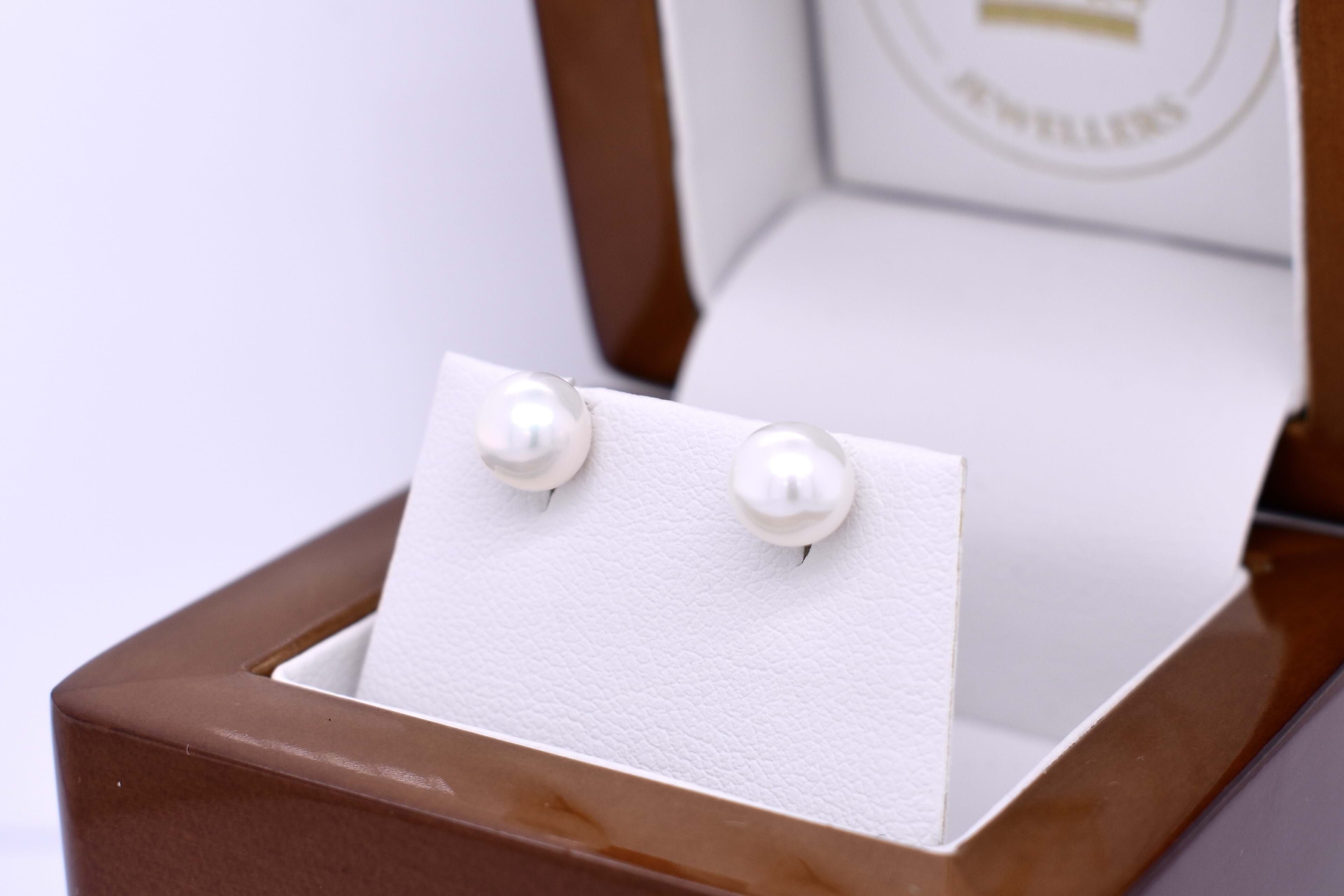 Pretty pair of pearl earrings, with two 6-7mm near round white freshwater pearls in 9ct yellow gold studs, with post and butterfly fittings.