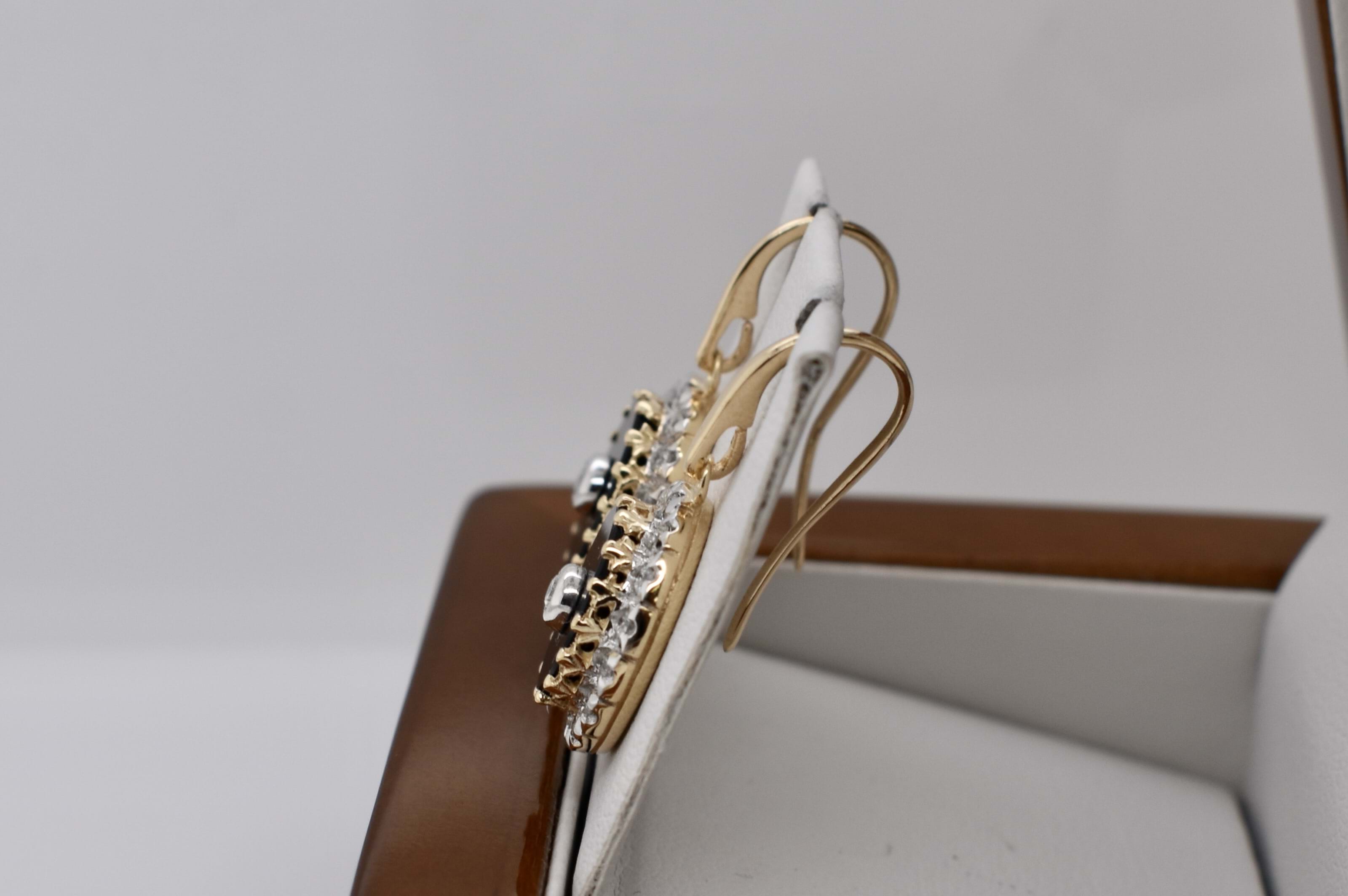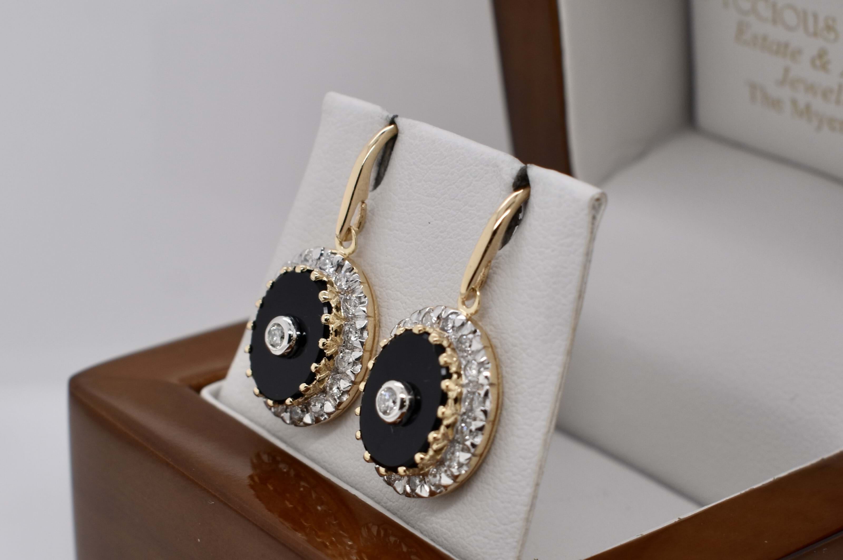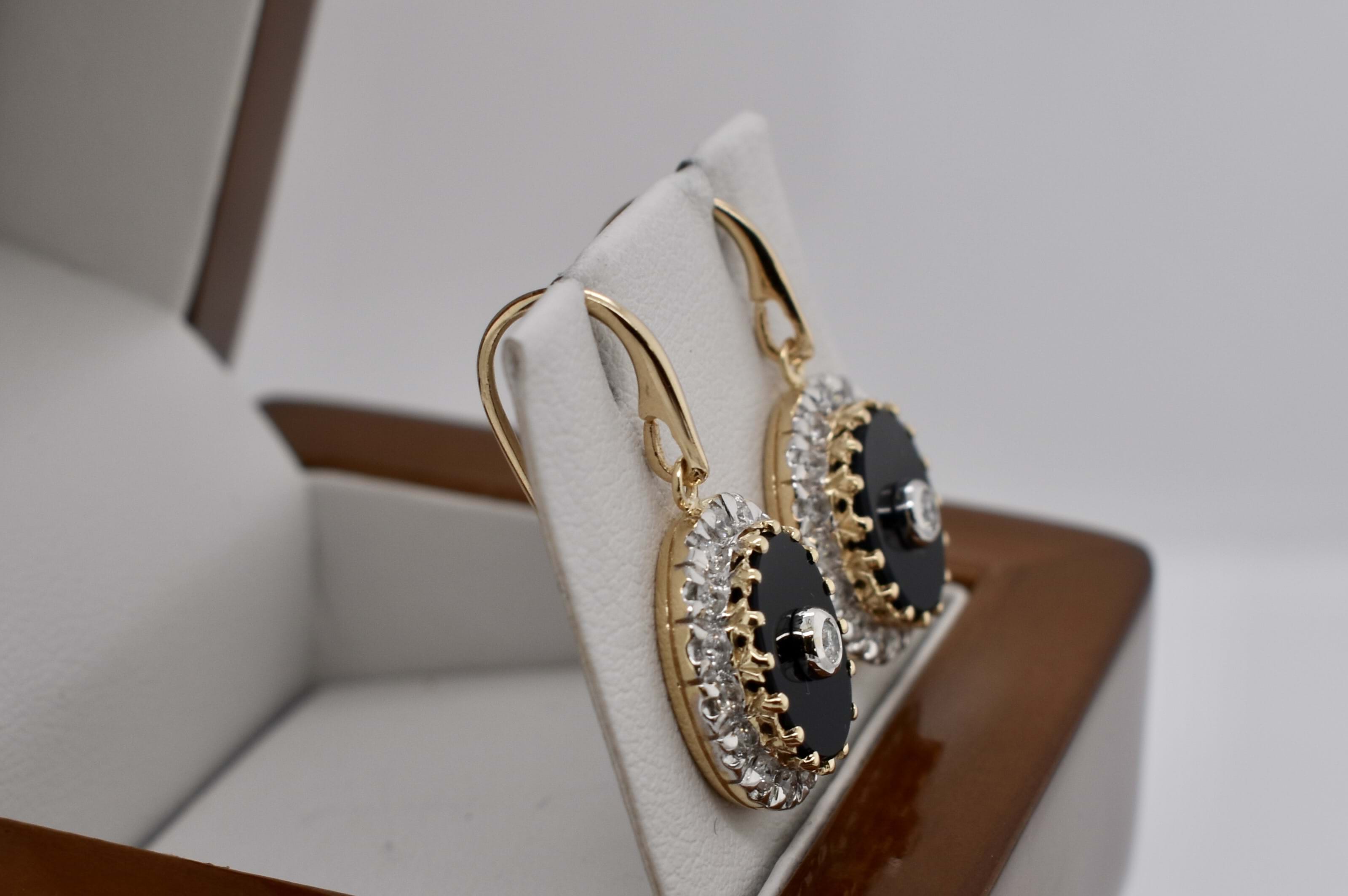 Stylish 9ct yellow gold drop earrings suspended from shepherd hook fittings with an oval cut 15.15x13.95mm piece of onyx, surrounded by grain set diamonds in a halo, and a bezel set round brilliant cut diamond in the centre. The two centre diamonds total 0.10ct HI P2 with the remaining thirty two 1.78mm diamonds equalling 0.64ct HI P2. Independent Valuation Supplied