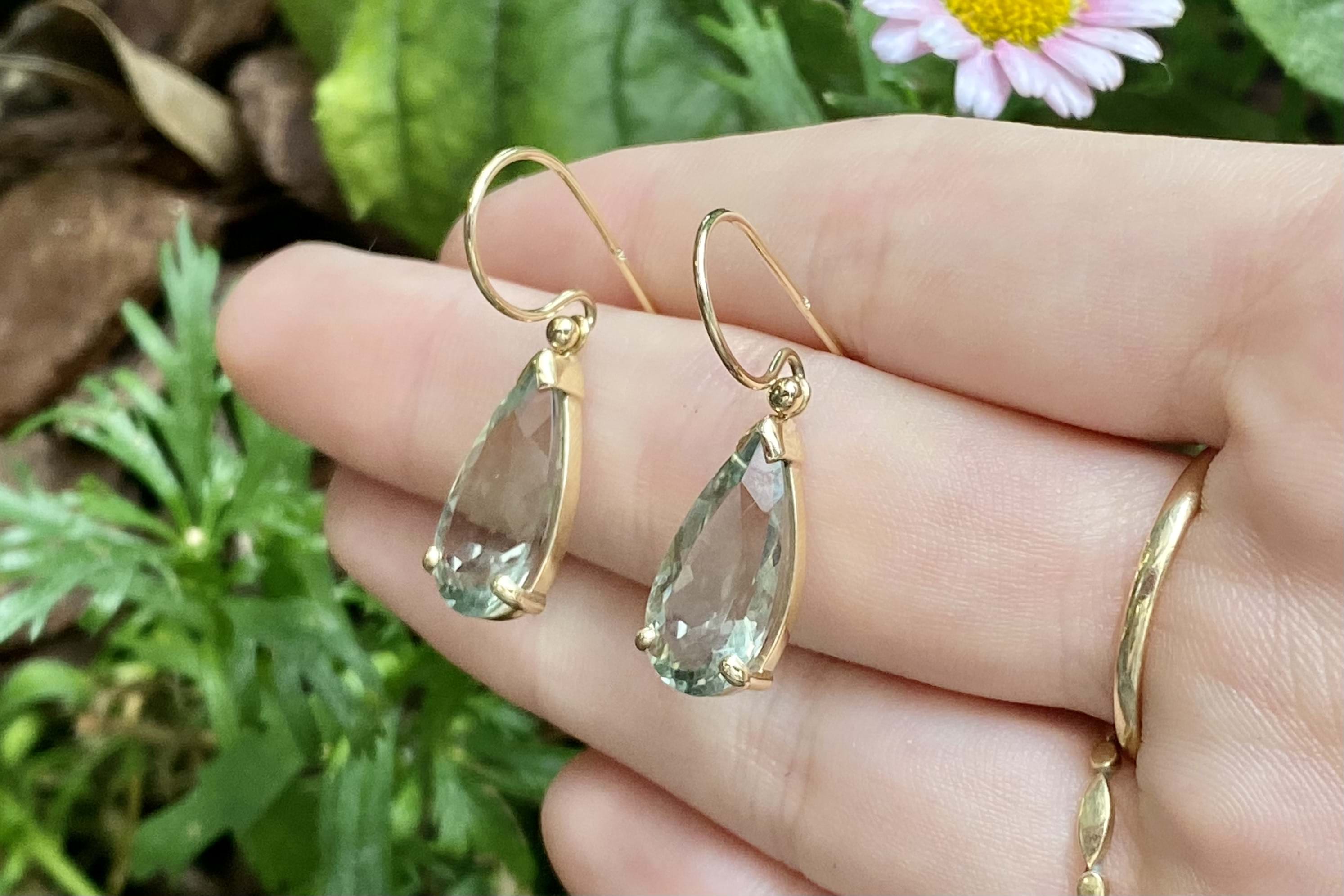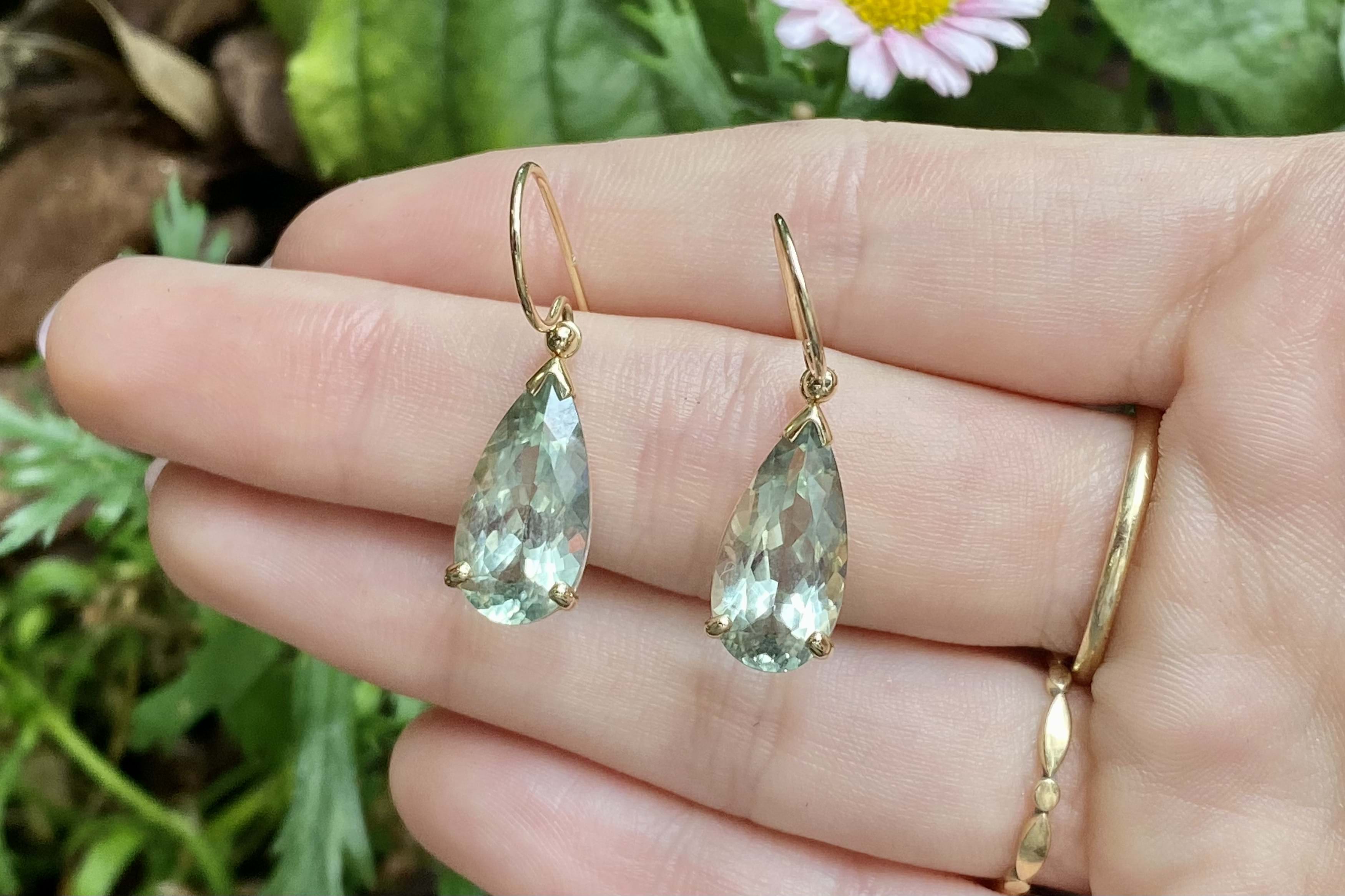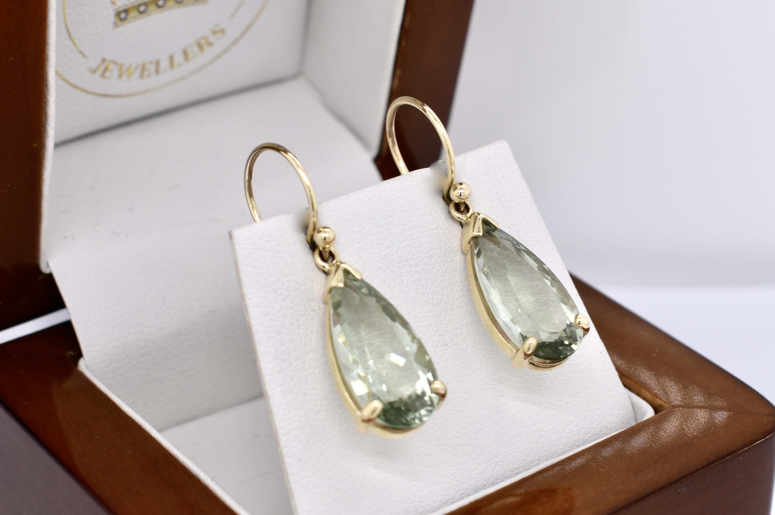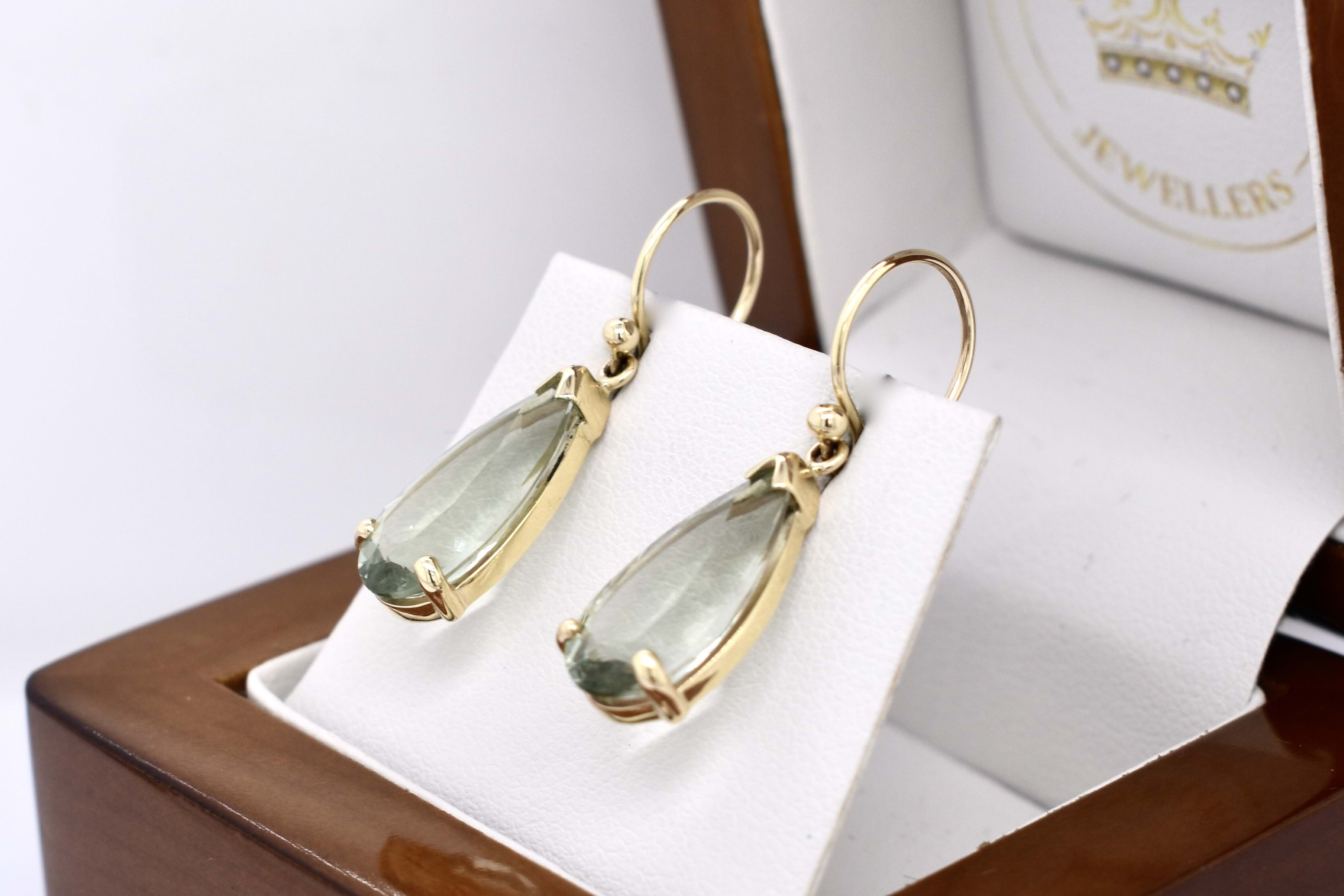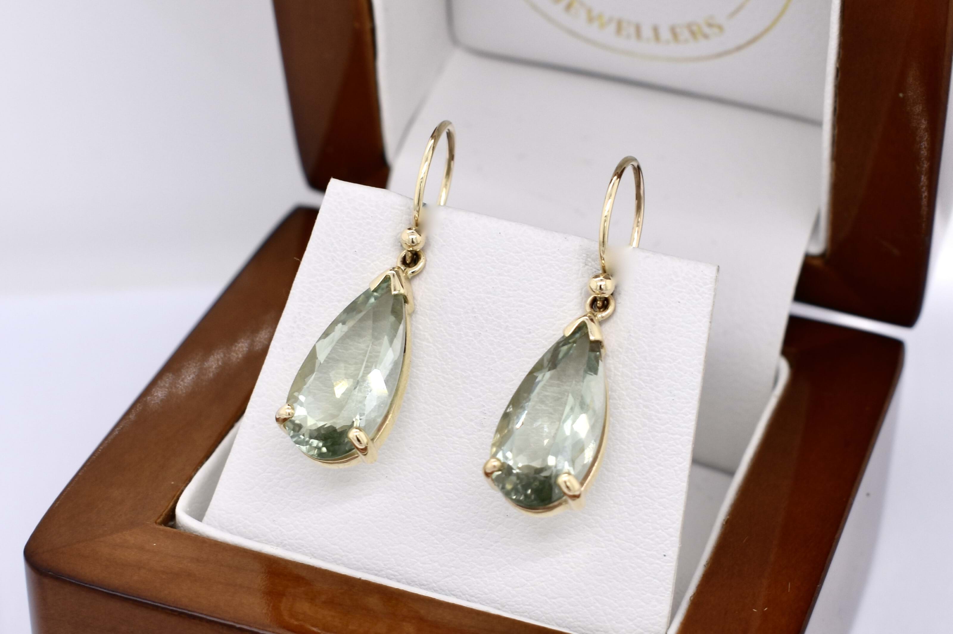 This gorgeous pair of pear shaped drops, features two beautiful prasiolite stones measuring 17.0x8.3mm, two claw and cap set in 9ct yellow gold with shepherd hook fittings.