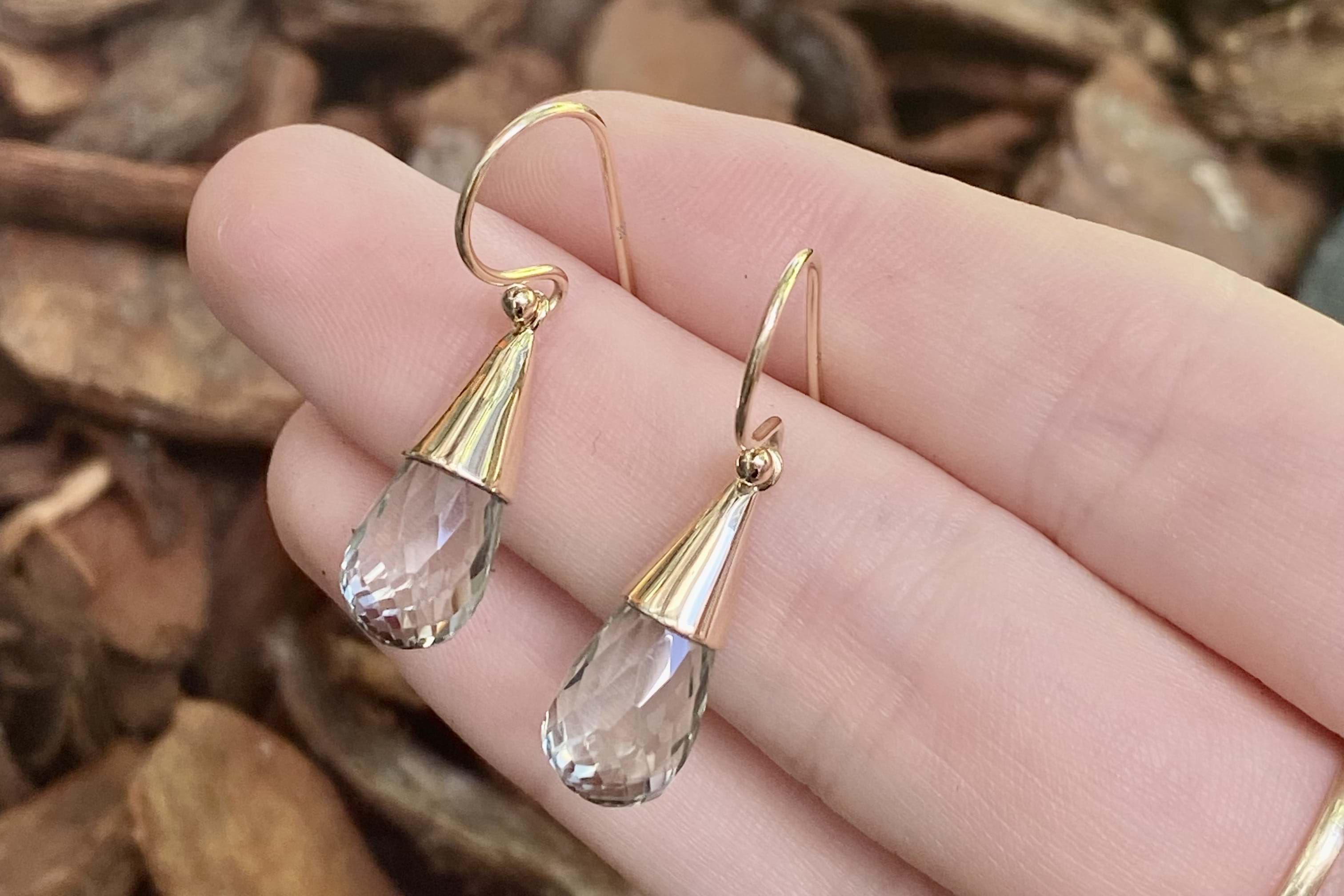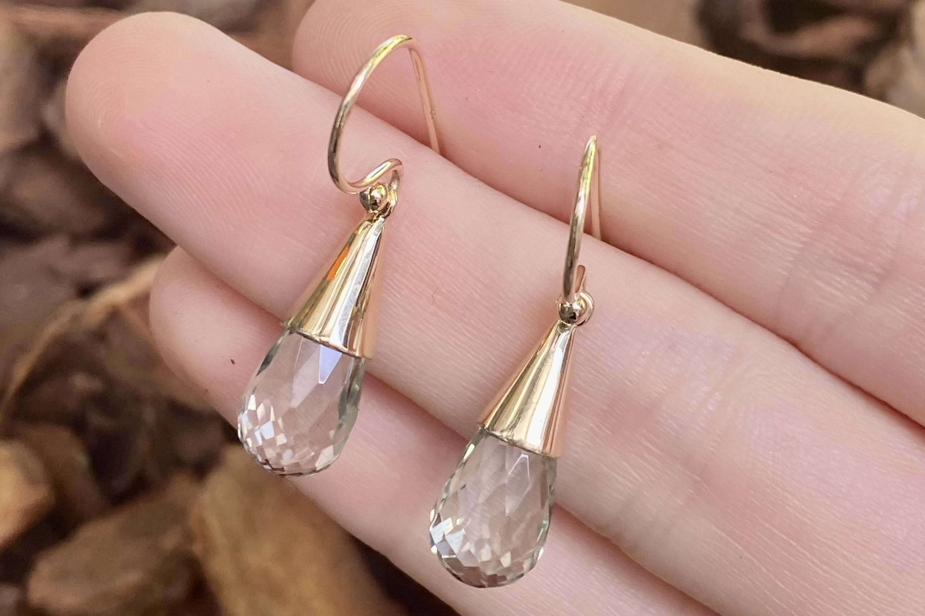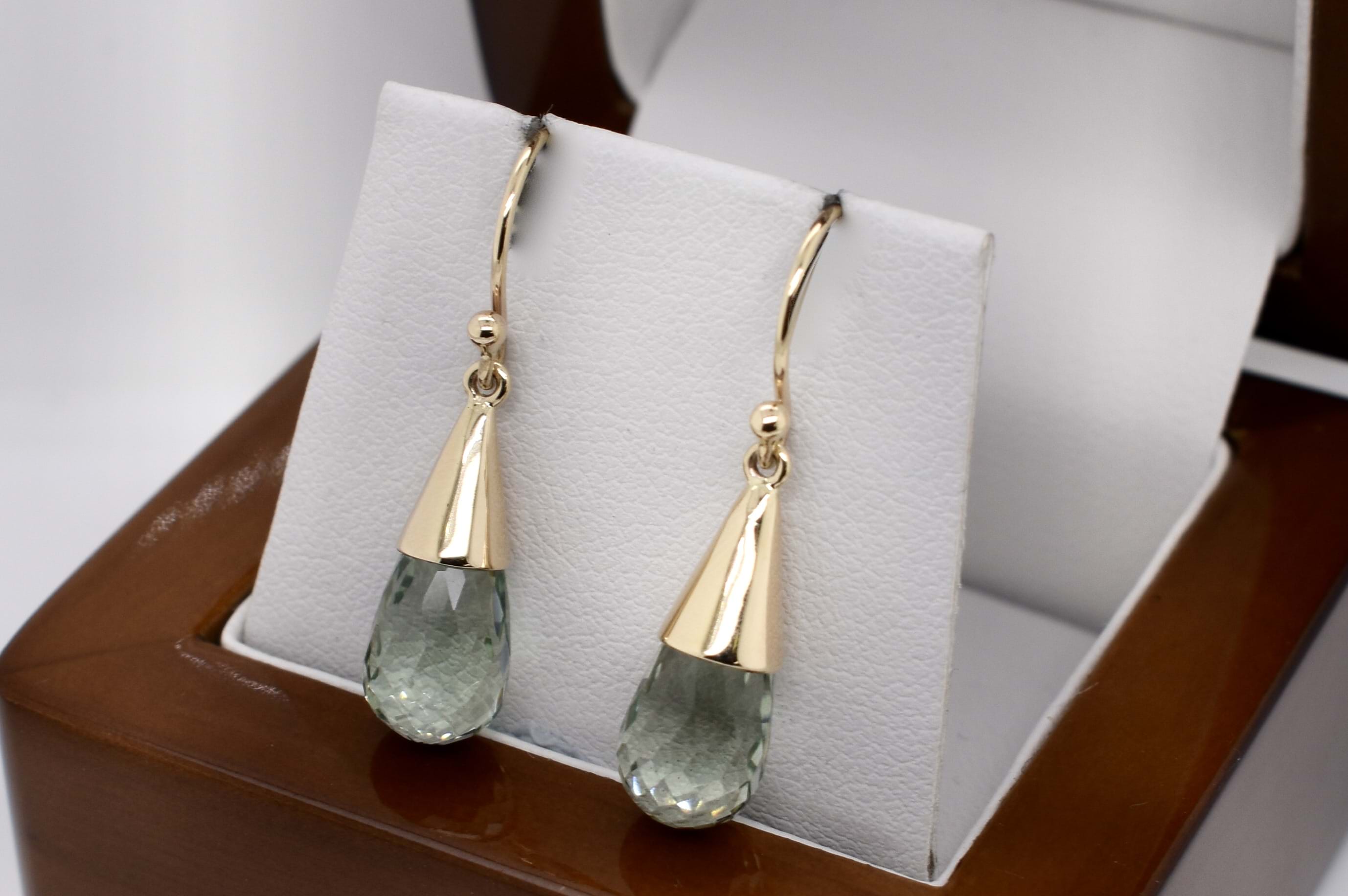 Elegant and stunning prasiolite briolette faceted drops. Set in 9ct yellow gold and measuring 10.0x7.1mm, with gold top caps. Finished with shepherd hook fittings.