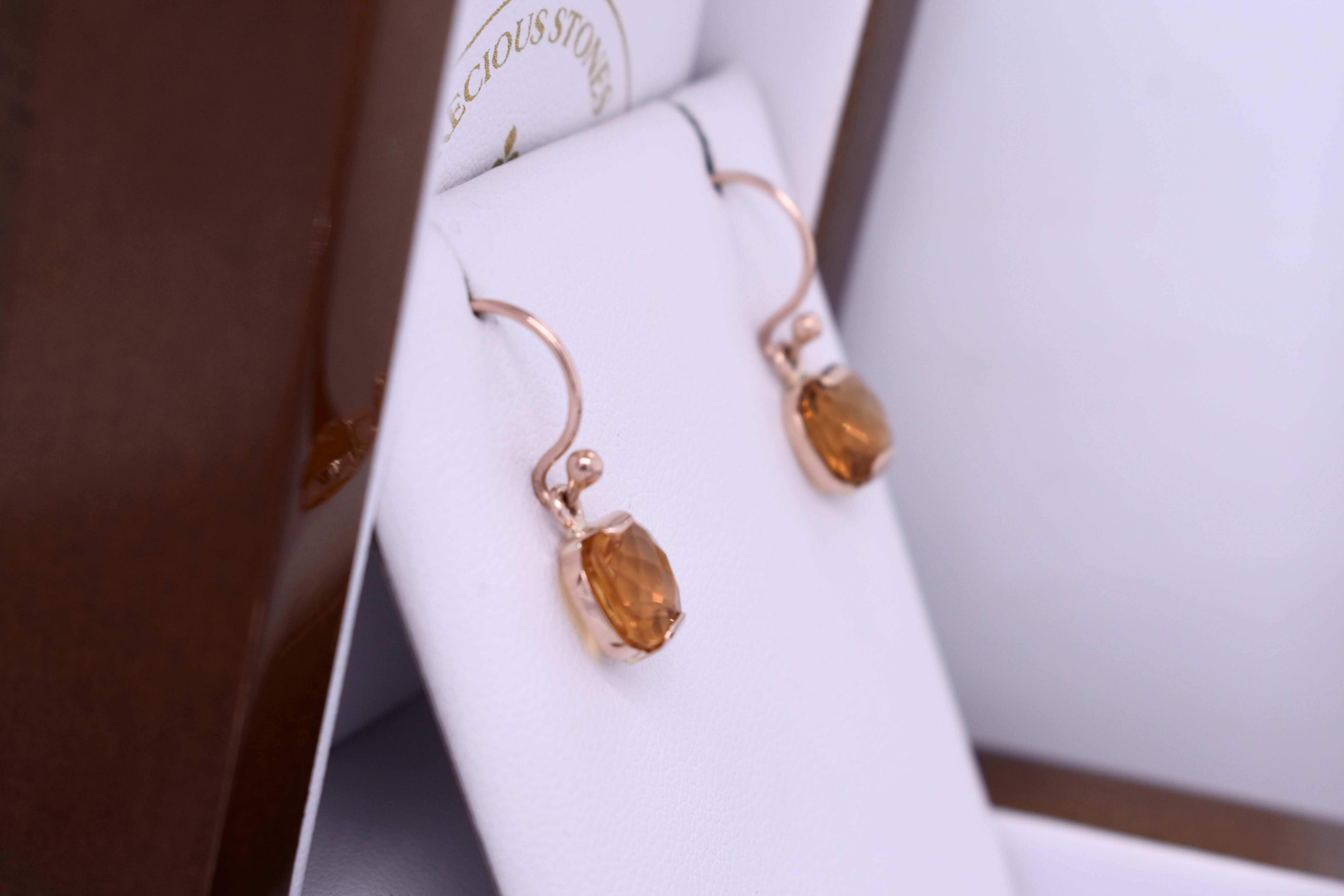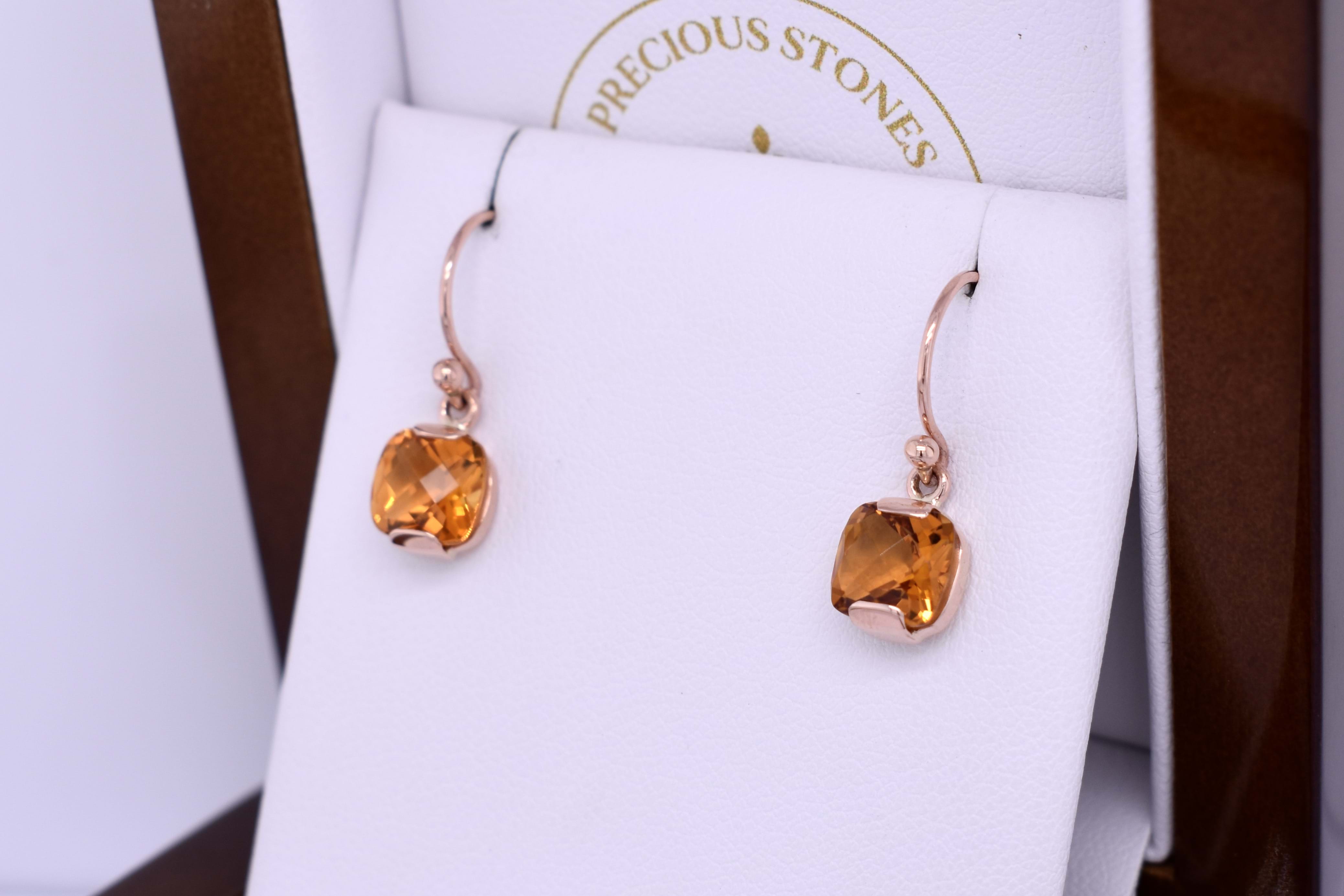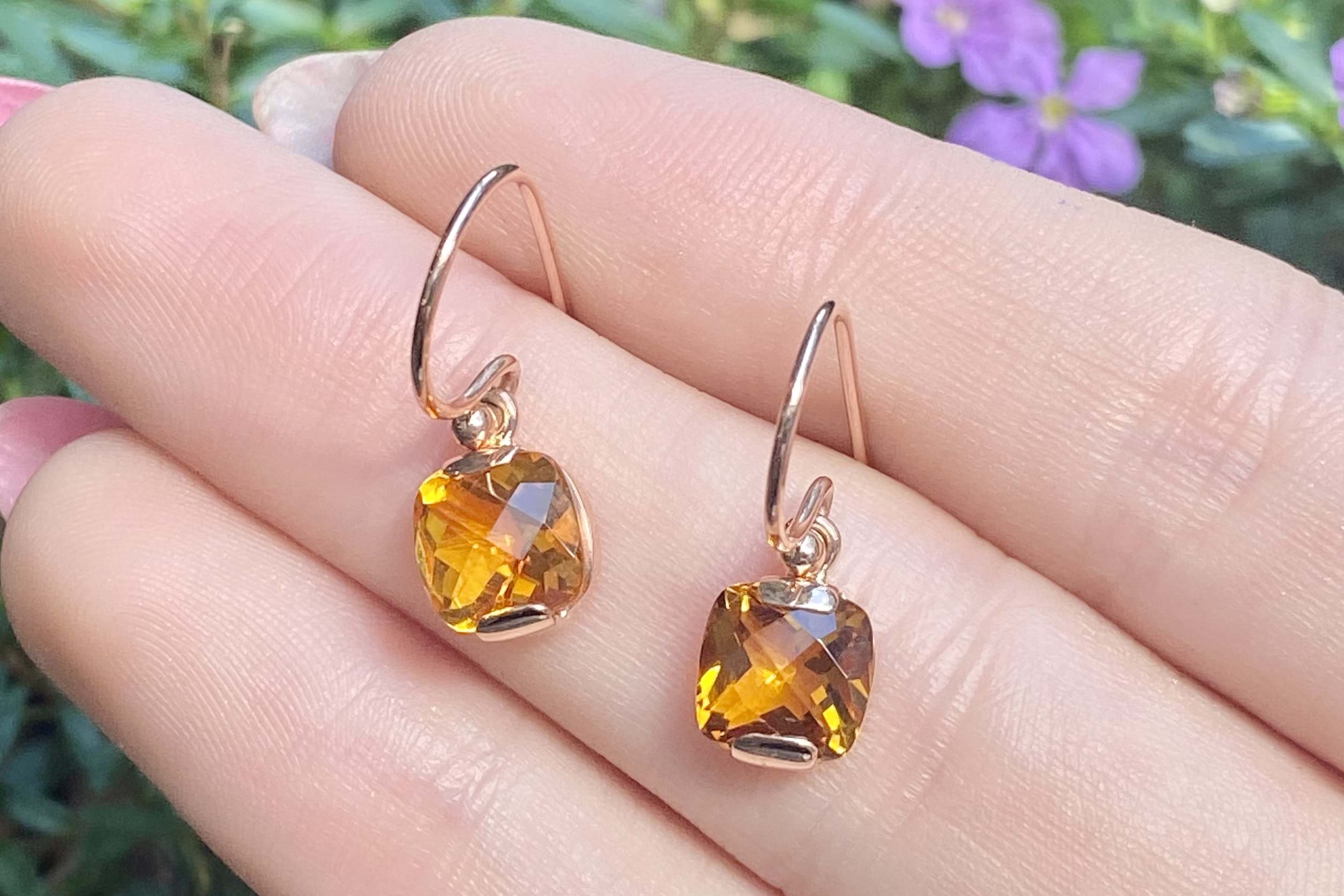 These pretty earrings feature vibrant checkerboard cut cushion citrines measuring approx. 5.8mm, set into a handmade 9ct rose gold semi-bezel setting. The earrings are finished with shepherd hook fittings for everyday wear.