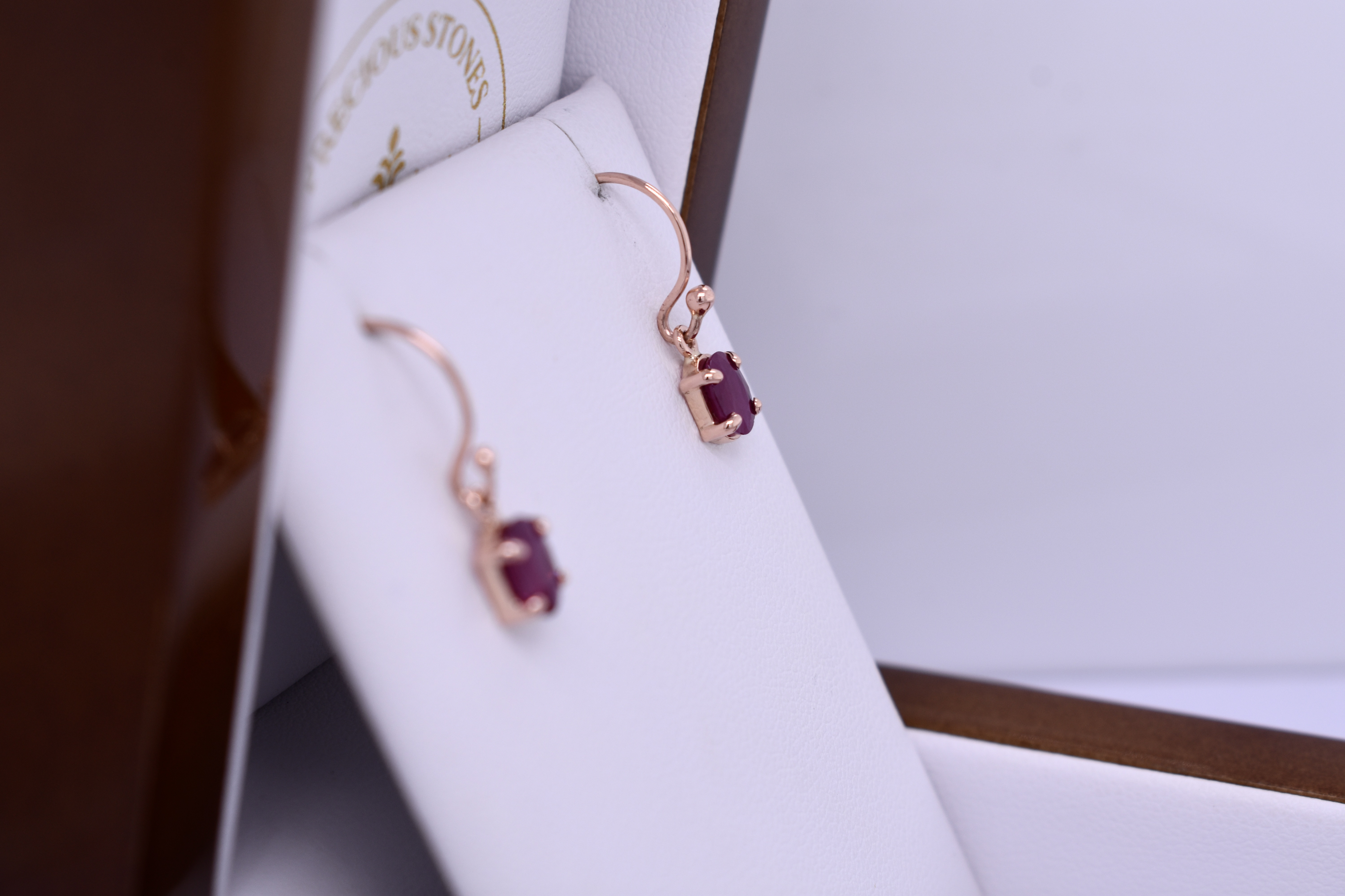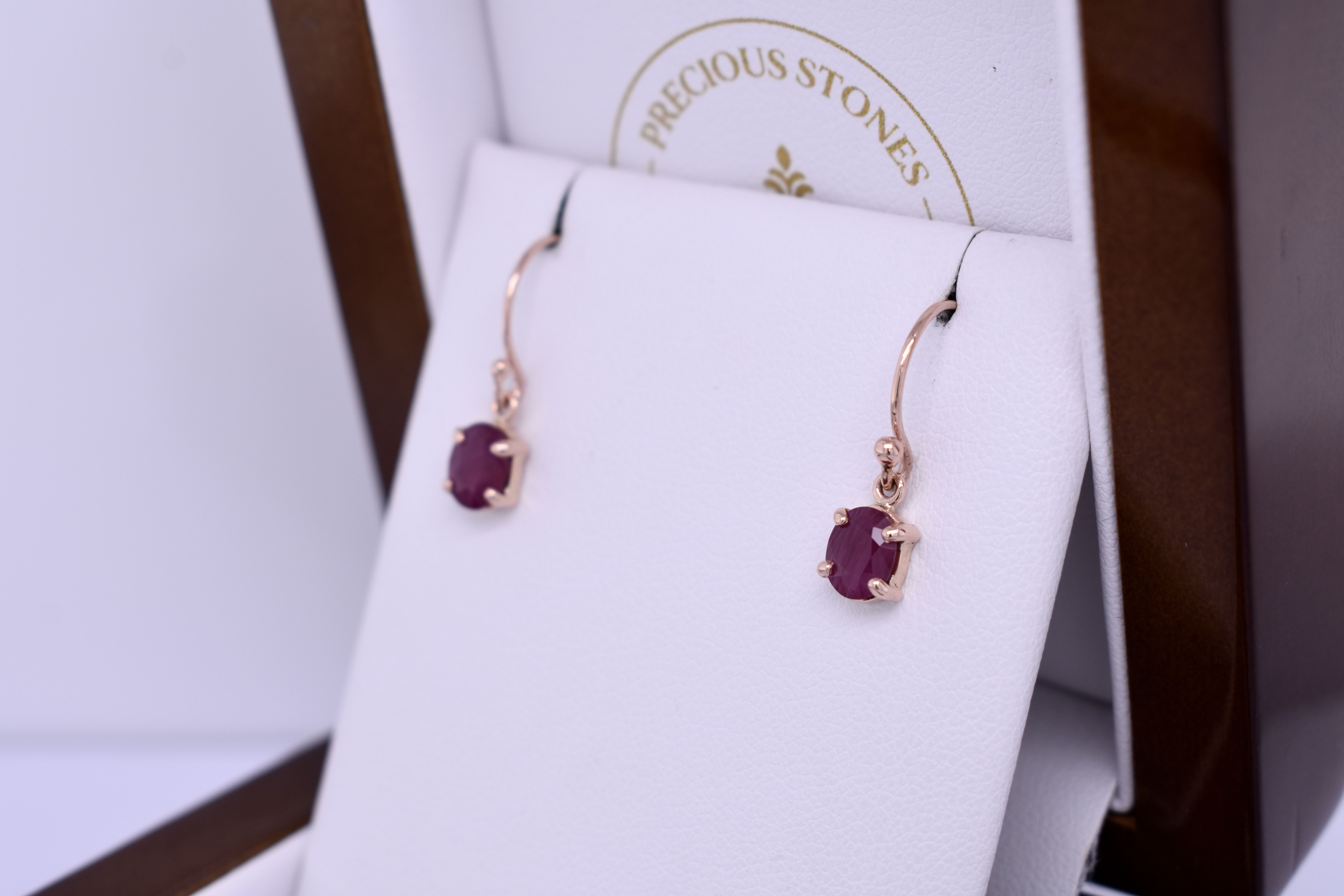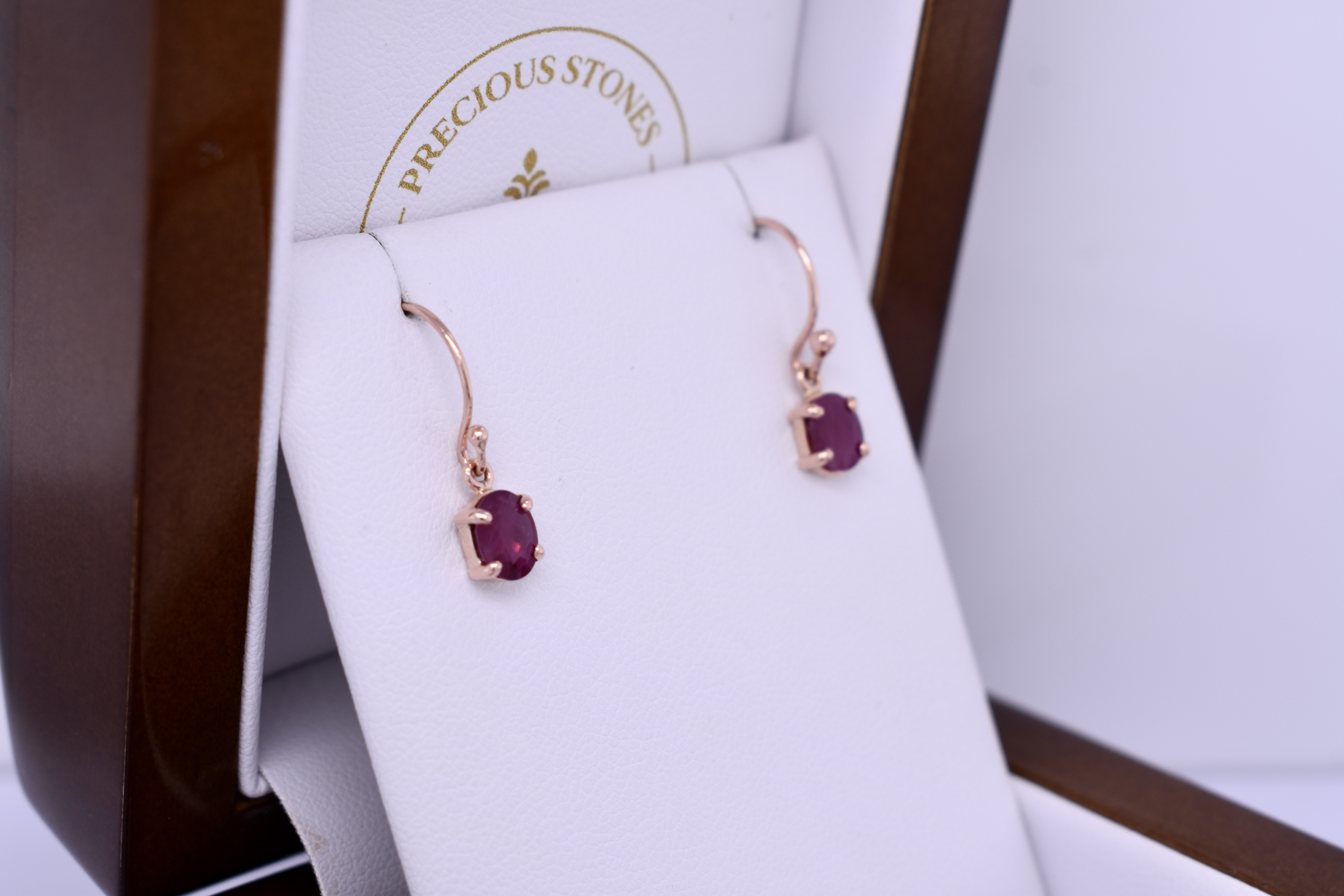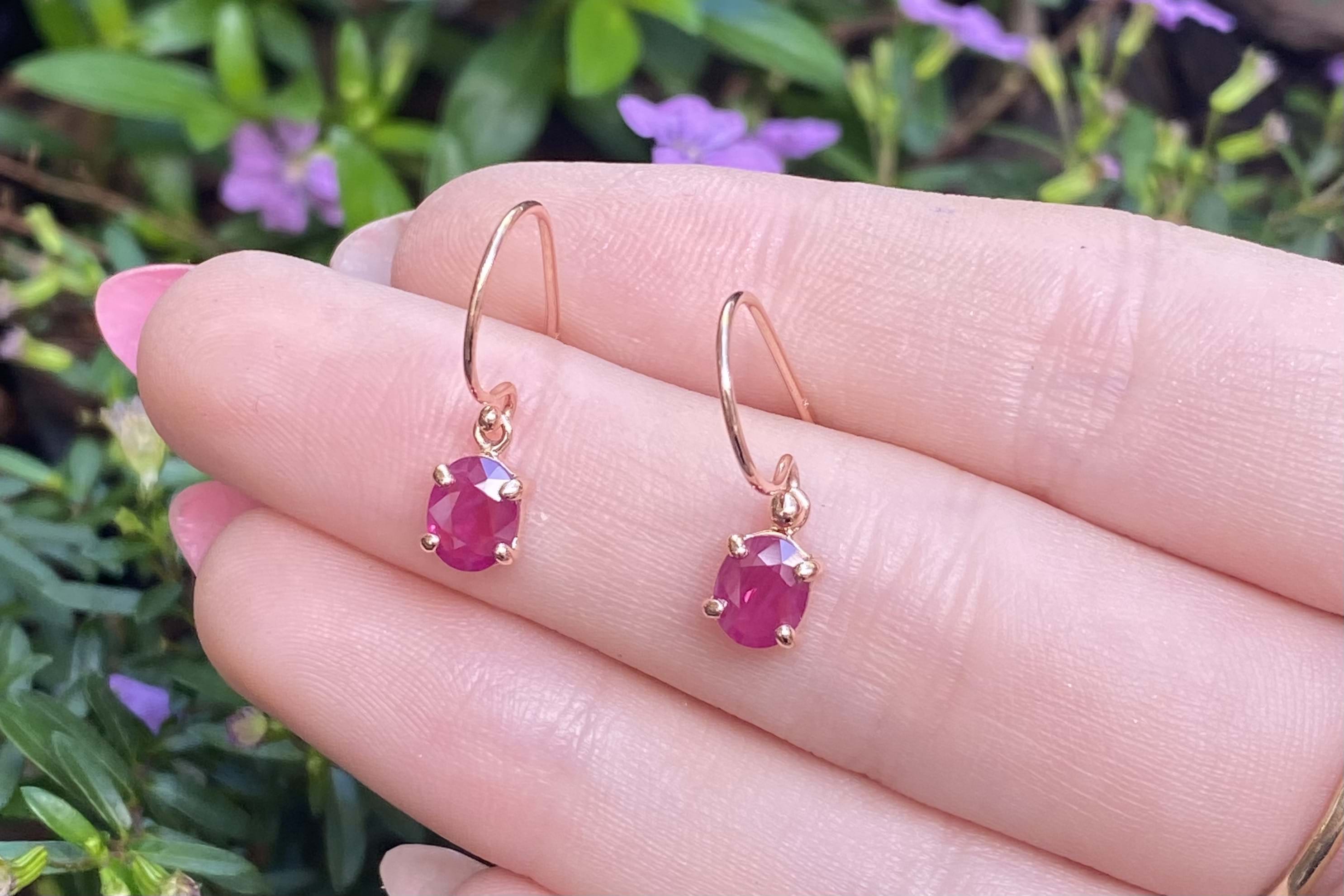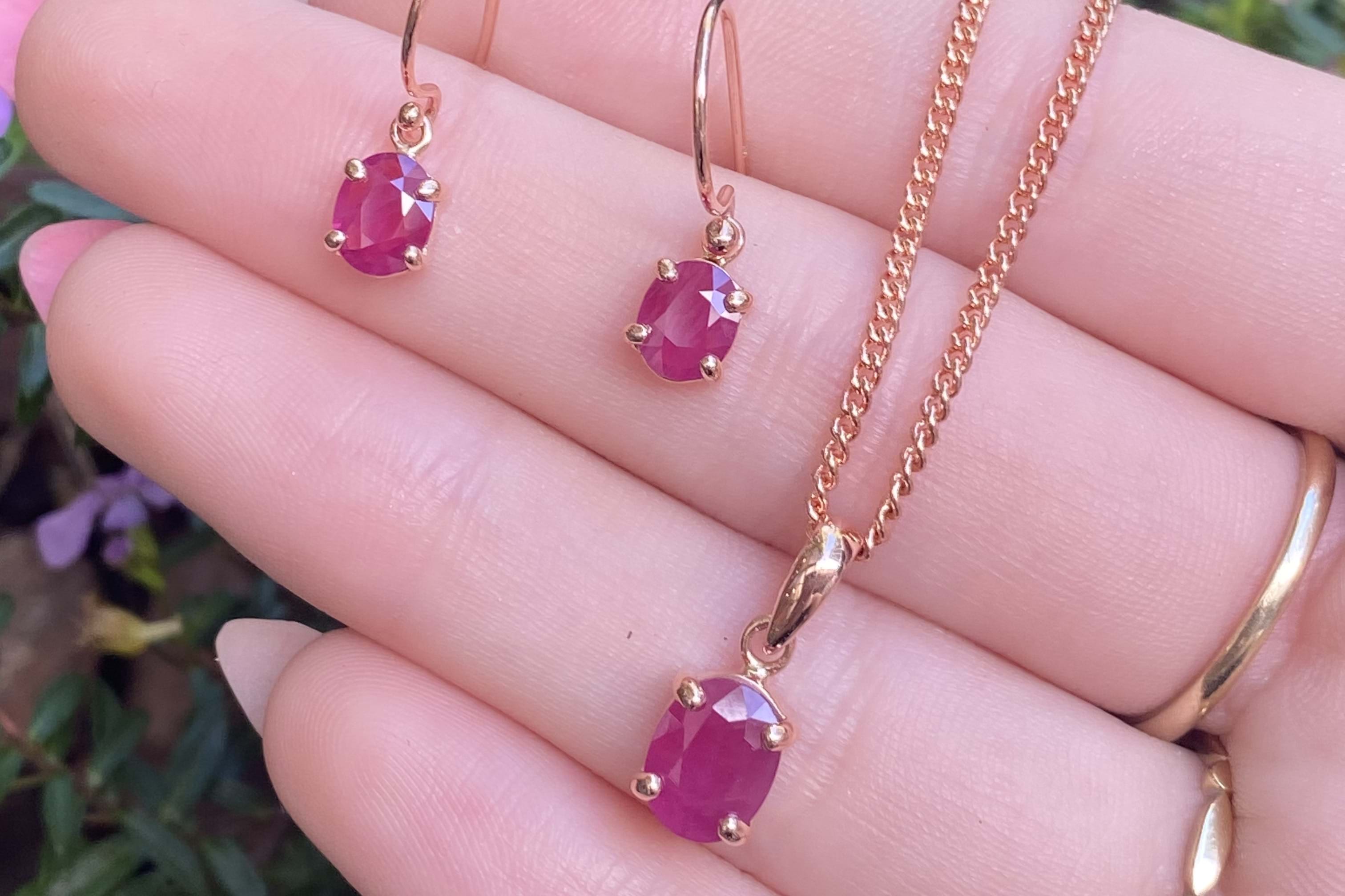 These dazzling earrings feature 6.3x4.1mm oval rubies, four claw set into a handmade 9ct rose gold setting. The earrings are finished with shepherd hook fittings for everyday wear. Photographed in natural light with matching pendant.