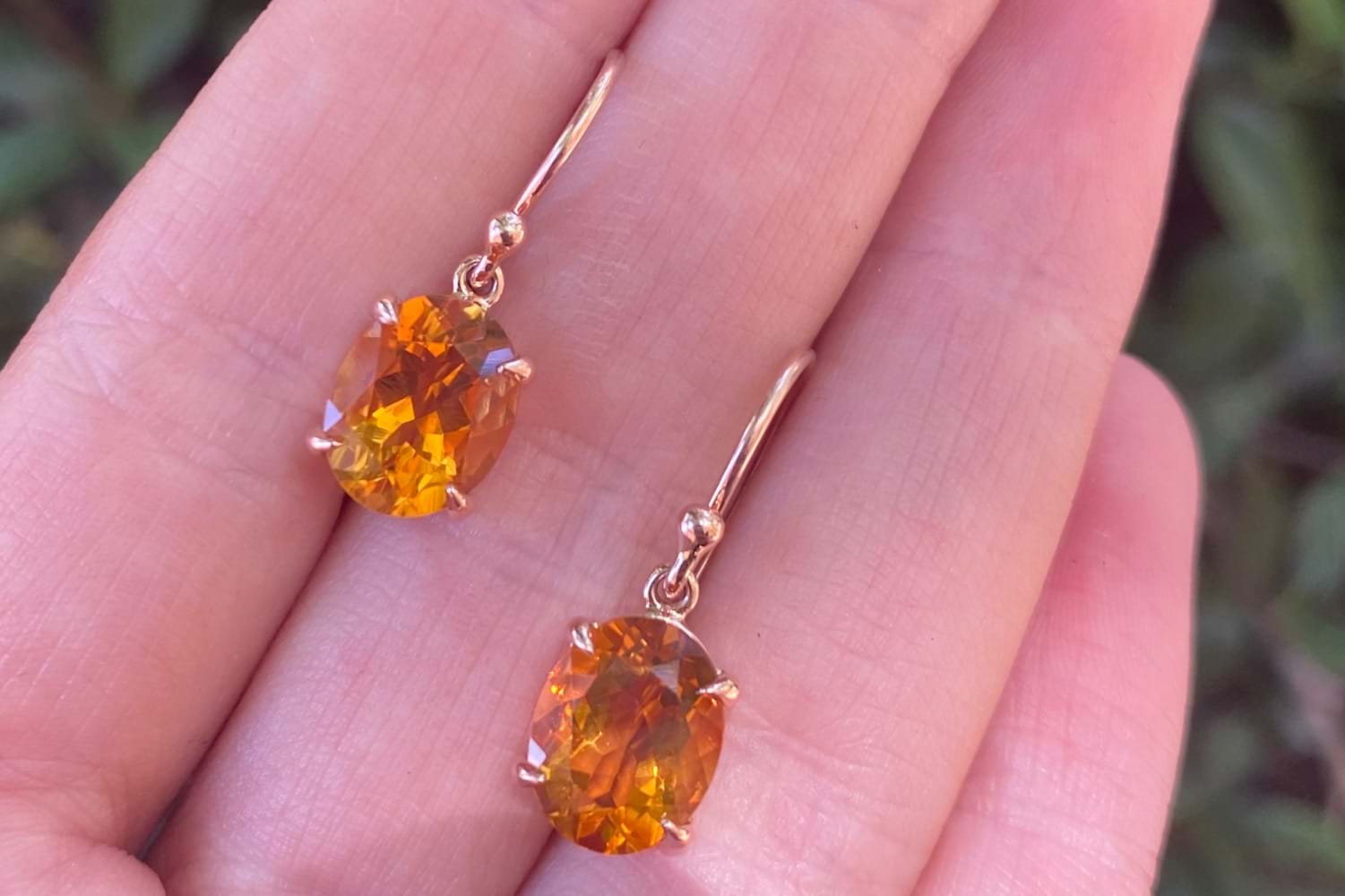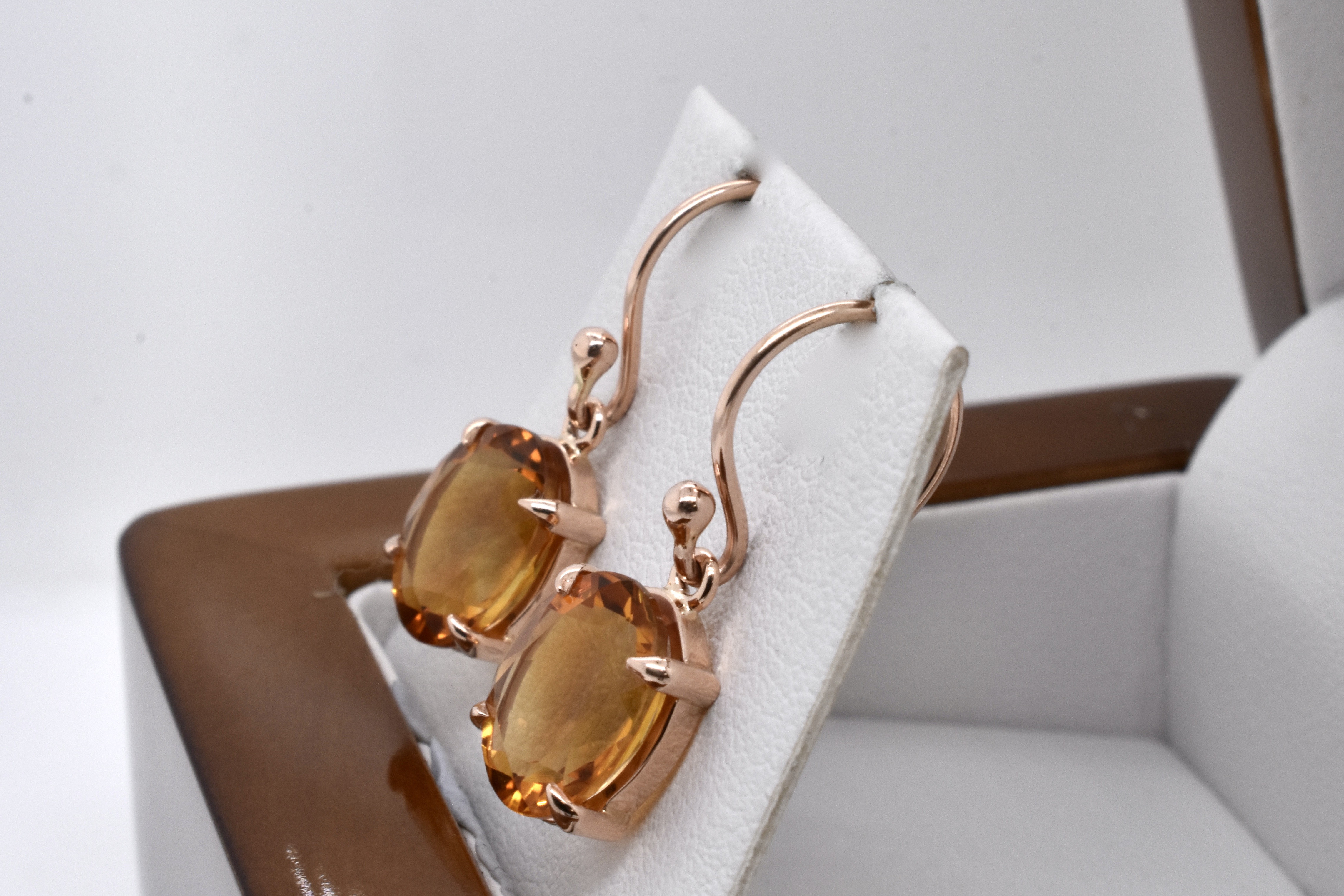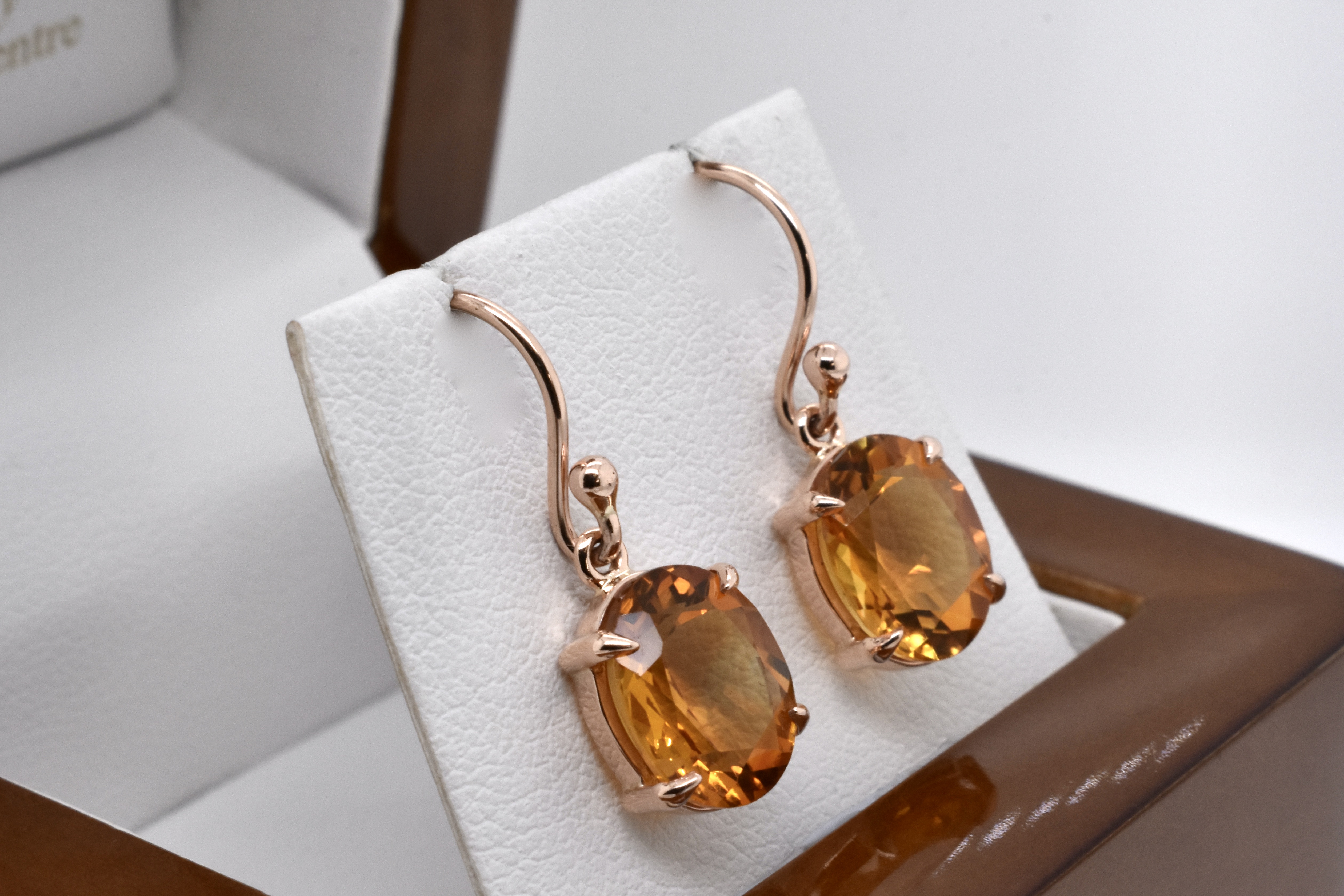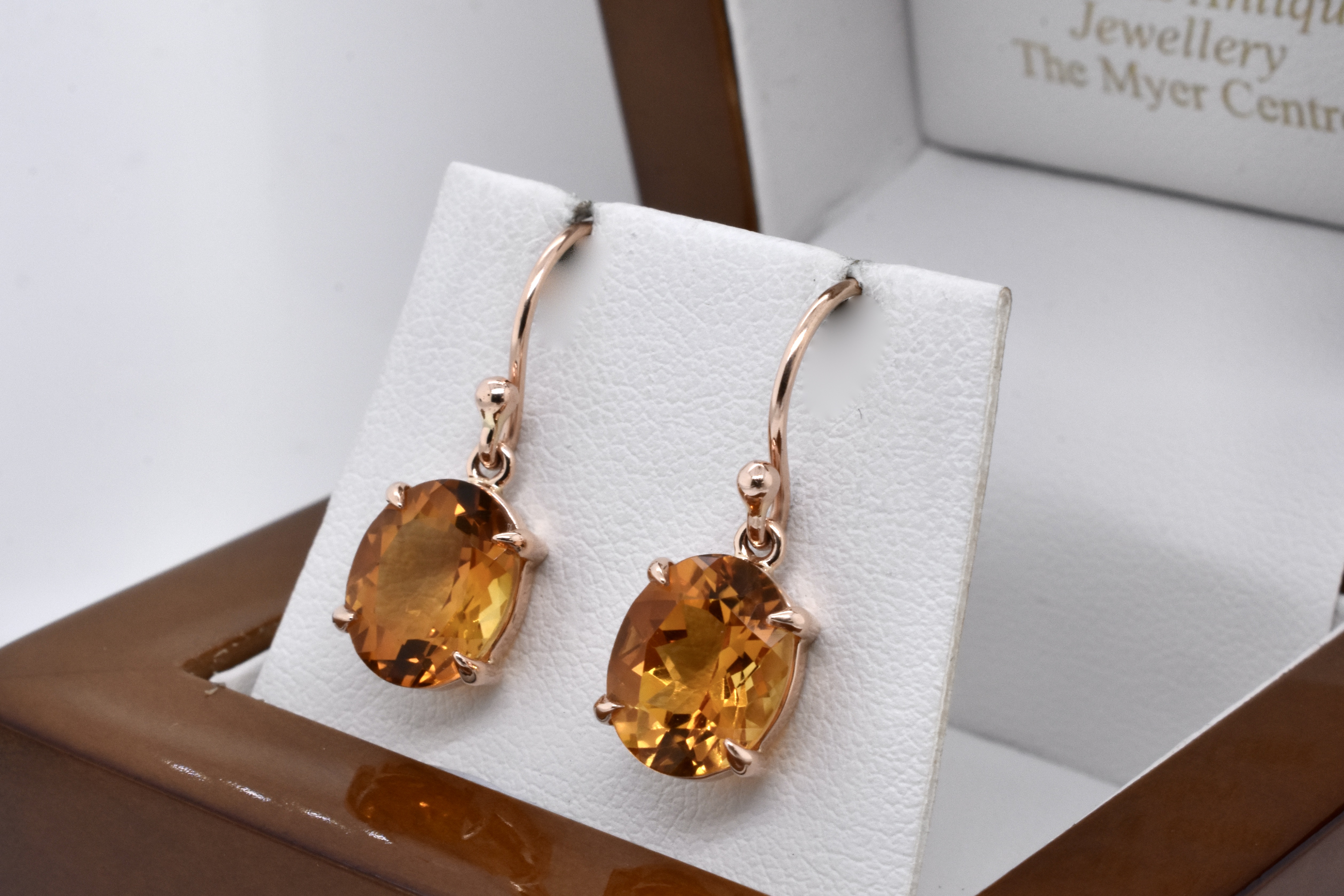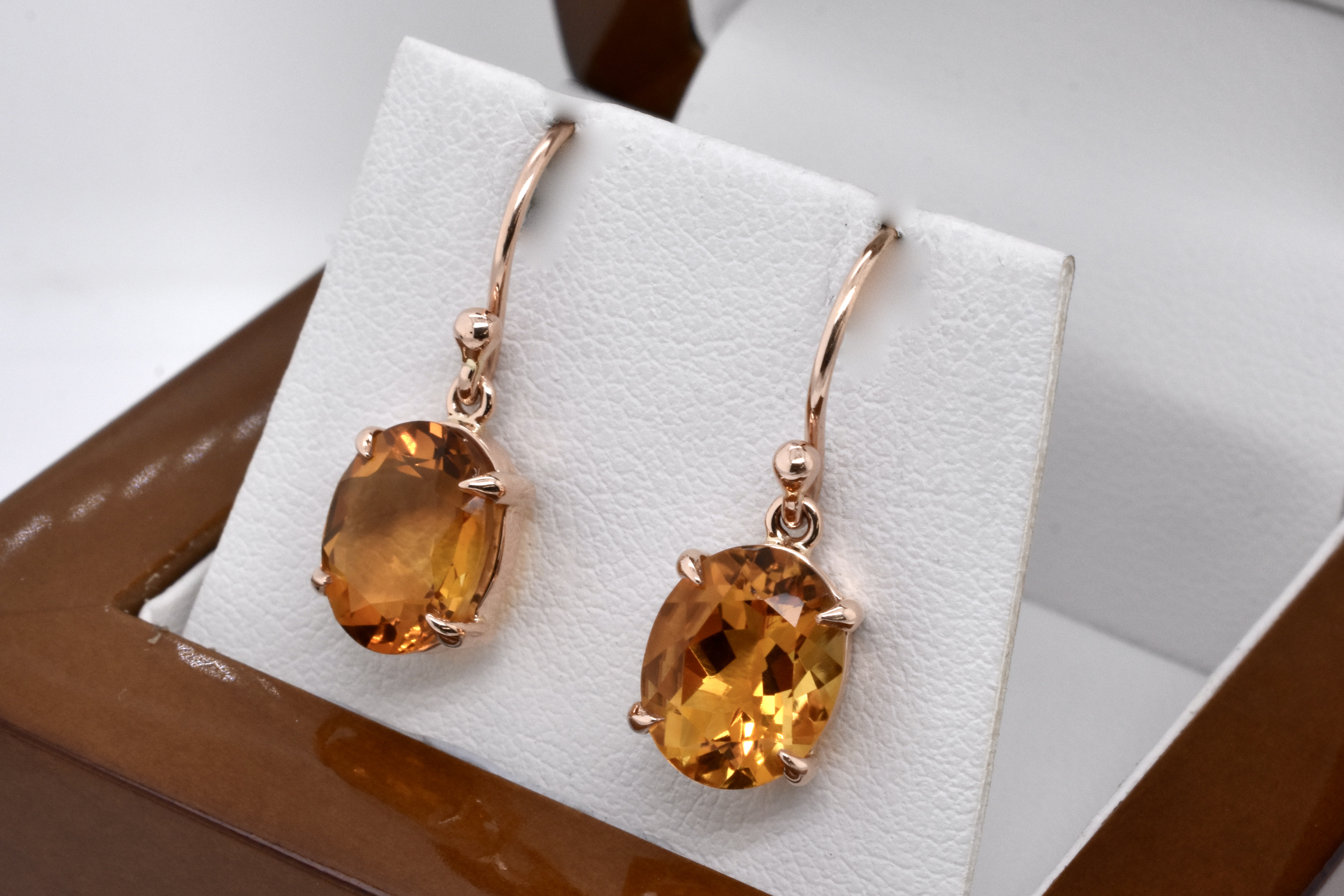 Striking and beautiful, faceted, oval citrines measuring approx. 9.9x8.1mm set into handmade 9ct rose gold four claw settings and suspended from shepherd hook fittings