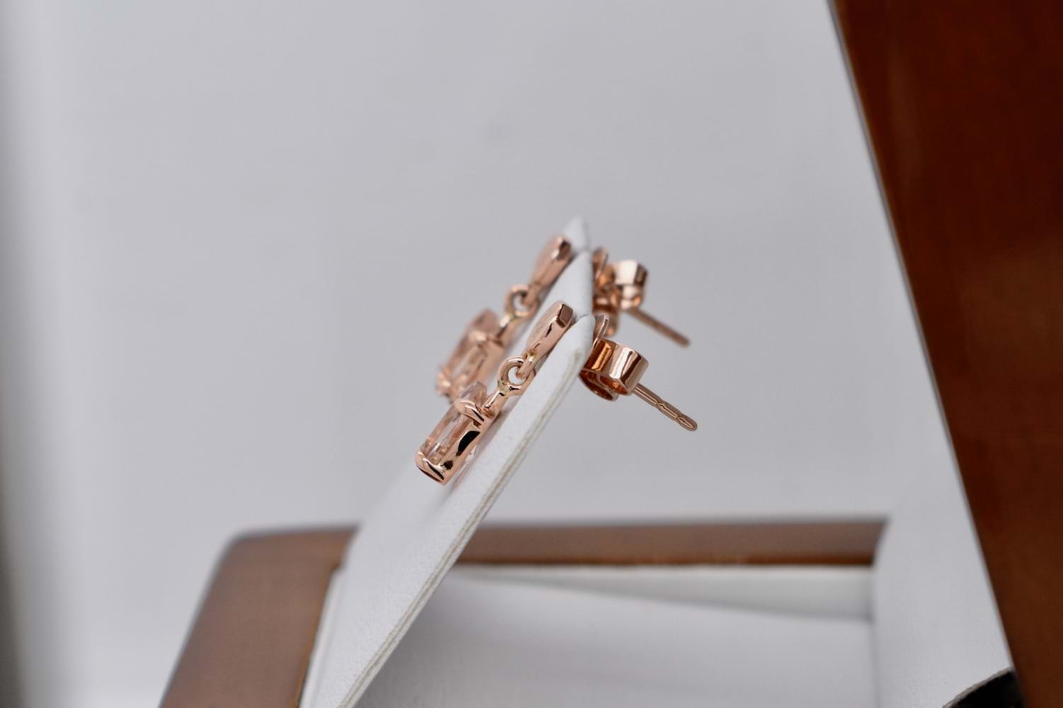 These pretty earrings have been hand crafted in 9ct rose gold and feature a textured plate stud top with a Pearshape Morganite measuring approx. 7x5mm suspended from each in four claw settings