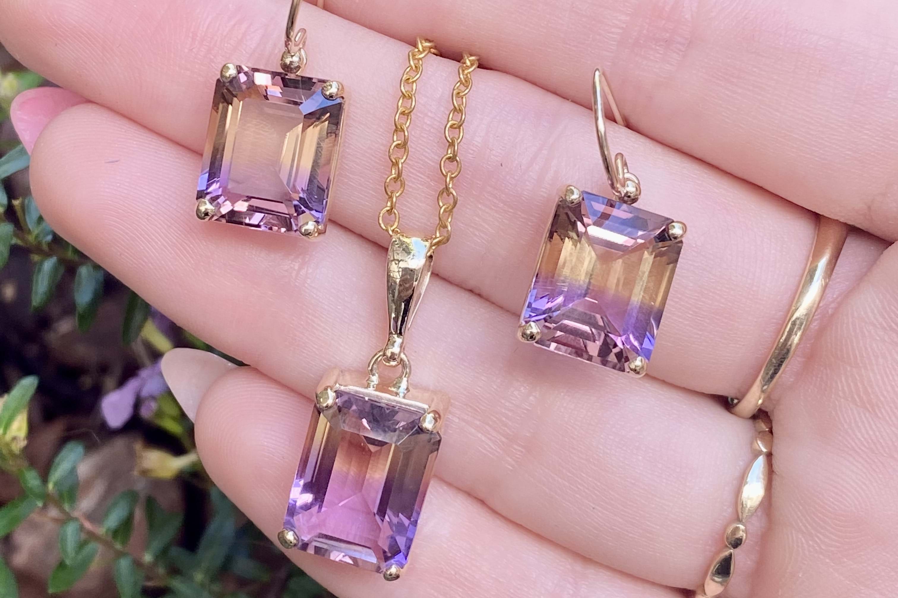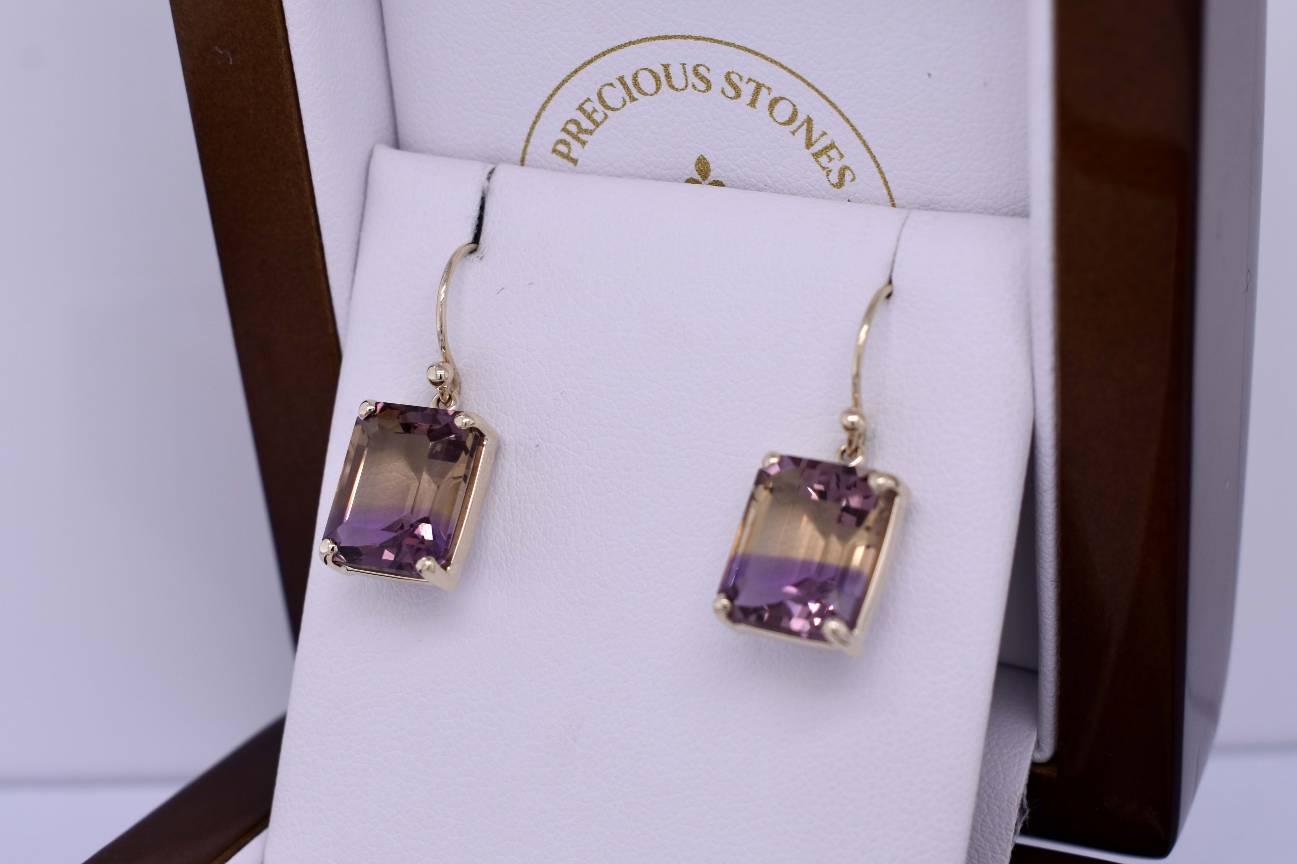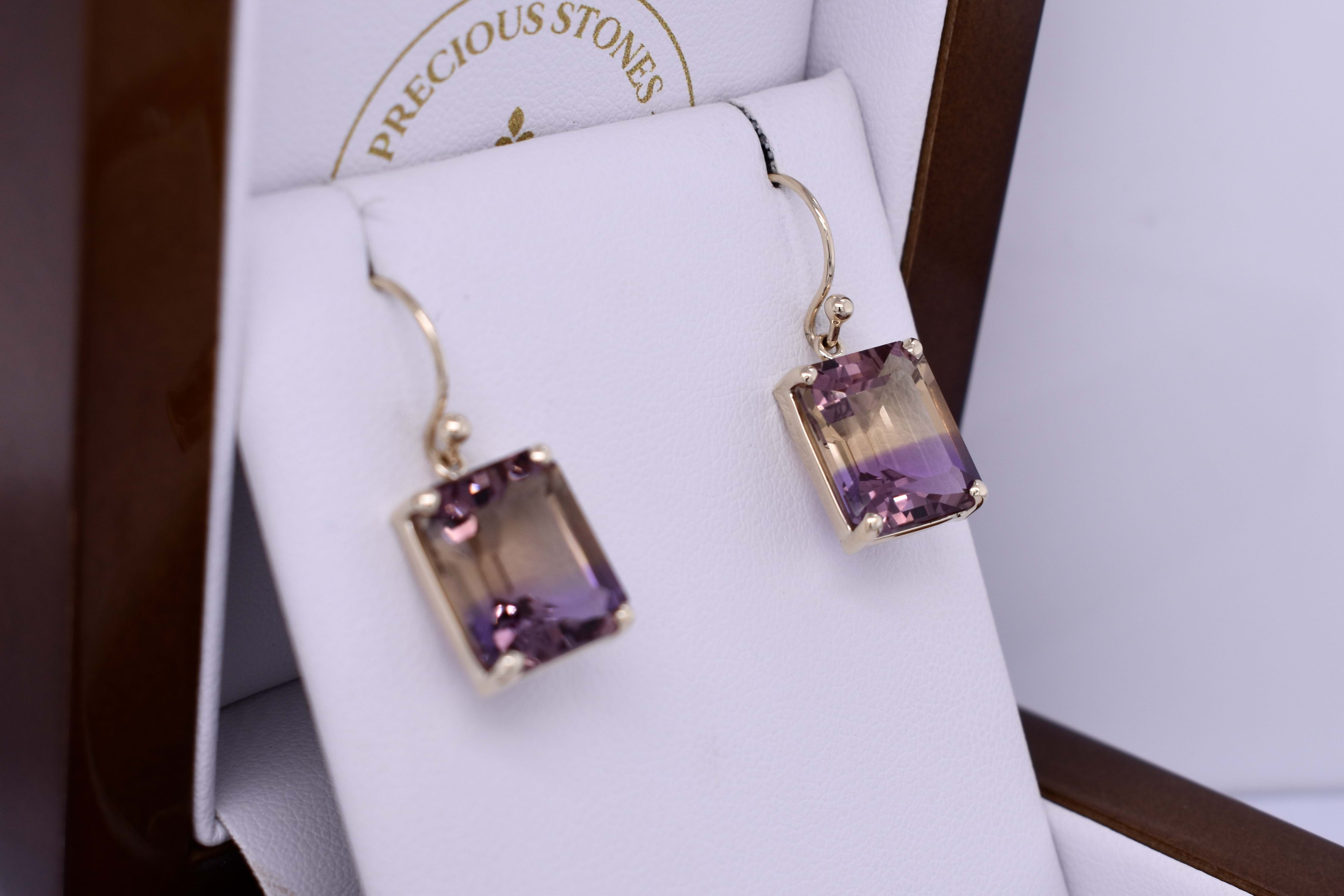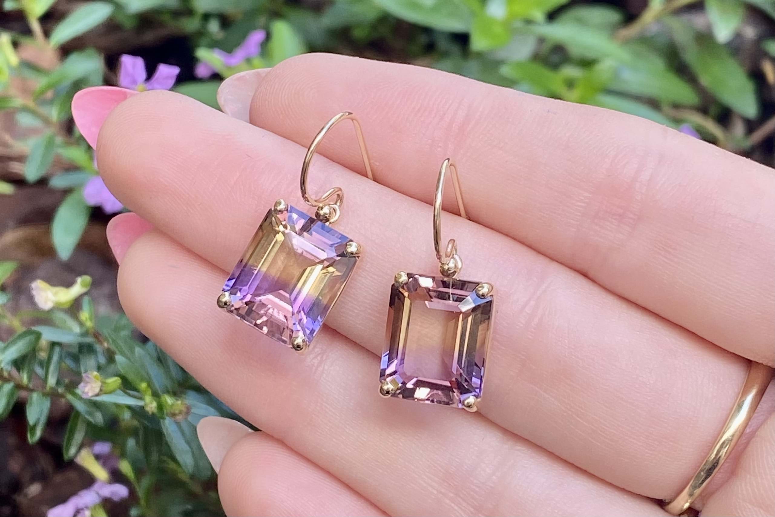 These vibrant earrings feature unique emerald cut Bolivian Ametrine measuring approx. 12.3x10.1mm, four claw set into a handmade 9ct yellow gold setting. The earrings are finished with shepherd hook fittings for everyday wear.