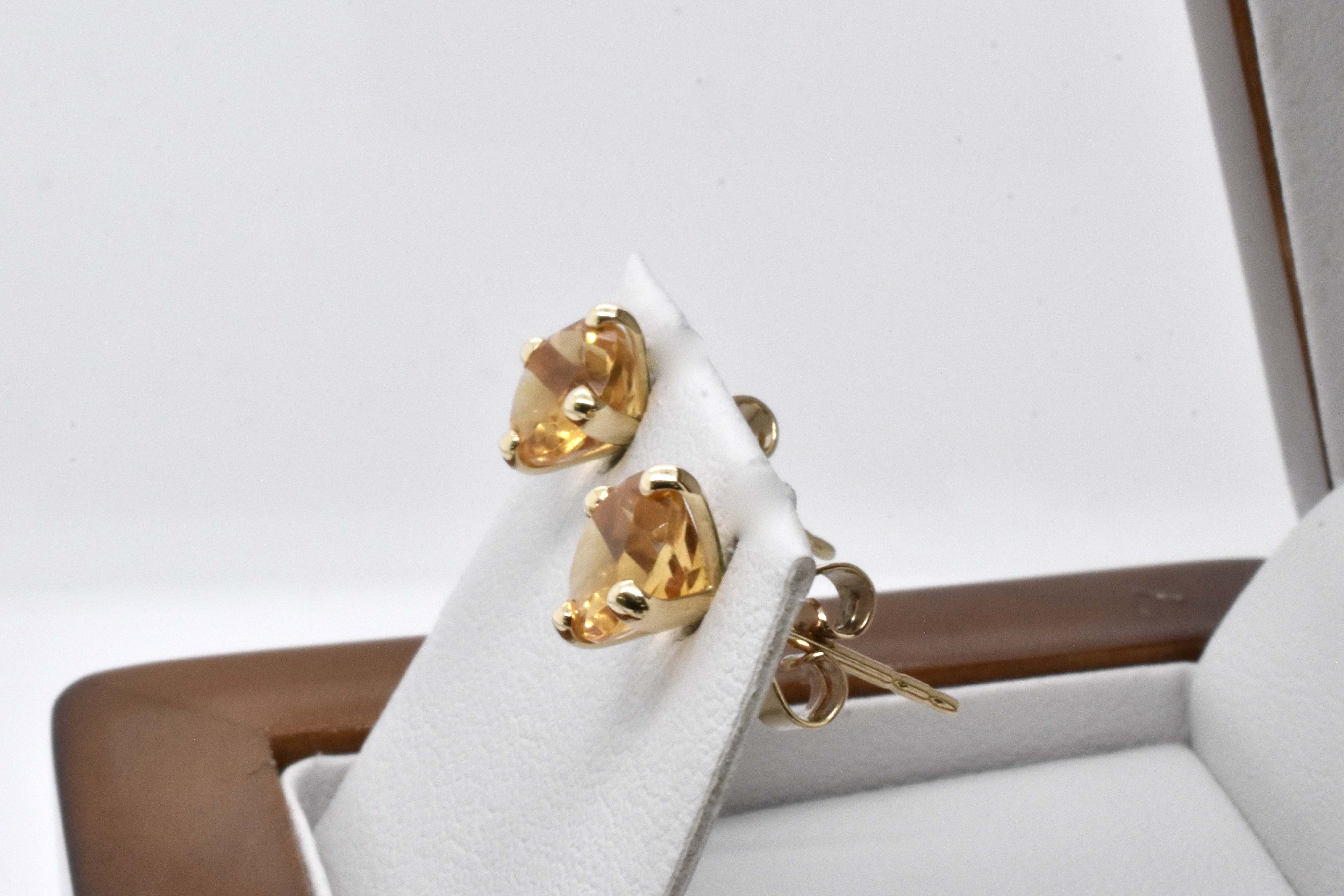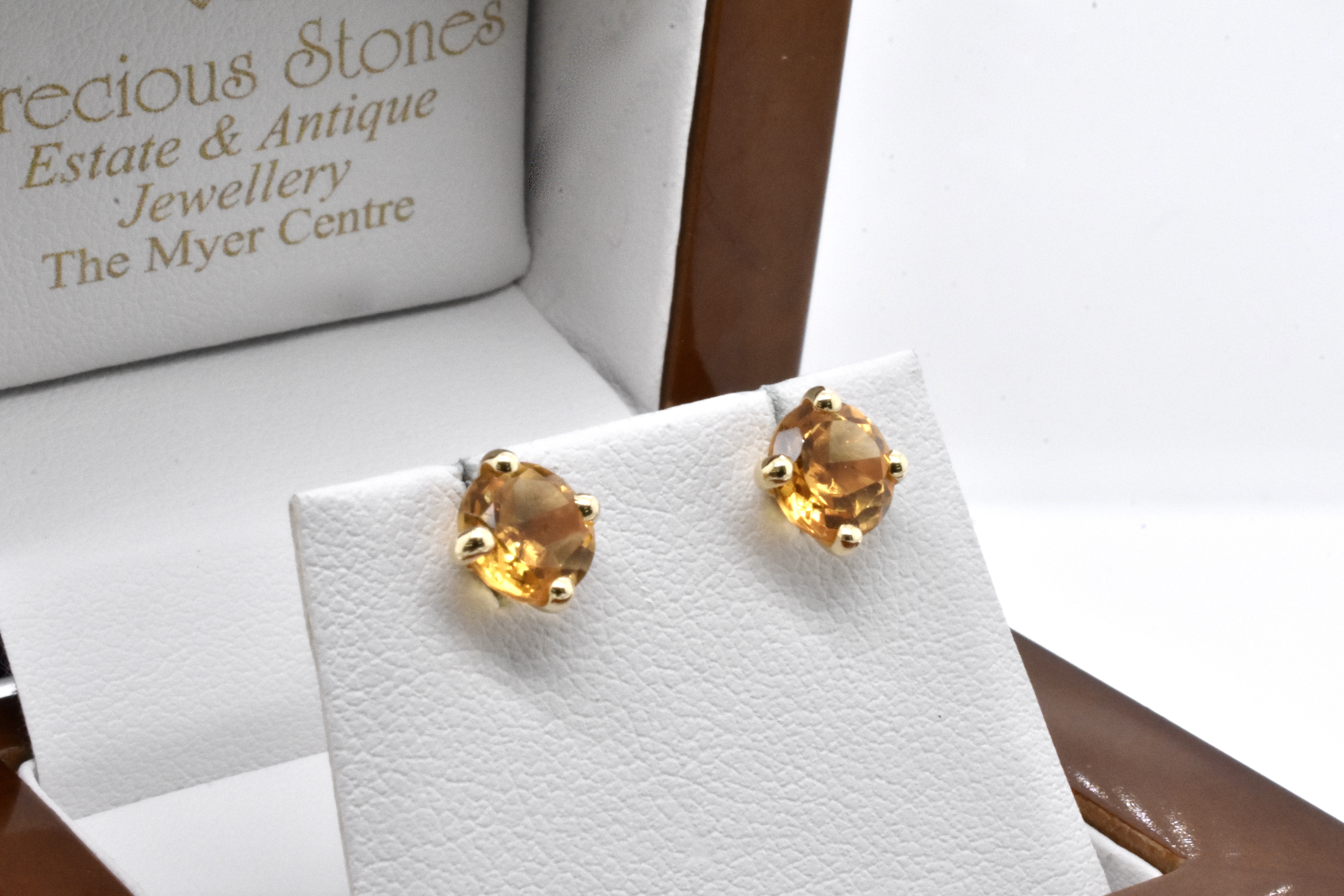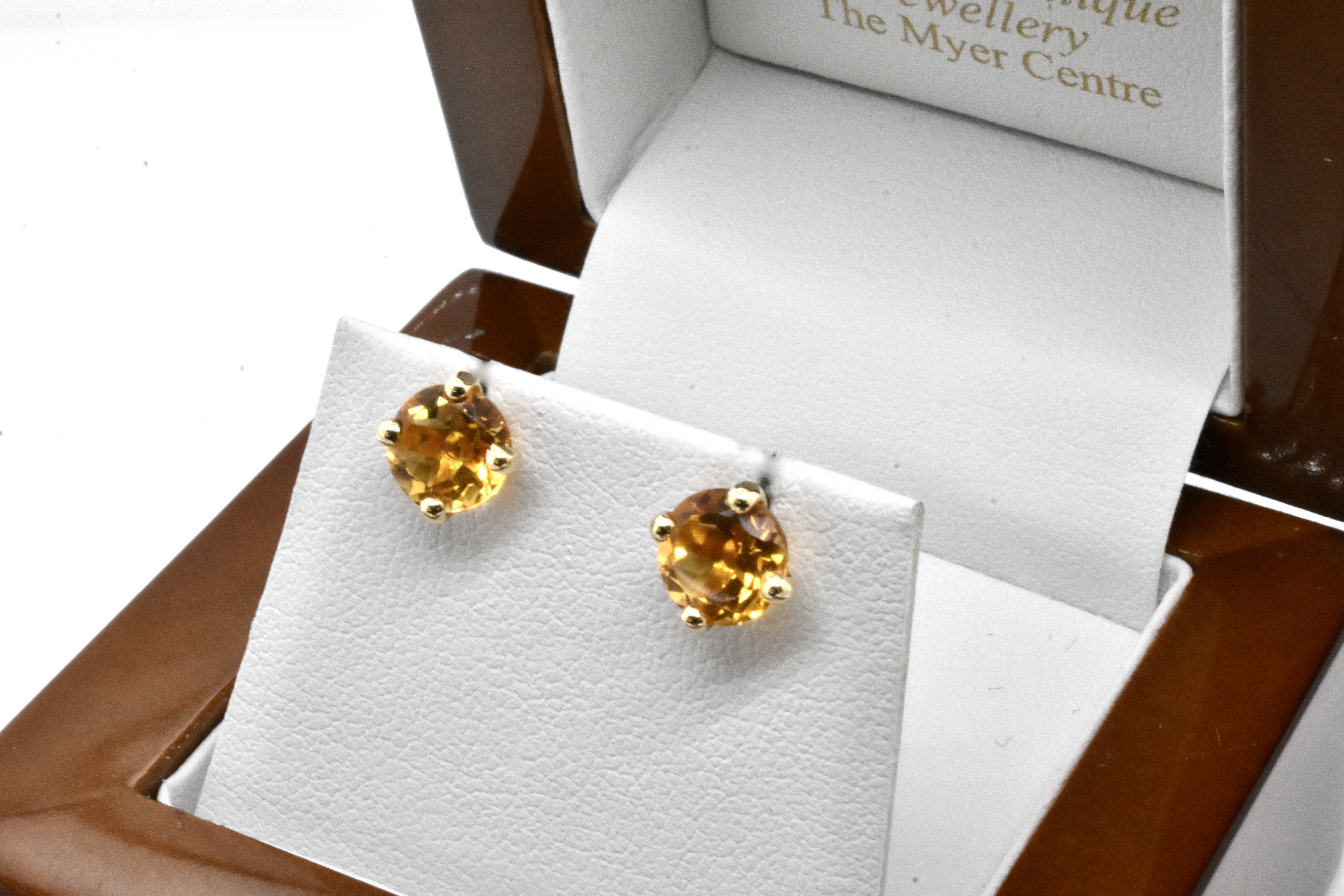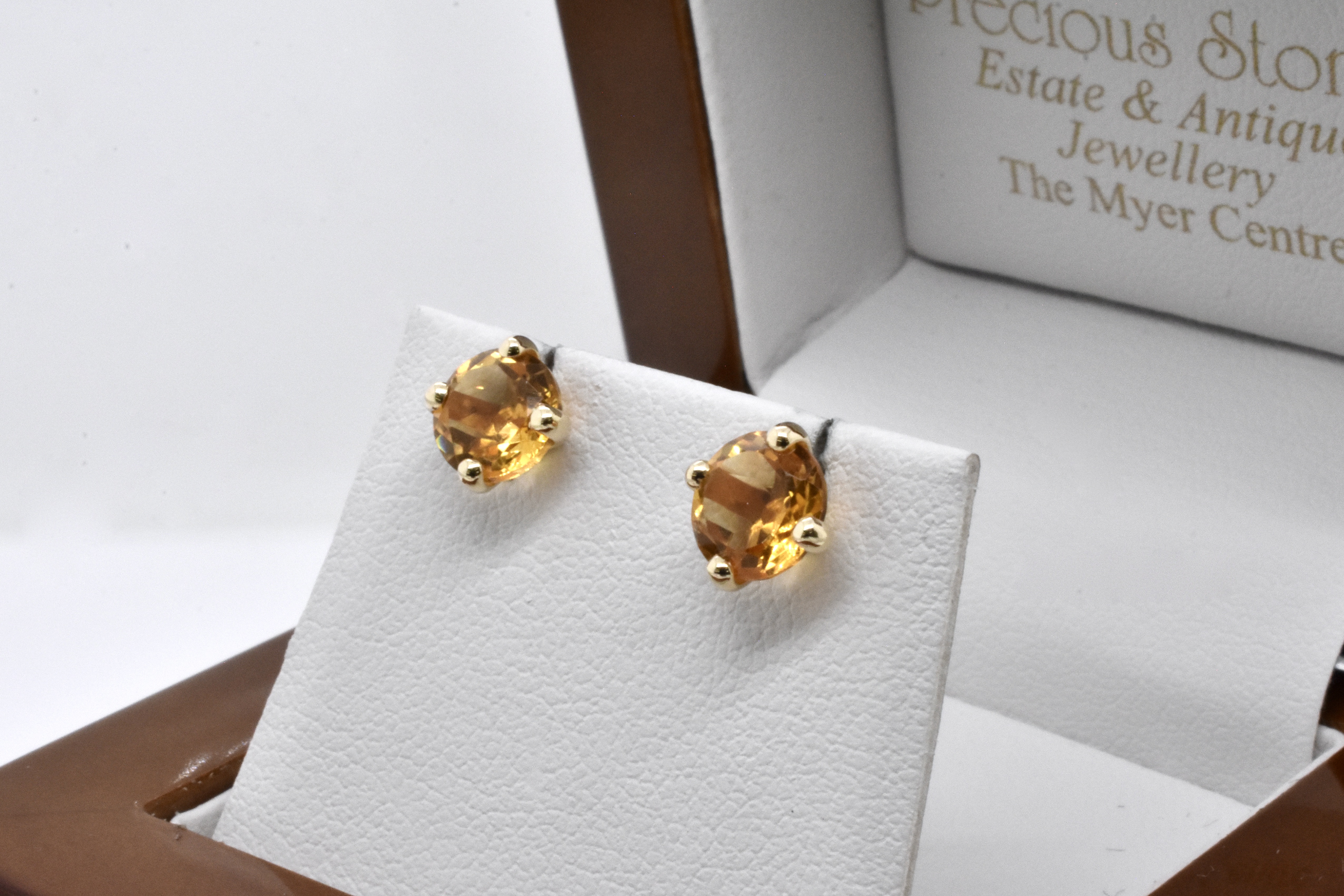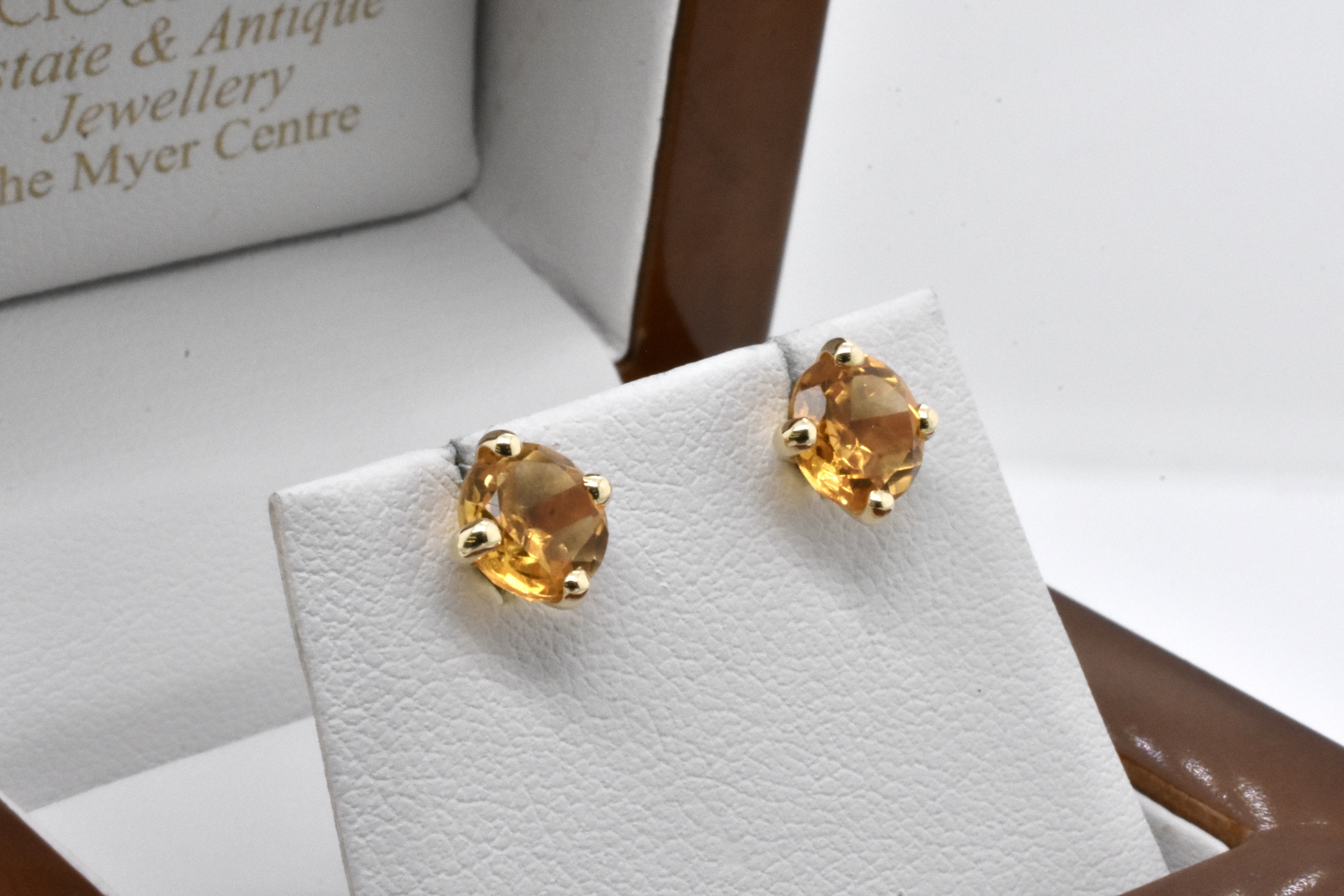 Handmade pair of 9ct yellow gold studs set with approx. 6.5mm round citrines, 4 claw set with post and butterfly fittings
