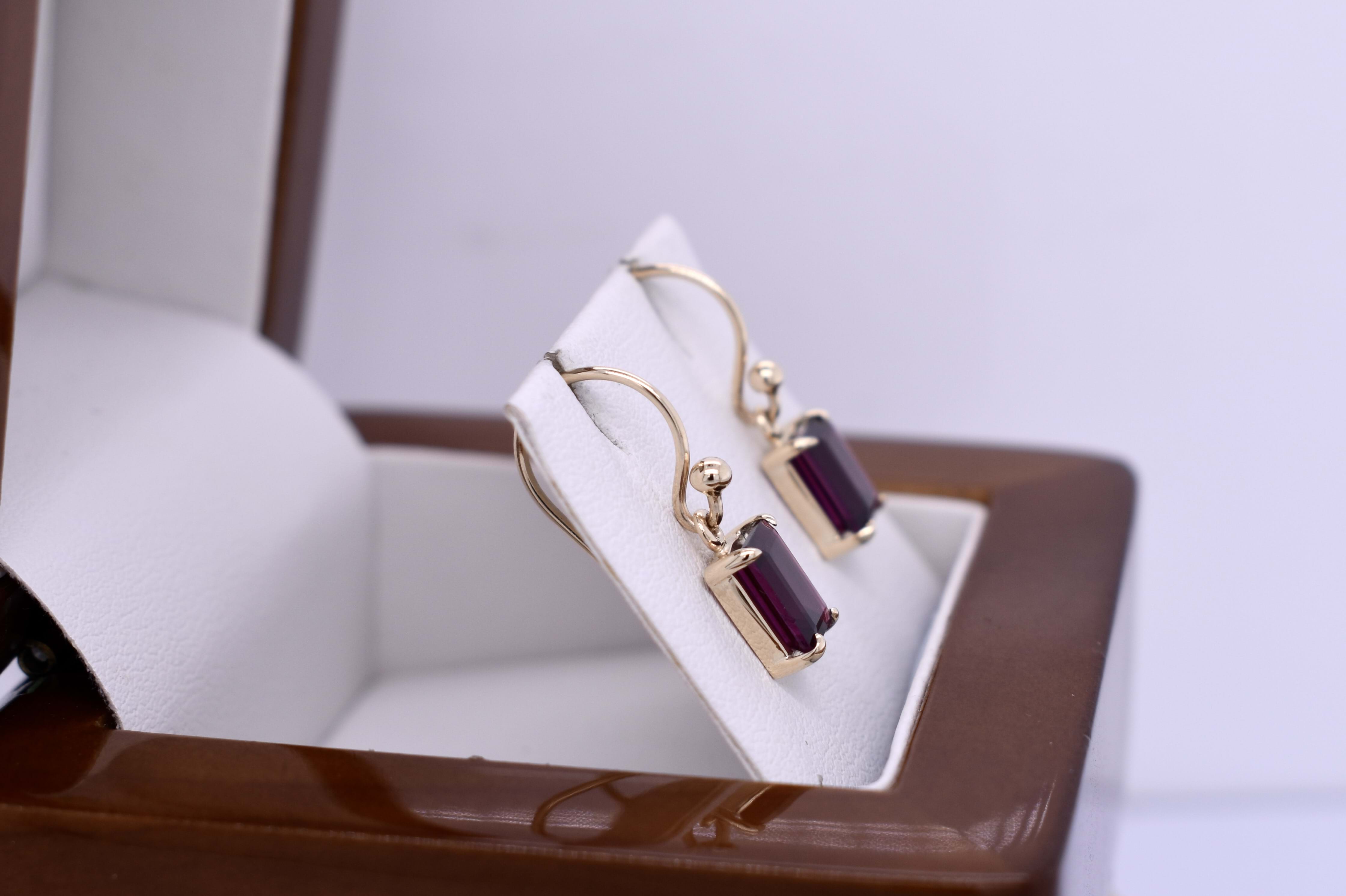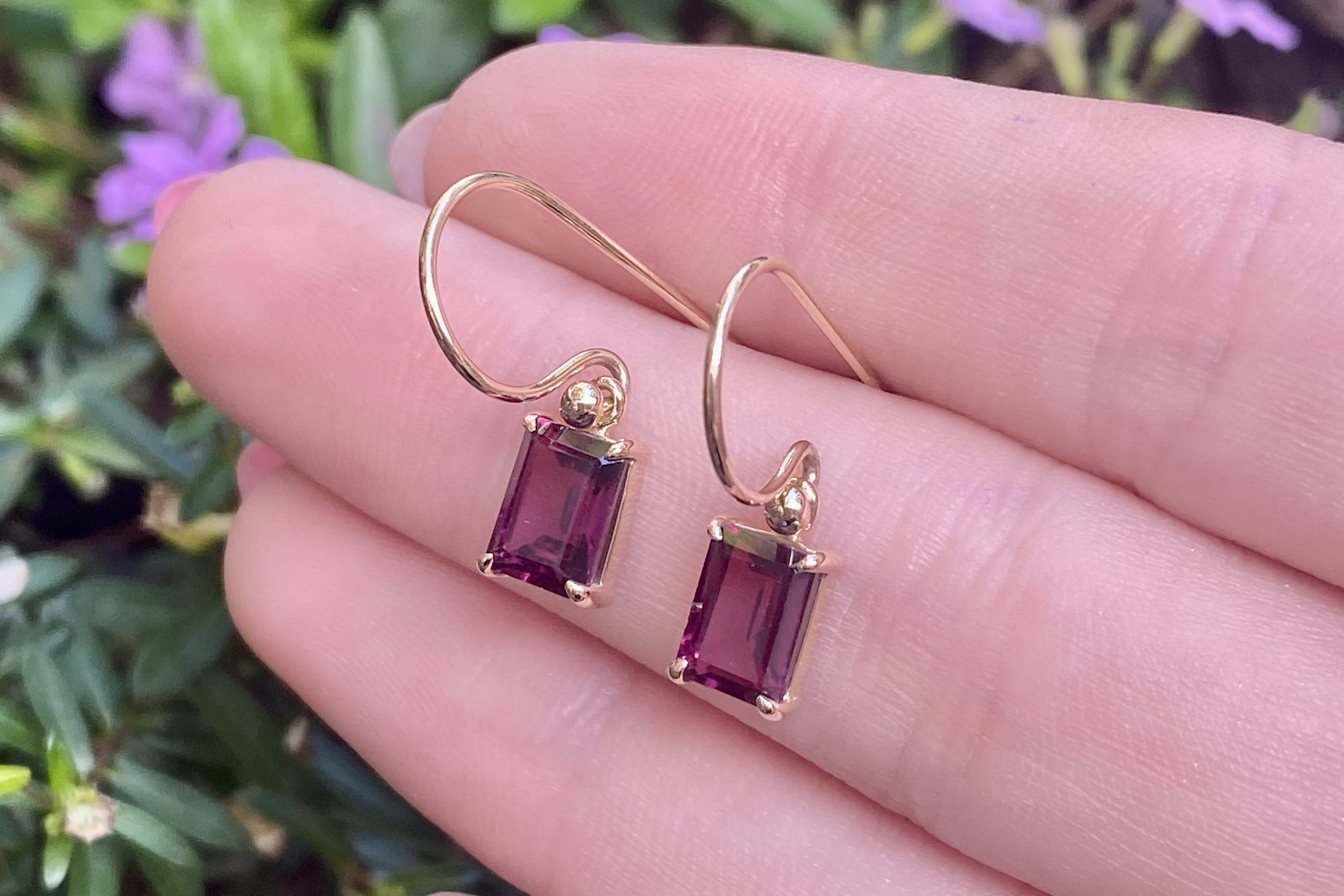 These gorgeous earrings feature emerald cut rhodolite garnets measuring approx. 7.2x5.1mm, four claw set into a handmade 9ct yellow gold setting. Finished with shepherd hook fittings for everyday wear.