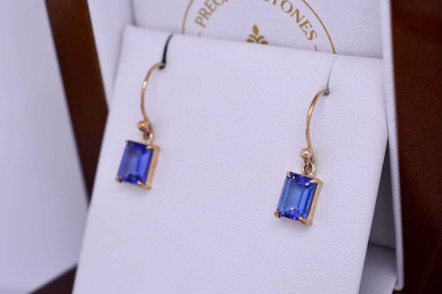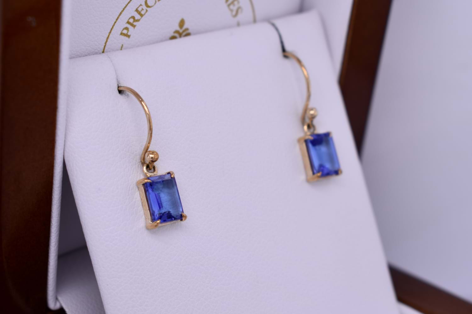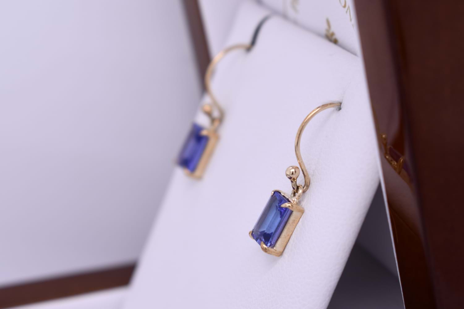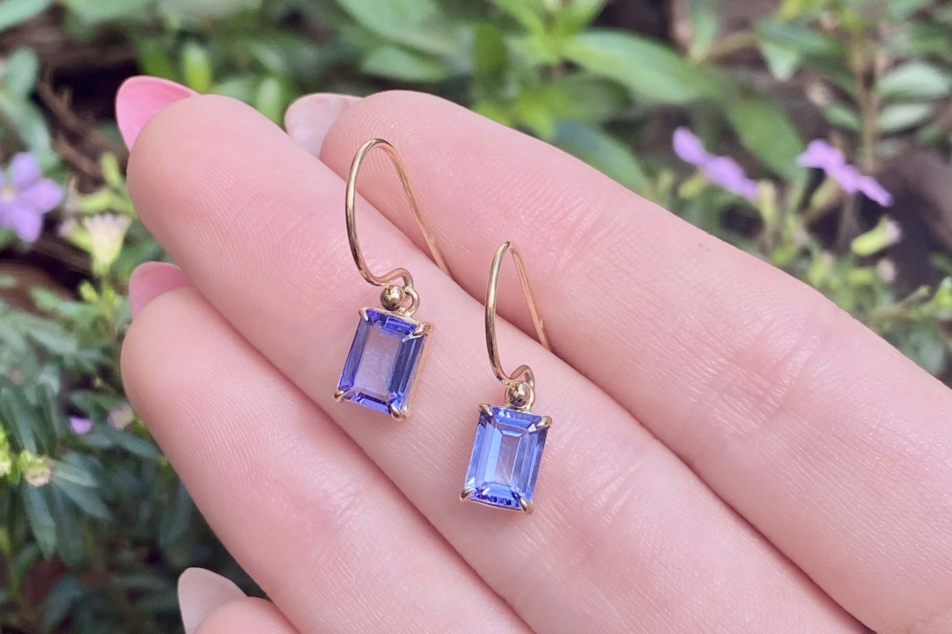 These stunning drops feature vibrant emerald cut tanzanite drops measuring approx. 7.5x5.3mm, four claw set into a handmade 9ct yellow gold setting. The earrings are finished with shepherd hook earrings for everyday wear.