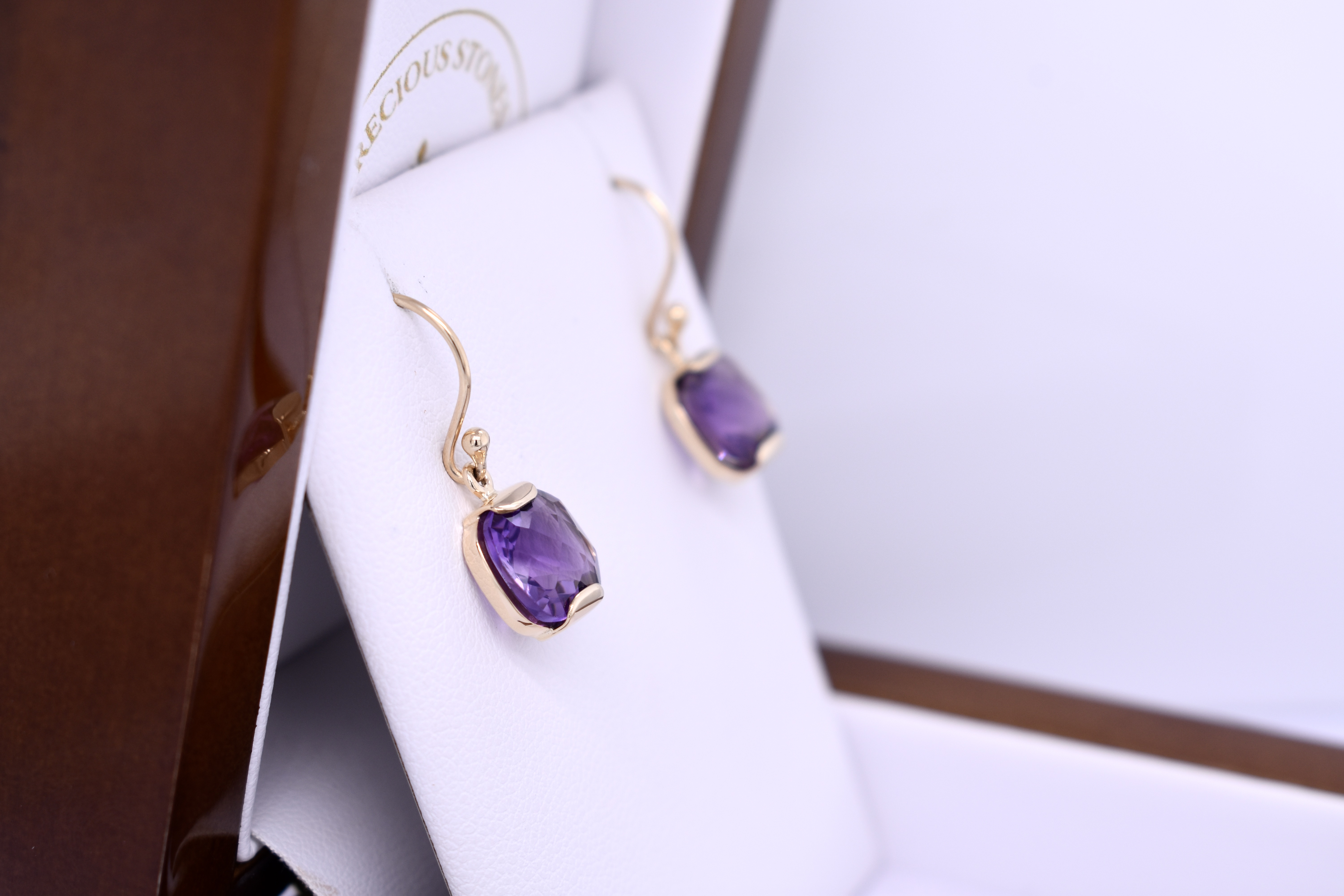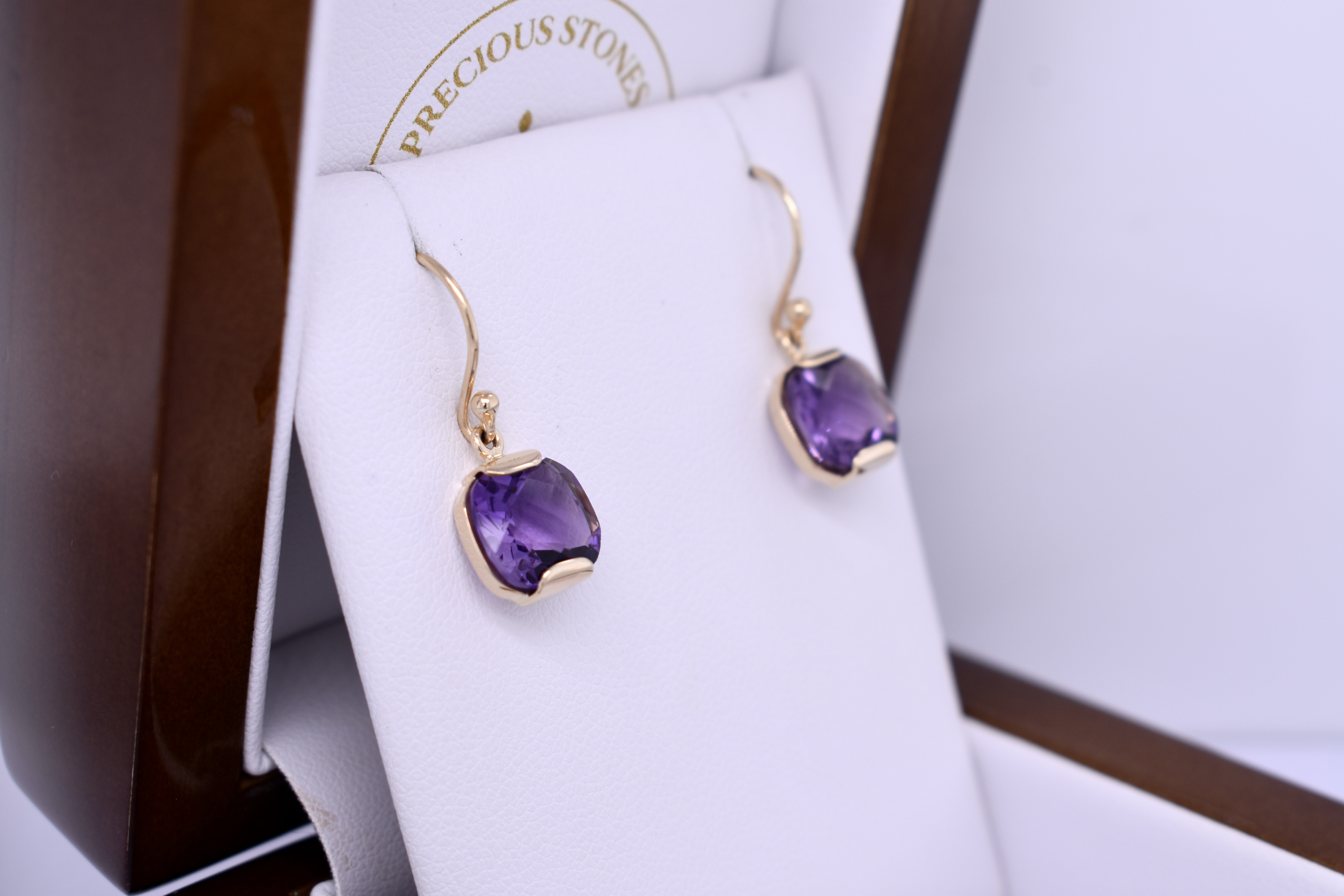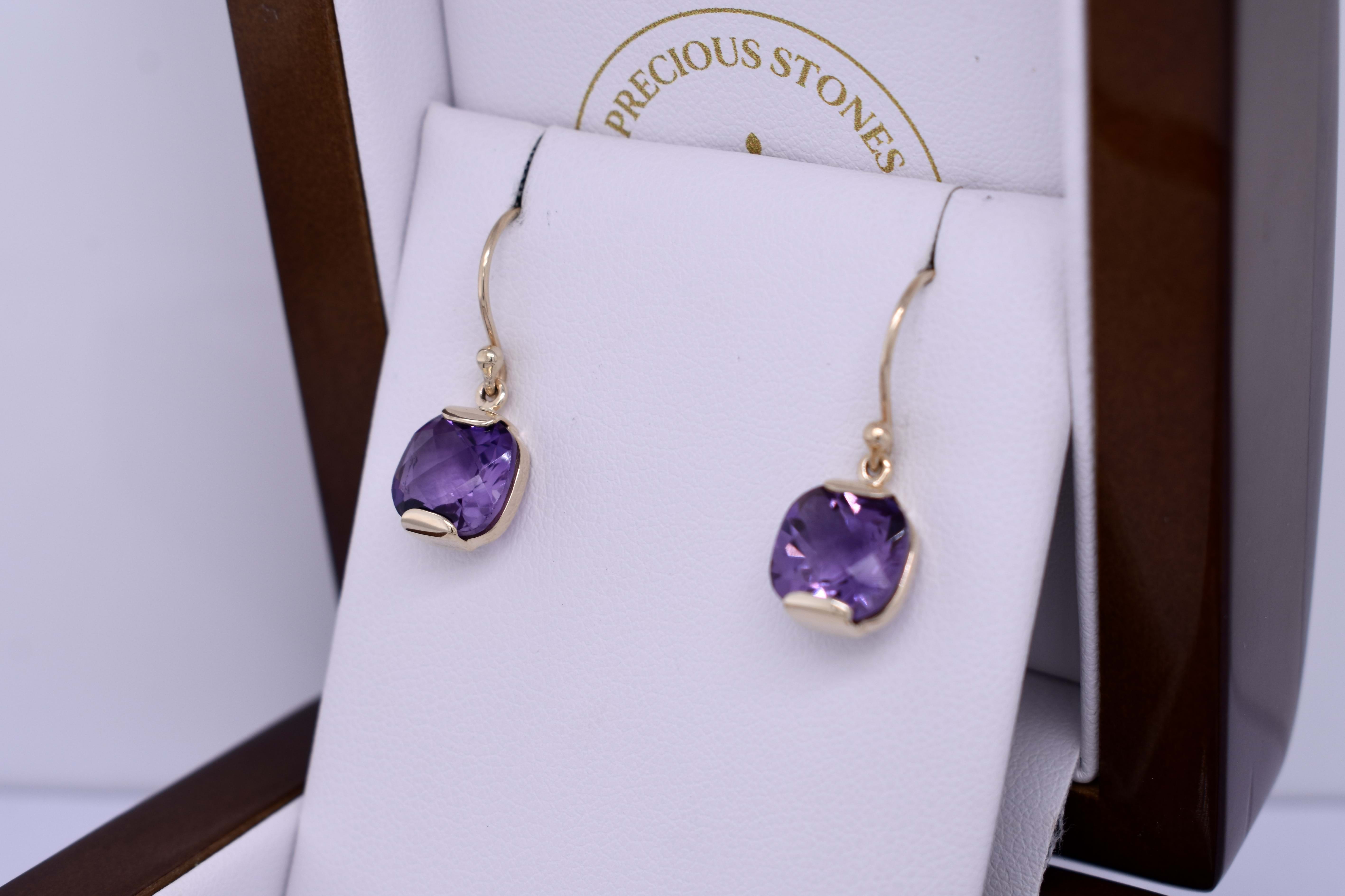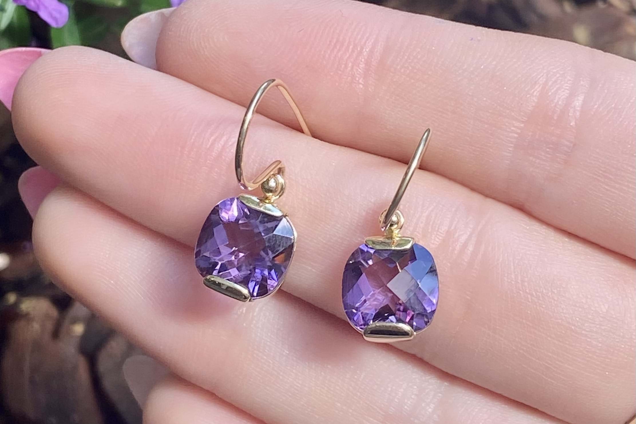 These stunning earrings feature checkerboard cut cushion amethyst measuring approx. 9x8.5mm, set into a handmade 9ct yellow gold semi-bezel setting. The earrings are finished with shepherd hook fittings for everyday wear.