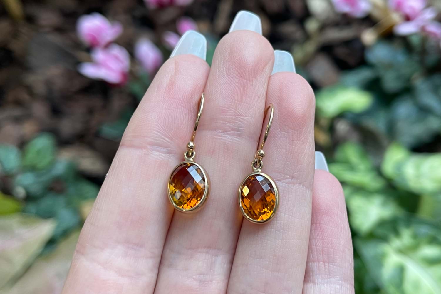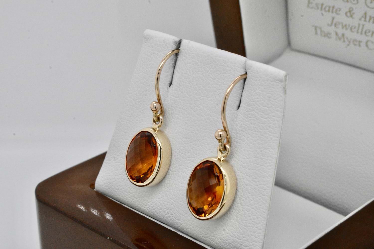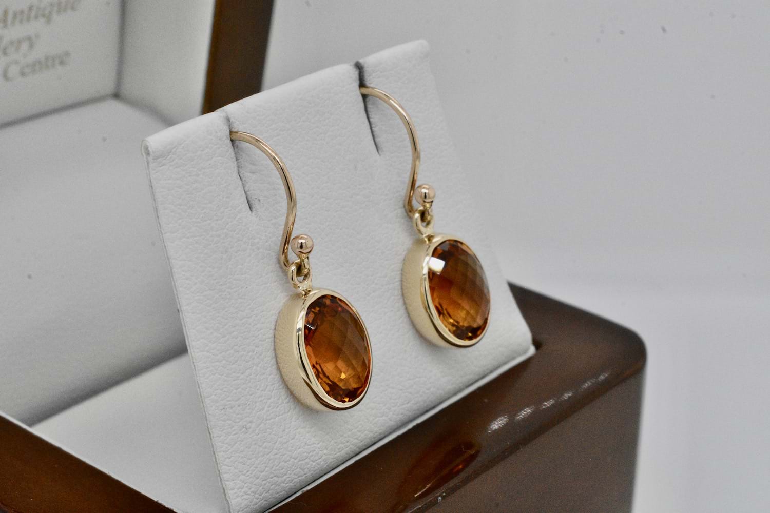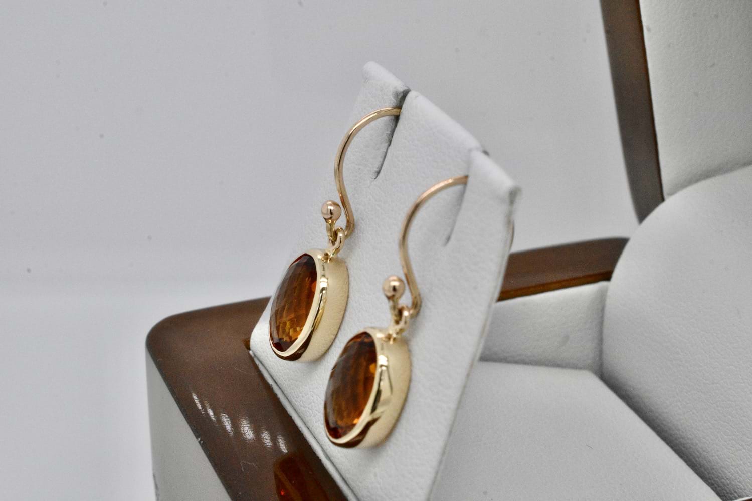 Beautiful and vivid faceted oval citrine measuring approx. 13x8mm set into handmade 9ct yellow gold bezel settings and suspended from shepherd hook fittings