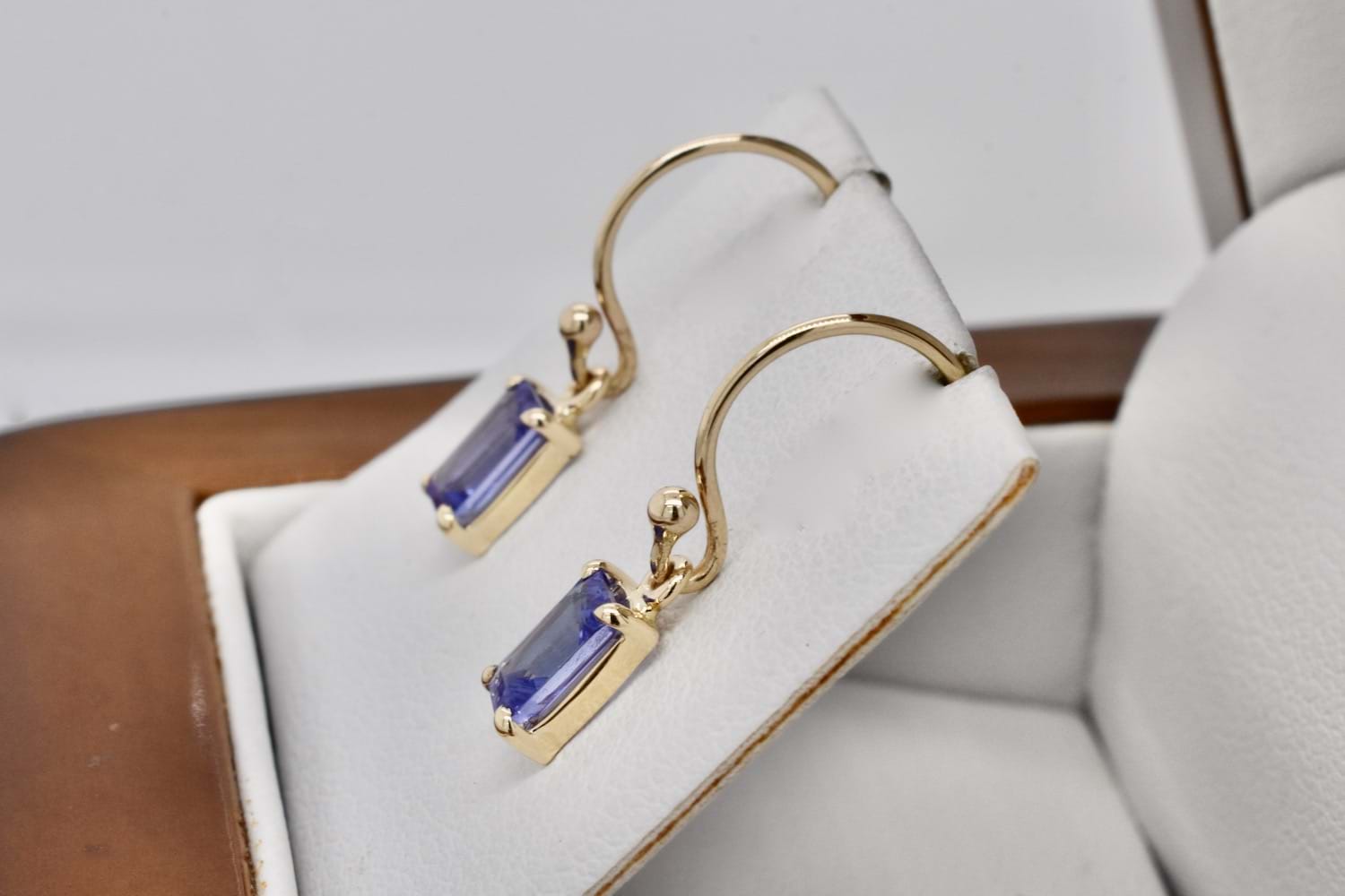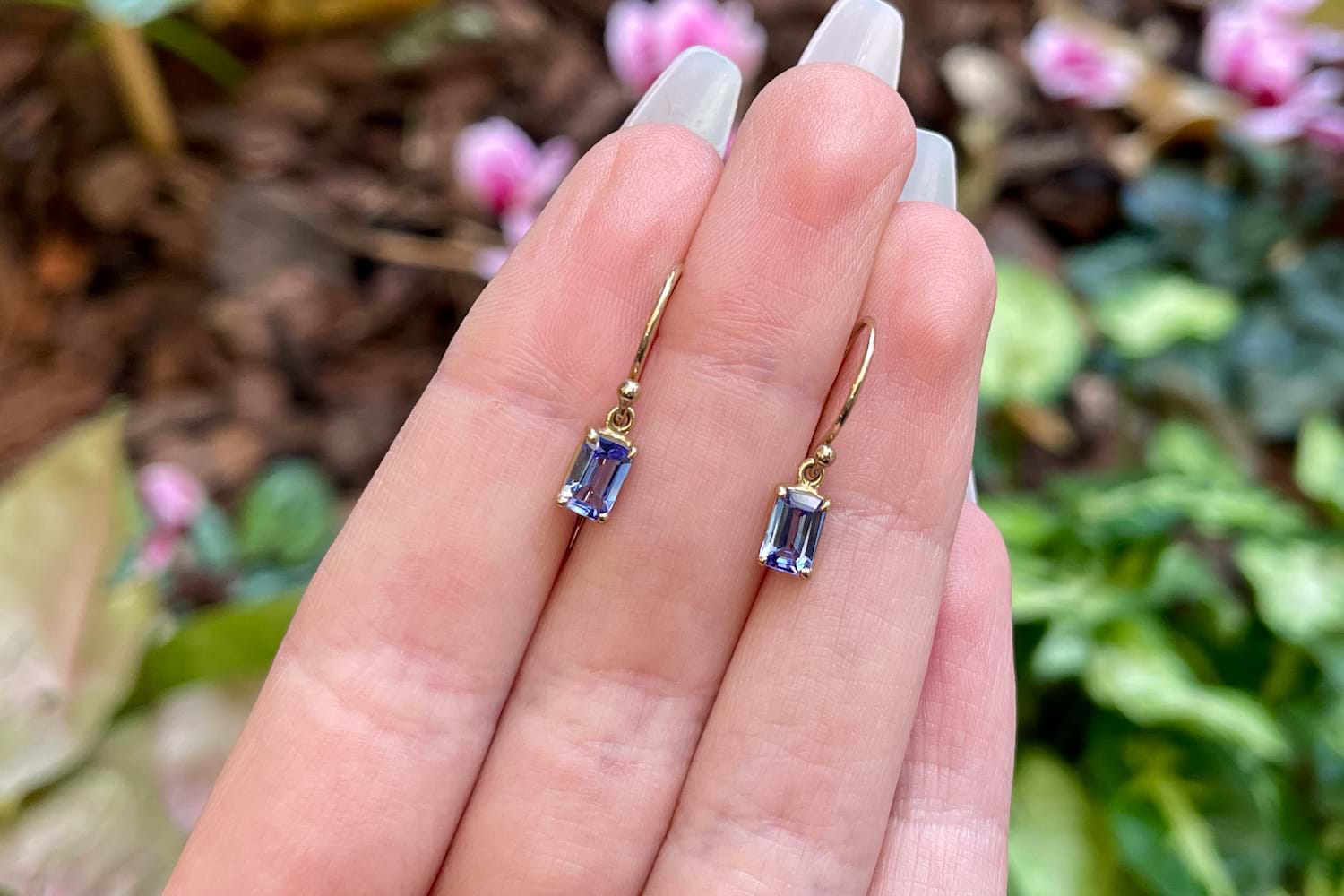 Stunning and elegant emerald cut tanzanites measuring approx. 5.9x4.3mm set into handmade 9ct yellow gold four claw settings and suspended from shepherd hook fittings